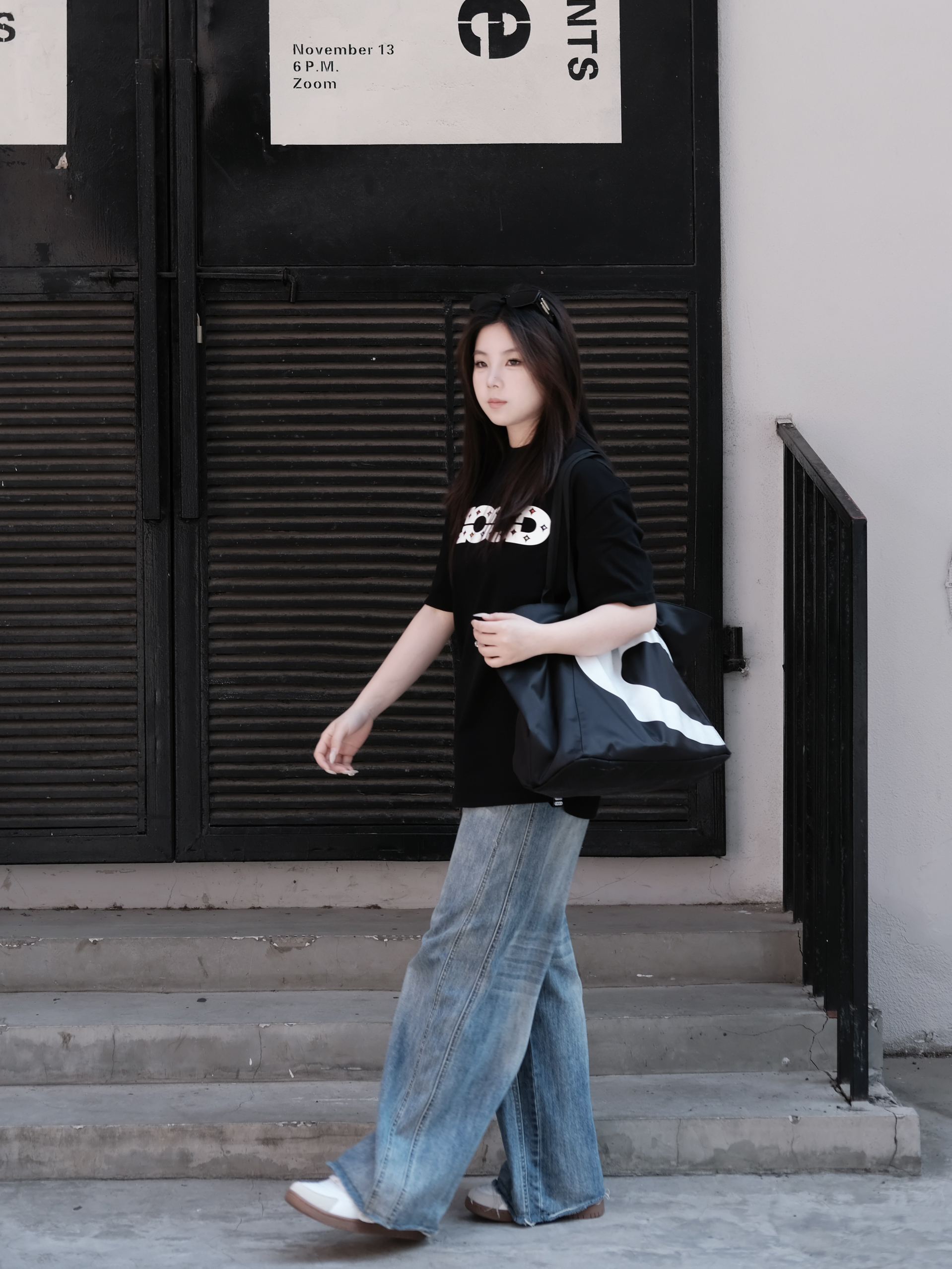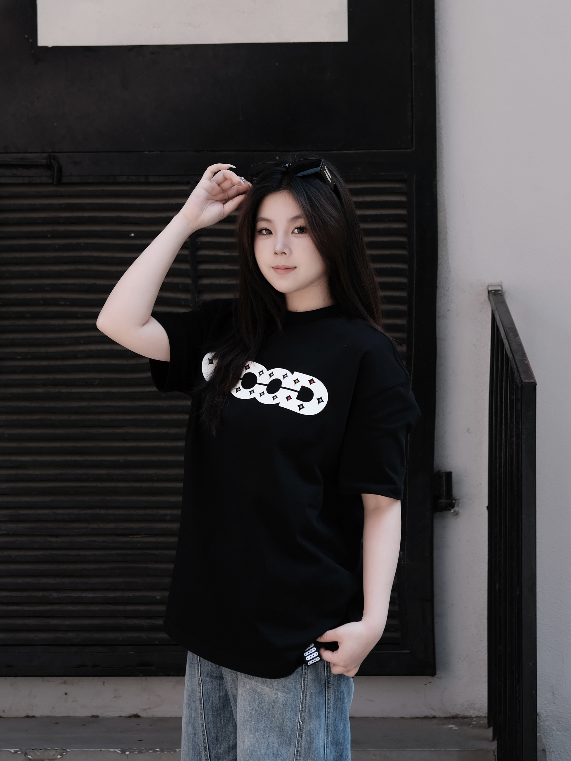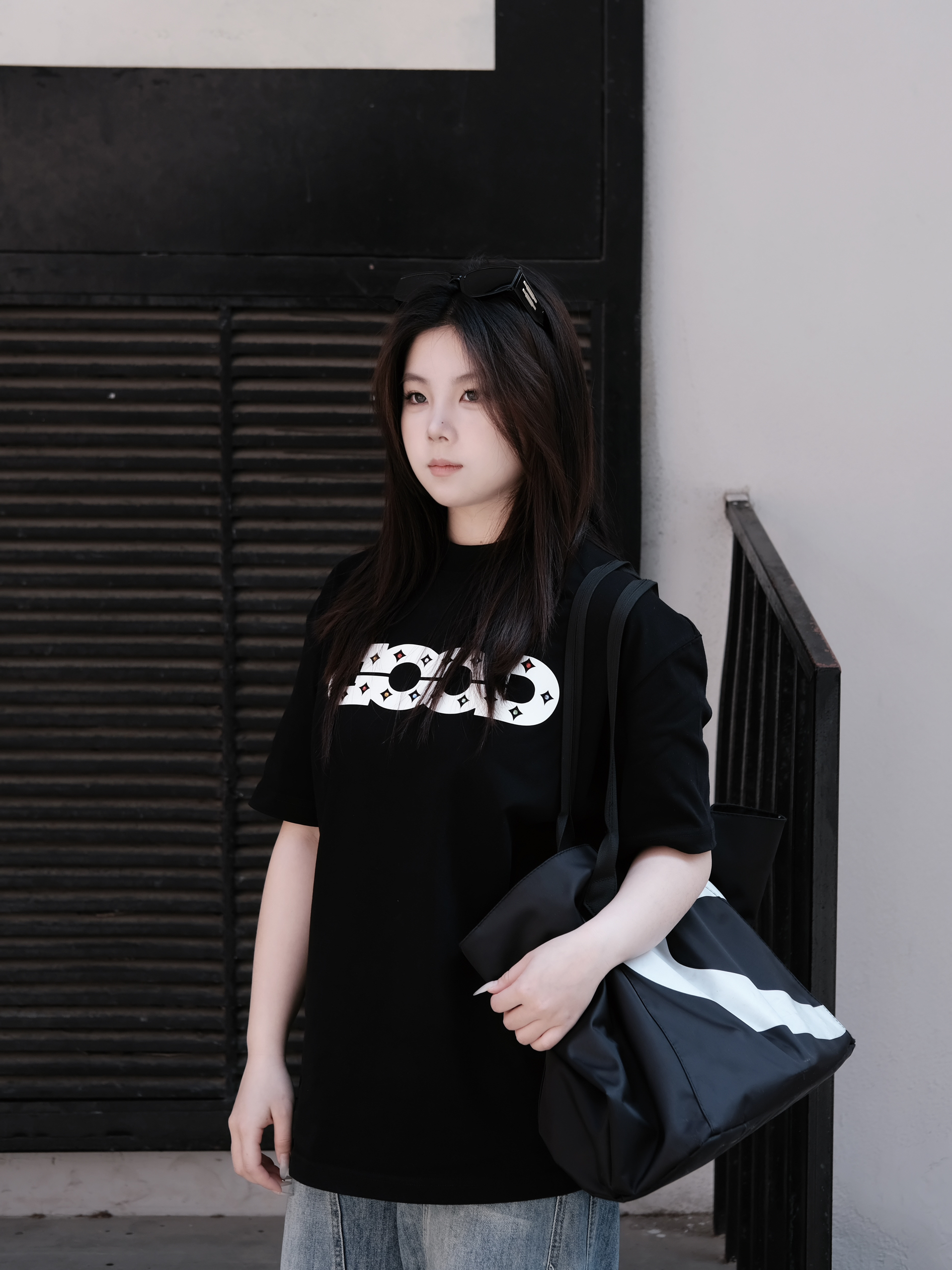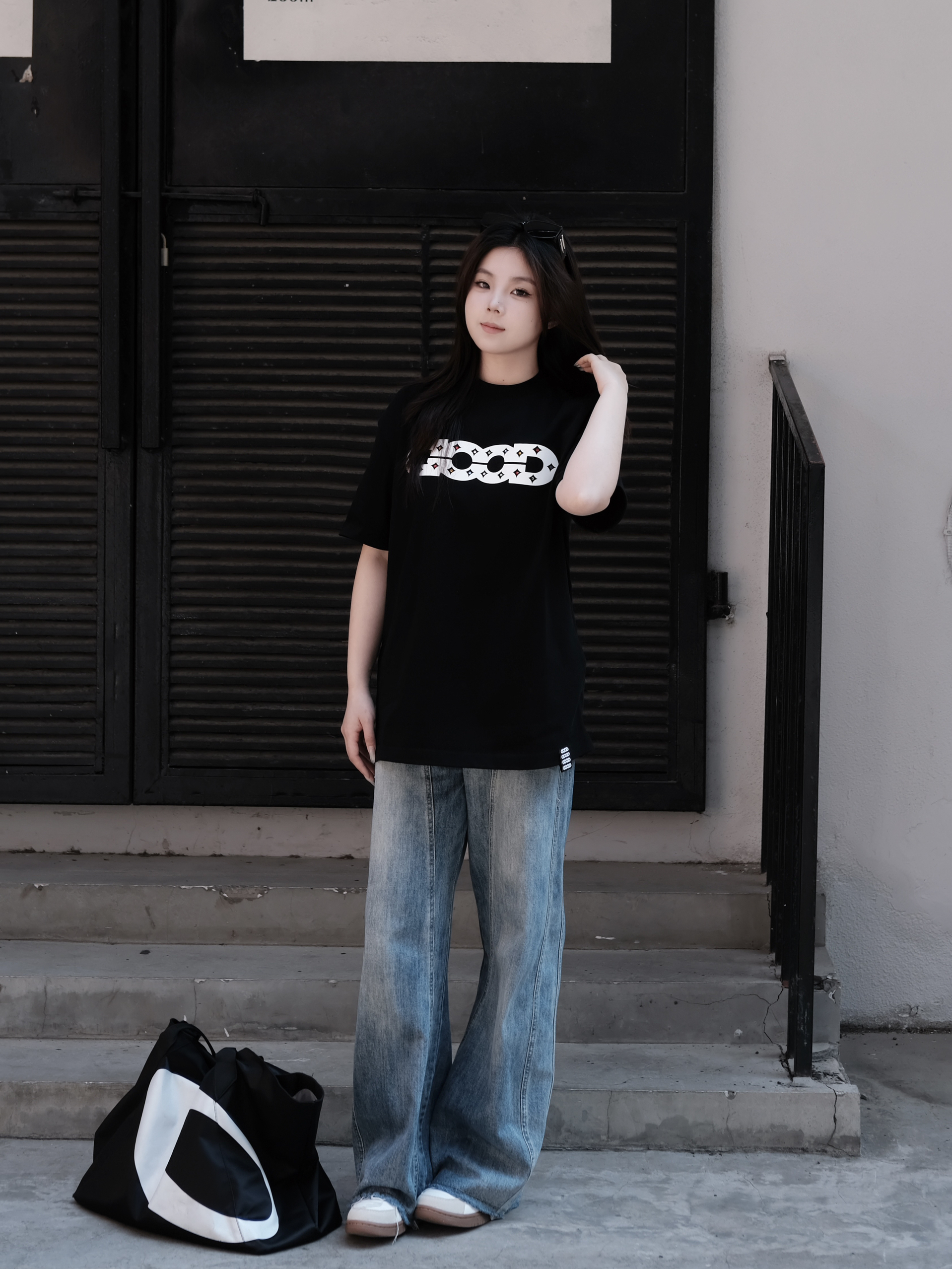 黑色短袖和牛仔裤的万金油搭配 good镂空+烫钻有点帅 简约设计穿多久都不过时 面料有质感 穿上舒适还透气 中性风穿情侣款👫也很不错