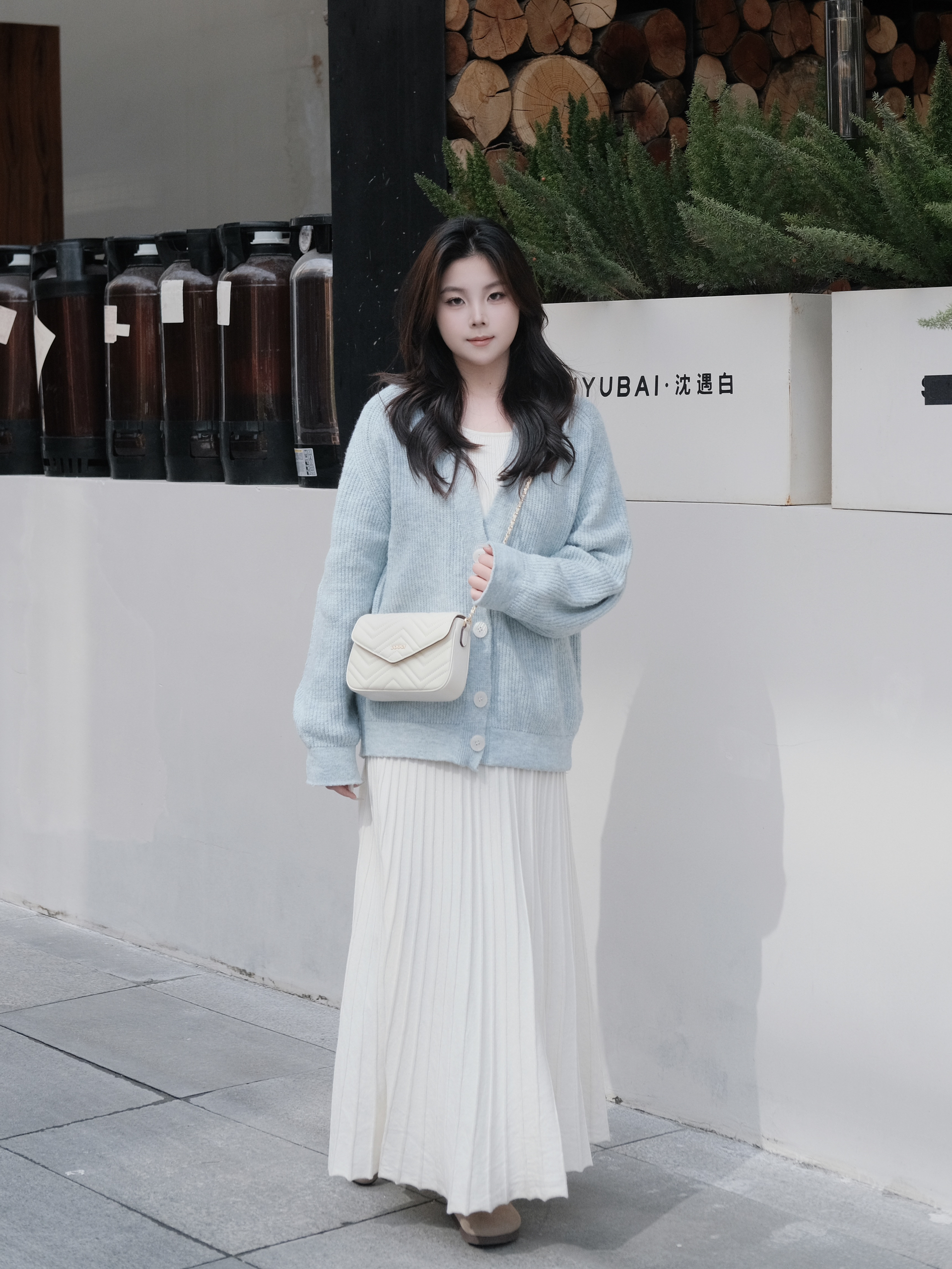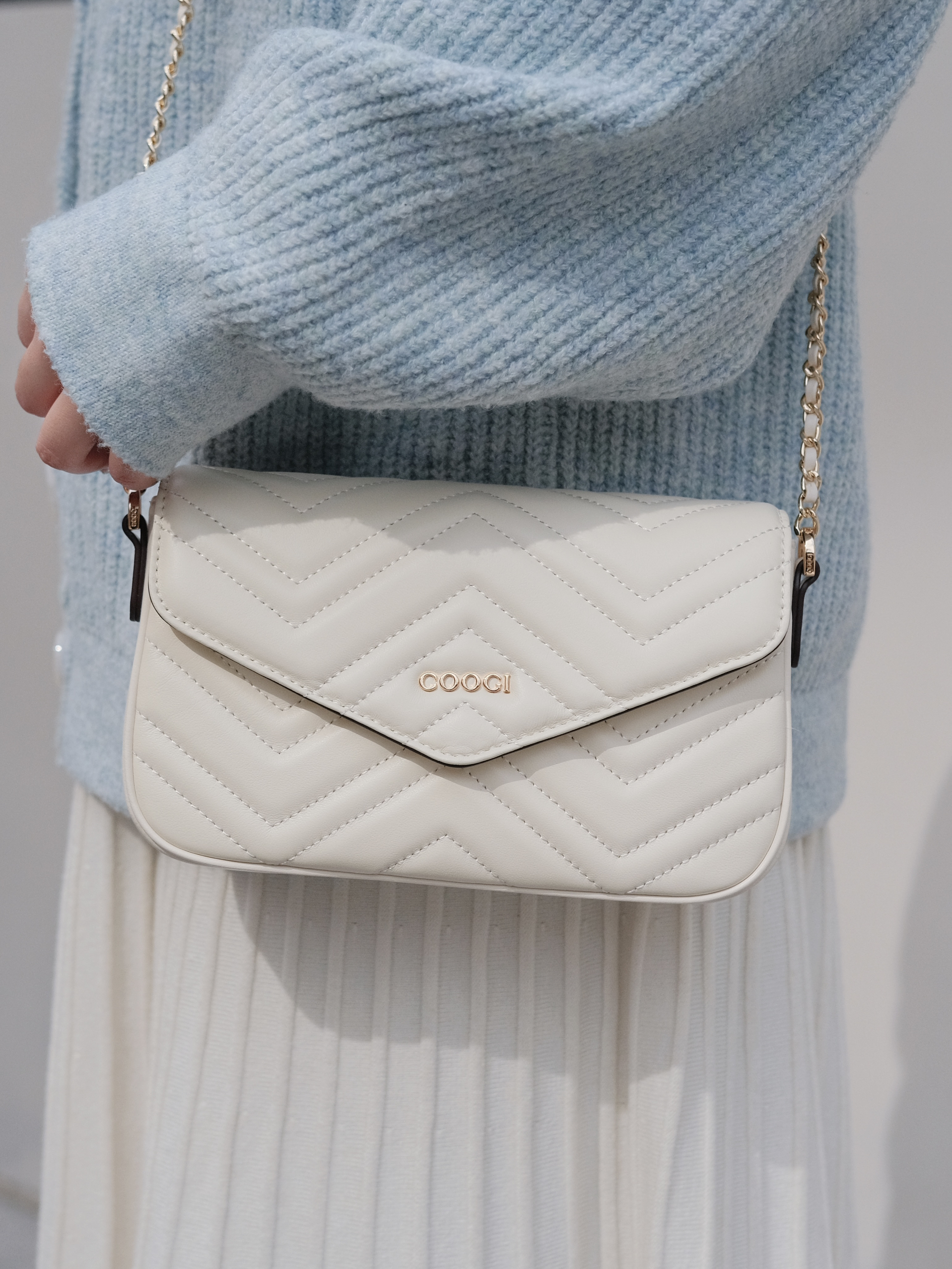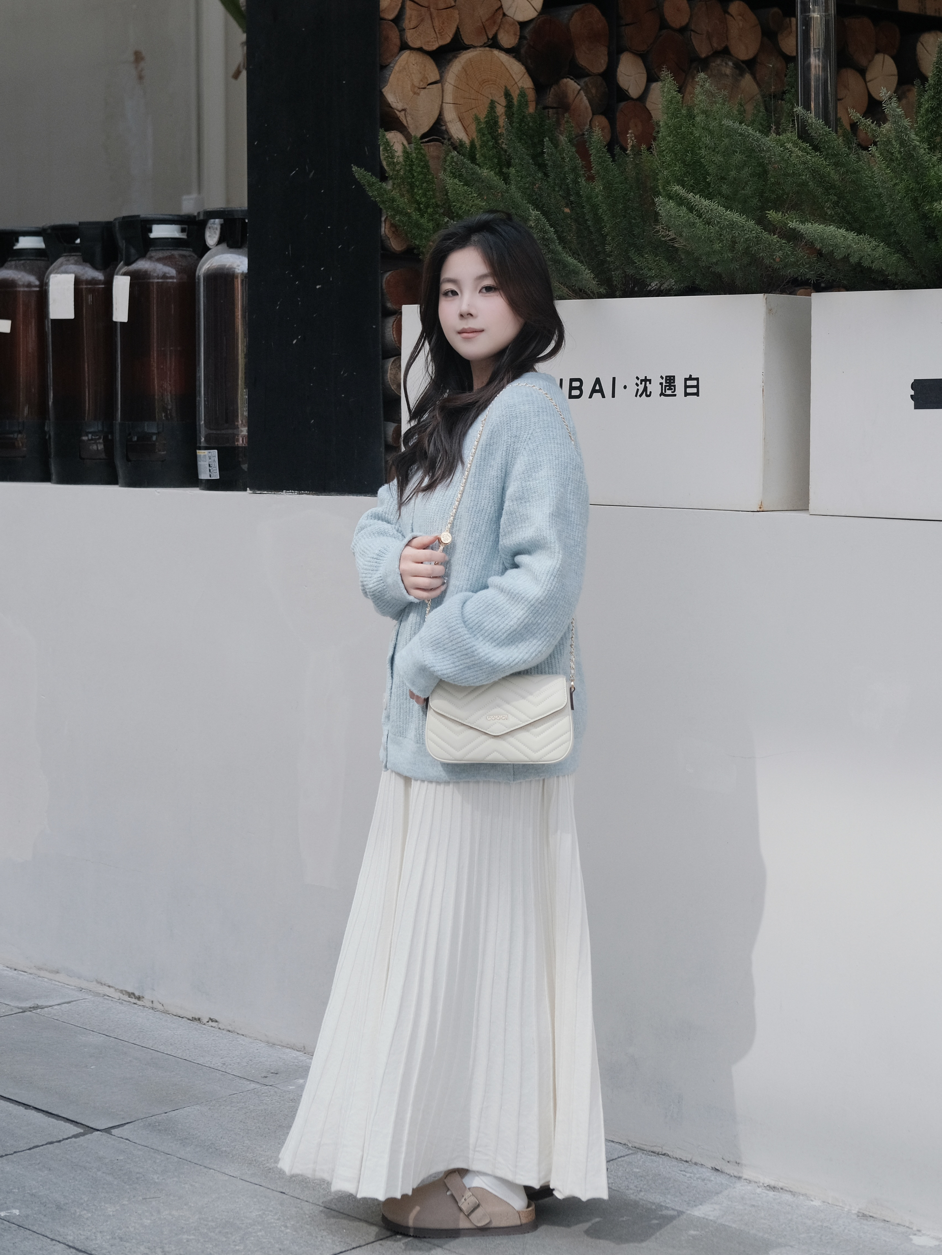 蓝白配色的穿搭清爽又温柔 搭配的包包也跟穿搭相呼应 是奶白色🥛的小香风包包 皮革面料也很有质感 日常出门或者约会都可以背~