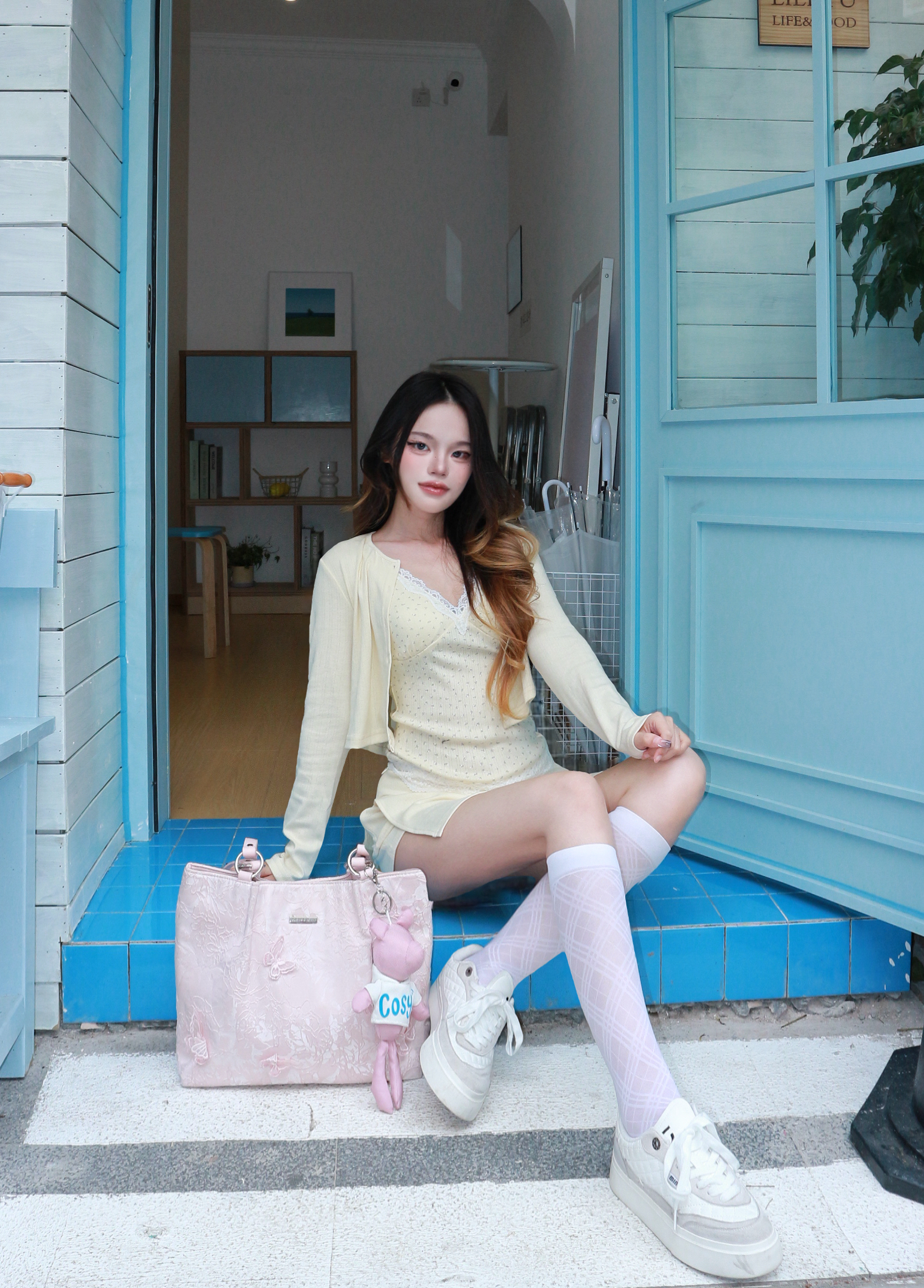 这个粉粉的托特包真的是韩系甜妹的本命👛 💡我的穿搭思路: • 上半身:浅杏色针织开衫+蕾丝内搭,营造松弛又精致的层次感 • 下半身:同色系A字短裙+奶白小腿袜,拉长比例又显乖巧 我165/96穿的m码~