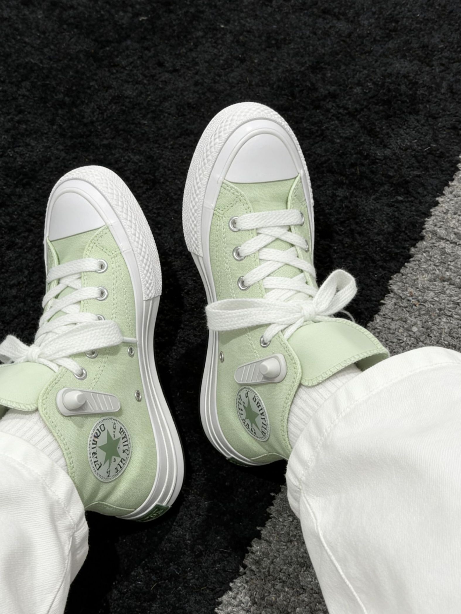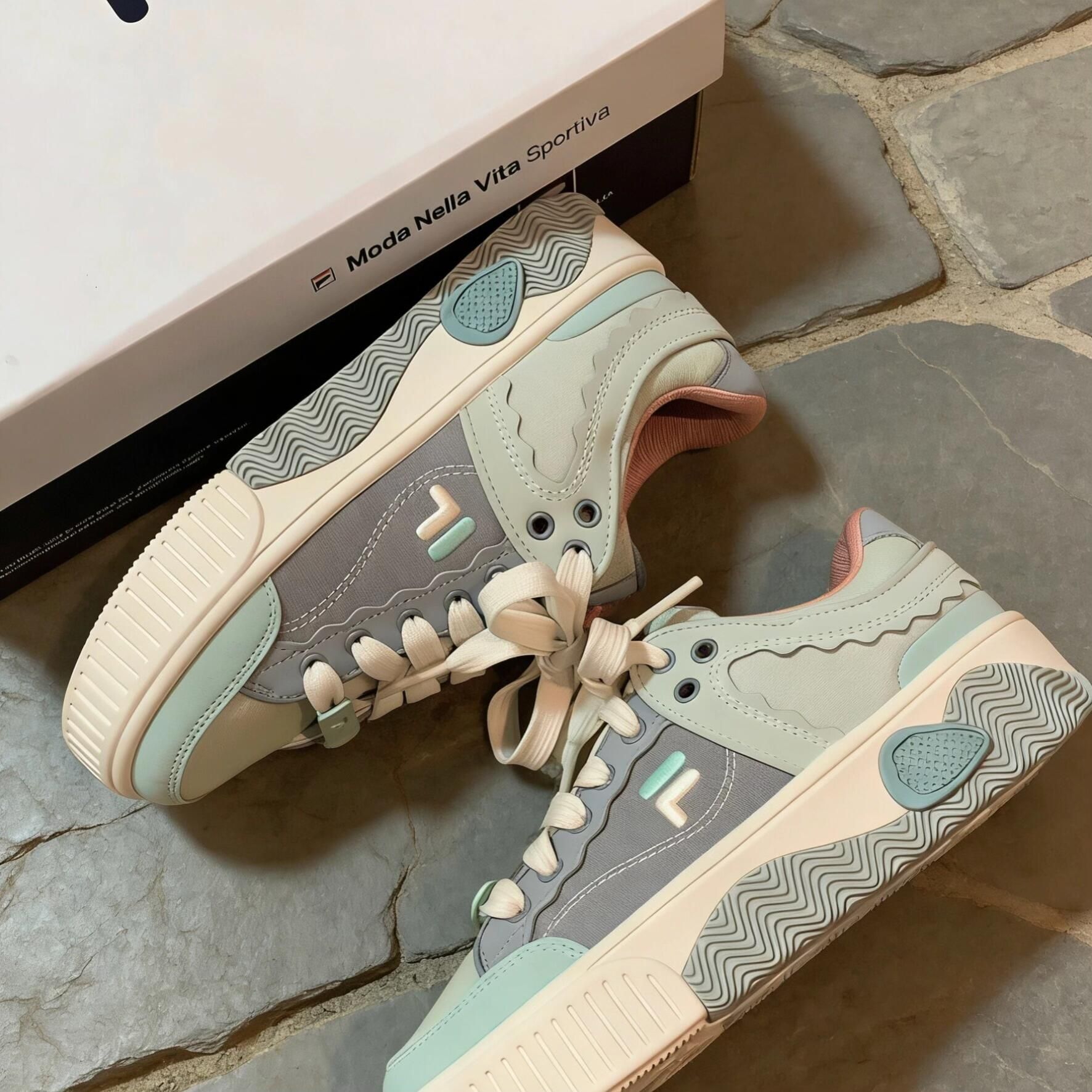 穿了半个月,这双拼色板鞋我真的爱了💓 薄荷绿撞浅灰的配色真的戳我🍃,马卡龙调调温柔又清新,鞋身的波浪纹细节还挺有设计感的。上脚包裹感很舒服,鞋底软弹不板脚,日常走个万步都没压力,鞋型还悄悄显脚小,搭休闲装巨合适~