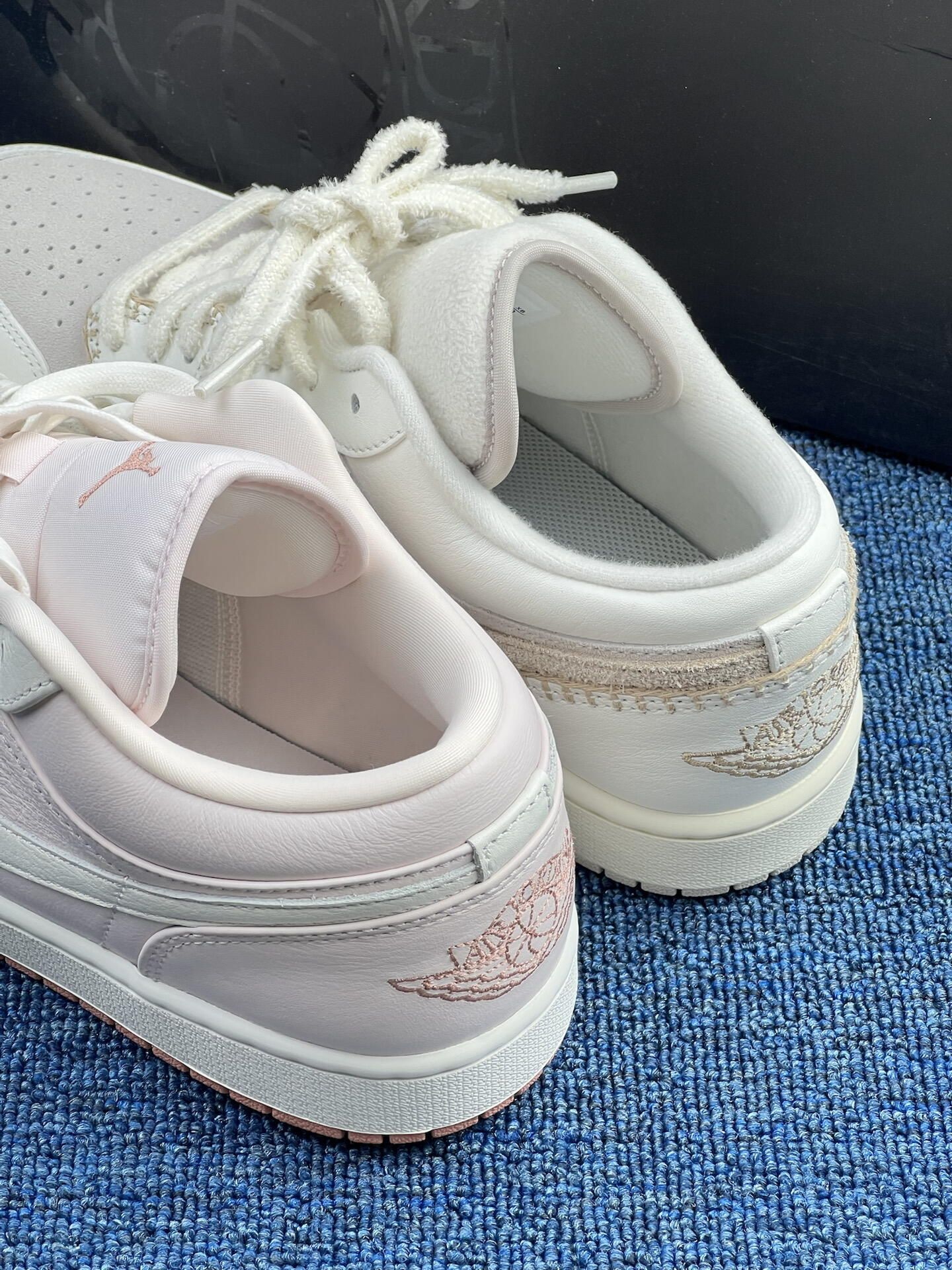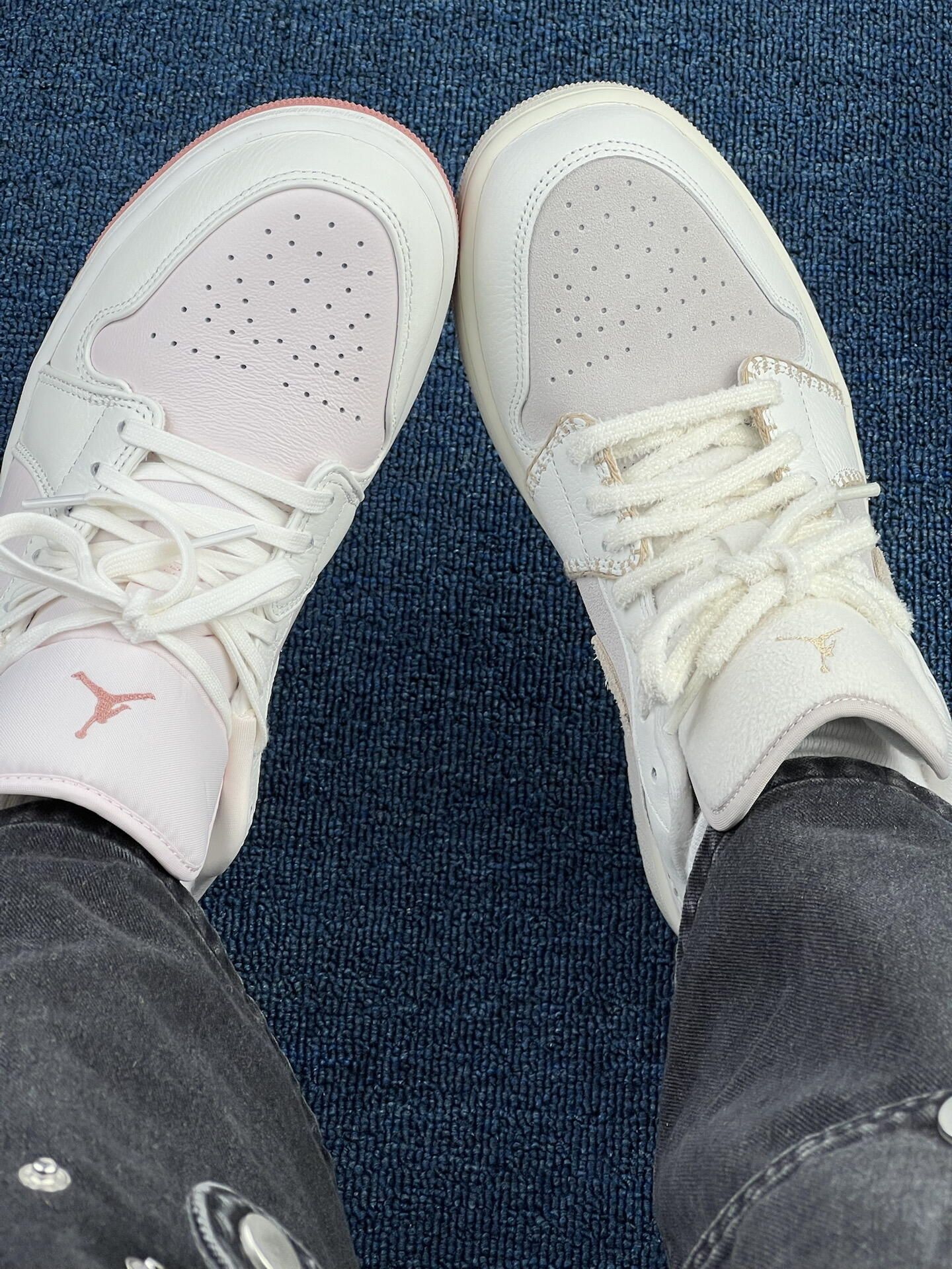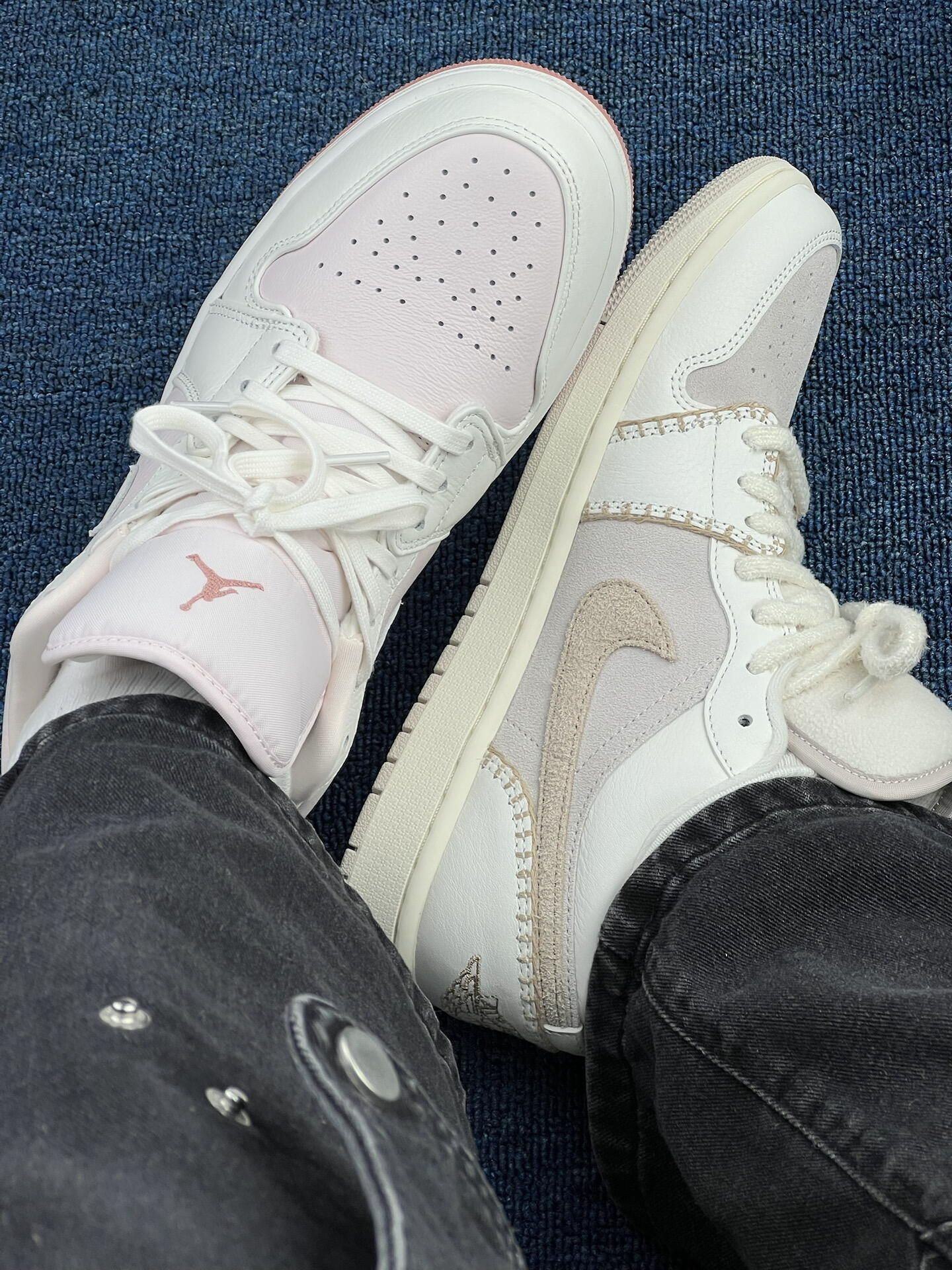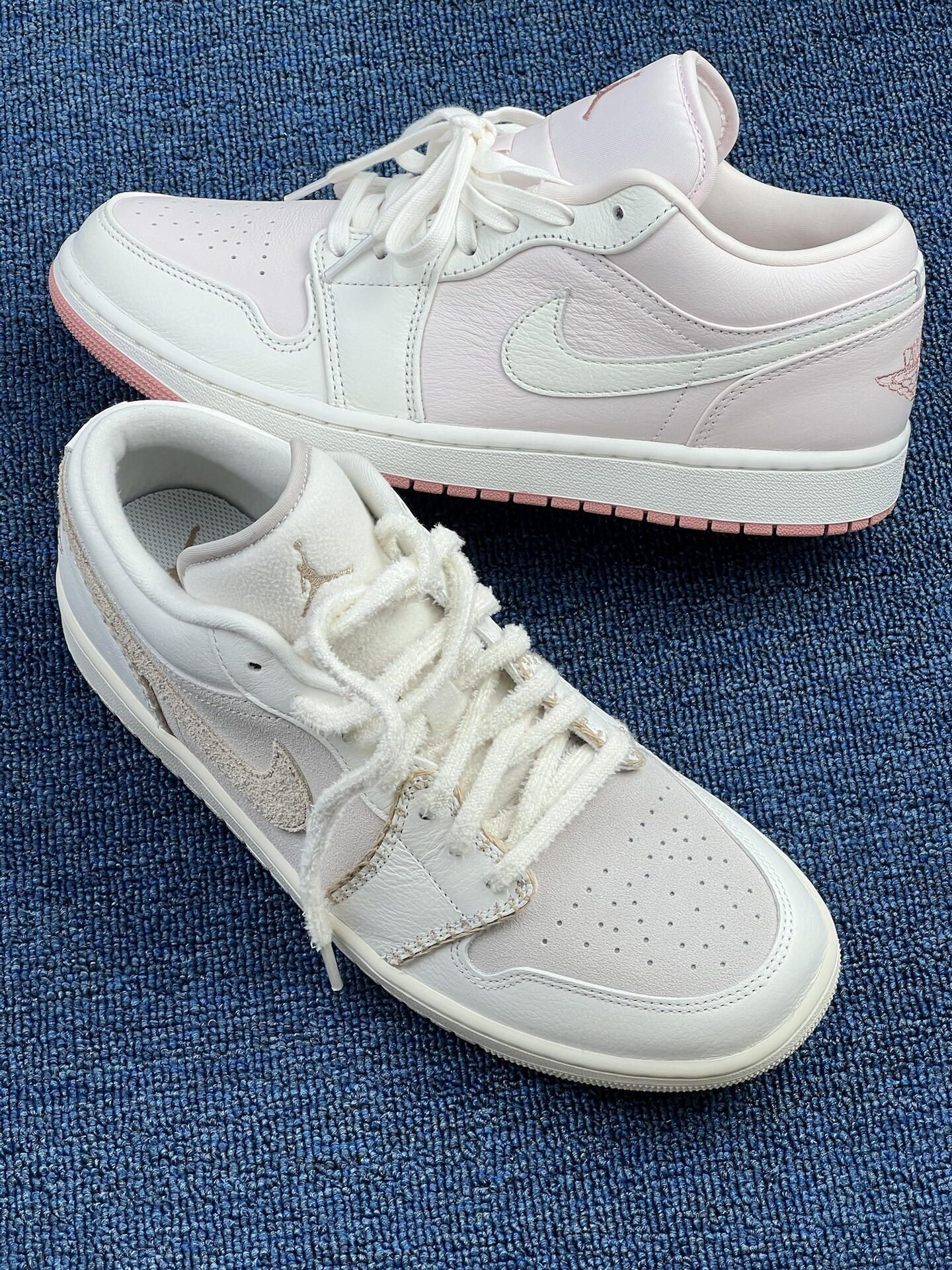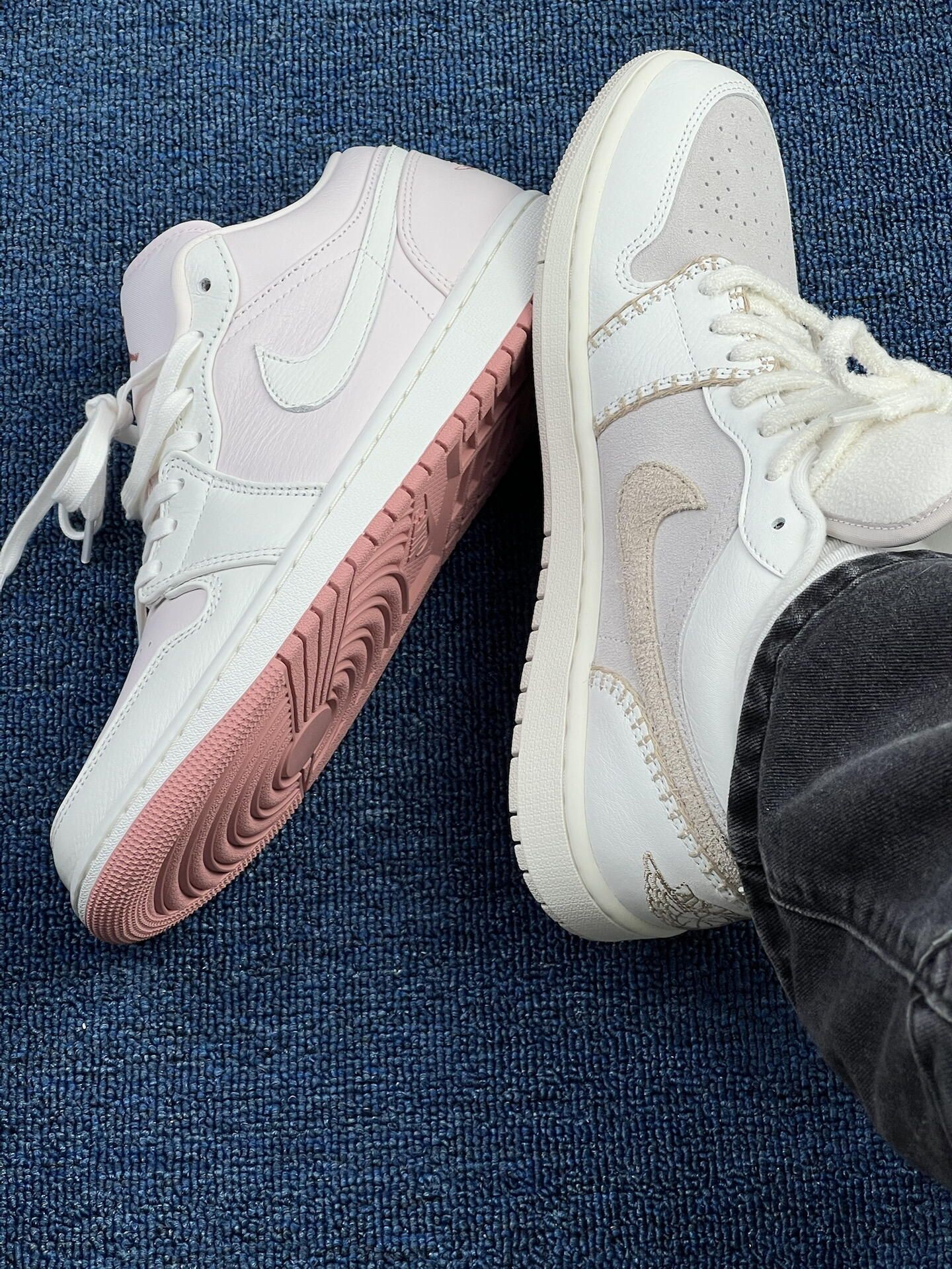 这双AJ鸳鸯二选一,试穿3天我纠结麻了😅 左边米白那双:上脚是柔和的奶感,鞋面透气孔是真给劲[强_blue][强_blue],昨天逛了2小时街没闷脚,但鞋头的米白容易蹭灰,今早擦了3分钟才干净。鞋舌的绒面摸着软,但出汗后有点粘脚,得勤换袜子[敬礼_blue]。 右边粉调那双:脚感和左边没差,但粉色内衬显嫩,配浅色系裤子更出片[惊喜_blue][惊喜_blue][惊喜_blue]。缺点是鞋边的淡粉...