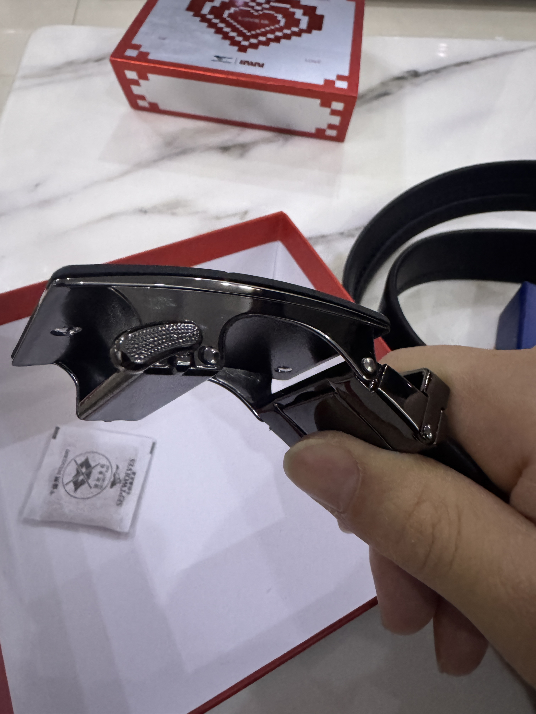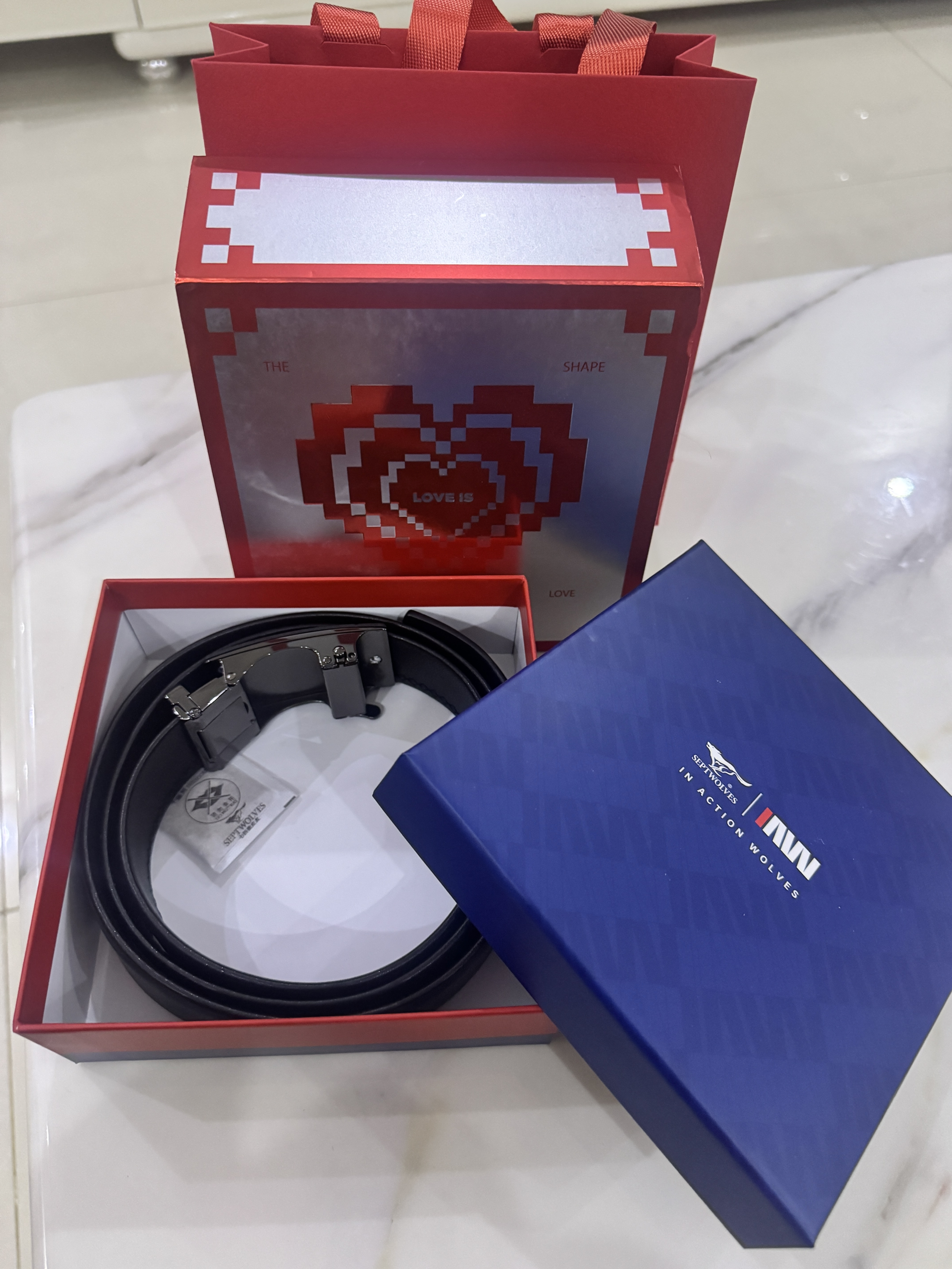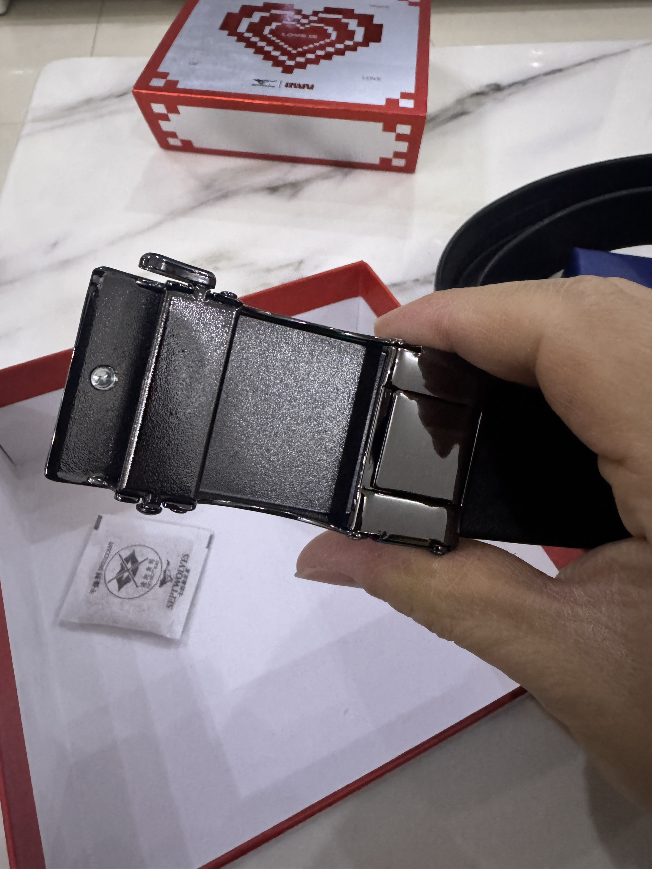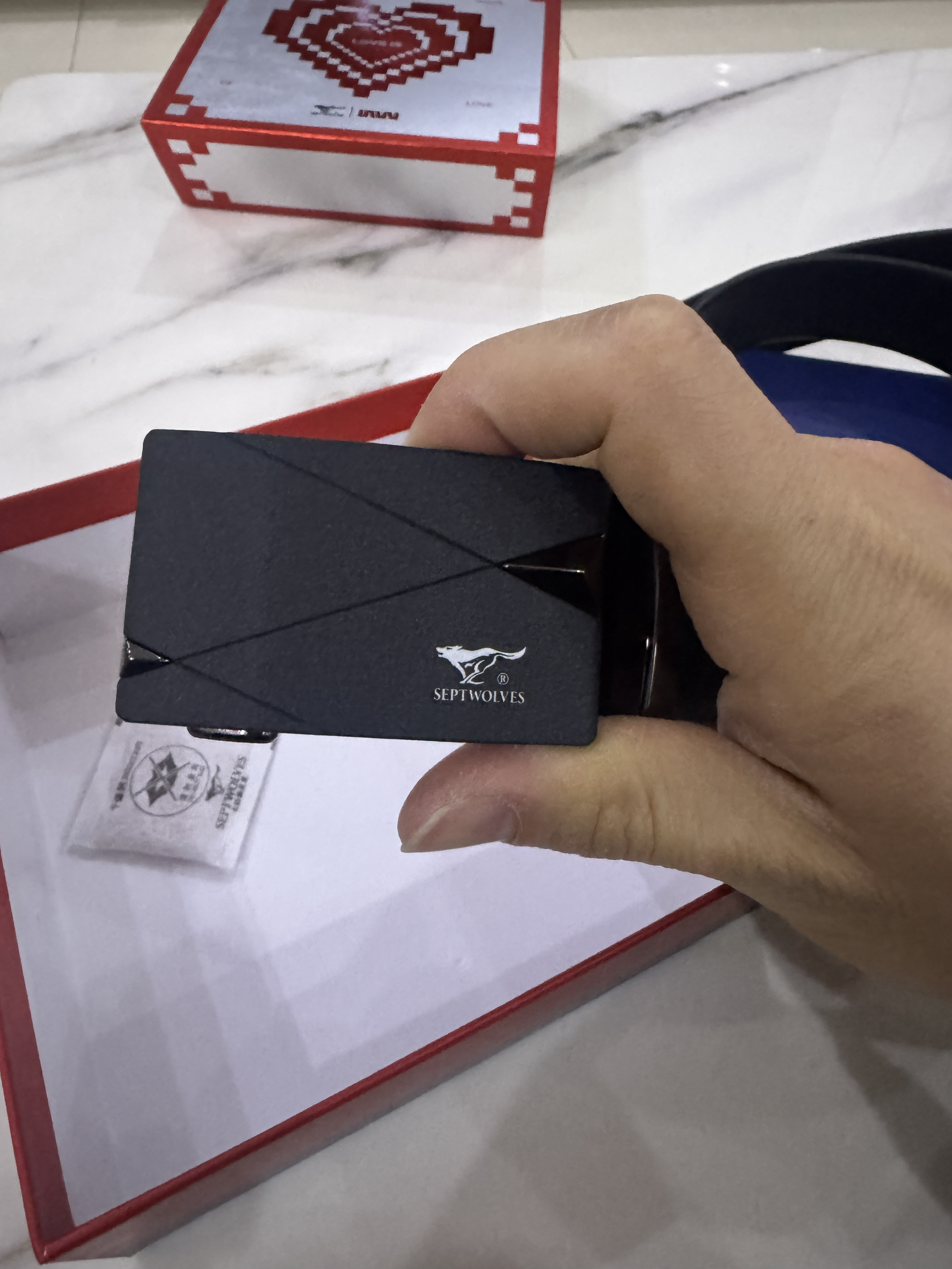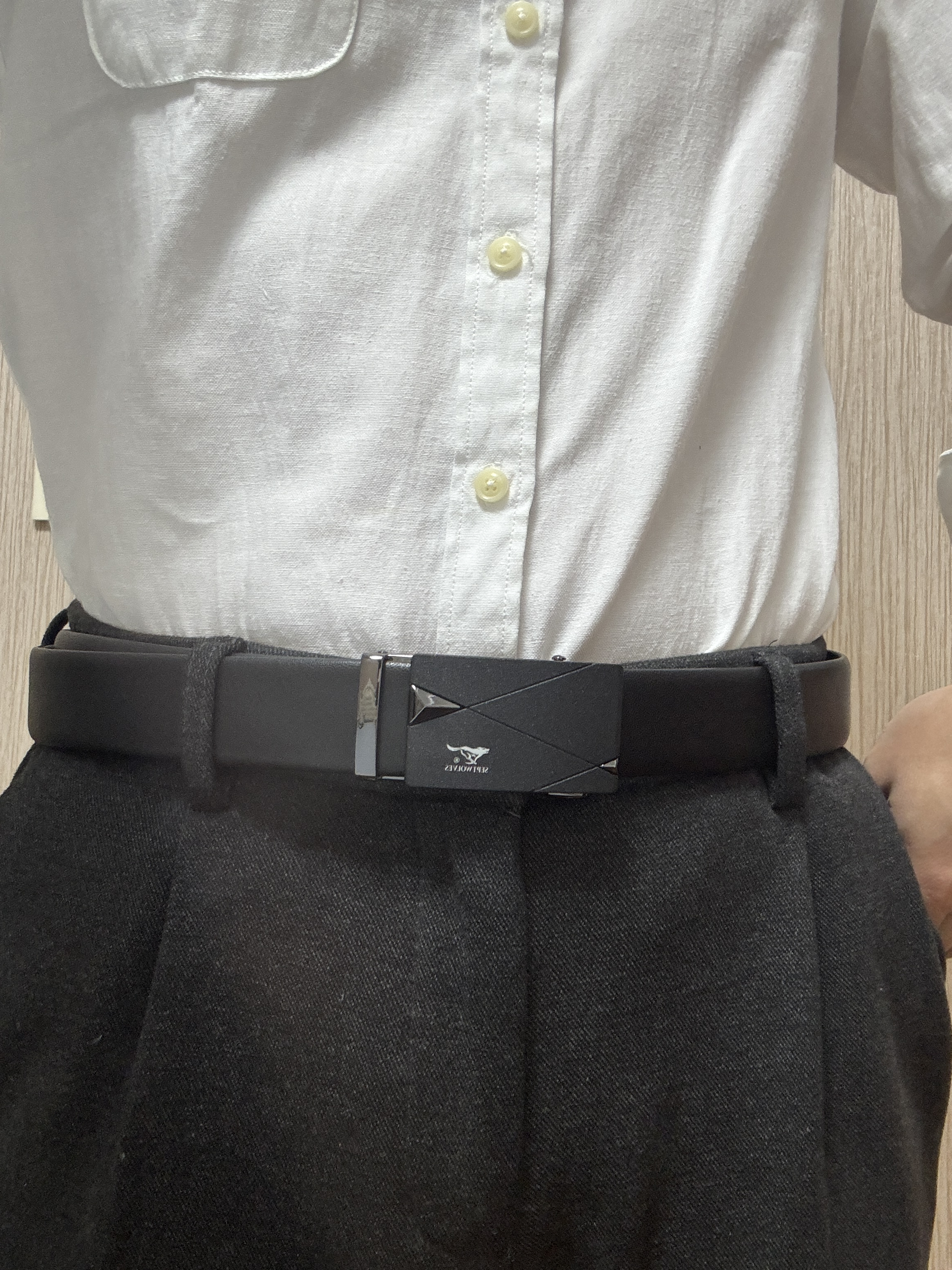 ✨ 外观与质感 • 扣头设计:黑色磨砂合金扣头,几何线条感很强,低调又有设计感,不会像亮面扣头那样容易留指纹。狼头logo和“SEPTWOLVES”字样清晰,细节到位。 • 皮带材质:头层牛皮,摸上去细腻有韧性,不是那种硬邦邦的人造革。边缘封边工整,走线也很扎实,没有廉价感。 • 搭配性:黑色皮带+简约扣头,西裤、牛仔裤、休闲裤都能hold住,从办公室到周末出街都不违和。 ⚙️ 使用体验 •...