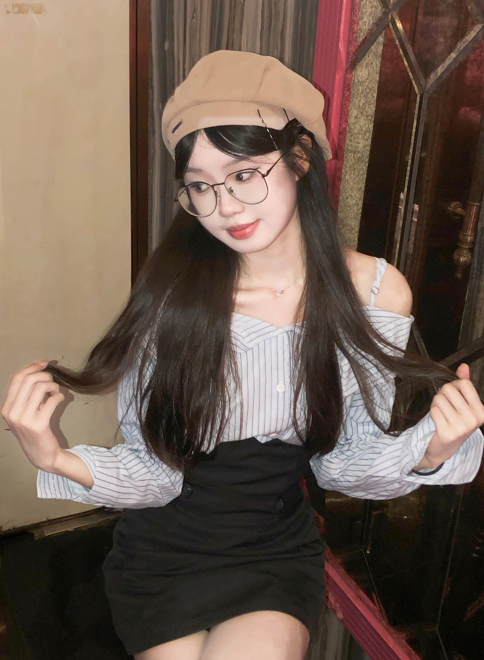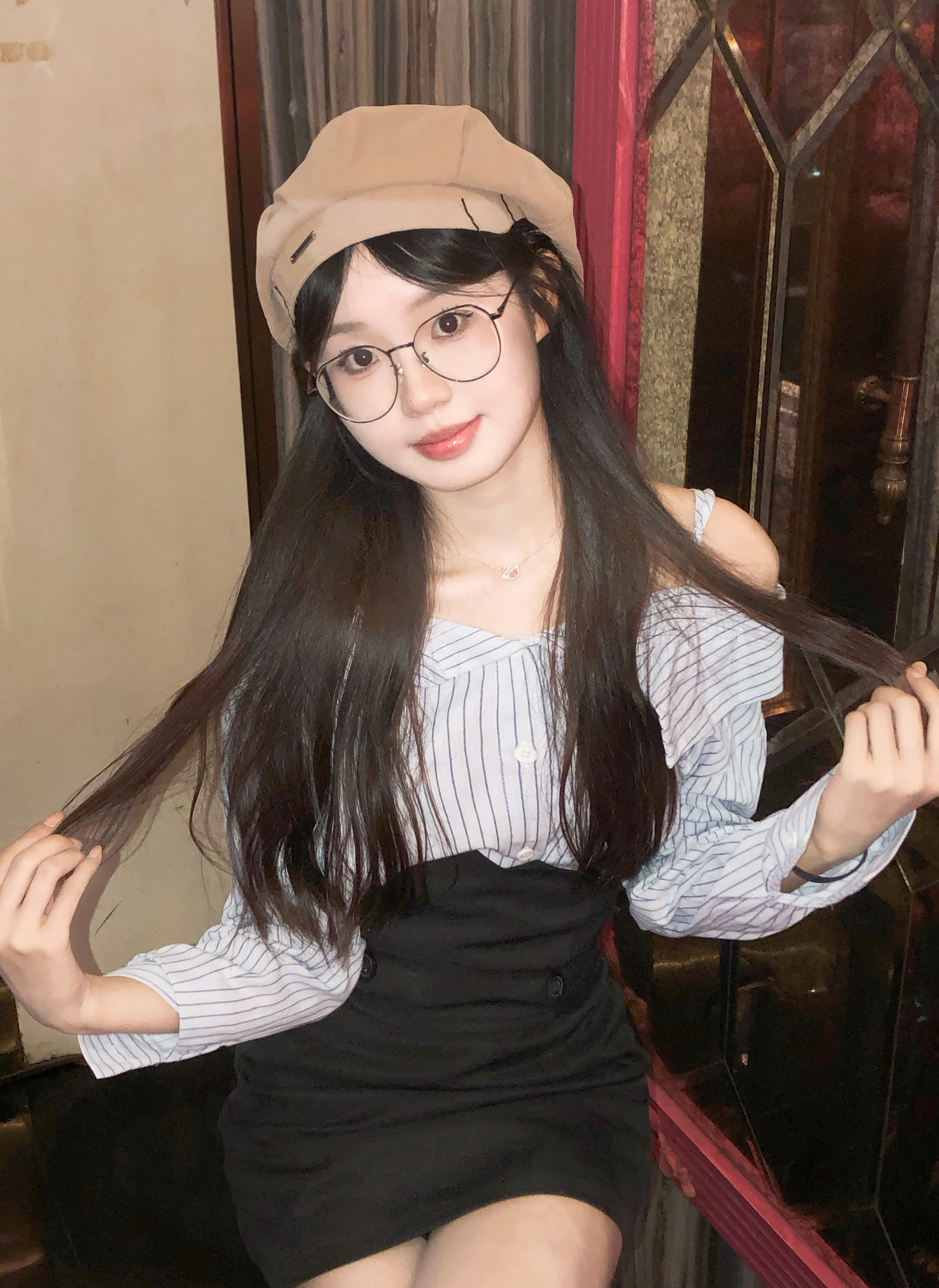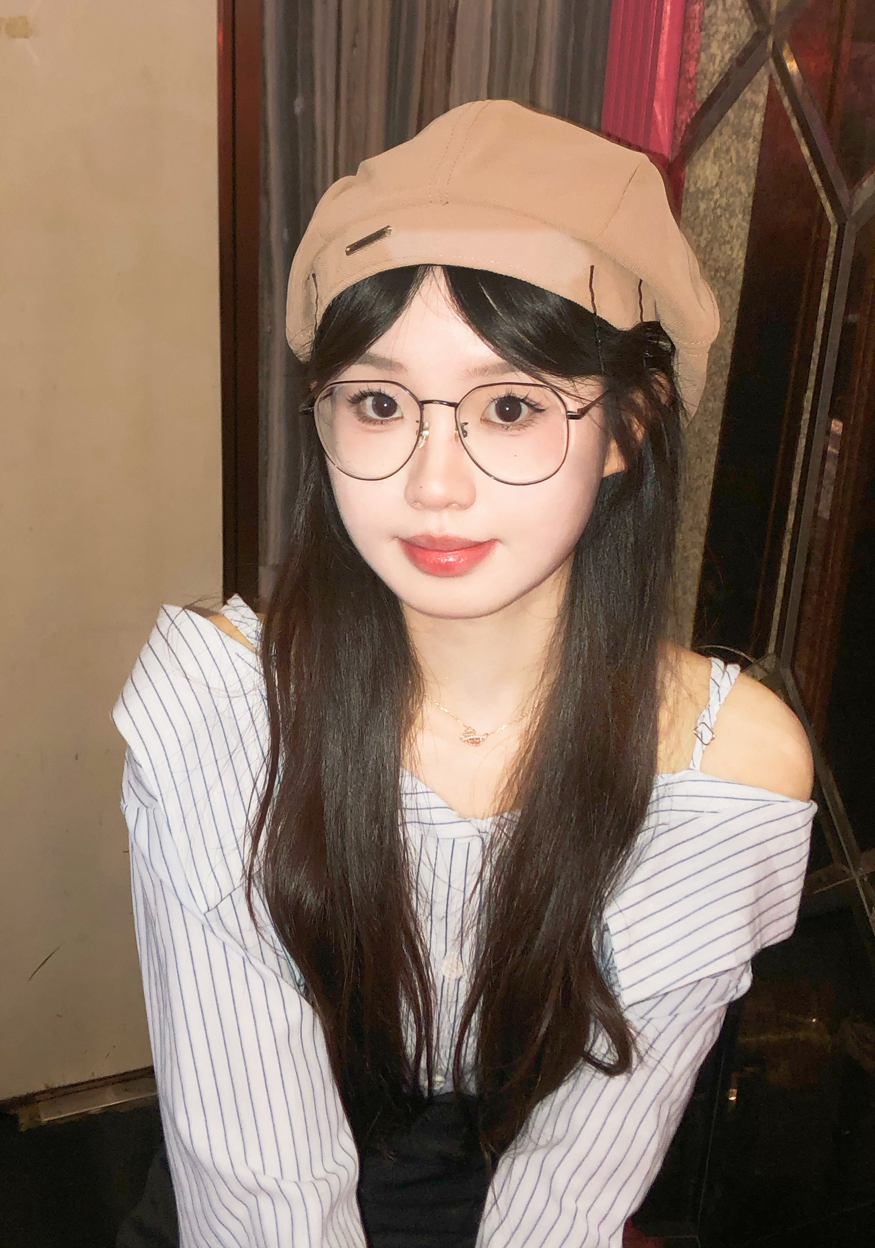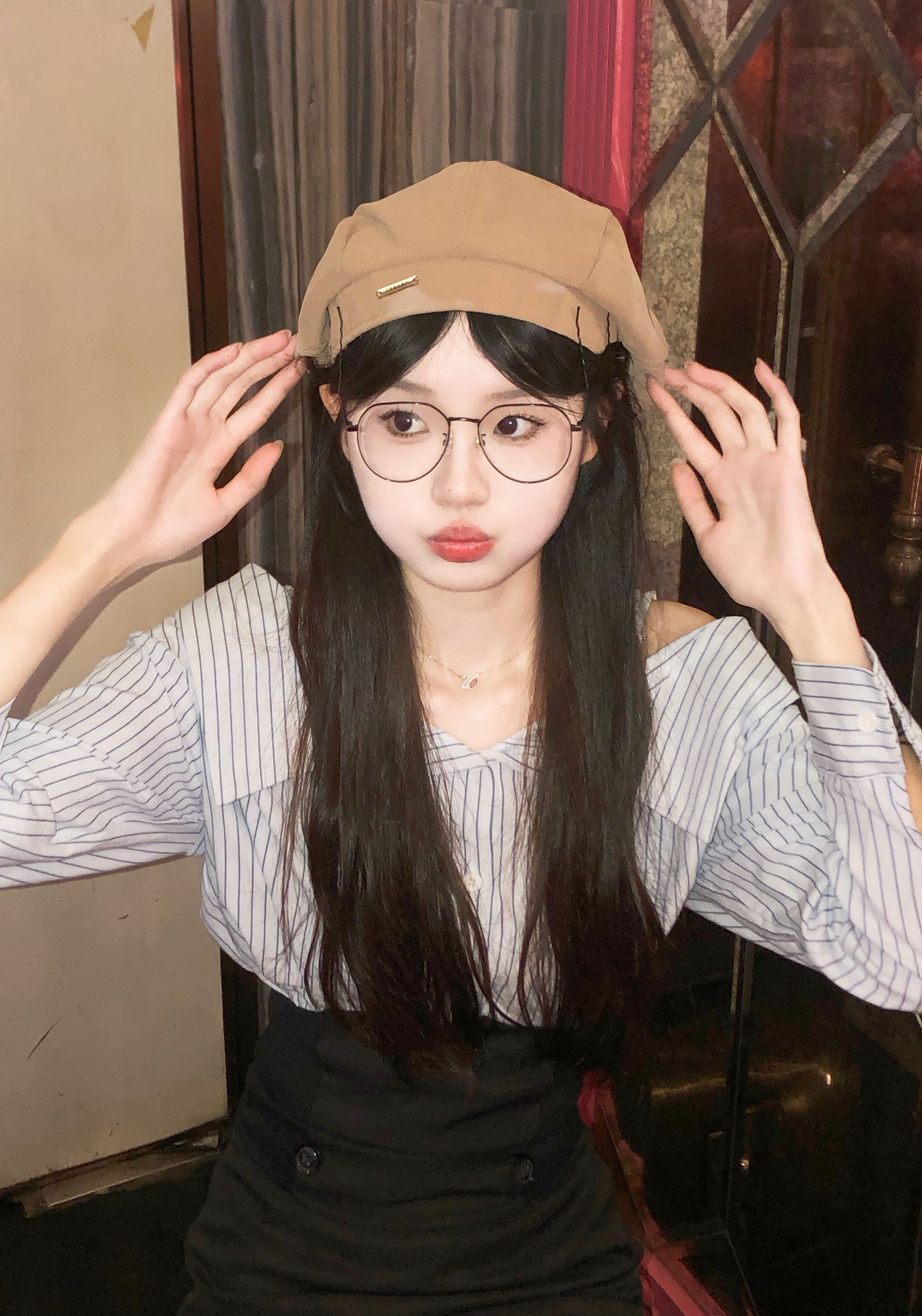 ktv用8p➕闪光灯轻松拍出氛围感照片 蓝色条纹衬衫➕上贝雷帽 真的很清纯靓丽,气质又不低俗