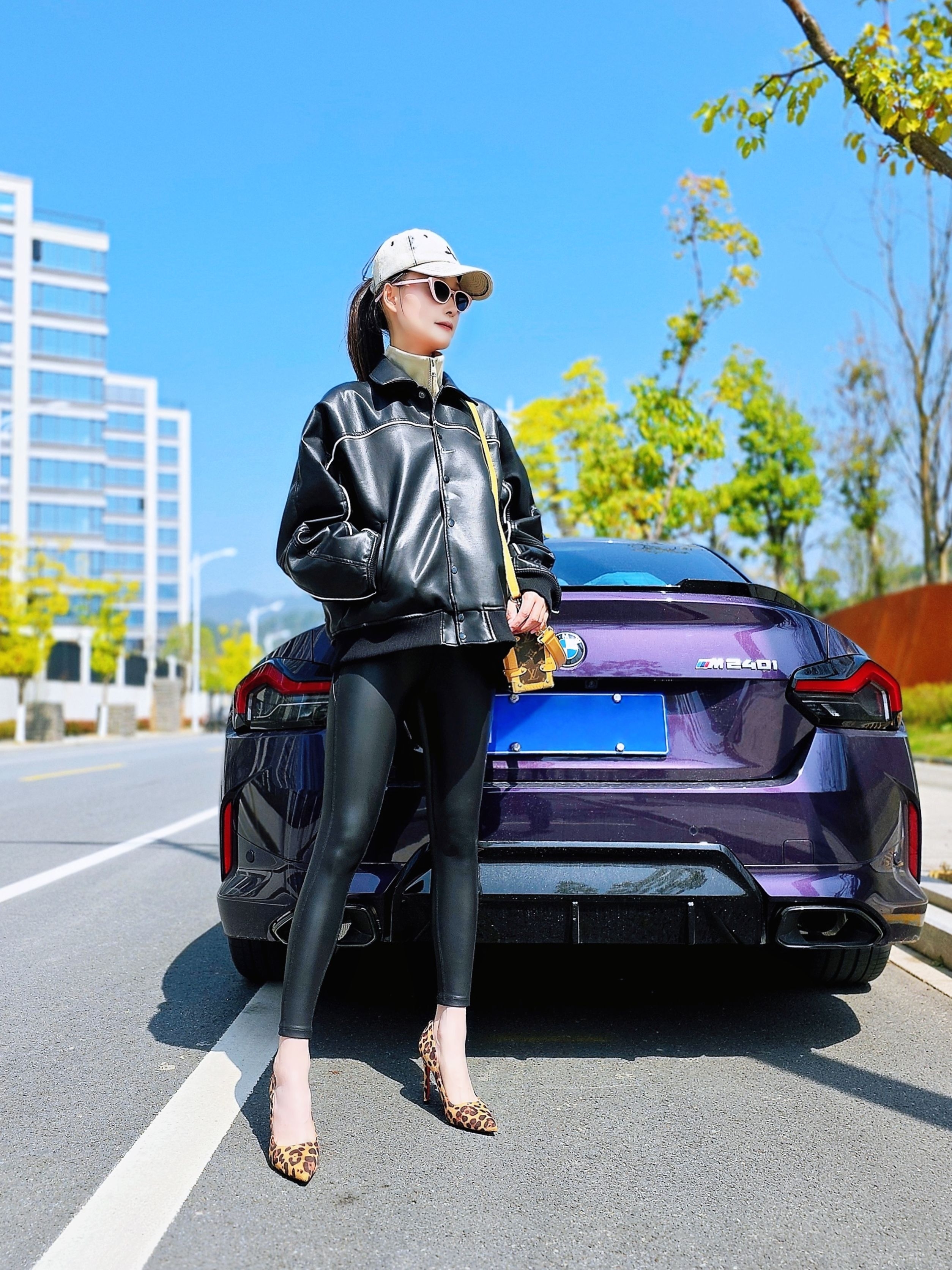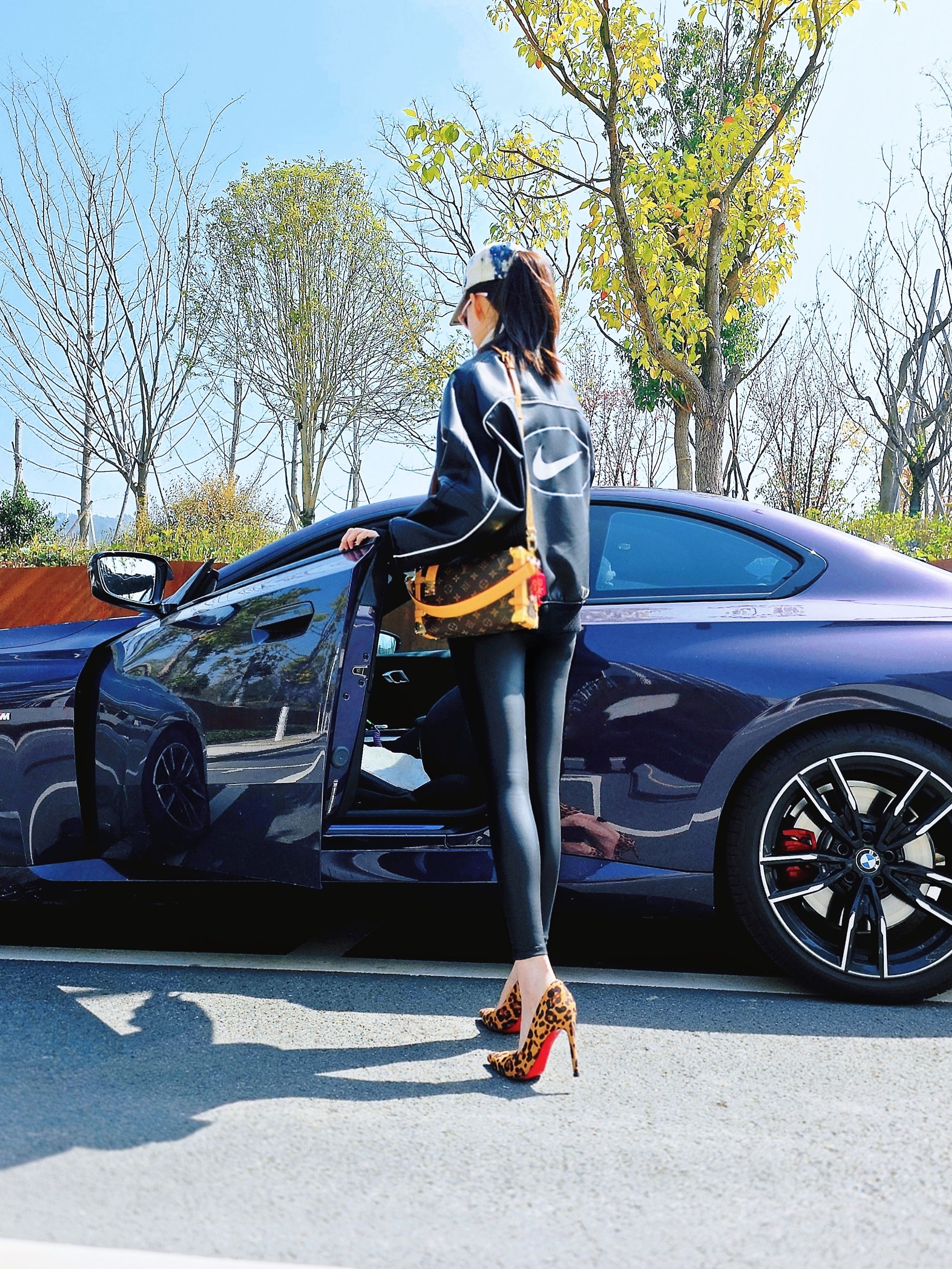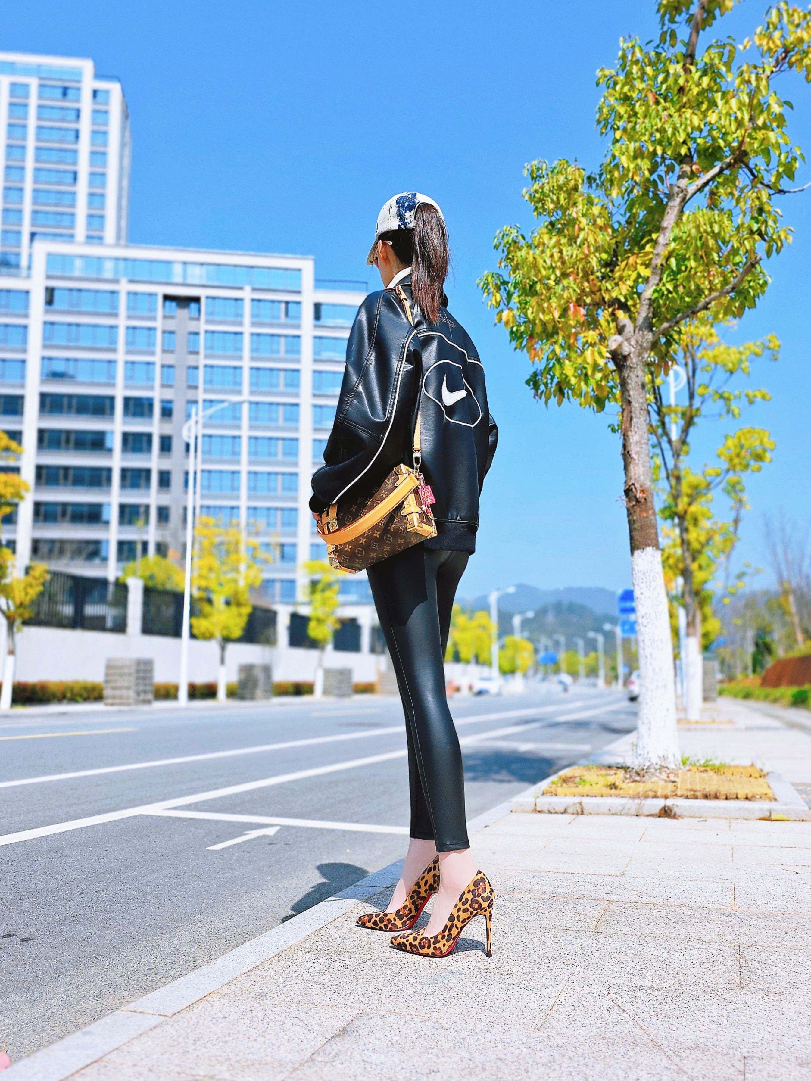黑色联名皮夹克+修身皮裤,利落廓形以及上松下紧的搭配瞬间拉长腿部比例,再来个红底豹纹小高跟的点缀,酷飒中藏着一丝小个性~街头潮酷与轻熟精致无缝衔接,早春穿搭就是行走的显眼包✨