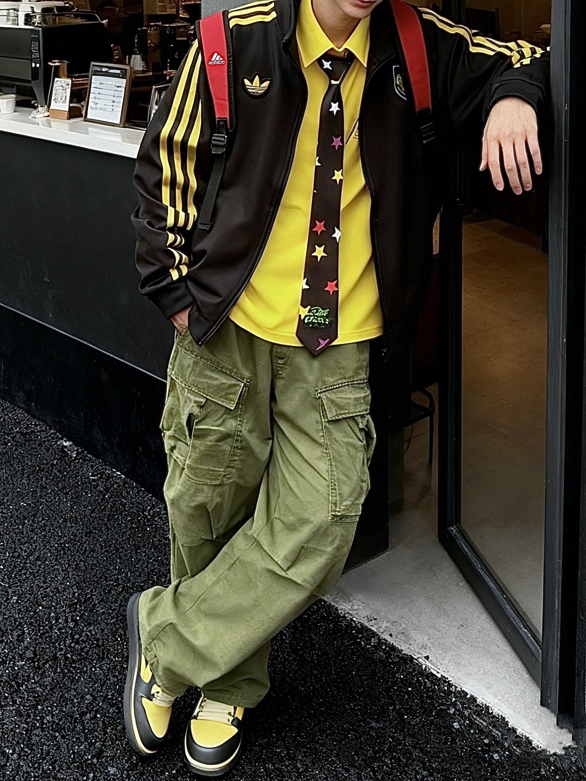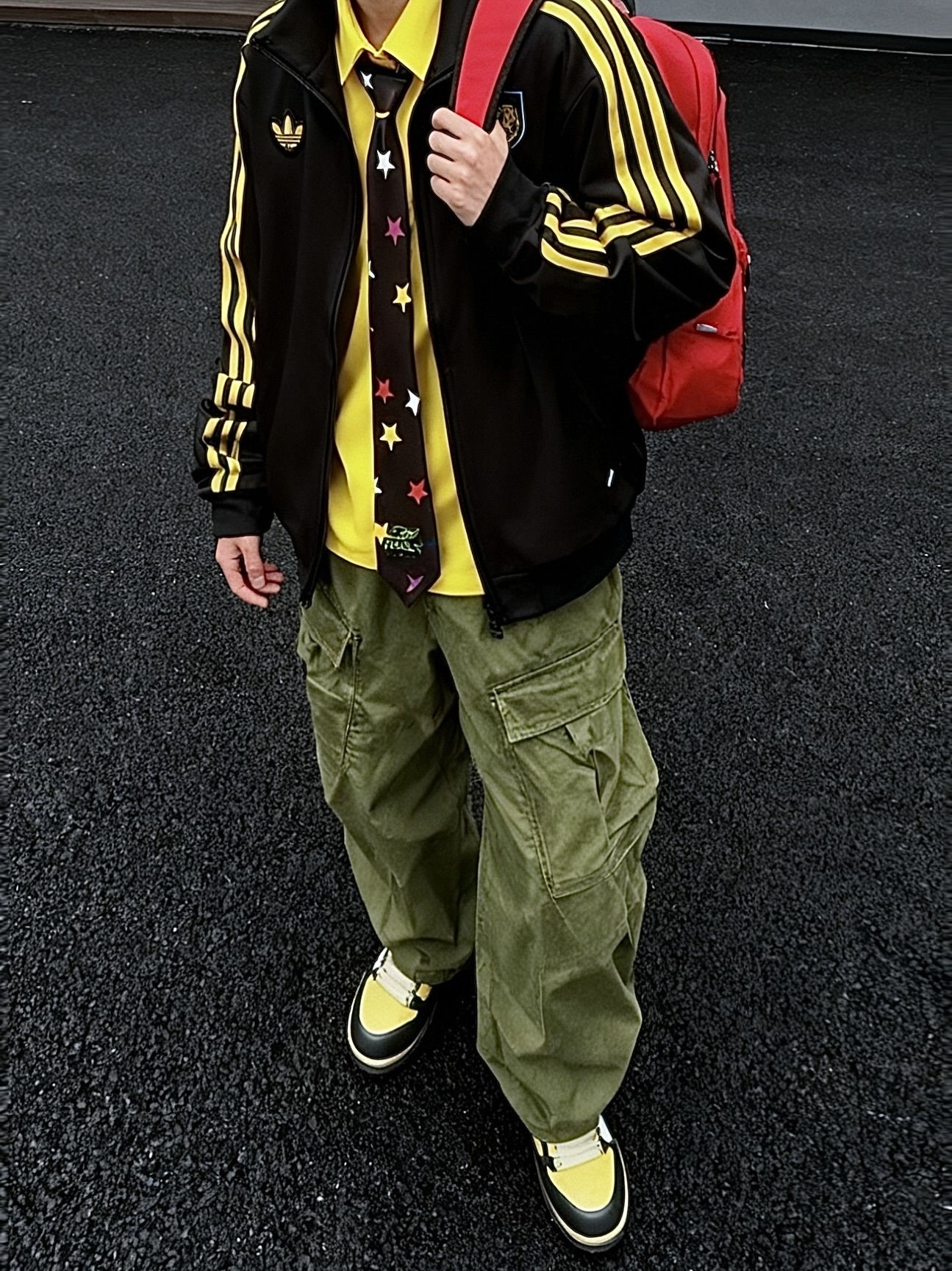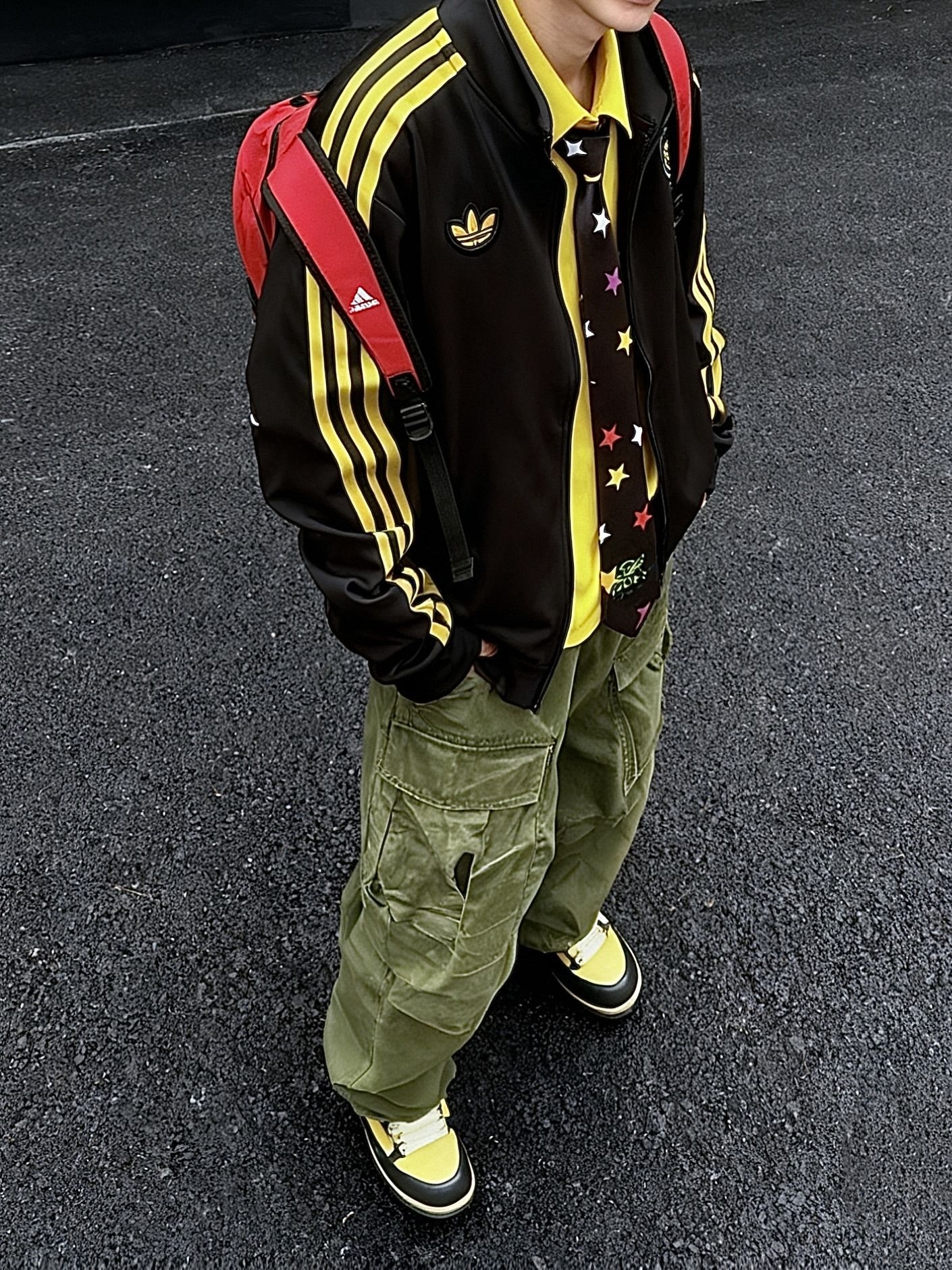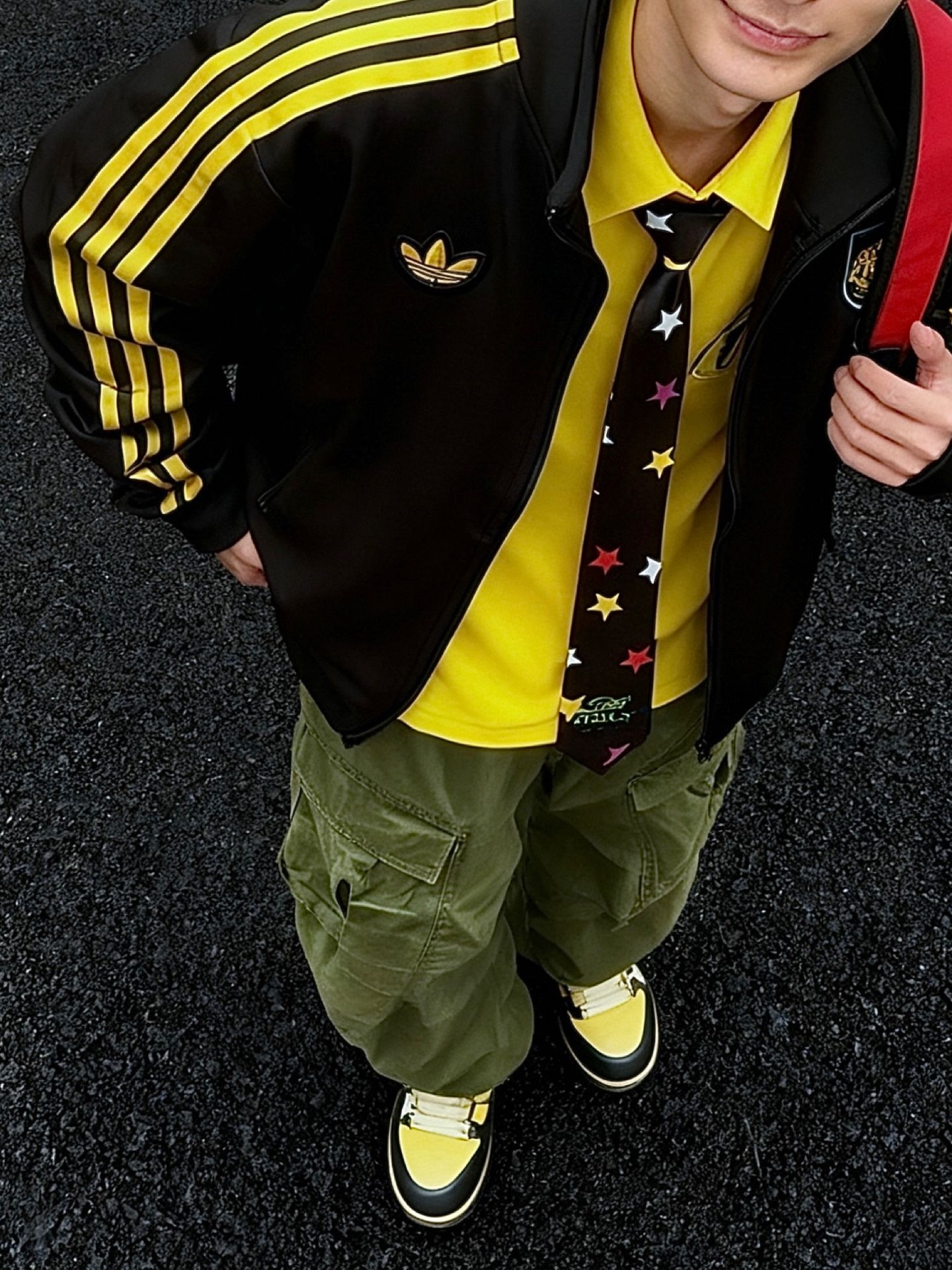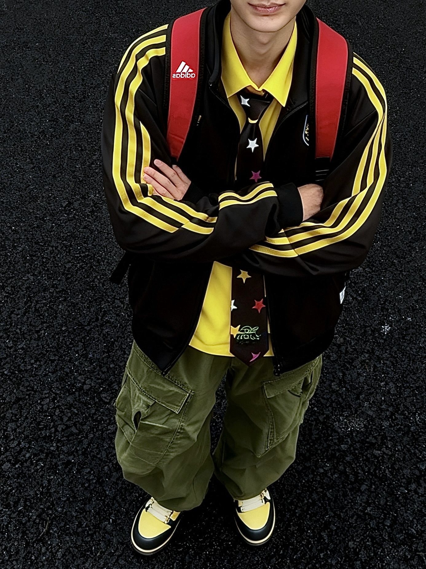 黑色阿迪夹克内搭一件黄色衬衫 高饱和多巴胺 别太吸睛了我说 这套小孩哥穿搭很适合街头潮流场合~ 夹克搭配工装裤超有型 领带上的星星图案增添俏皮感」 还蛮合适出街的一套诶 #降温要换新装备