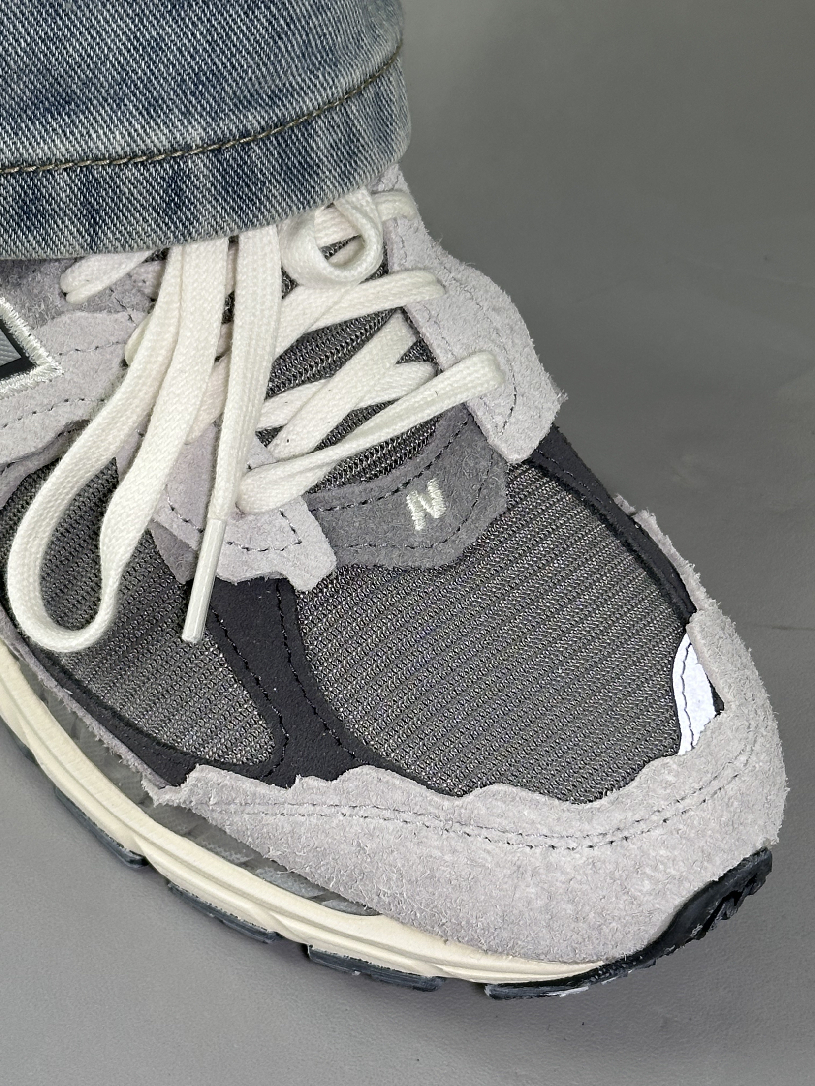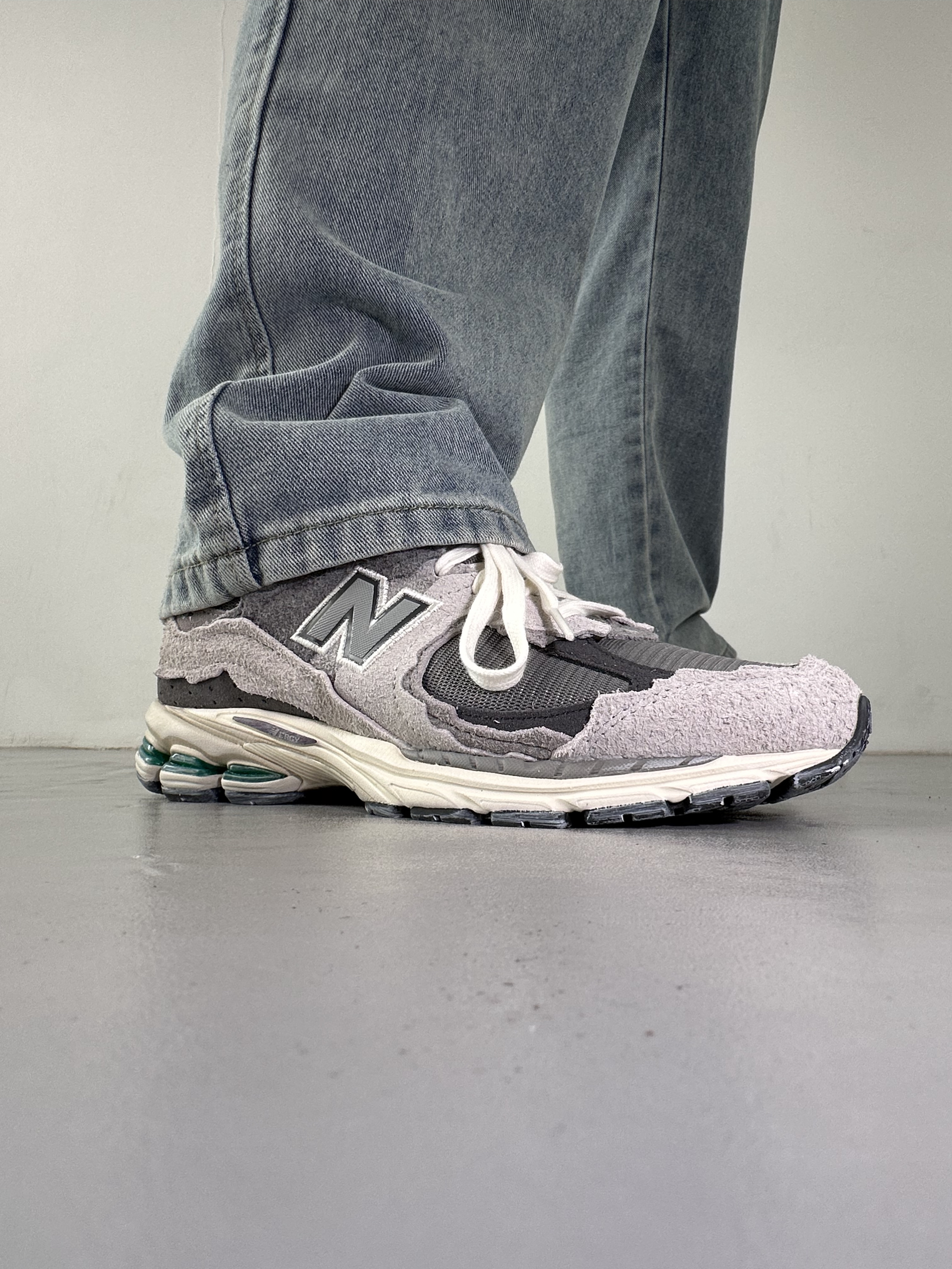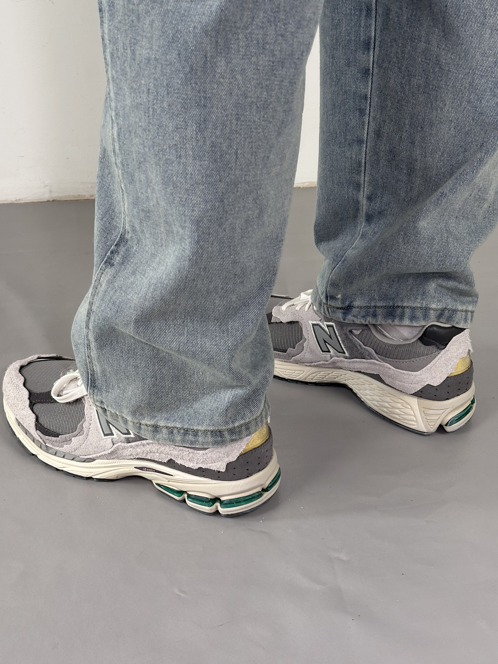 这双 NB2002R云雨灰真的越看越喜欢。 麂皮和网面拼接的质感, 做旧毛边很有复古那味儿。 配直筒牛仔裤刚好盖住鞋帮, 把我的腿显得又直又长。 走了一下午路脚感软弹完全不累脚。 这种低饱和灰调设计, 搭什么衣服都不出错太省心了。
