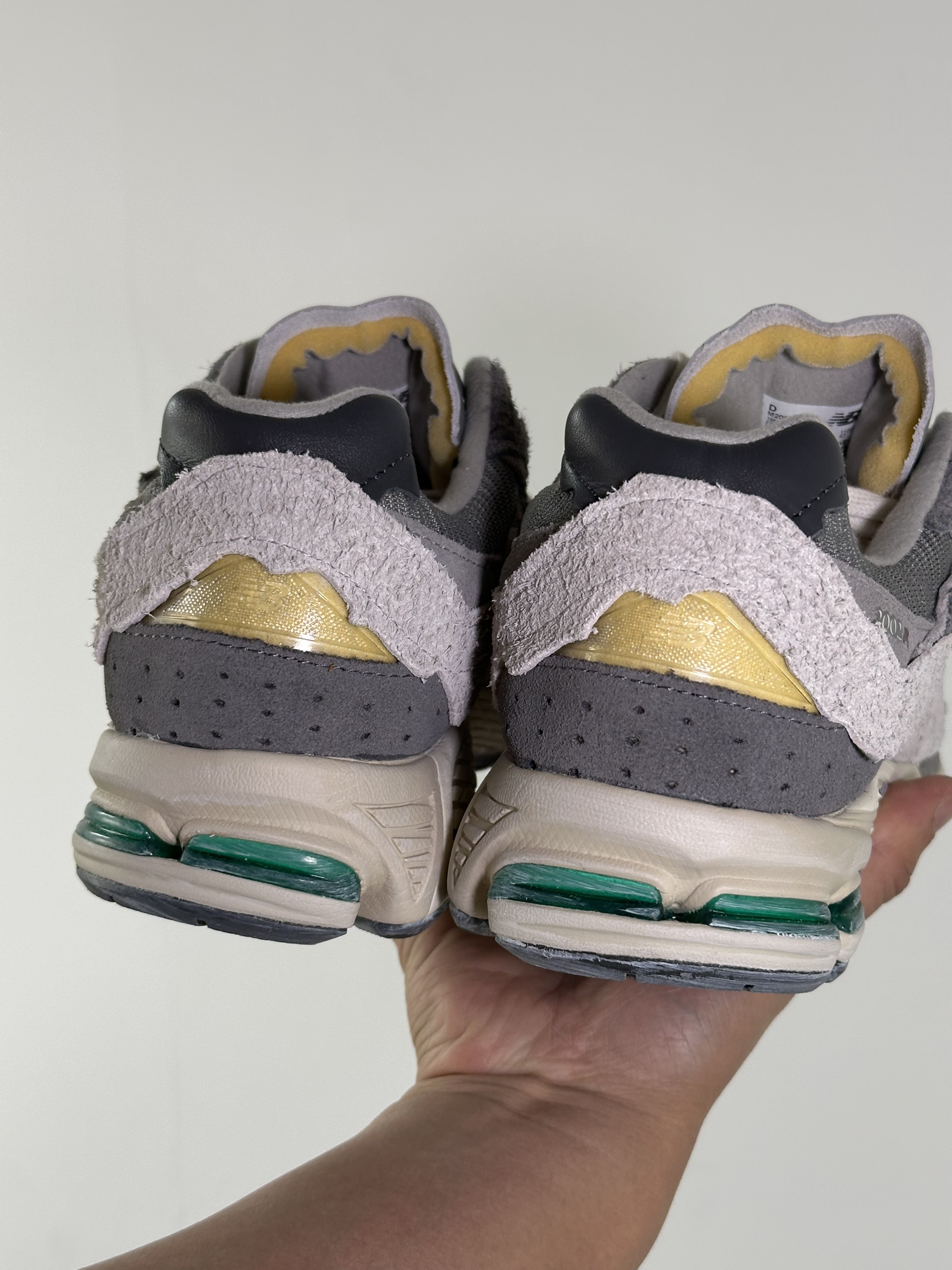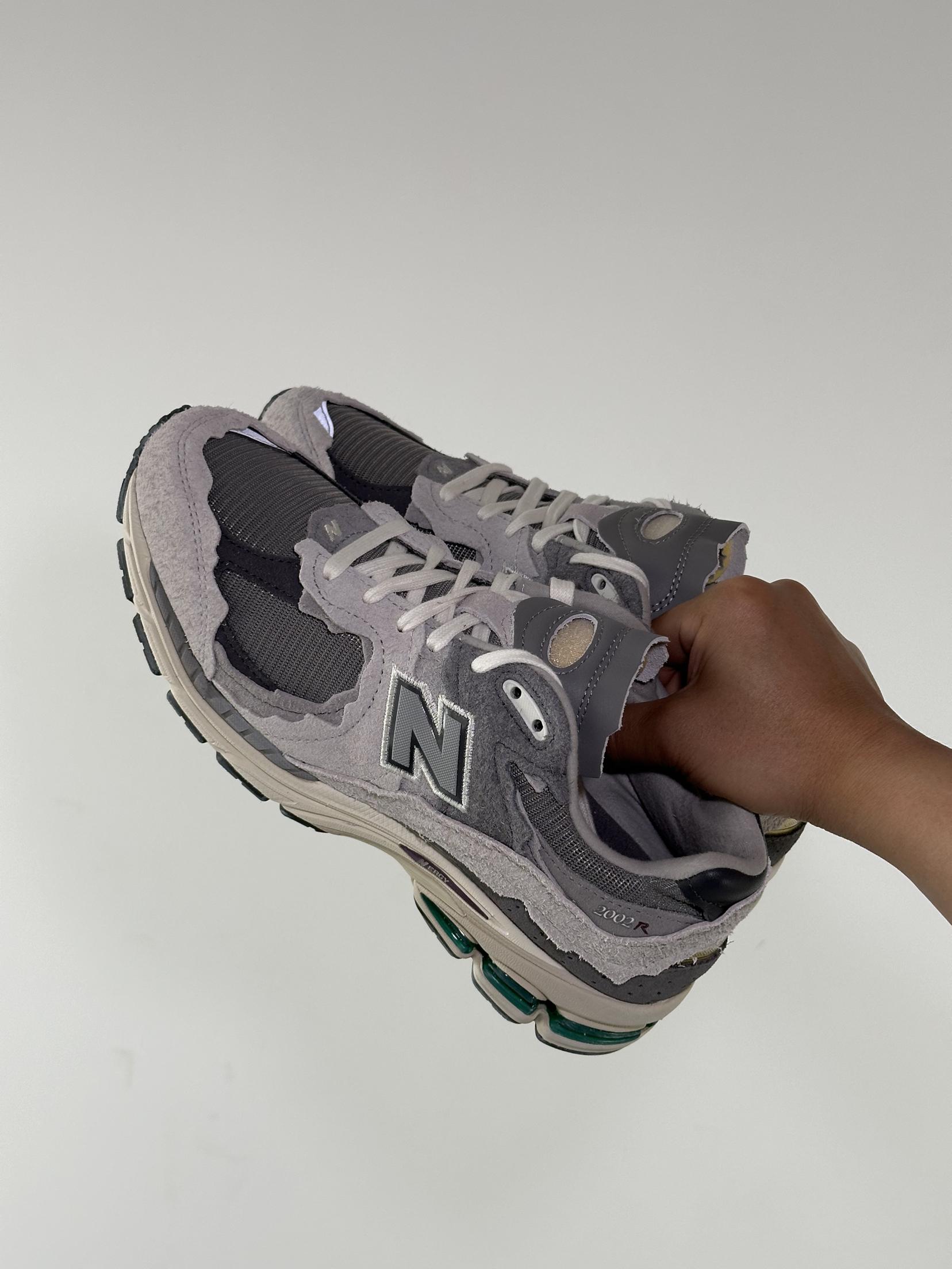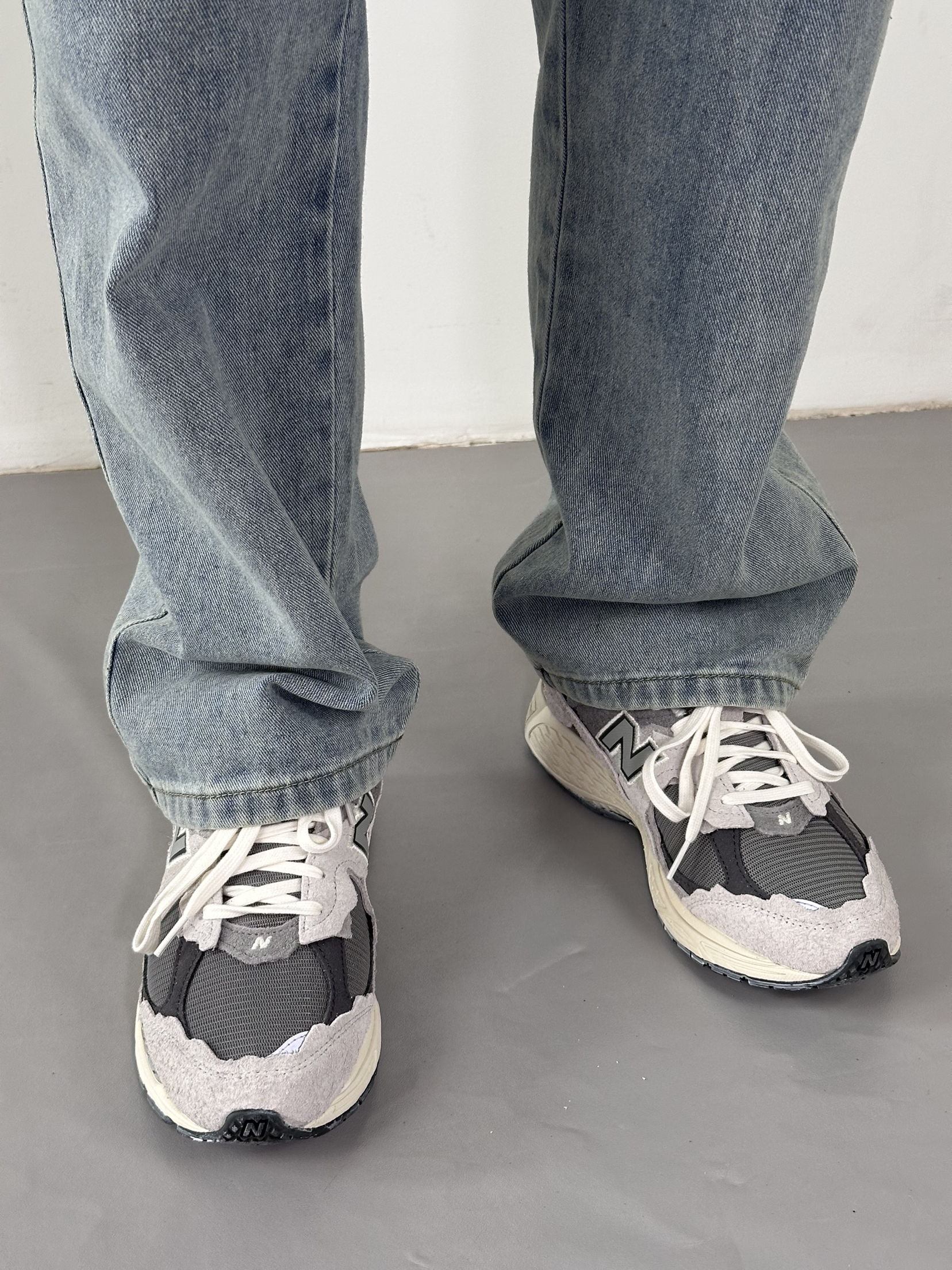 这双 NB2002R云雨灰真的越看越喜欢。 麂皮和网面拼接的质感, 做旧毛边很有复古那味儿。 配直筒牛仔裤刚好盖住鞋帮, 把我的腿显得又直又长。 走了一下午路脚感软弹完全不累脚。 这种低饱和灰调设计, 搭什么衣服都不出错太省心了。