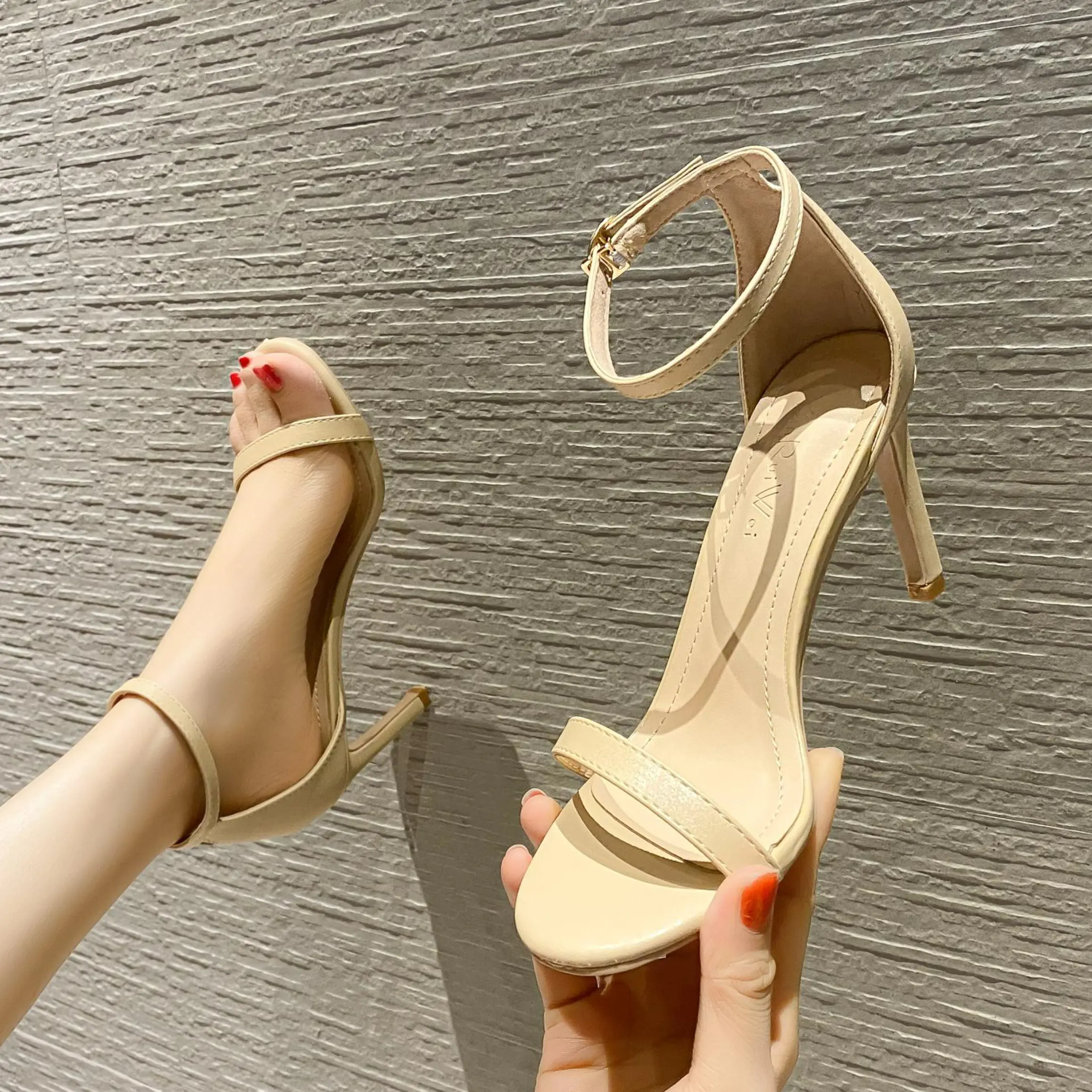 这双裸色一字带高跟凉鞋上脚很和谐,裸色贴近肤色,视觉上能延伸腿部线条,搭配简约的白色半身裙很合适👠。 不过缺点也很明显:鞋跟偏细且高度不低,刚上脚时脚踝需要适应,走快了容易晃;前掌仅一根细带覆盖,脚趾根部受力明显,穿久了会有挤压感,甚至磨出红印😣。脚踝处的搭扣虽然固定性不错,但金属扣边缘略硬,走路多了会磨到脚踝皮肤。另外,鞋底偏薄,长时间走路(超过1小时),脚后跟的累感会很明显,更适合短时间出...
