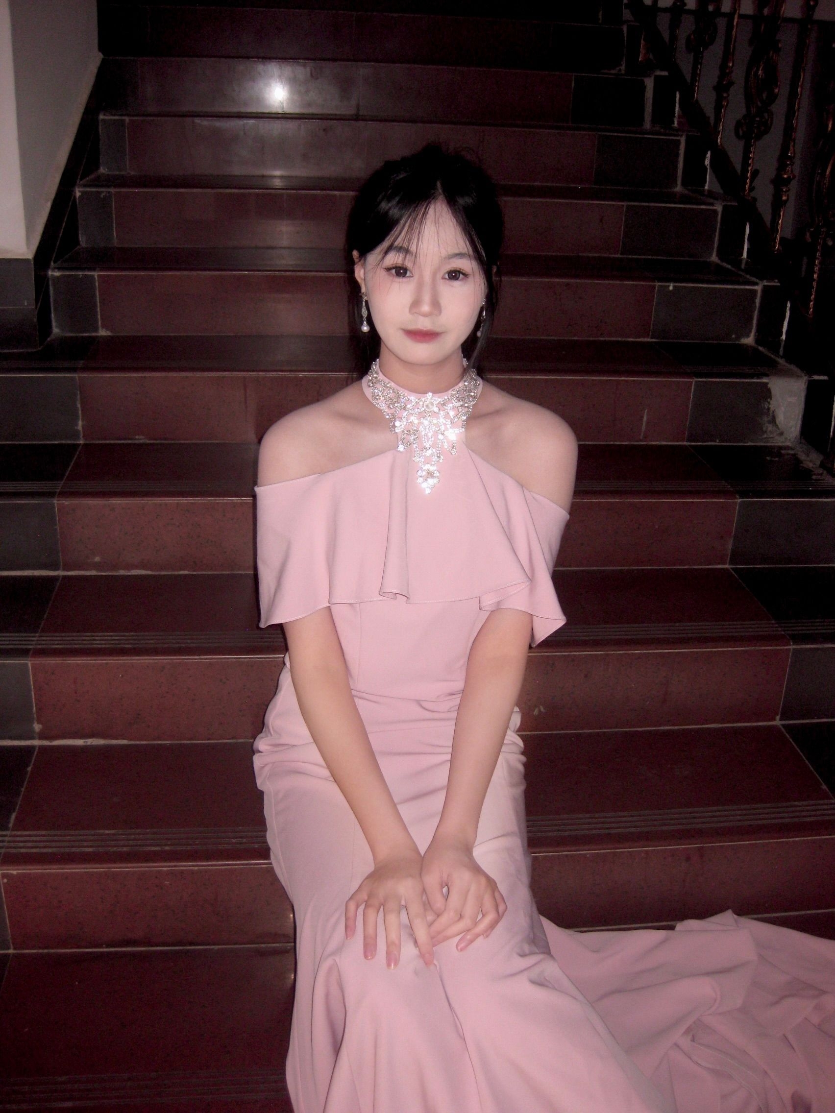 这是一件浅粉色的礼服,设计风格优雅精致,以下是具体分析: - 领口与肩部设计:采用挂脖露肩的设计,挂脖部分装饰有闪亮的水晶或类似材质的饰品,增添了华丽感;露肩的设计则展现出肩部线条,显得较为性感和优雅。 - 上衣部分:露肩处有荷叶边的设计,增加了层次感和柔美感,整体上衣部分的剪裁贴合身形,能较好地展现身材曲线。 - 颜色与材质:浅粉色的色调温柔甜美,材质看起来较为顺滑,可能是雪纺或类似的面料,垂坠...