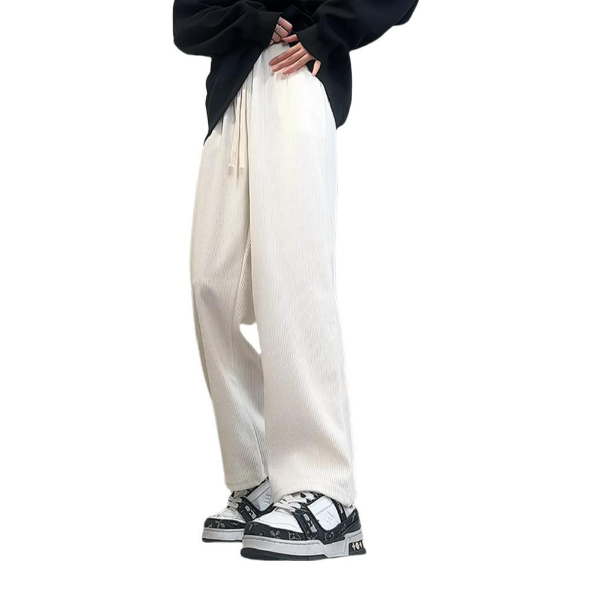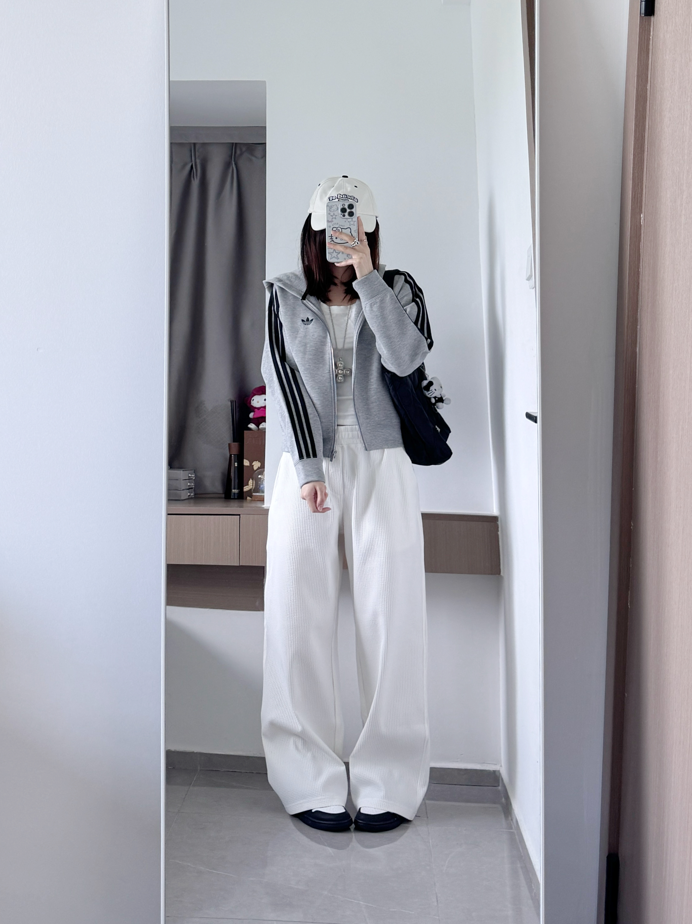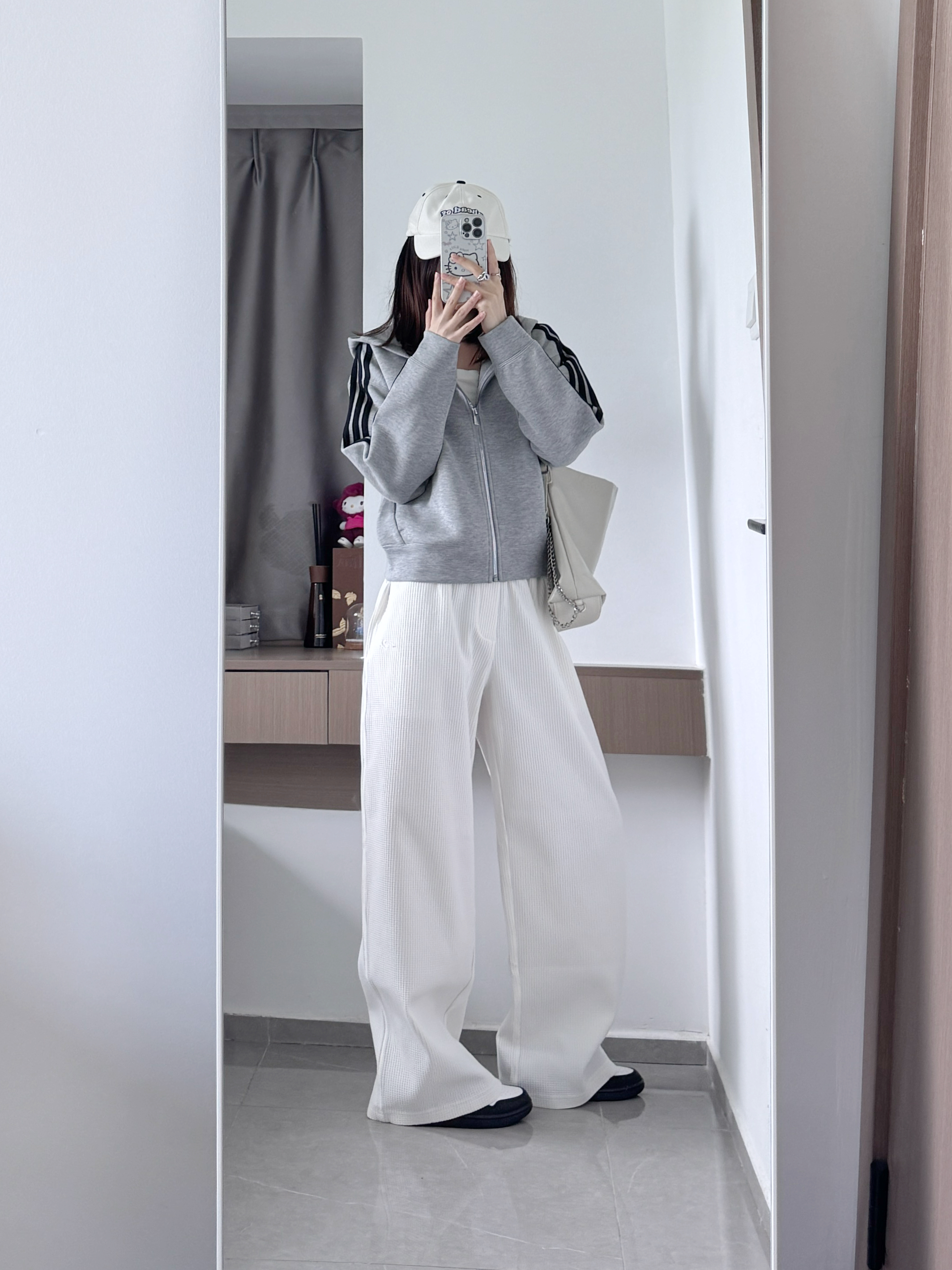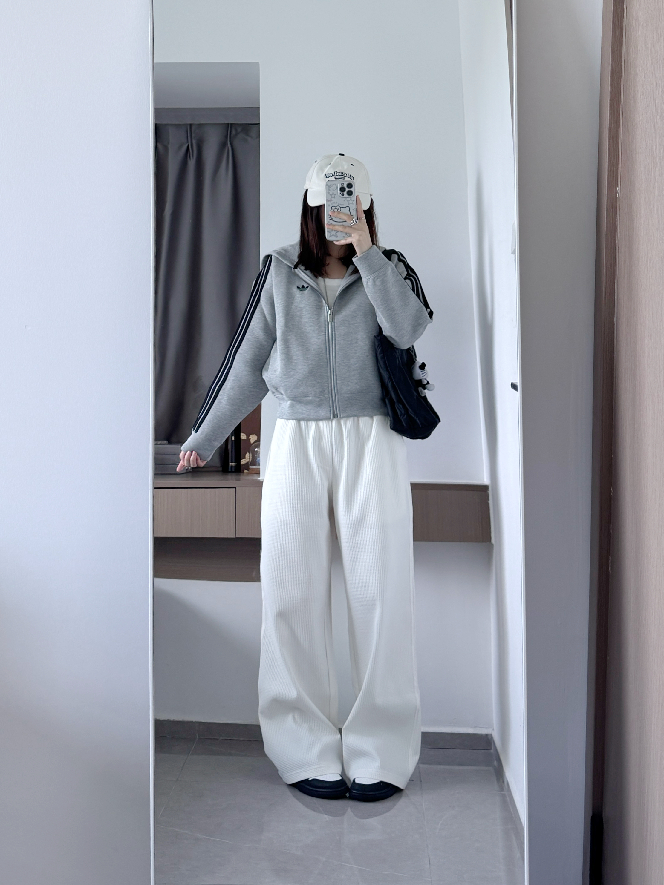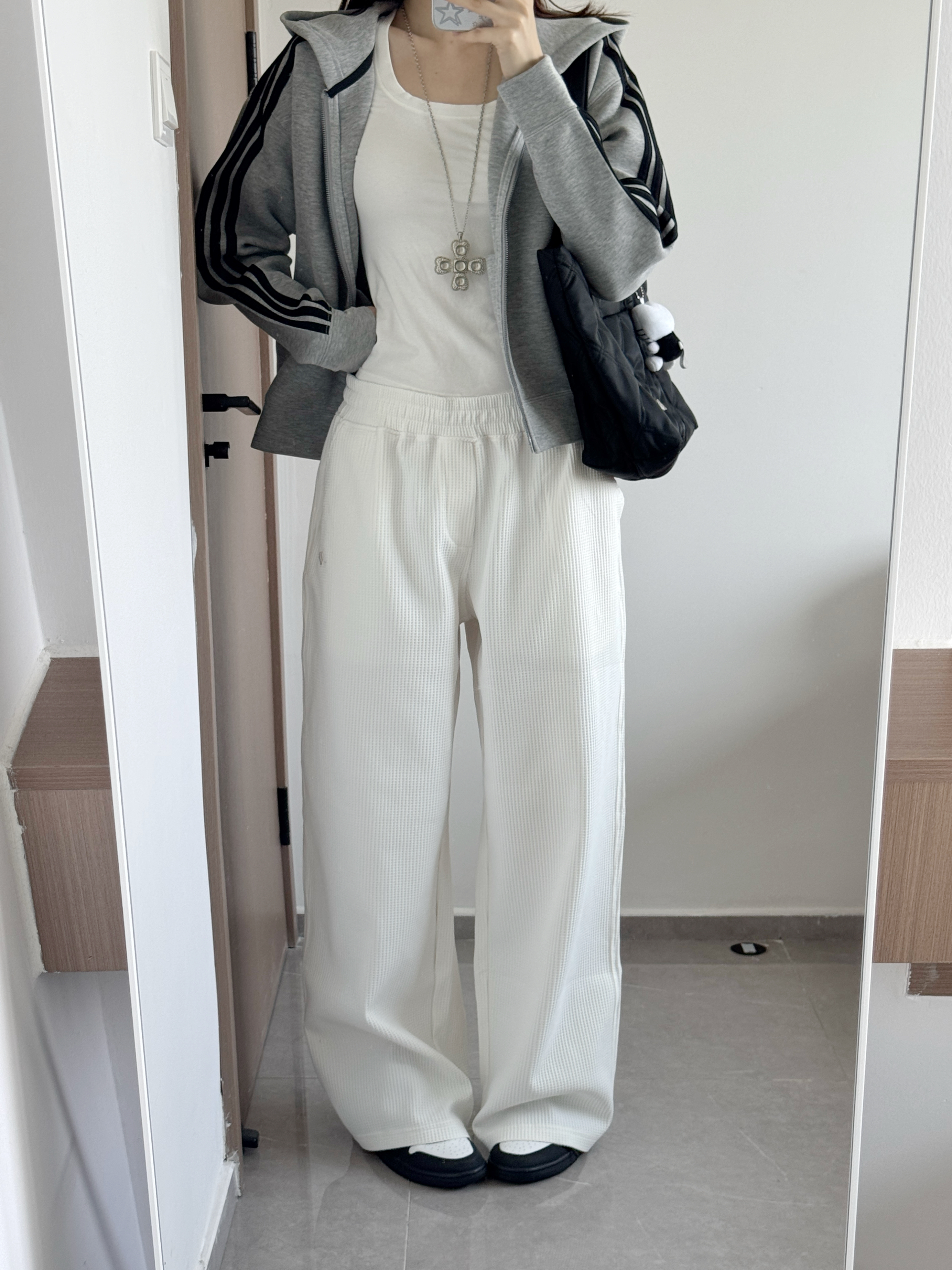谁懂这条裤子版型的含金量! 华夫格面料好有质感! 宽松直筒版型上身尊滴好显腿细腿长呀✌️ 搭配卫衣外套一套休闲又帅气😎