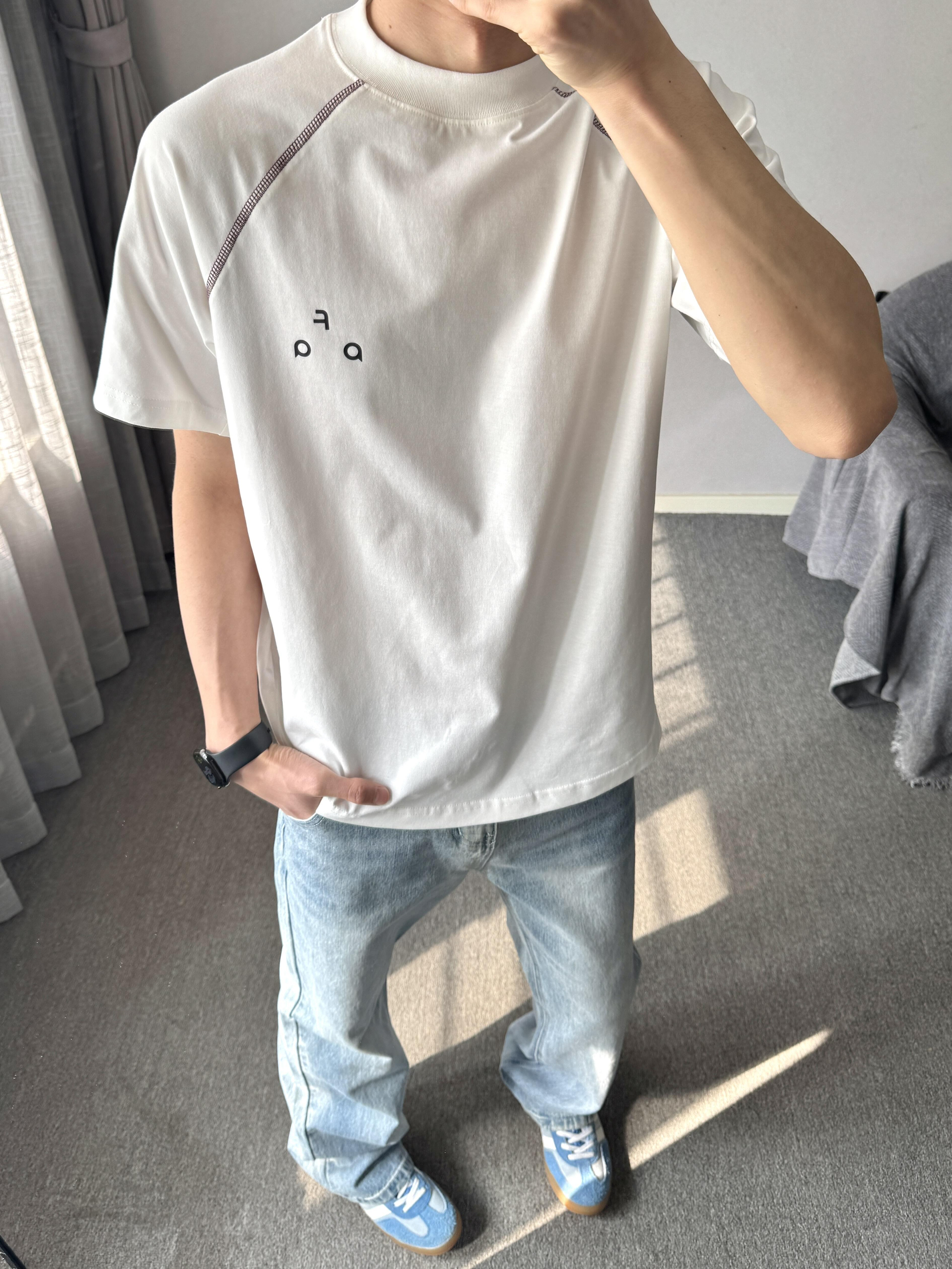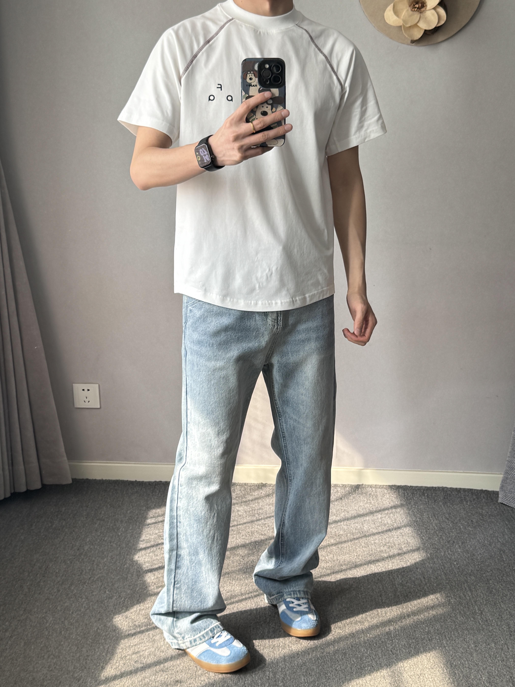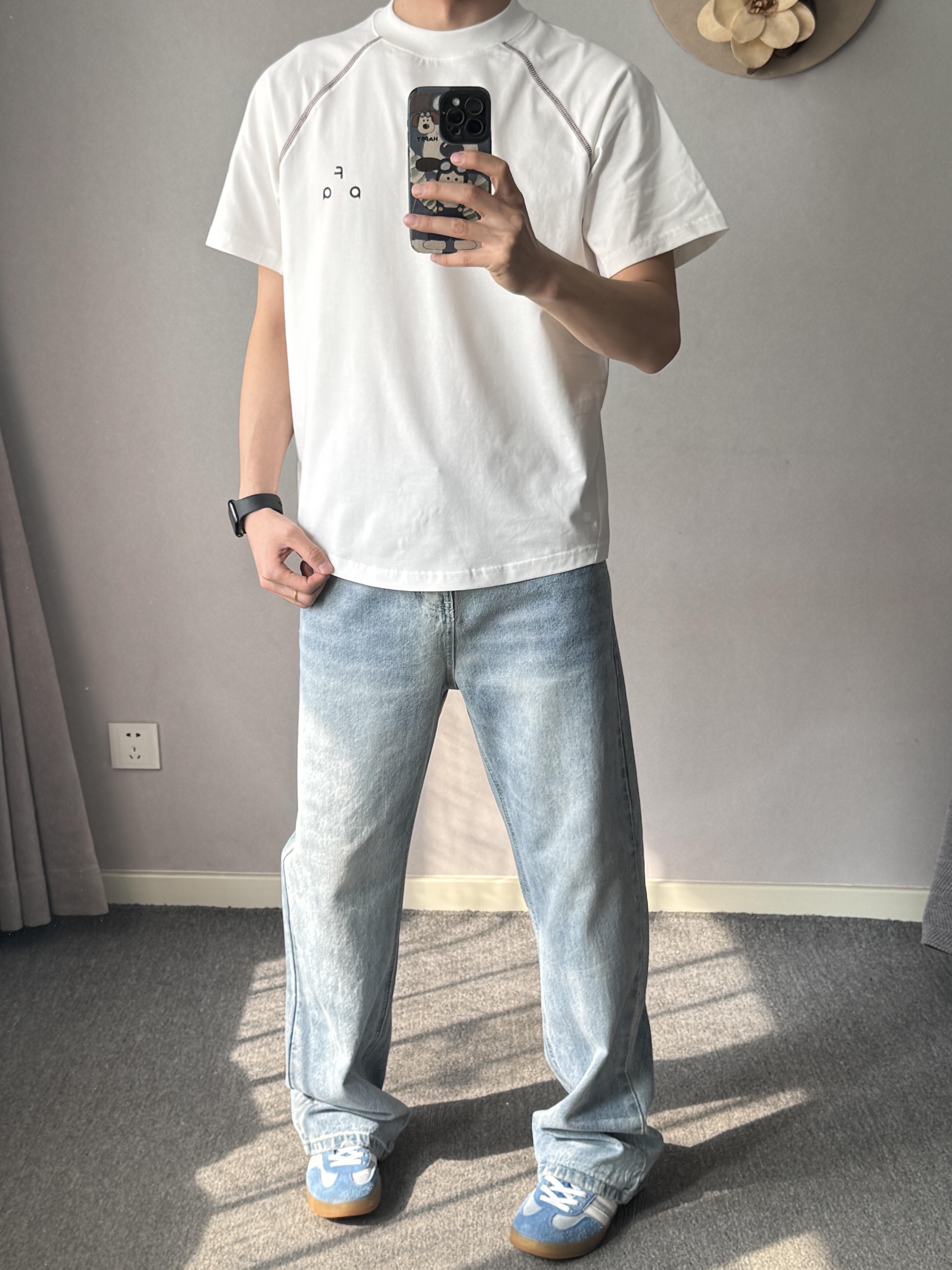 男女同款哈苏线撞色设计百搭短袖T恤 搭配冰蓝色水洗做旧宽松微辣牛仔裤 上身干净利落~百搭不会出错哦 真的太适合夏天的日常通勤了