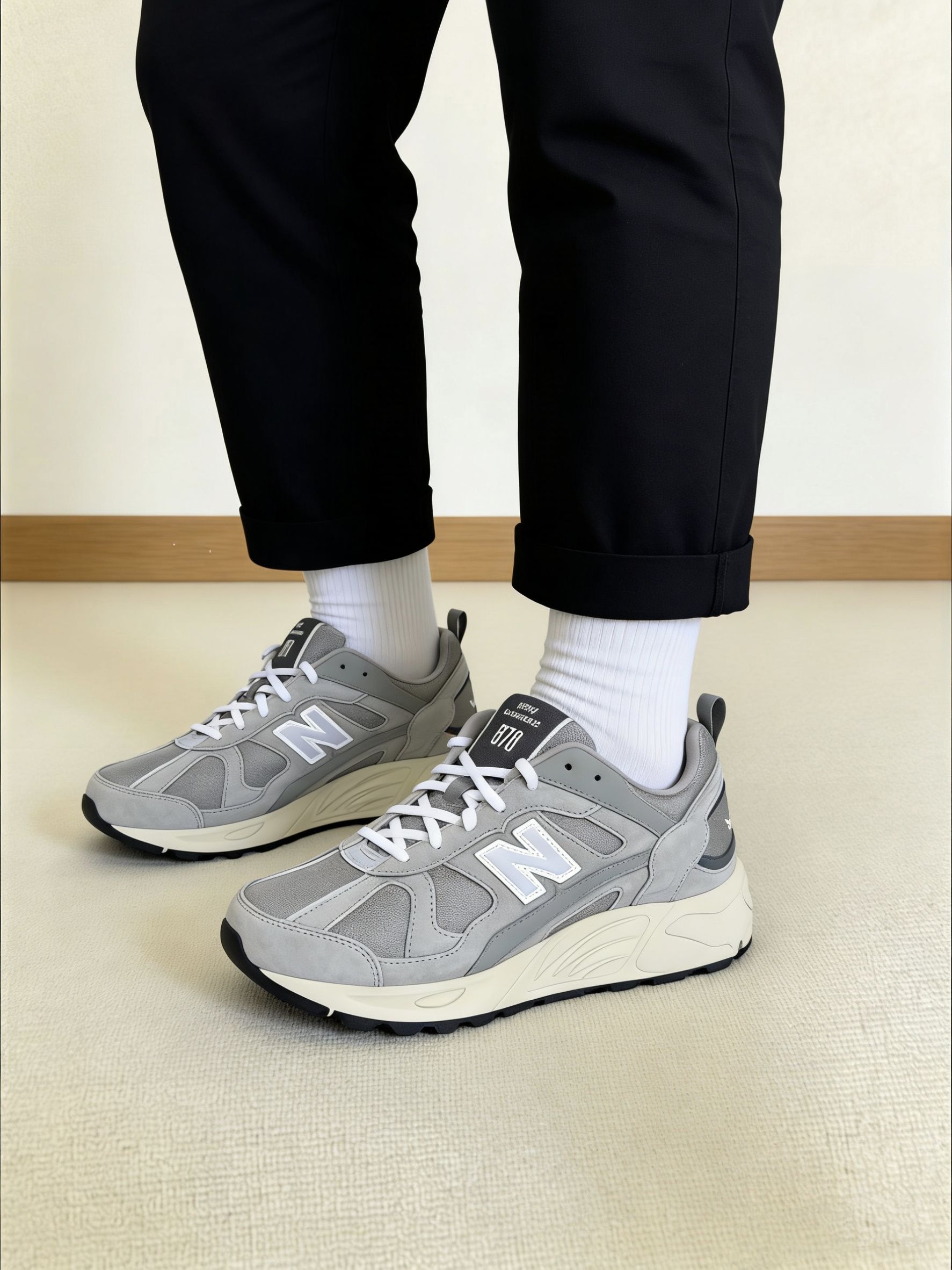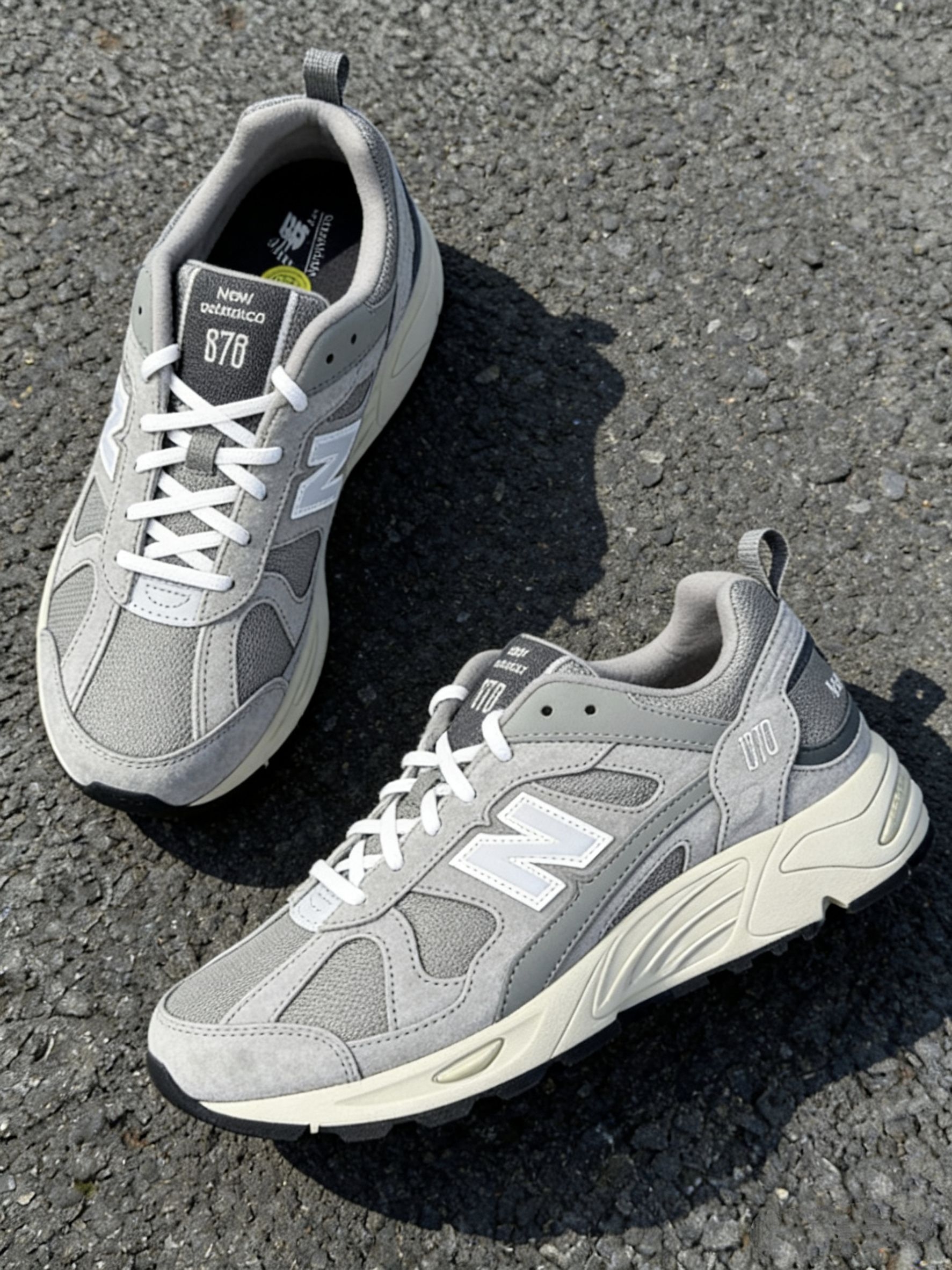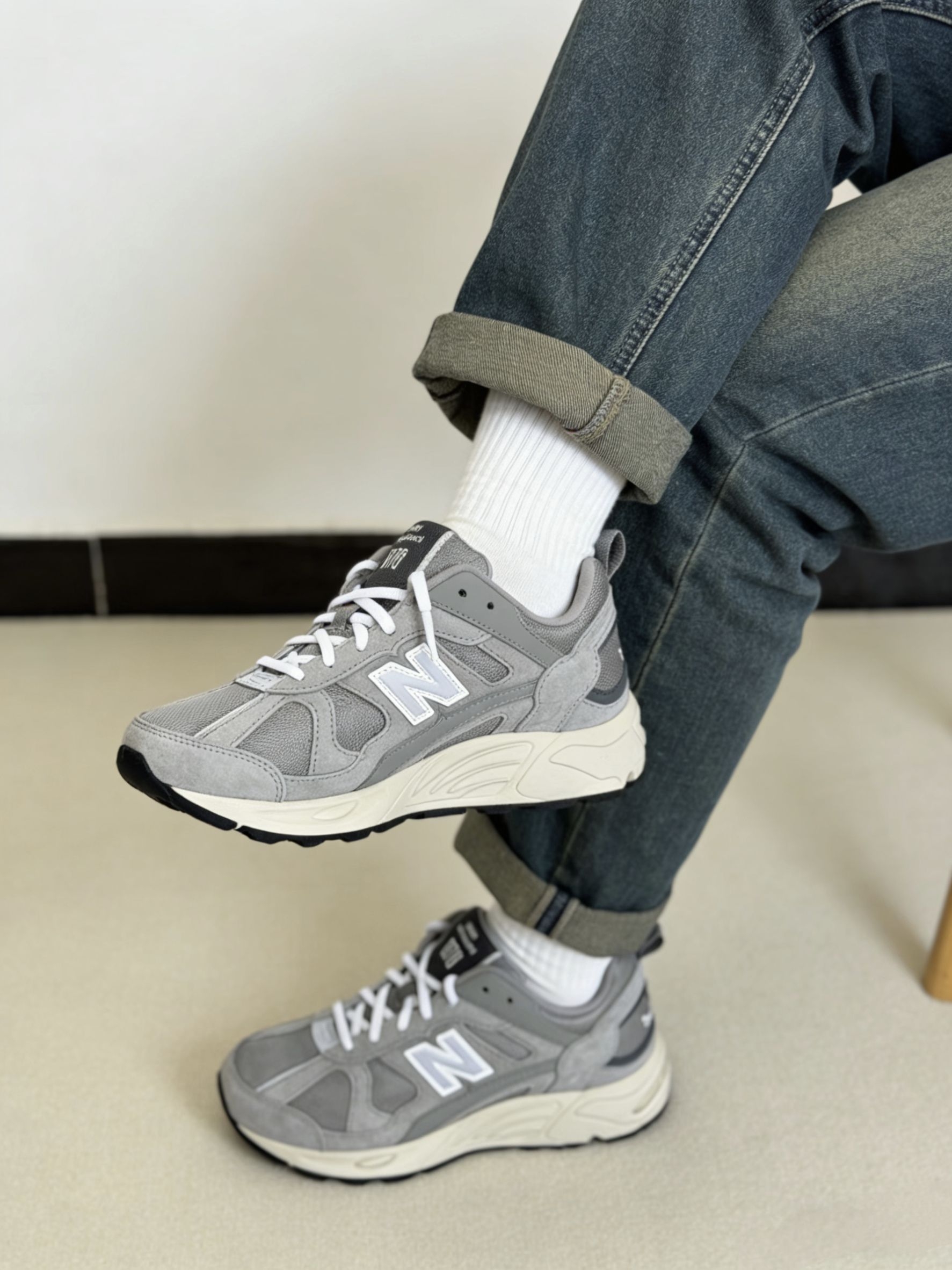 我最近常穿的这双New Balance 878,整体是元祖灰搭配白黑小细节,低调又有质感,复古运动的鞋型我真的很喜欢。 鞋面是猪皮革和织物拼接的,摸起来很有层次,透气也不错,平时穿不会闷脚。中底有ABZORB缓震,走路的时候支撑和稳定性都蛮好,鞋底也耐磨。 不过我穿下来也有两个小缺点: 麂皮部分虽然好看,但不太好打理,弄脏了清洁要费点功夫。 鞋底刚上脚支撑是够的,可走久了会有点硬,脚容易累...