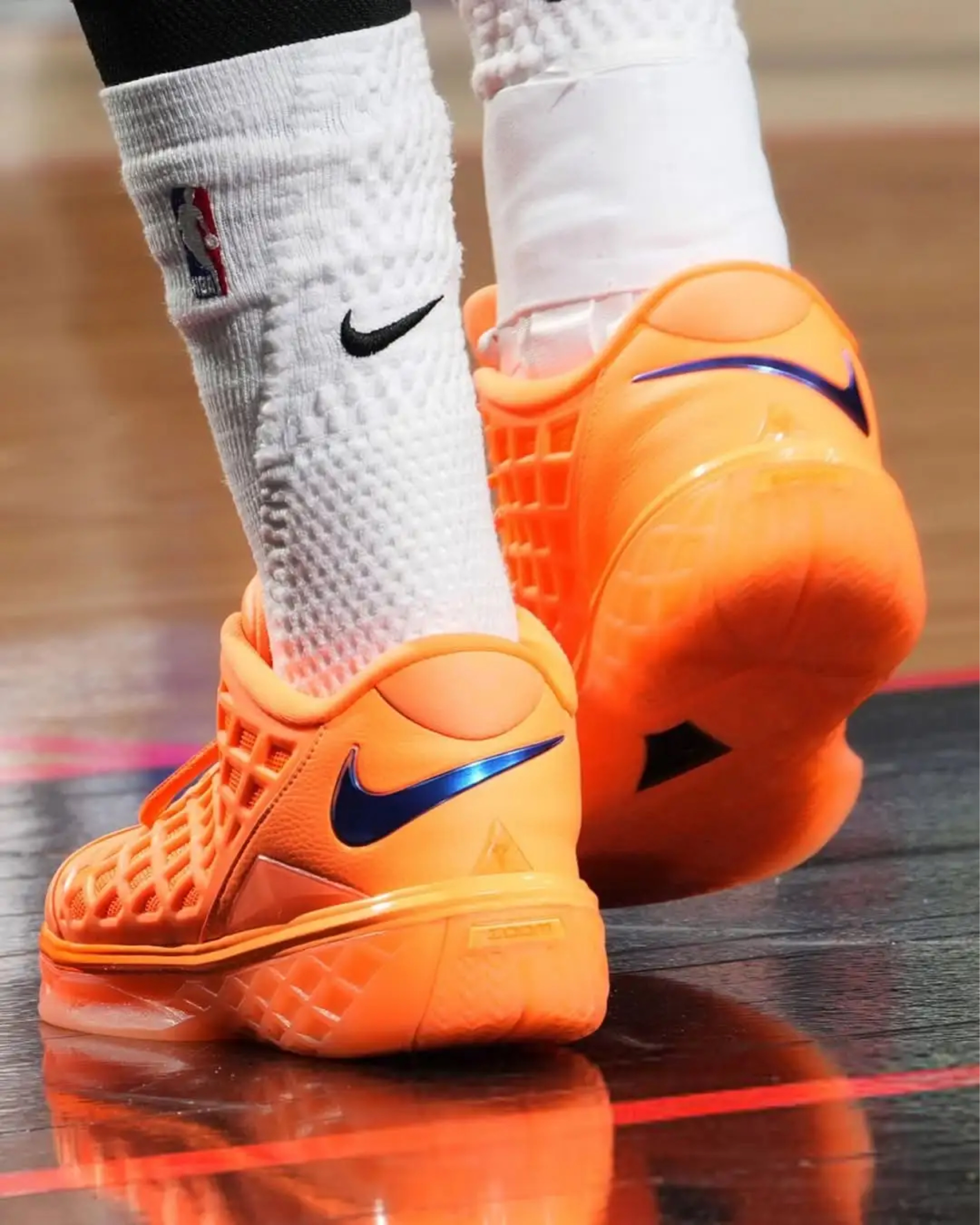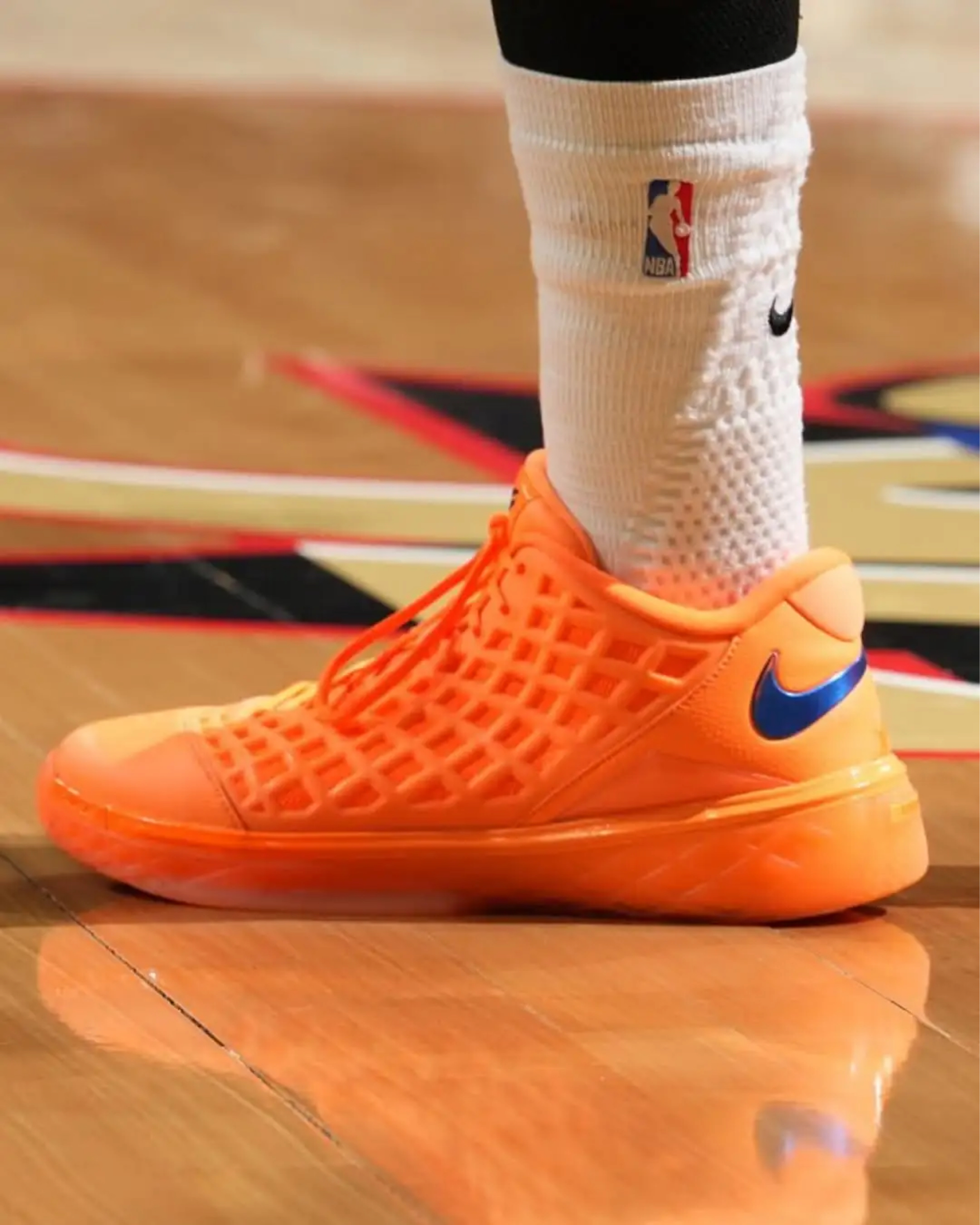步伦森球员个人专属尼克斯配色Nike Kobe 3 Low Protro“Arancia”PE定档12月11日上市。 这款鞋鞋身主色调采用尼克斯标志性的橙色,象征球队活力与激情,搭配蓝色Nike Swoosh与科比Logo点缀,视觉冲击力强。鞋型为低帮设计,兼顾灵活性与场地感,中底搭载全掌Zoom Strobel气垫+缓震泡棉,实战性能出色。
