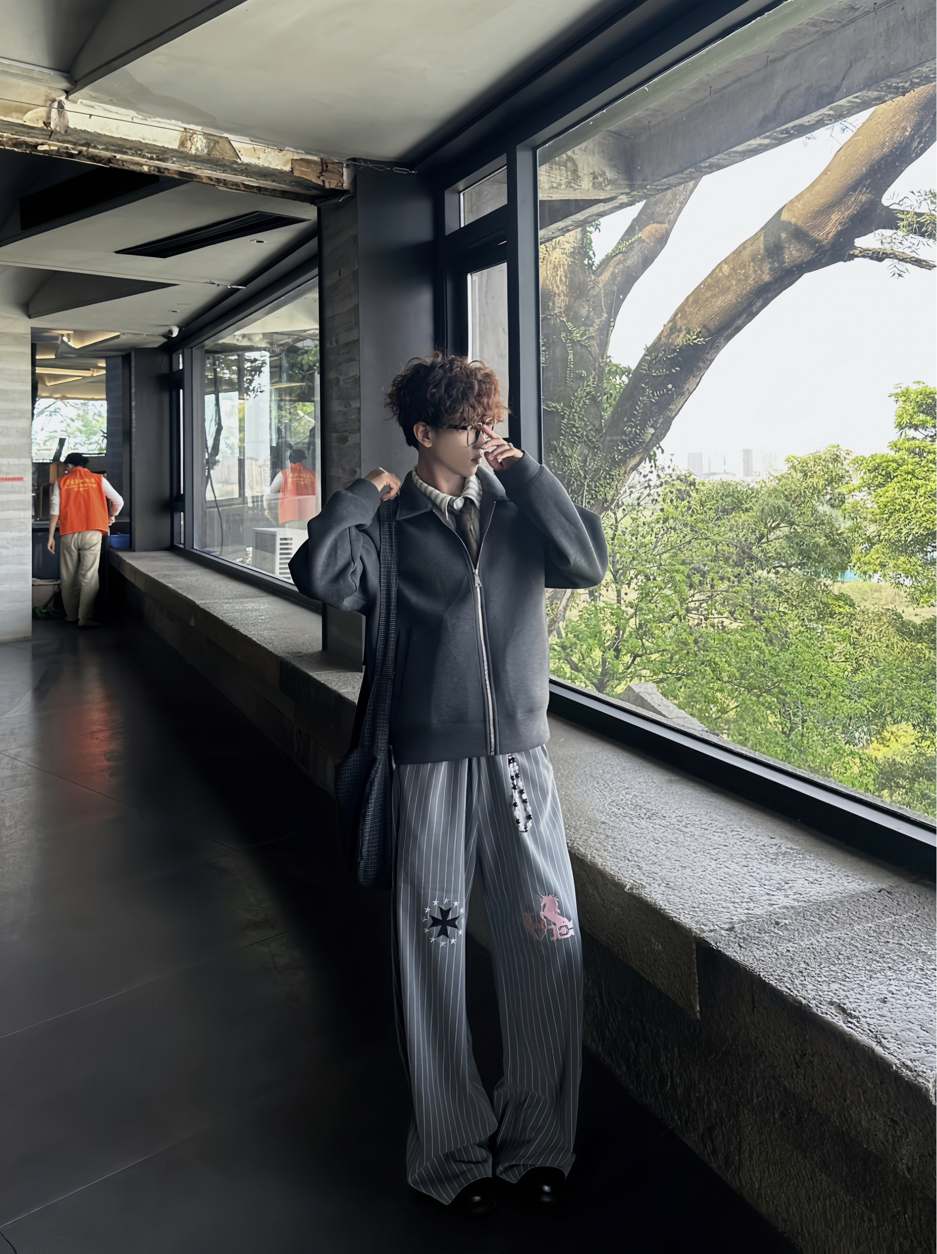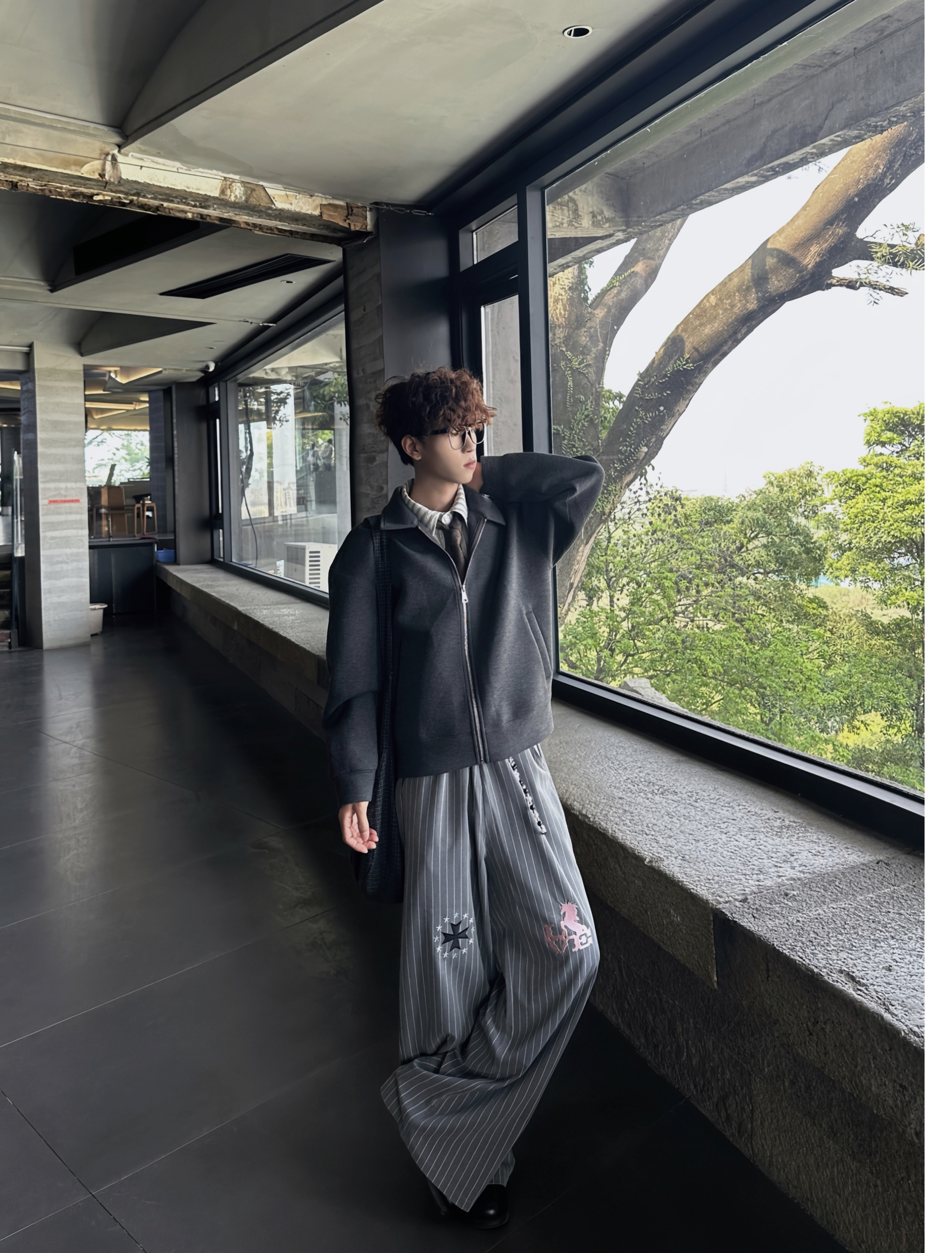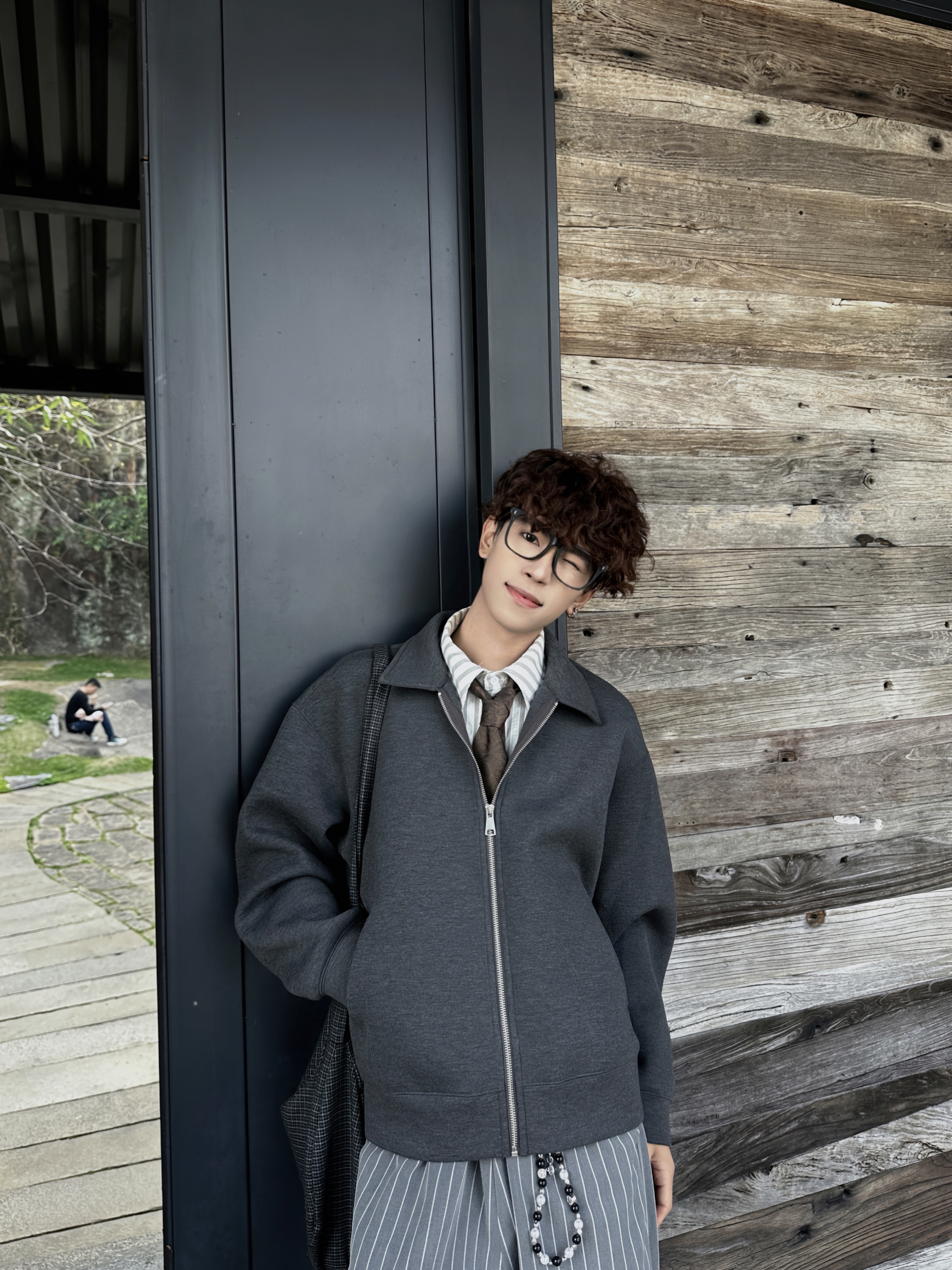 春天穿搭的季节~穿点简约高级的,帅炸整个春💥 休息日~穿点高质的去书屋📚坐坐也是不错的选择👍, 今天上身一身灰调的OOTD,和书屋的灰调好般配🆙,一件灰色的重磅夹克🧥,纯棉重磅的材质版型,上身舒适😌感十足❕,内里搭配一件条纹衬衫👔系领带,知识分子的感觉一下就来了🆒 👖下身搭配一件灰调条纹西裤,美式图标的小设计小众搭配不撞款🔥 📖穿着这身去书屋逛逛~,休闲一下午好惬意😌 尺码参考:博主172/1...