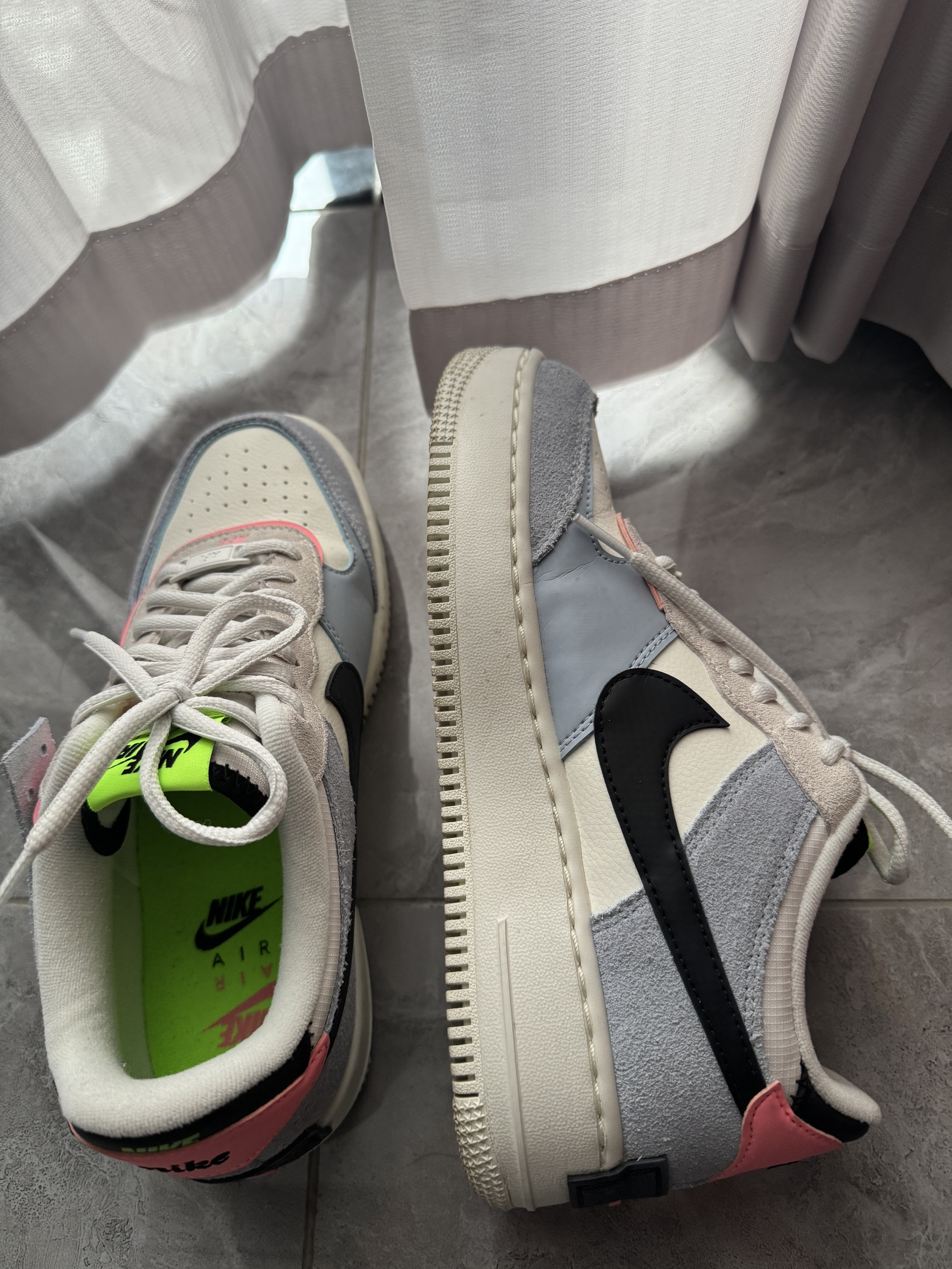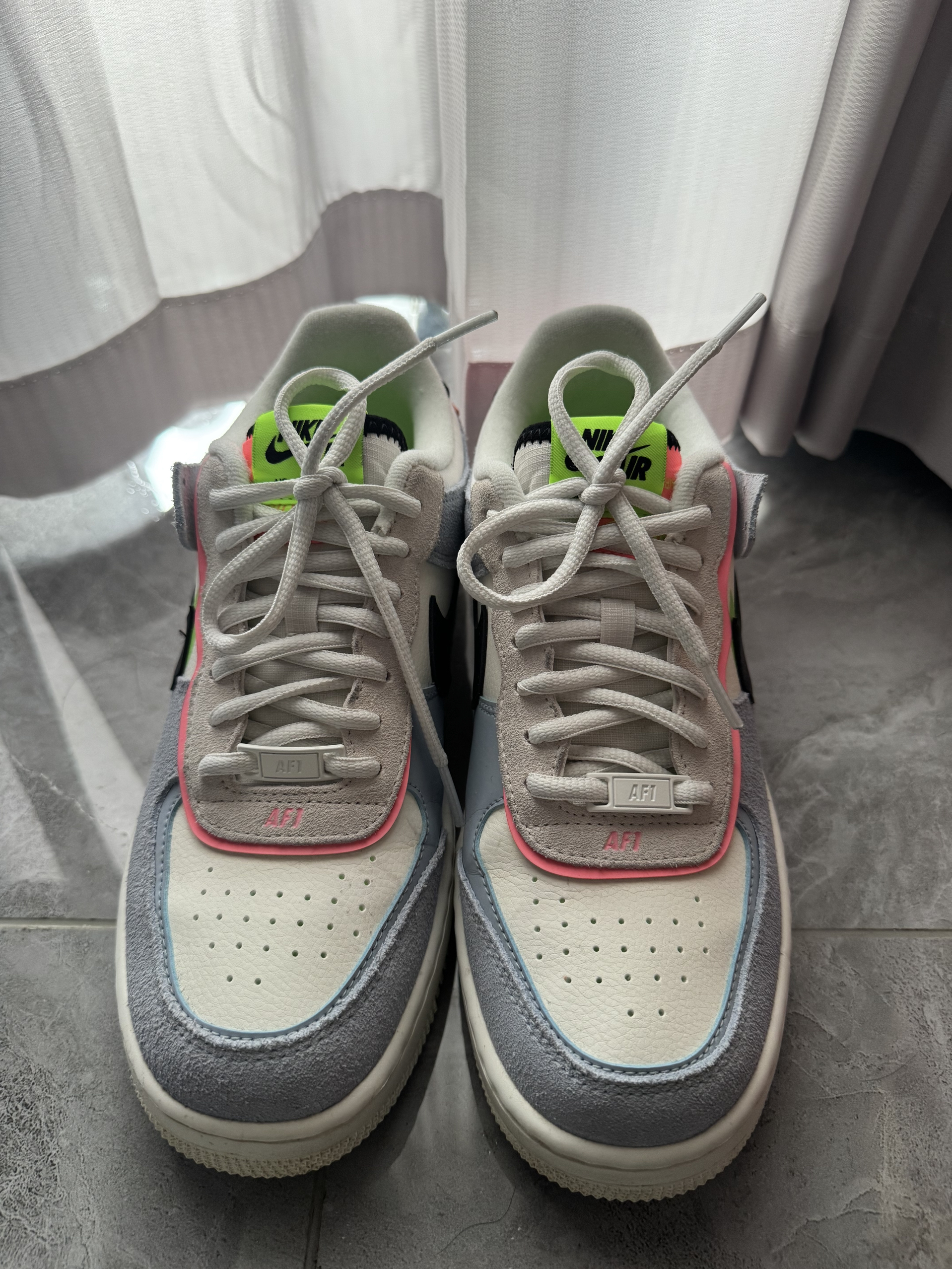 这双Nike AF1 Shadow蓝粉绿马卡龙上脚很惊喜,合成革材质好打理,配色温柔不刺眼,双层Swoosh设计很有层次感。脚感比经典款更轻便,中底软弹,日常走路不累。鞋底防滑耐磨,厚底自然显高显瘦,搭配裙子、牛仔裤都很合适。整体颜值在线,做工扎实,日常穿舒适又耐看,很适合女生日常出街。