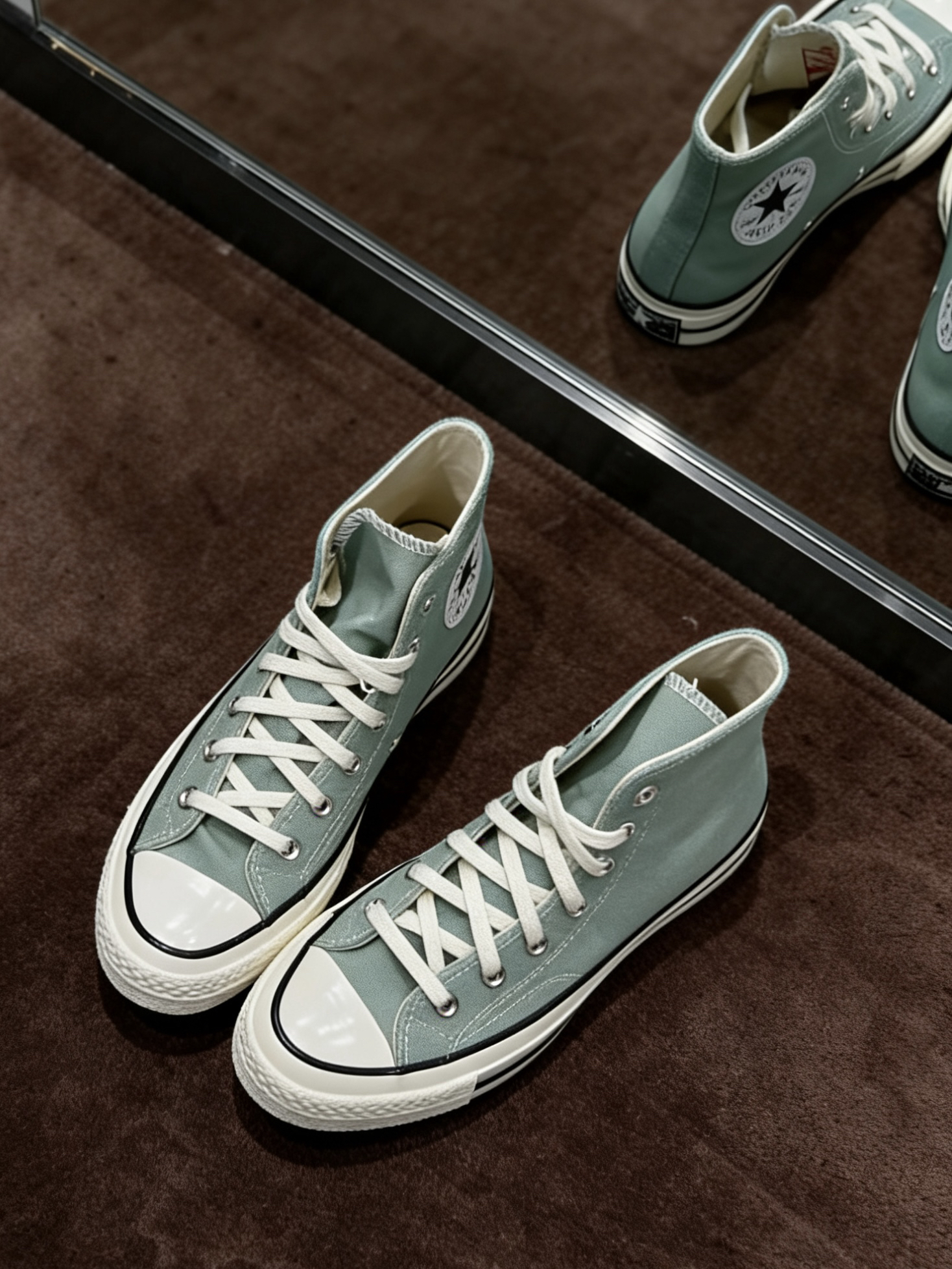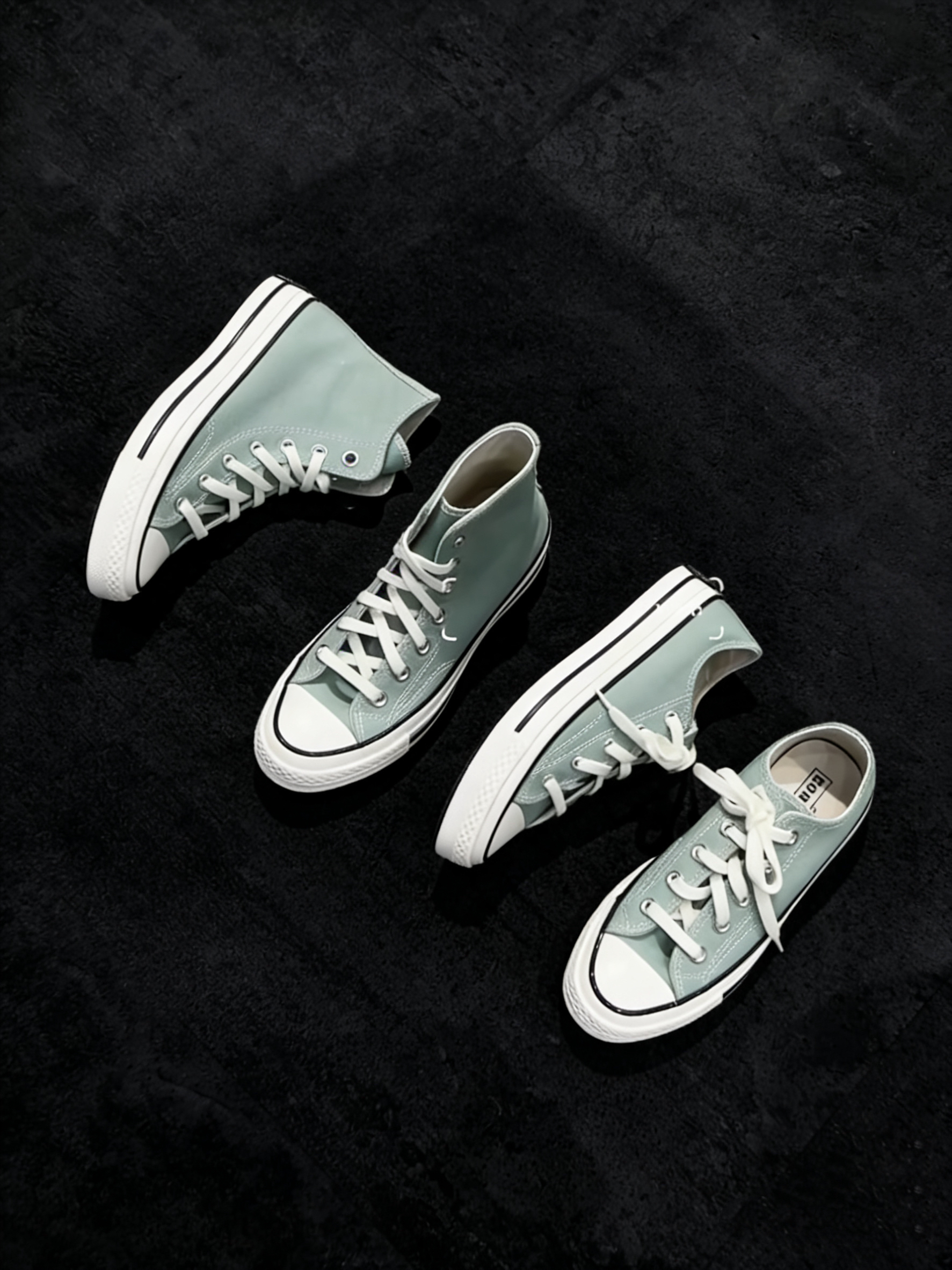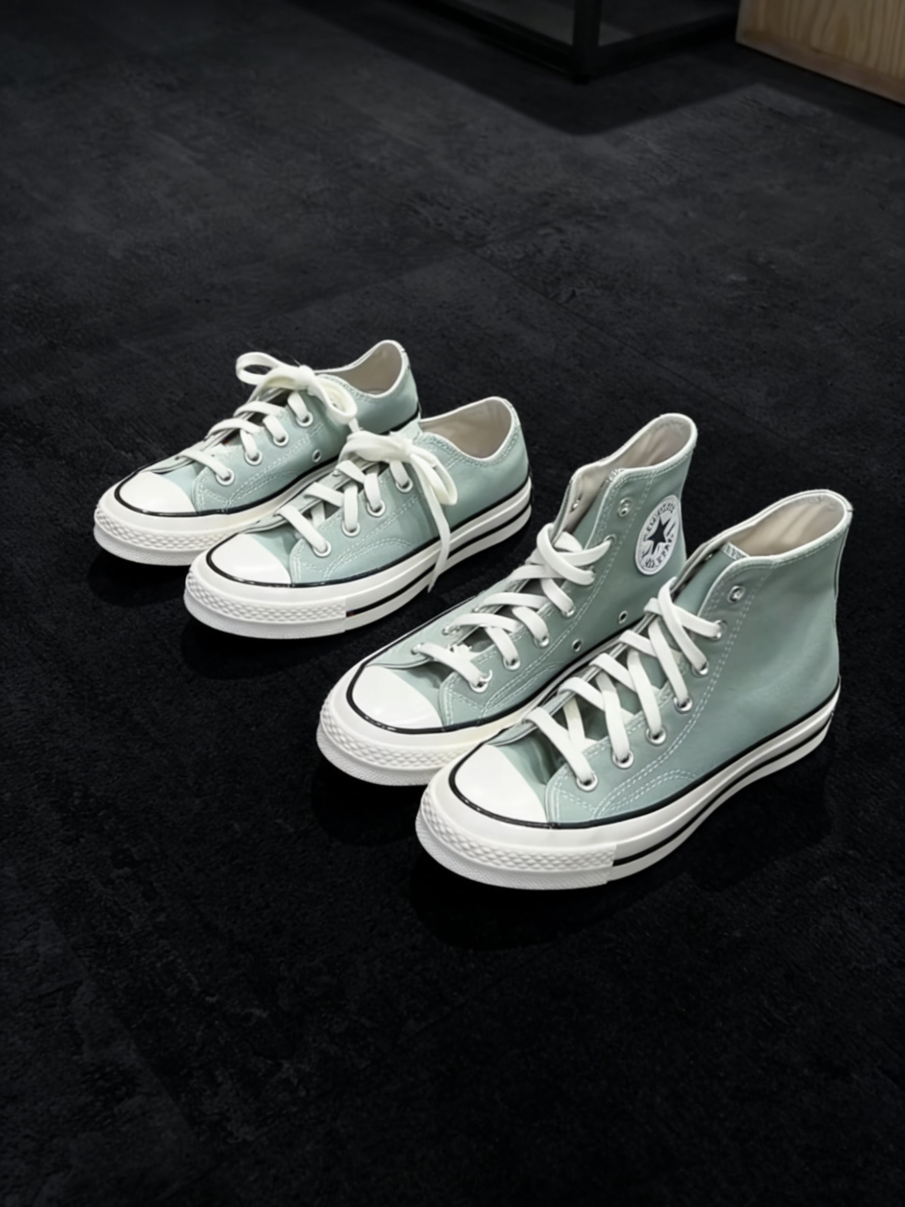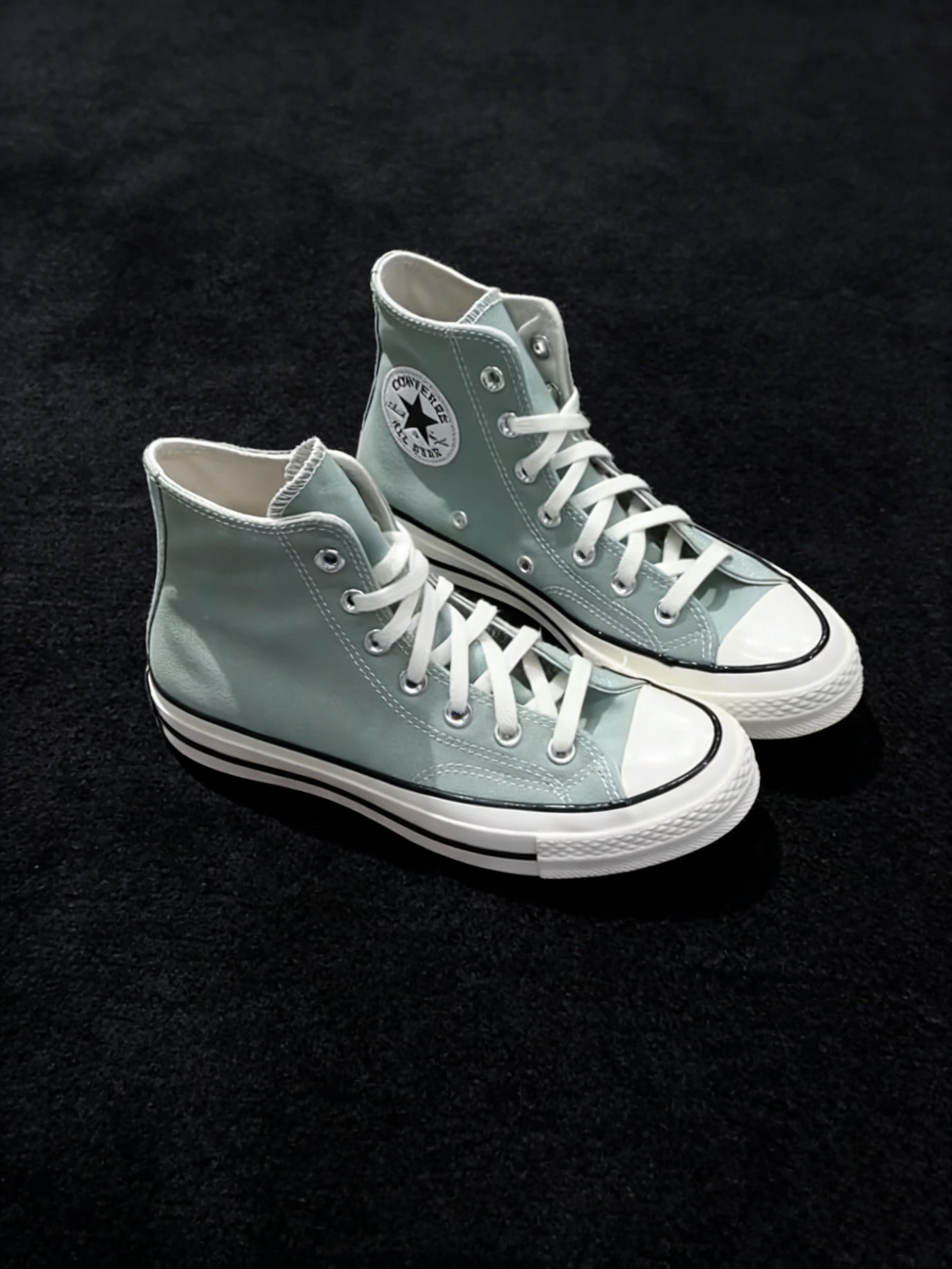 低饱和奶fufu的豆绿色,像春天刚冒头的新芽,温柔又干净,黄皮黑皮上脚都巨显白,完全不挑皮! 经典的Chuck 70高帮版型,厚实的帆布面料挺括有型,完全不会穿两次就软塌塌;米白色的复古鞋带+做旧感的米白鞋头,搭配鞋身的浅绿,复古感直接拉满,鞋侧的经典星标低调又有辨识度,走在路上完全不会和烂大街的黑白款撞款。