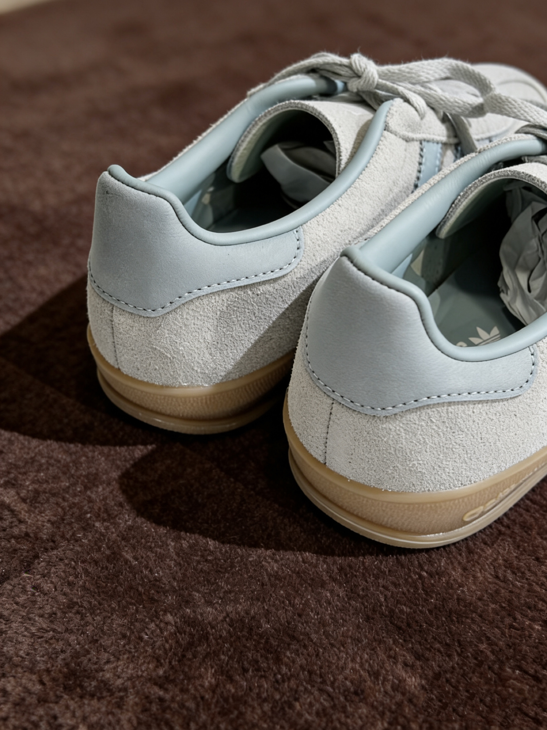 低饱和的亚麻浅绿揉进了温柔的奶灰调,完全不挑皮,黄黑皮姐妹也能闭眼冲,清冷又温柔,既没有烂大街黑白款的单调感,又不会像亮色款那样难驾驭。鞋身全是细腻的麂皮材质,摸起来软乎乎的,质感直接拉满,完全没有廉价感。同色系的三条杠和鞋尾设计,低调又藏着小心机,搭配复古生胶大底,经典的德训鞋型上脚巨显脚瘦,还能悄悄优化腿型,宽脚姐妹也完全不用怕显臃肿!