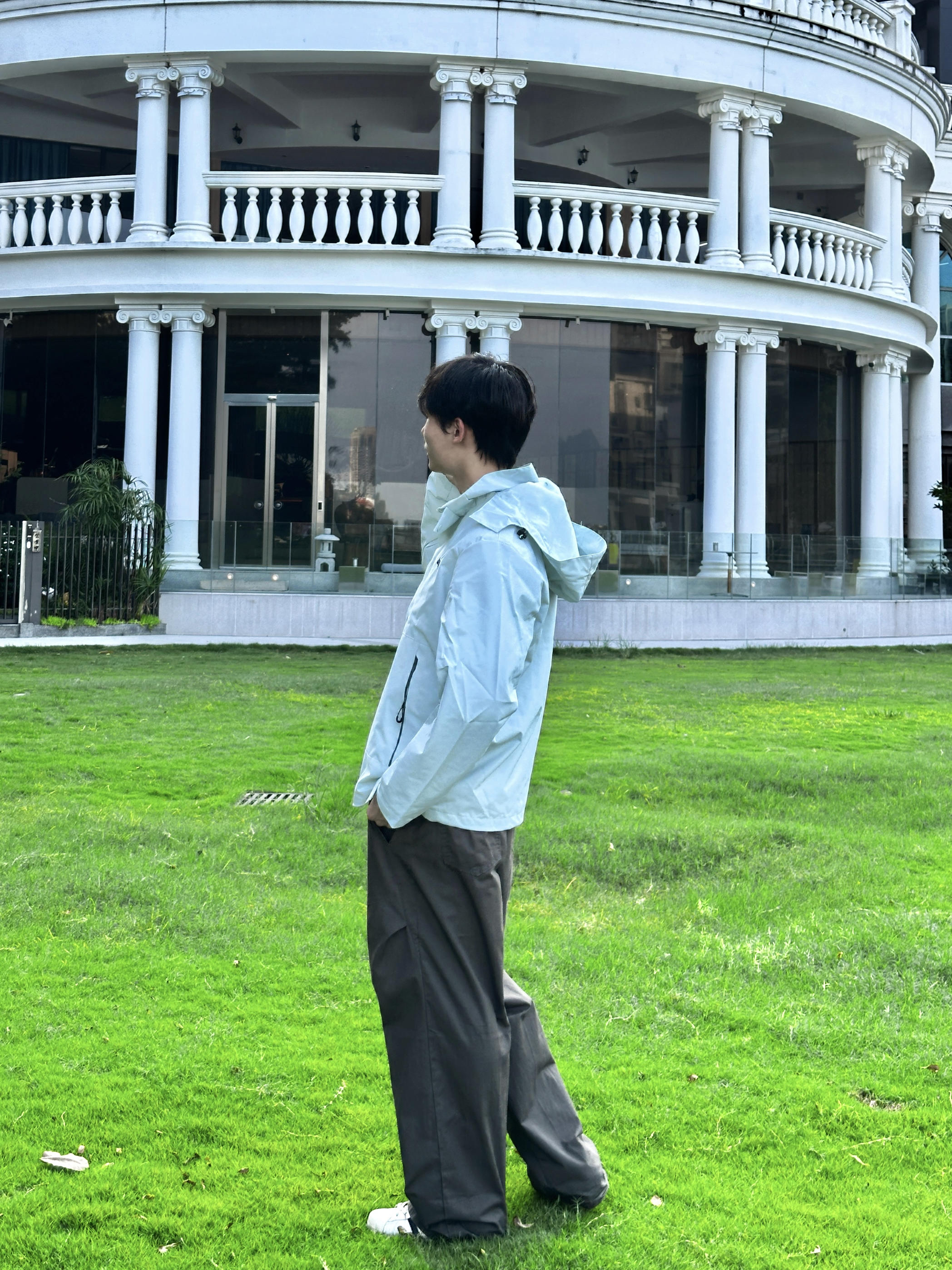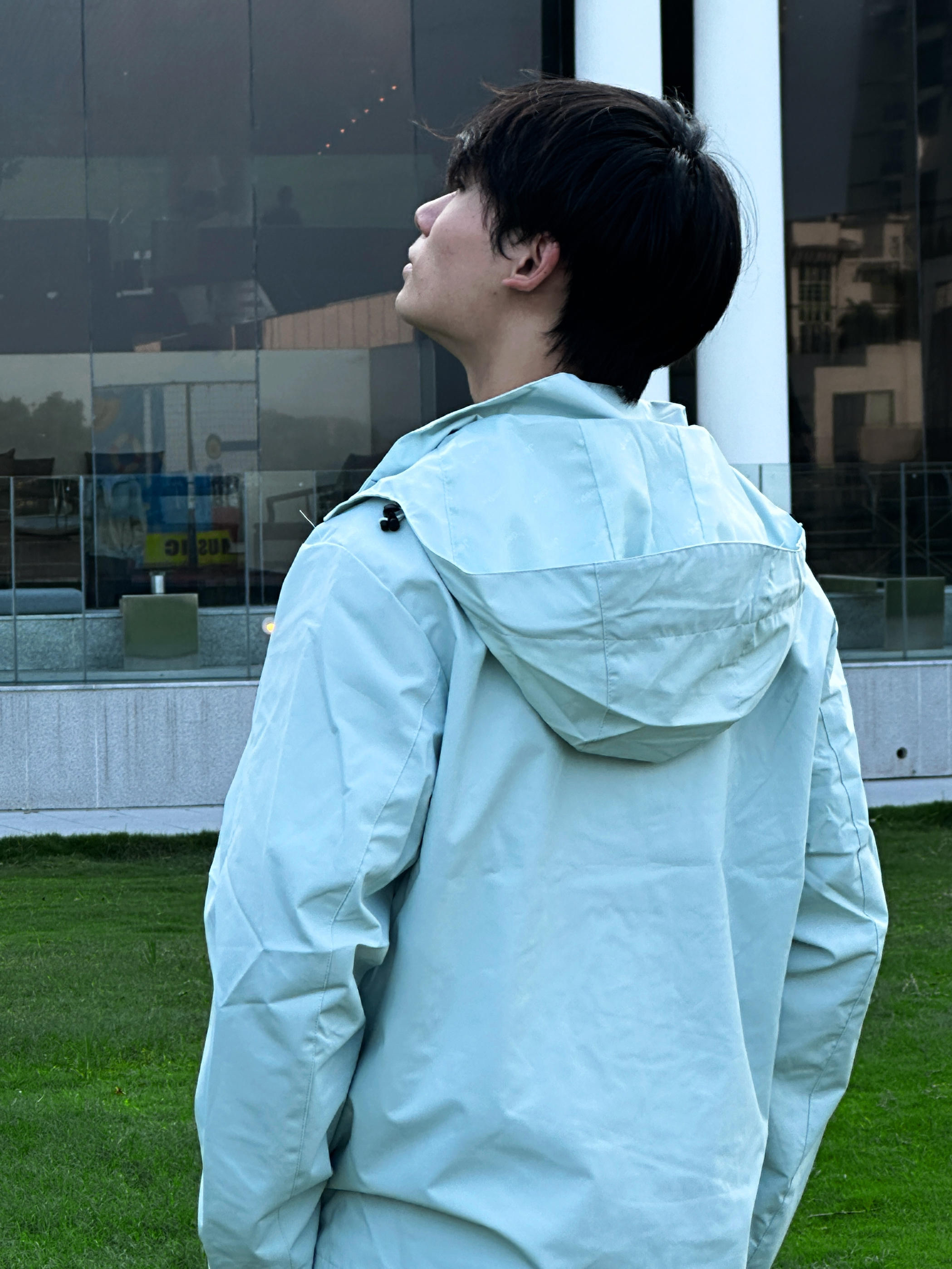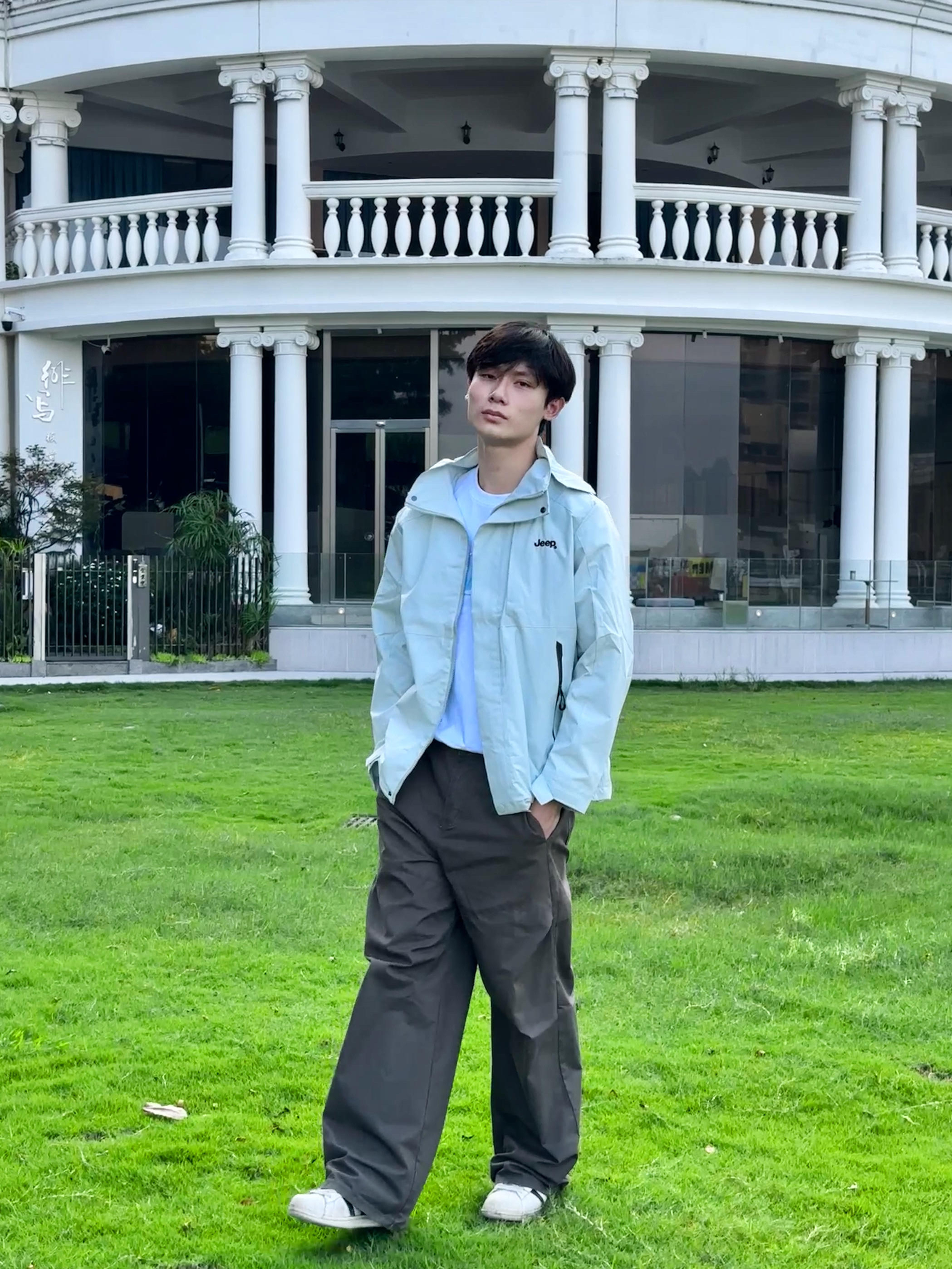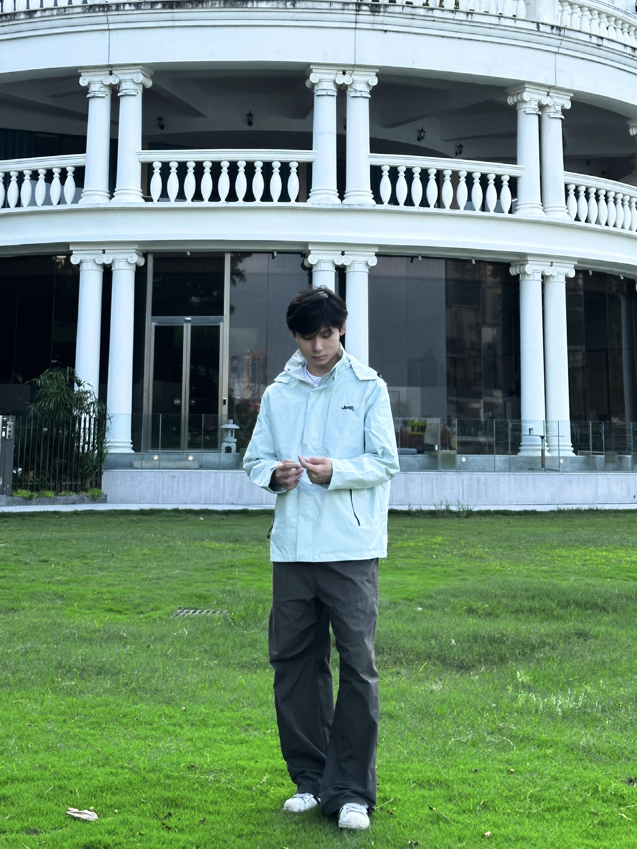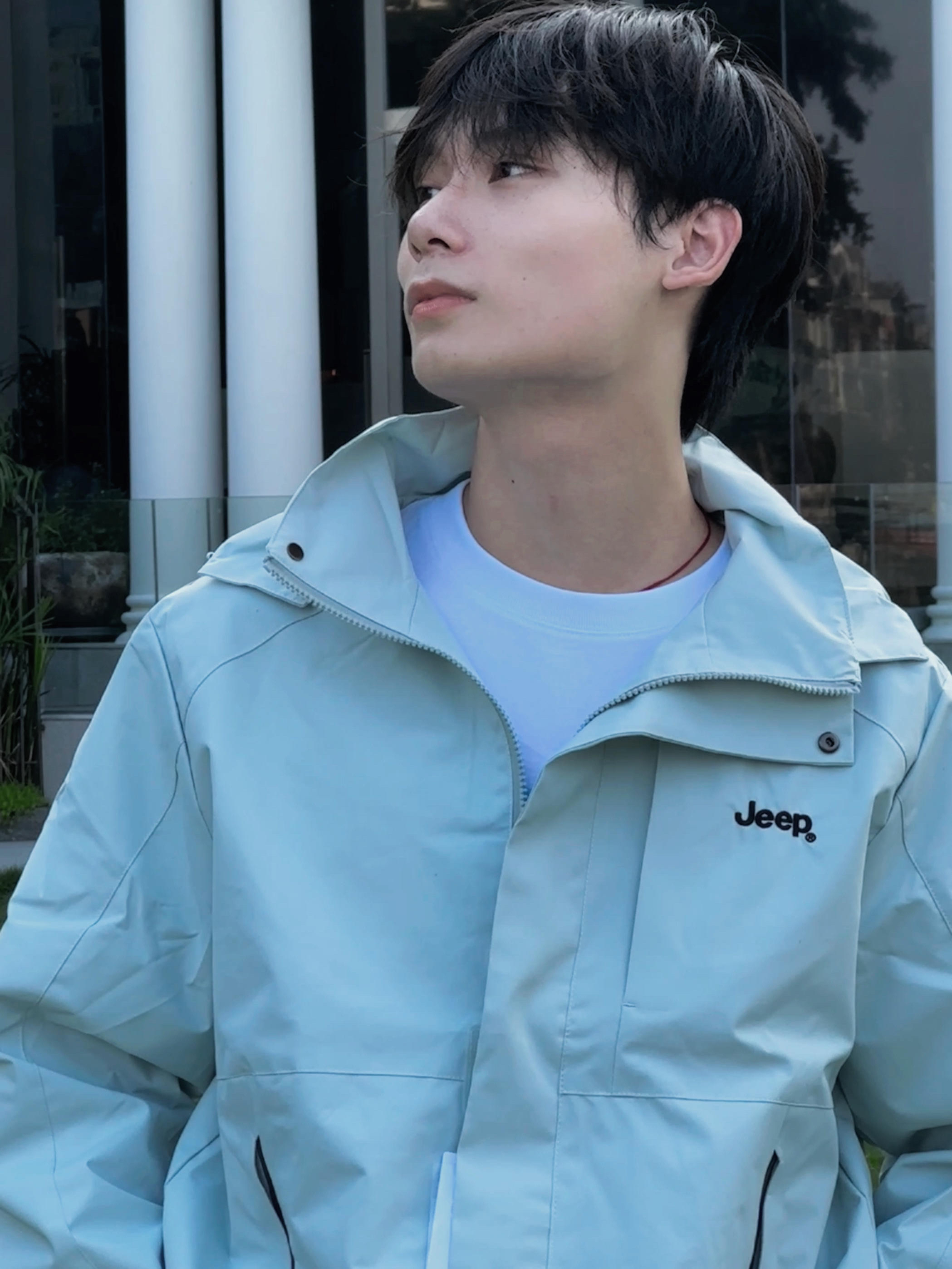 Jeep这件冲锋衣颜色很清新🧊,淡淡的蓝色。 南昌最近老下雨,小雨的时候,溅到水轻轻一掸就没,不用手忙脚乱擦。我感觉防风领口定型做得挺不错的,贴合脖子和手腕,刮风的时候不会透风进来 个人搭配的话:我搭配的是军绿色工装裤,感觉还是挺合适的,比较清爽干净一点