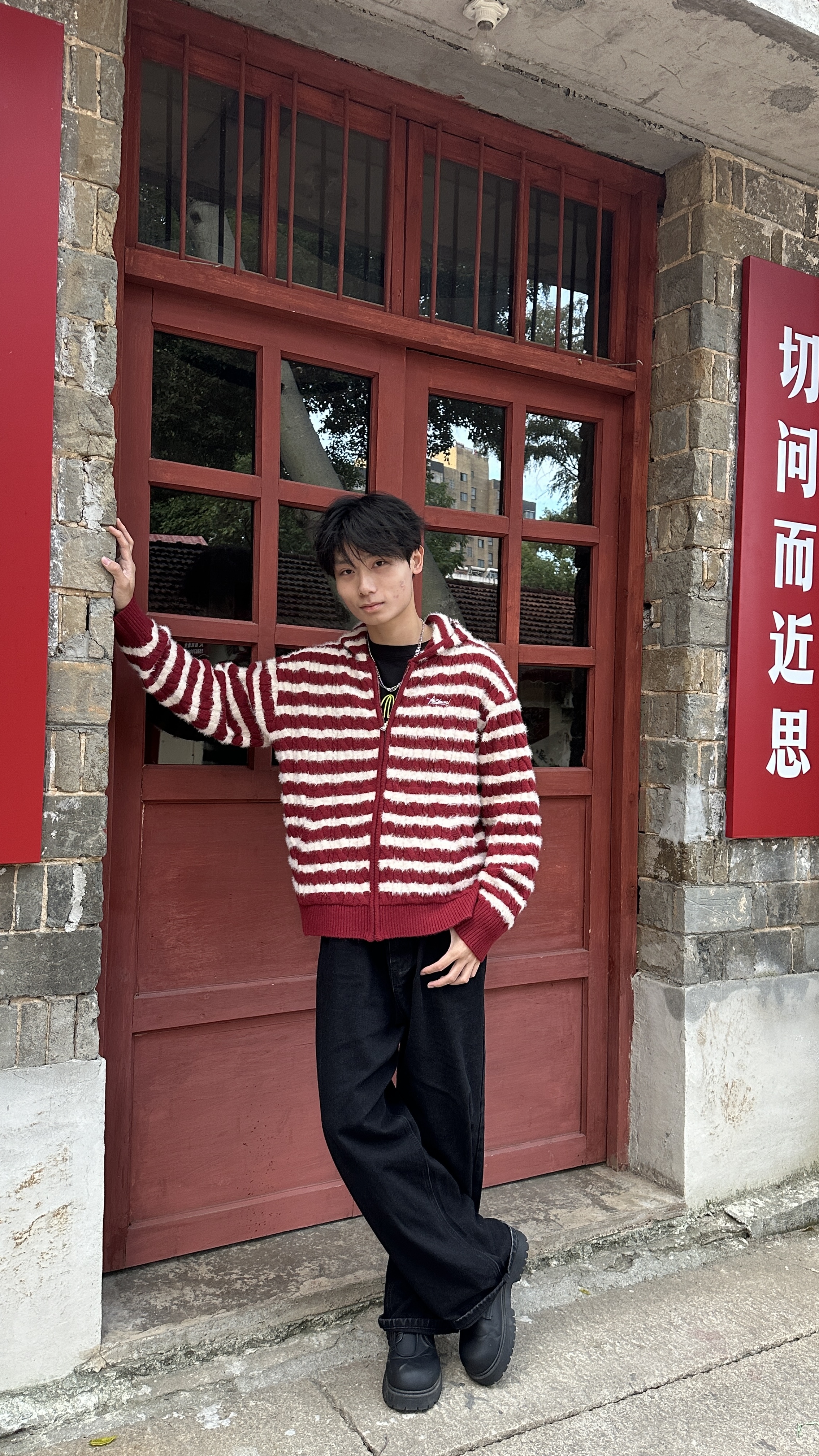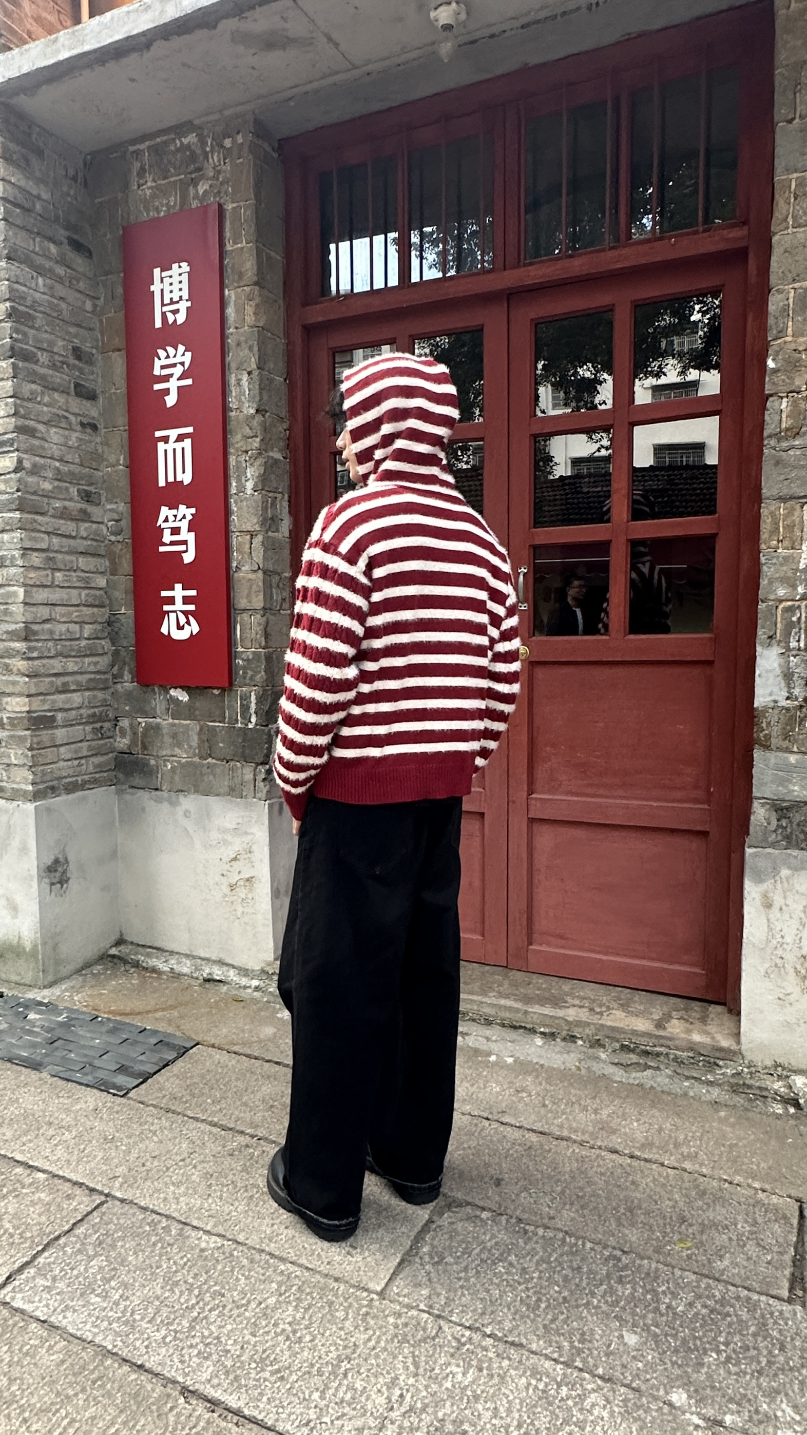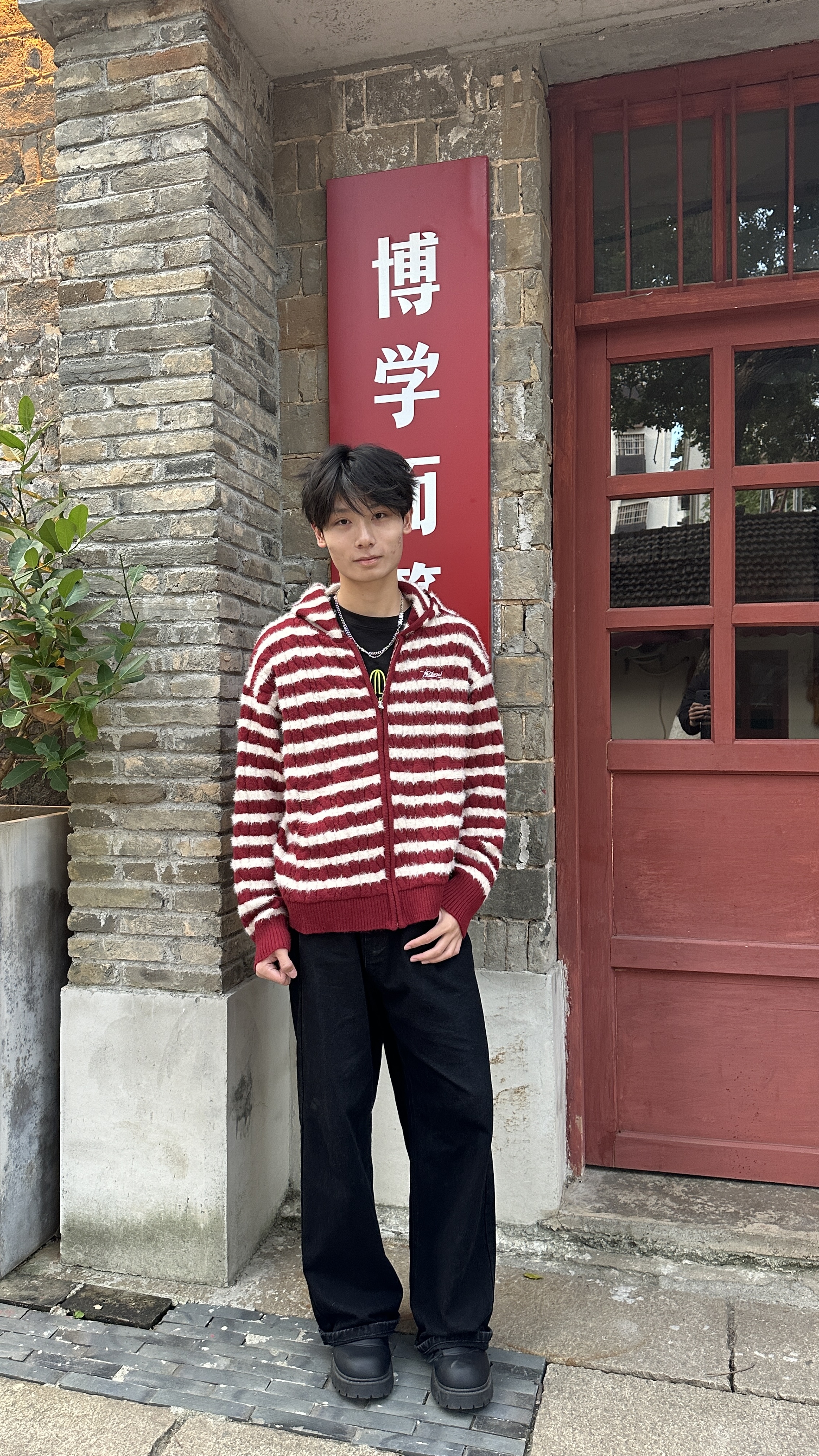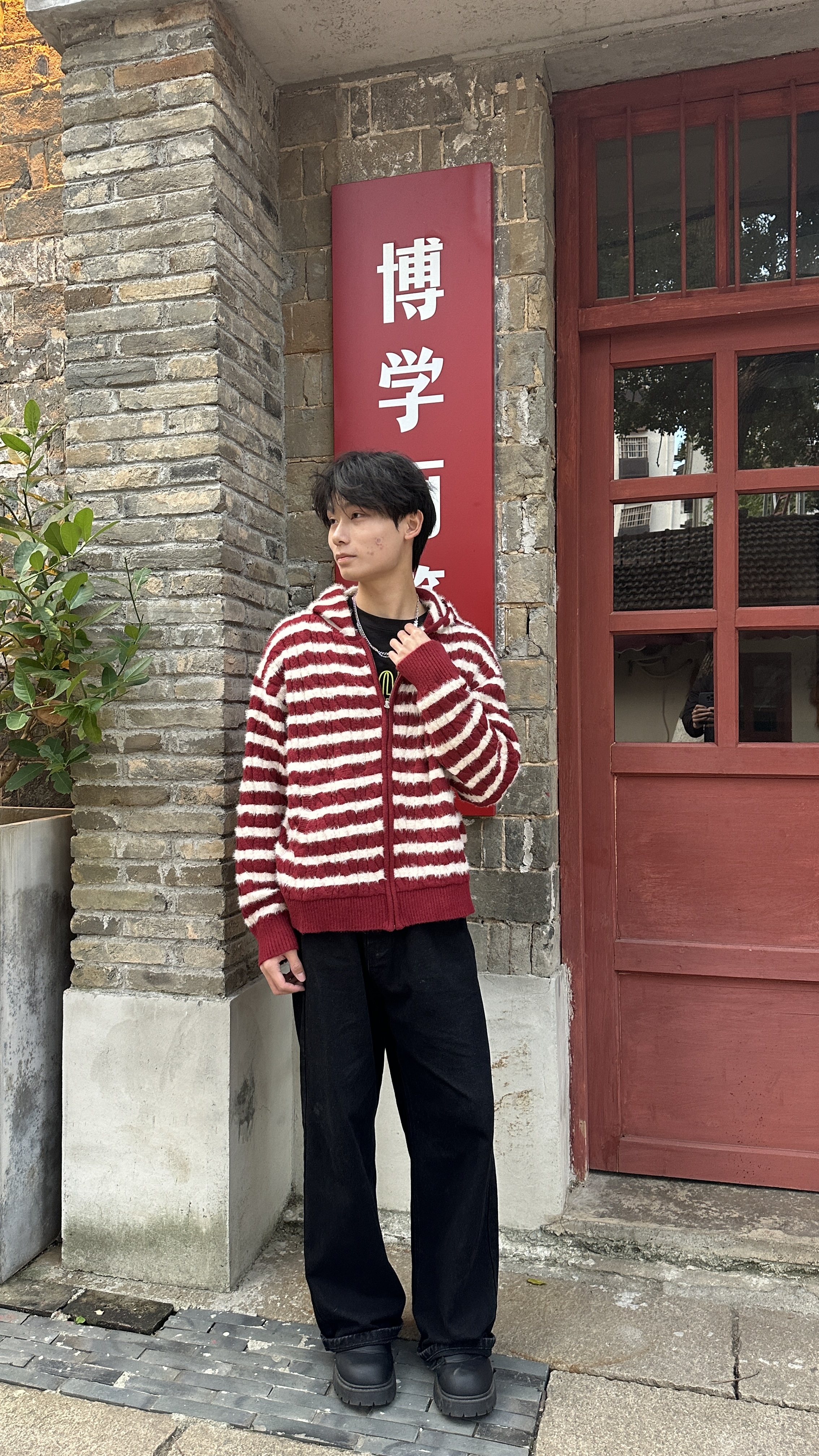 浅浅期待的老巷闲逛穿搭🍂 被这件连帽衫裹得刚好🤍 主角必须是这件 F426 红白条连帽衫!🧶 毛绒质感摸着暖糯不扎肤,贴身穿也舒服~ 红白细条纹不扎眼还衬气色,黄皮穿也不踩雷✨ 宽松版型很修饰身型,我178/62穿xl码,微宽松 内搭简单配了件黑T,清爽不闷;下装是黑阔腿裤,垂顺没褶子👖 红白黑配色和老巷红墙、青石板衬得刚好,随便站都出片 整套暖糯又不臃肿,还很出片噢
