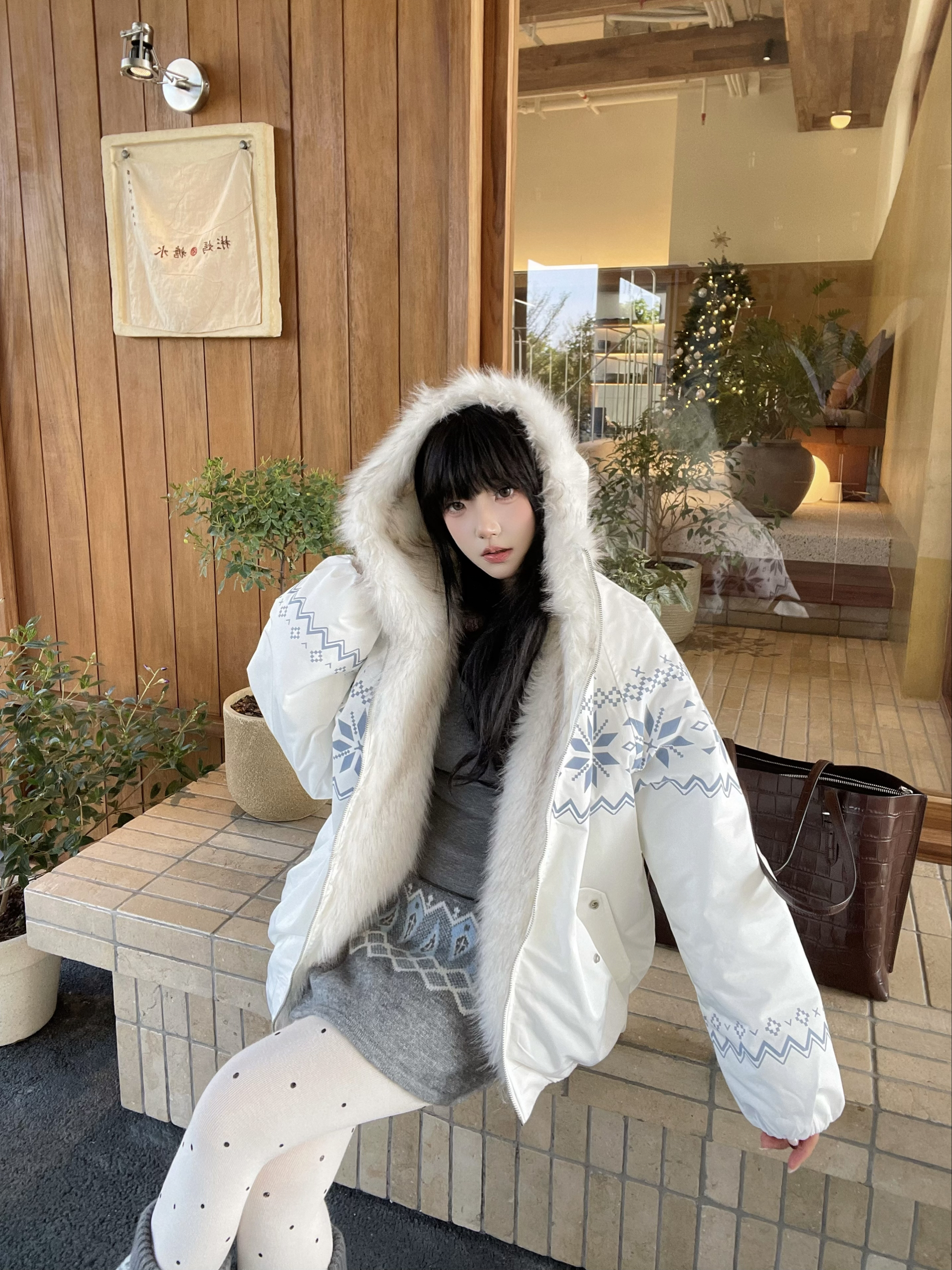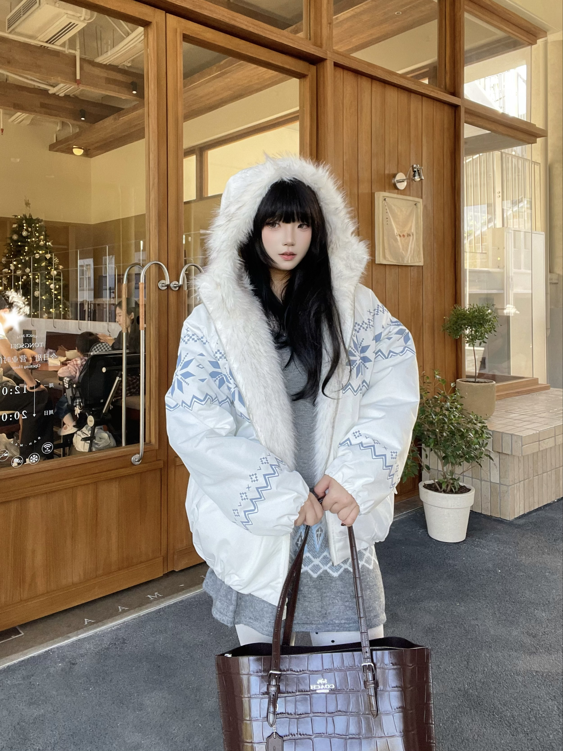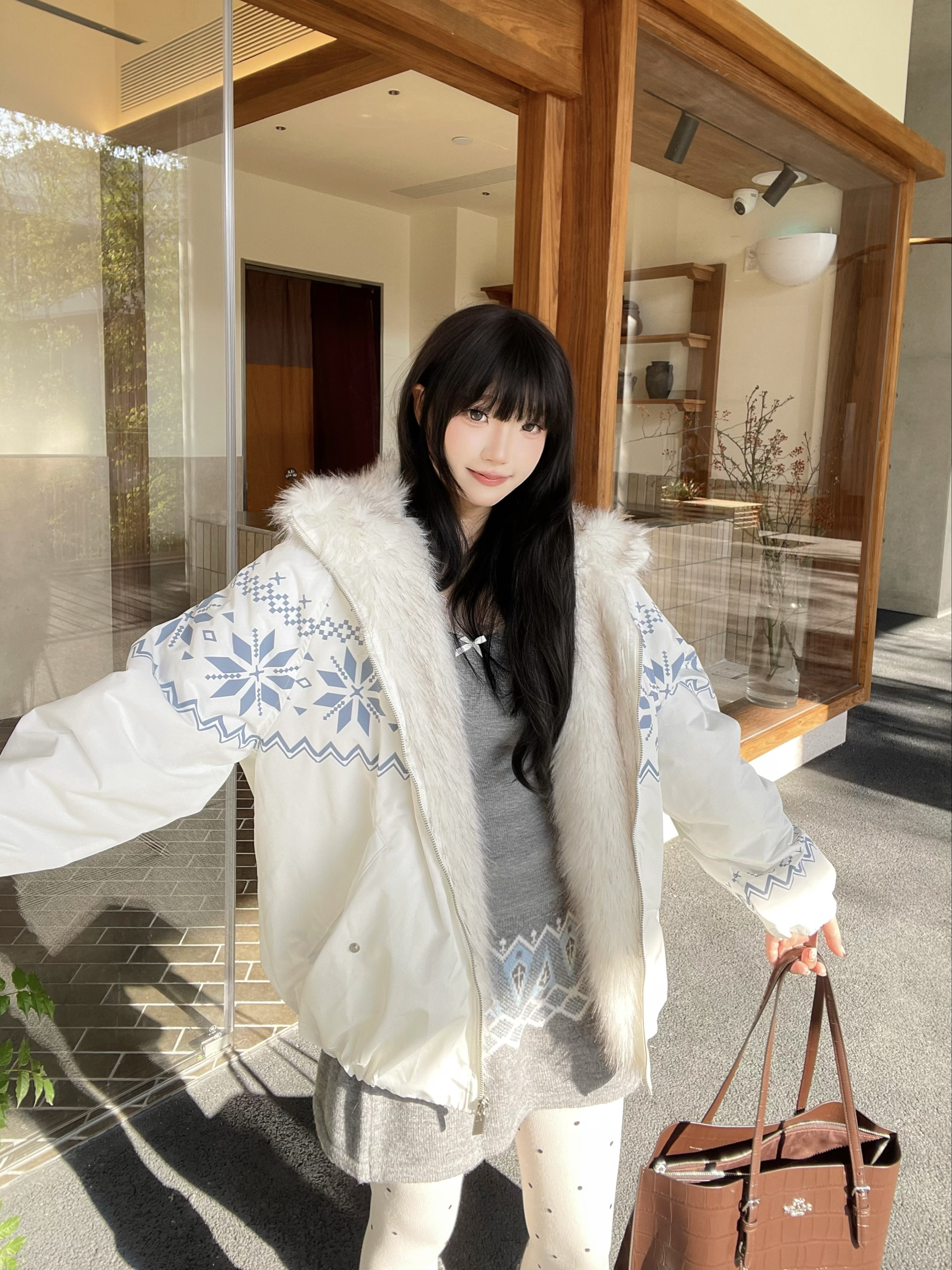 喜欢费尔岛元素💨 FDR这件费尔岛棉服也太貌美啦🤍,蓝白配色温柔又吸睛,➕超大毛领,妥妥的韩系ins风💭 搭配coach的棕色托特包👜,复古感get,轻松拿捏秋冬慵懒氛围~