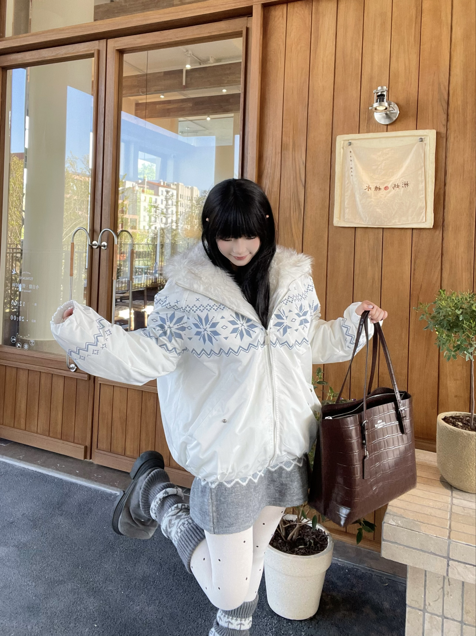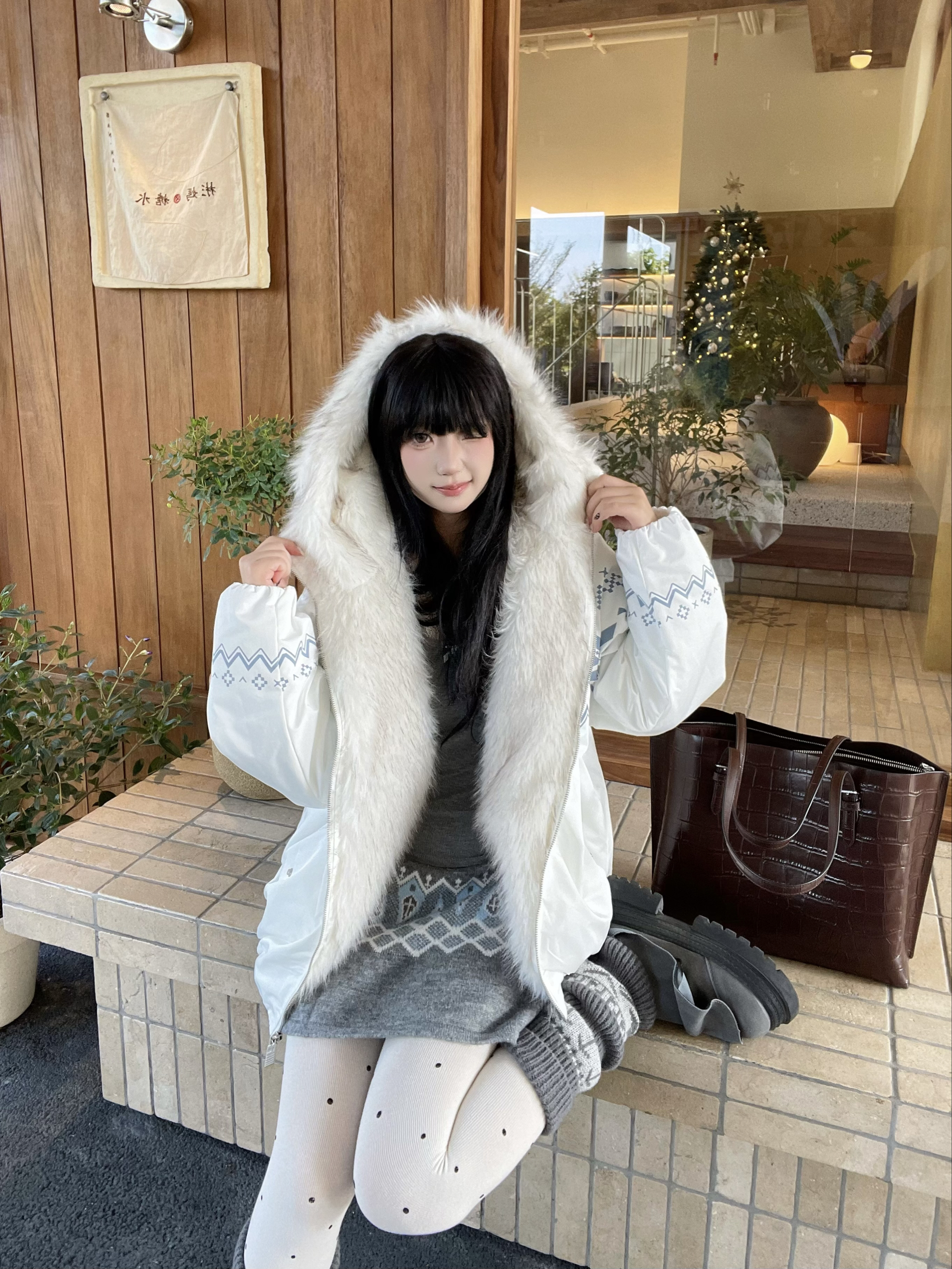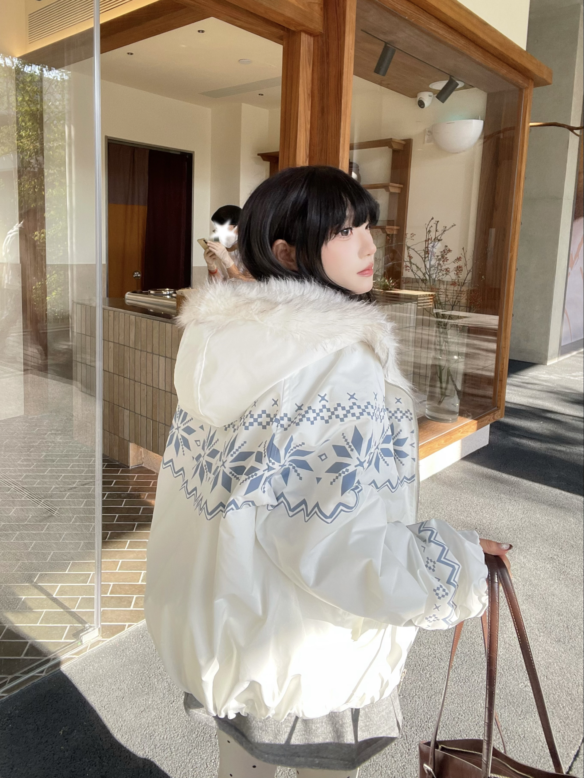 喜欢费尔岛元素💨 FDR这件费尔岛棉服也太貌美啦🤍,蓝白配色温柔又吸睛,➕超大毛领,妥妥的韩系ins风💭 搭配coach的棕色托特包👜,复古感get,轻松拿捏秋冬慵懒氛围~