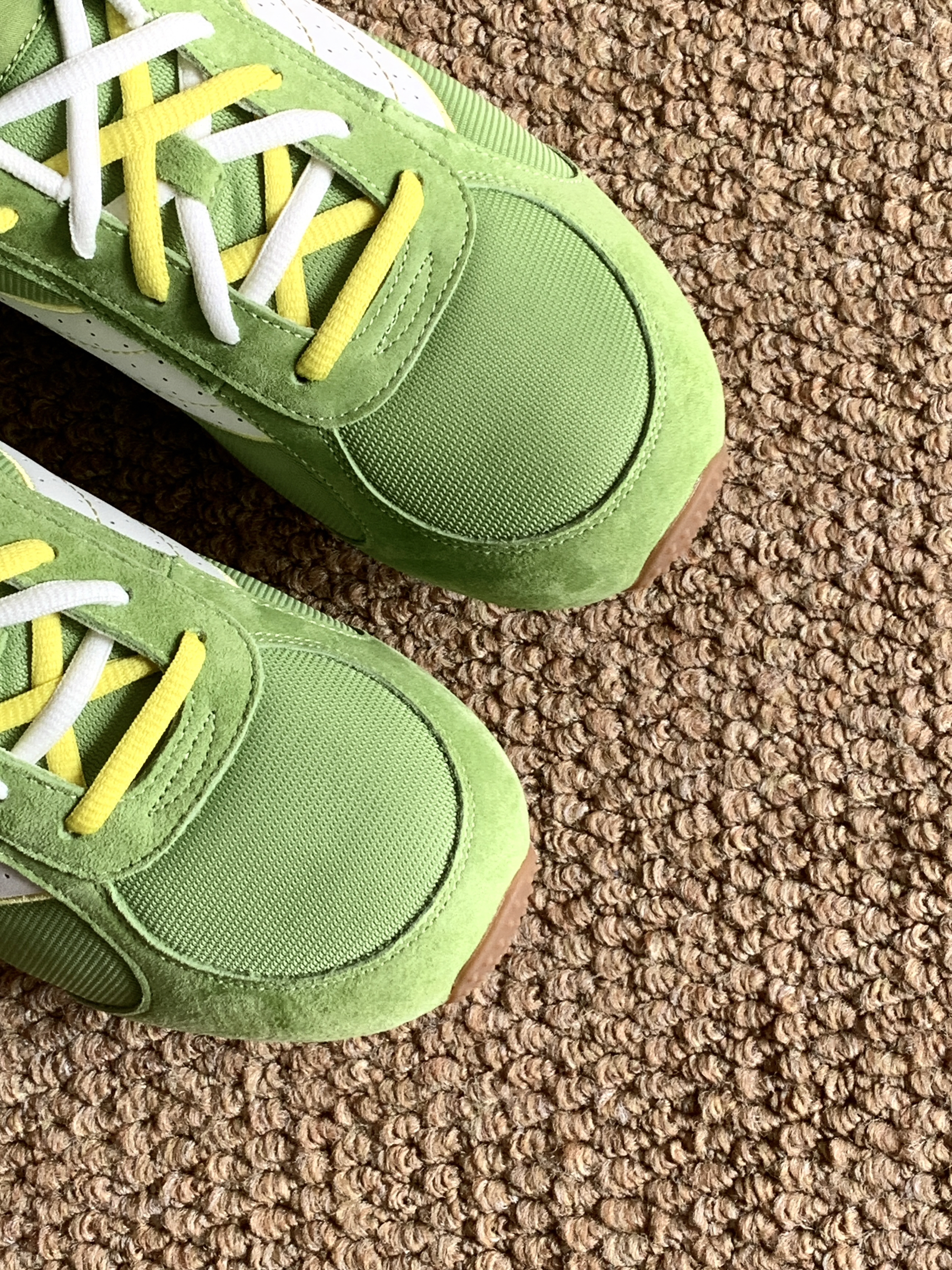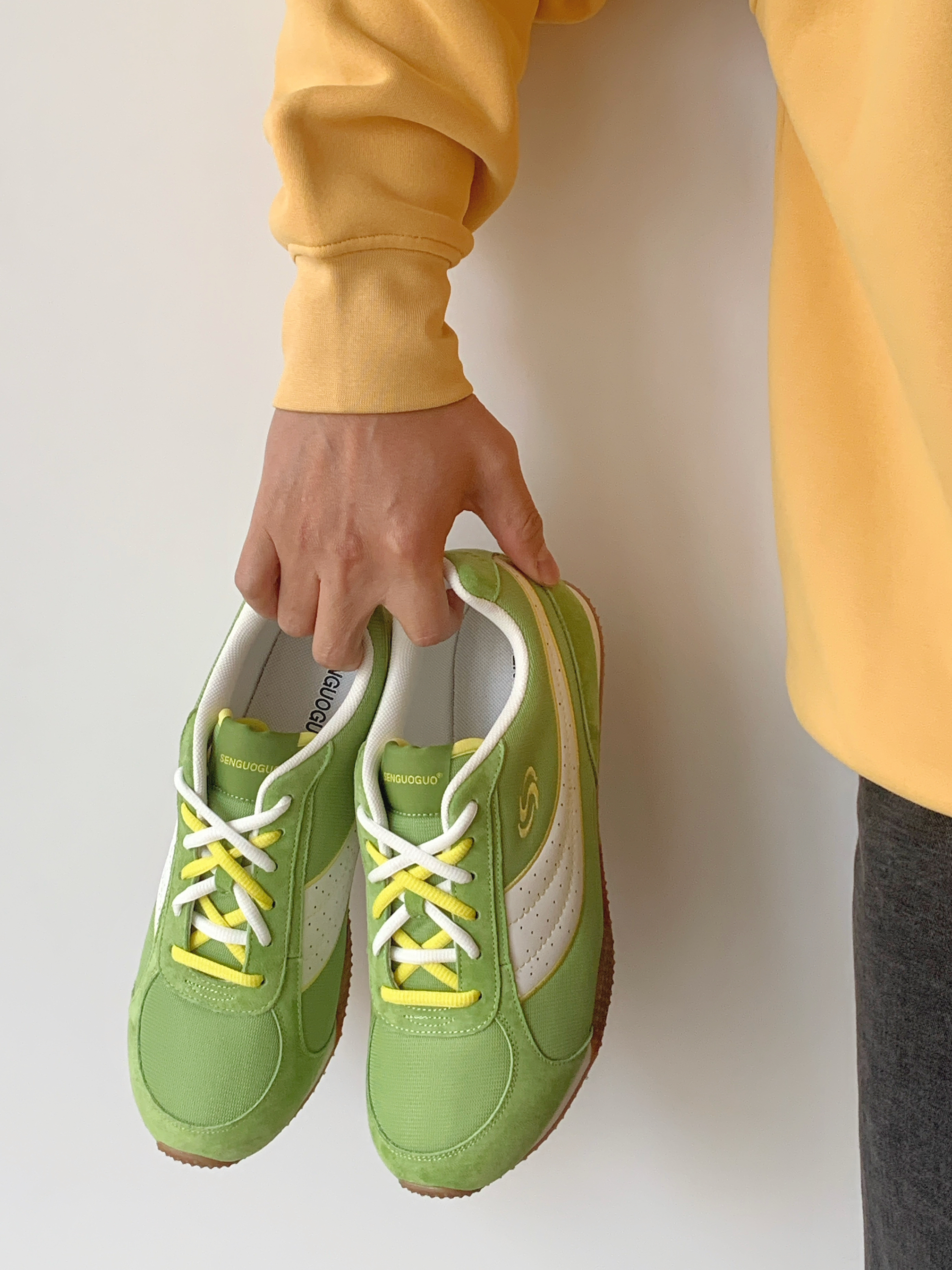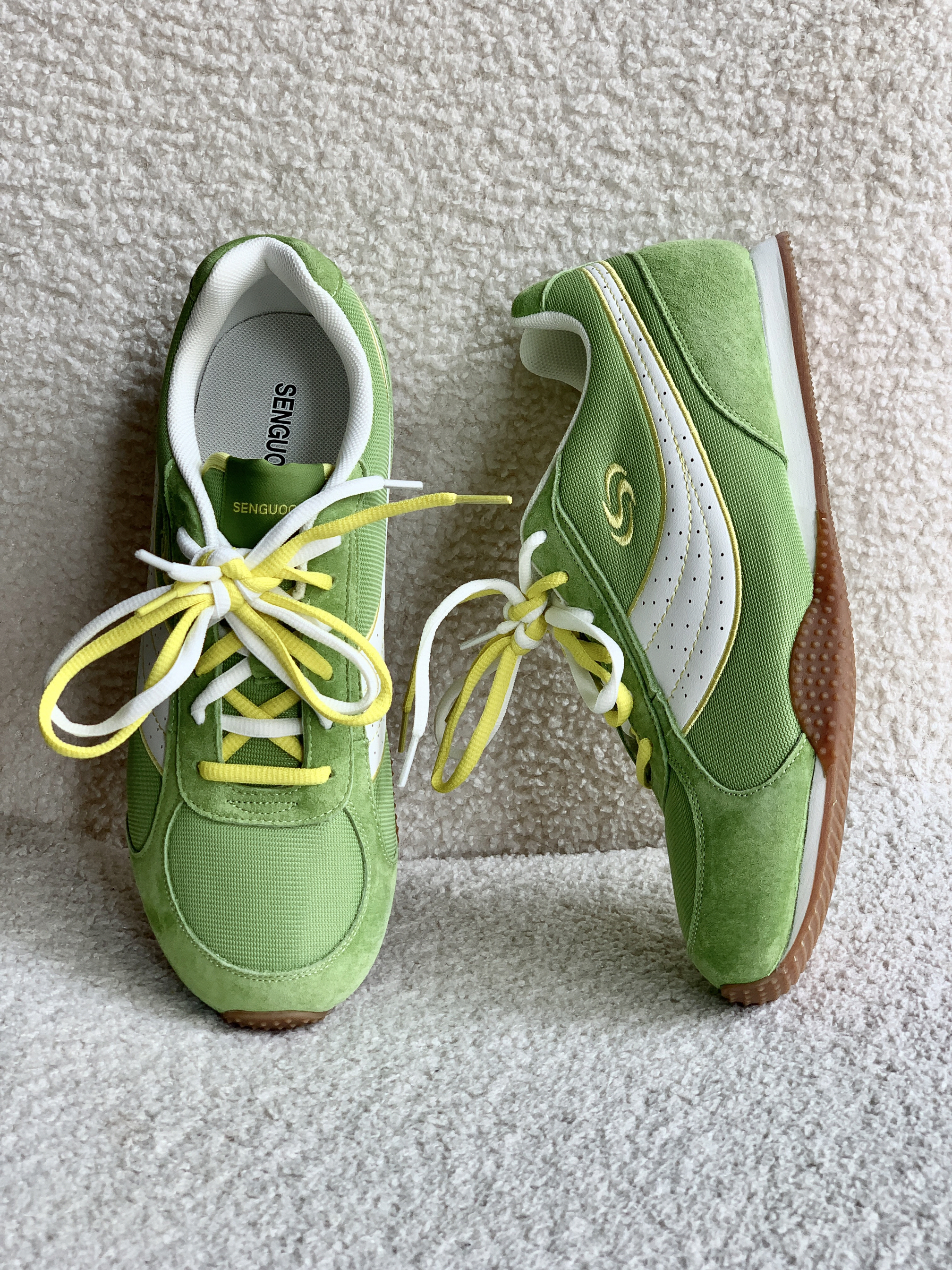 🍃 春天疯狂想穿绿色鞋子 感觉上脚就很有活力的样子 🍃颜值: 清新的牛油果绿 搭上黄色鞋带元气感十足 🍃细节: 这个双鞋带的设计还是蛮不错的 白色跟黄色跟鞋面的配色呼应起来 🍃脚感&尺码: 蛮舒服的通勤穿足够了 正码不偏 我42穿42刚好 🍃搭配: 鞋子不基础 裤子就基础点吧 搭配一些暗色系的裤子就可以了 大胆的也可以选择撞色裤子