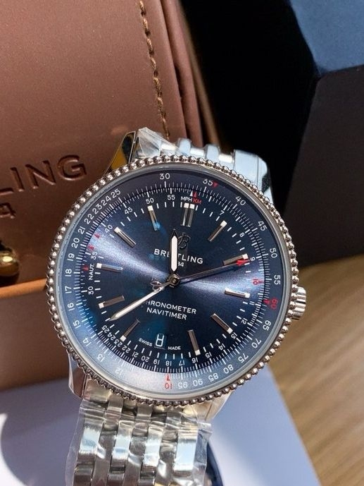 朋友最近学开飞机,理论课上总摆弄一个复杂的物理计算尺。我笑他复古。直到我把这块百年灵Navitimer拿到手,才明白那种感觉——这不是看时间,是在手腕上保留了一个微缩的“驾驶舱”。 把它从盒子里拿出来,第一感觉是“信息过载”。表盘上挤满了数字、刻度、三个小表盘,外加一圈双向旋转的环形飞行滑尺。但神奇的是,看久了并不杂乱。深蓝色的底盘像夜空,银色的刻度和指针像星辰与航线,一切复杂都有其秩序。41m...