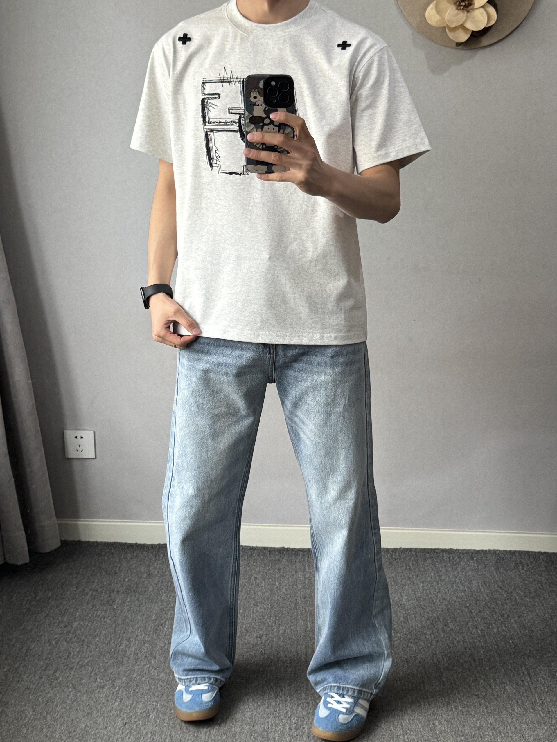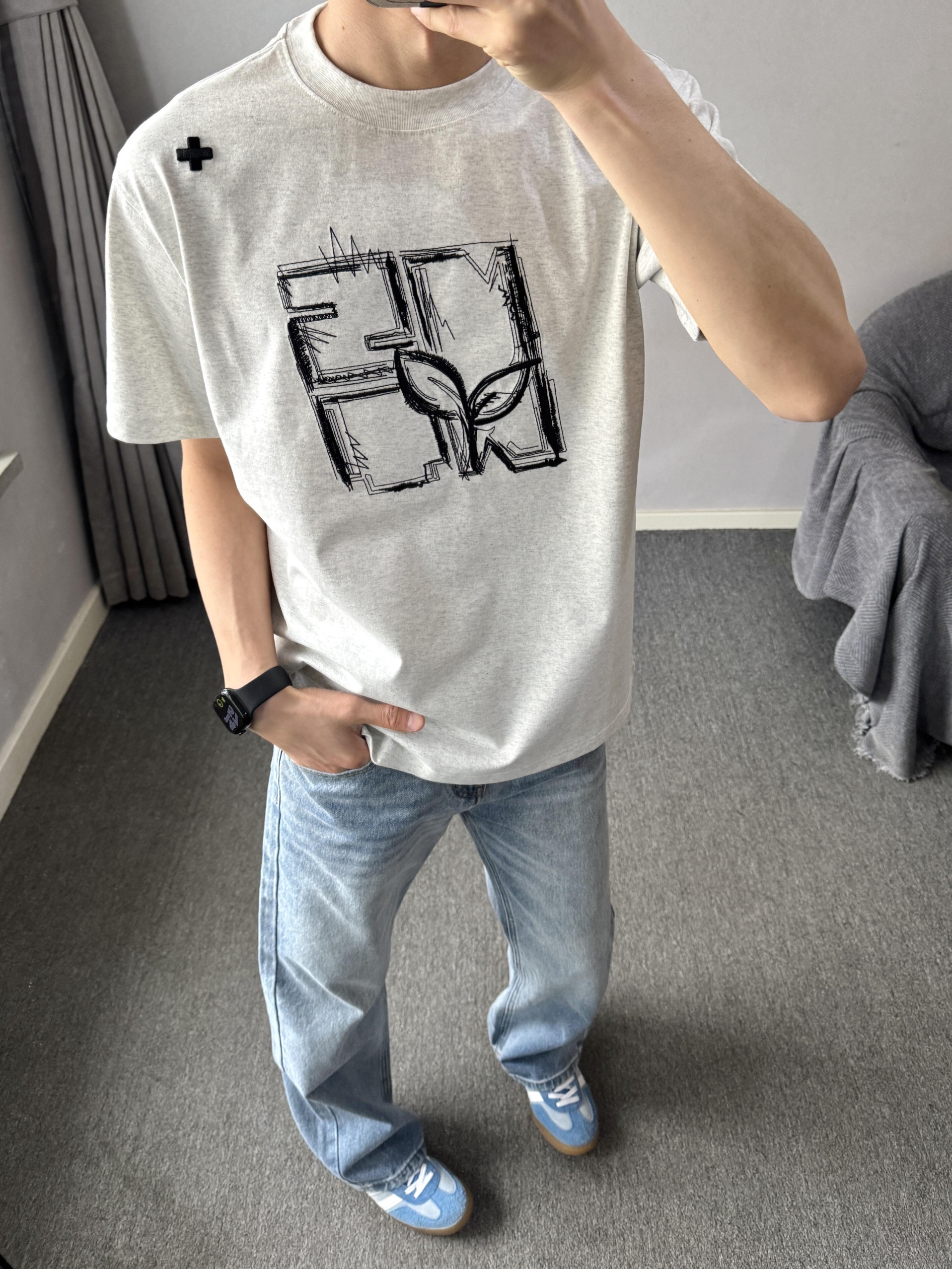 基础款刺绣宽松休闲短袖T恤 搭配美式复古水洗做旧宽松微喇牛仔裤 上身干净利落~百搭不会出错哦 很适合夏天的日常通勤了