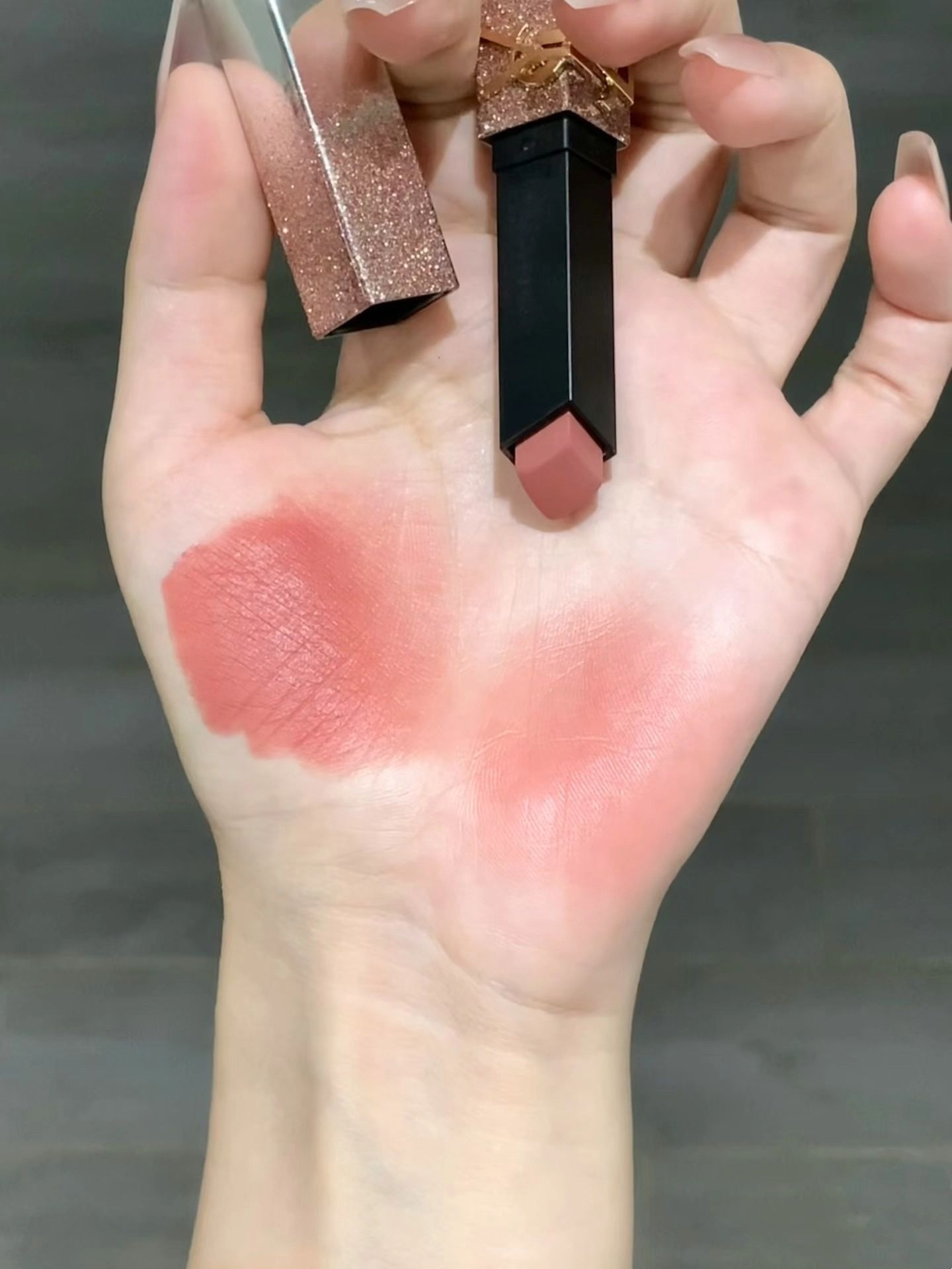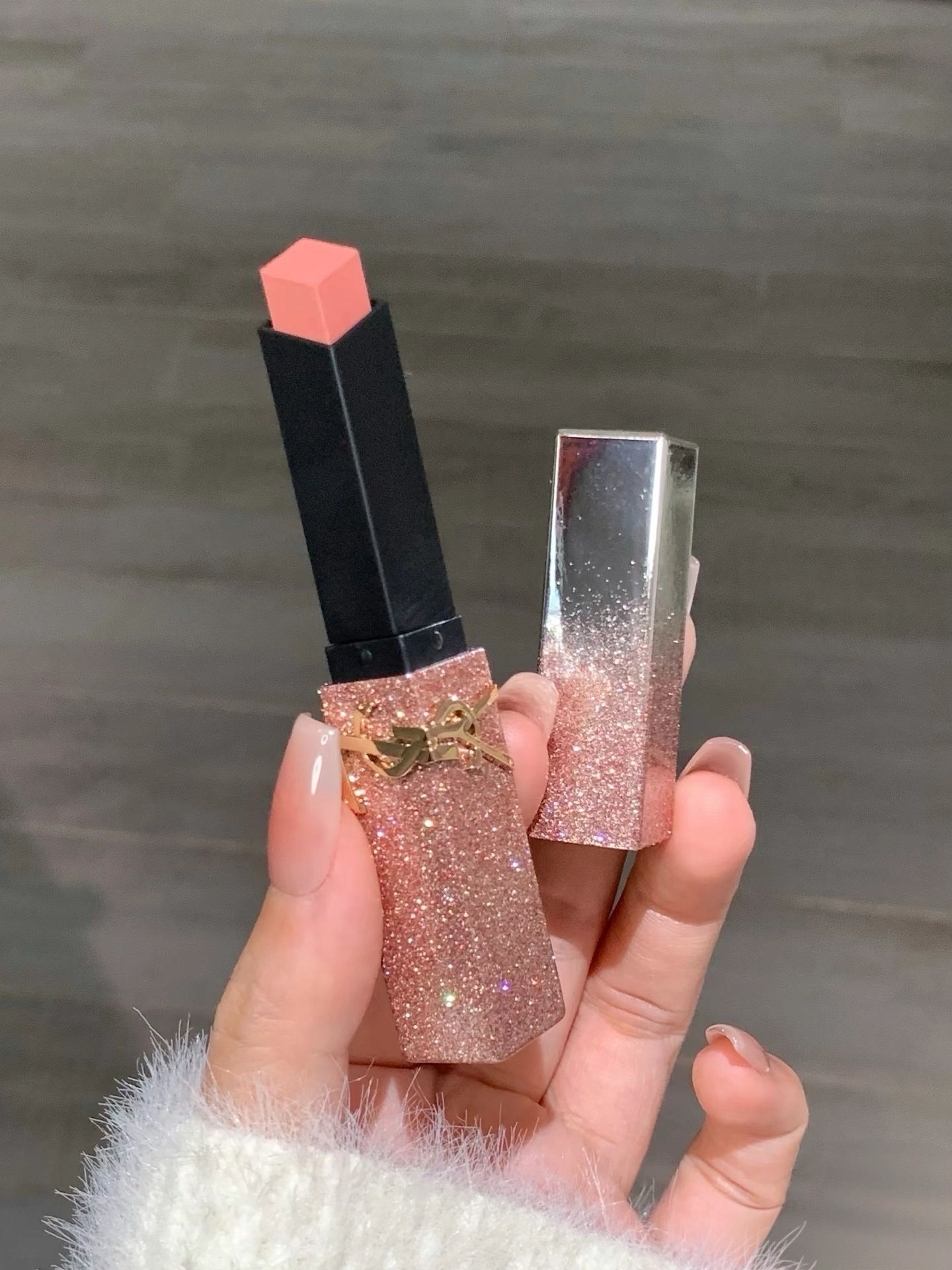 刚拿到YSL限定版口红的时候,我直接被外壳美晕了!粉金细闪的管身,渐变到银白的底部,拿在手里blingbling的,完全戳中少女心,补妆拿出来都觉得超有面儿。 上嘴试了下,质地是那种丝绒雾面的,一点都不拔干,我这种干唇星人没涂润唇膏直接上嘴,也没卡纹起皮,抿嘴的时候还能感觉到一点点柔润的触感,不是那种死干的雾面感。 颜色是温柔的裸调豆沙粉,黄皮涂也完全不踩雷,素颜薄涂一层,气色瞬间提上来了,...
