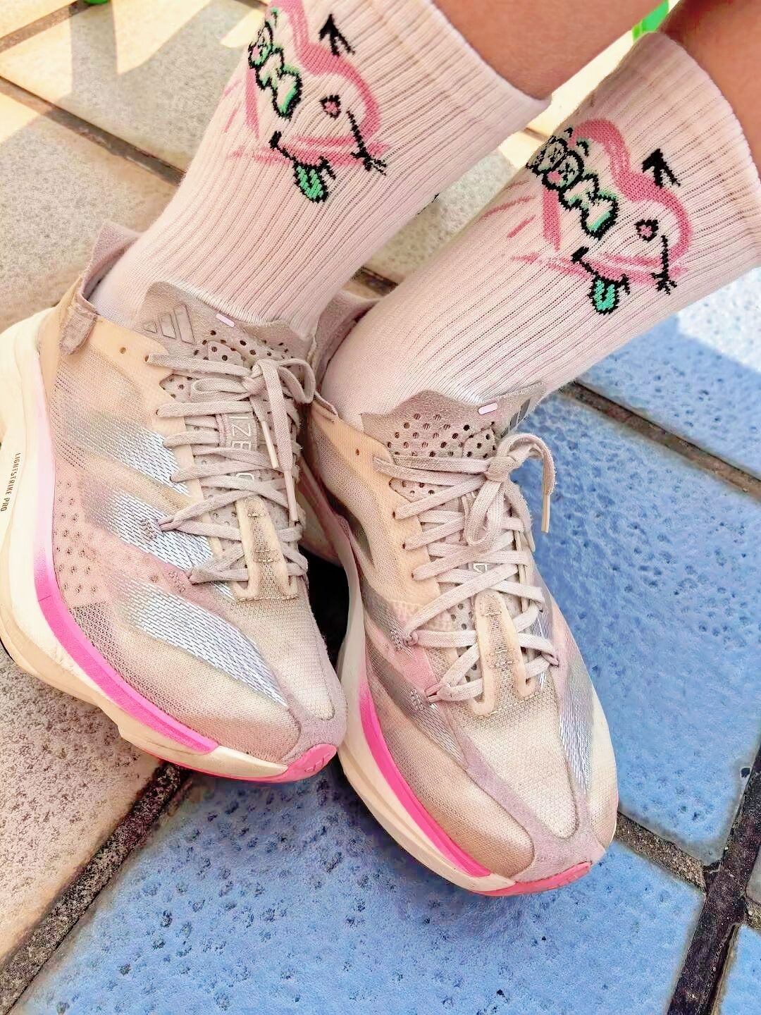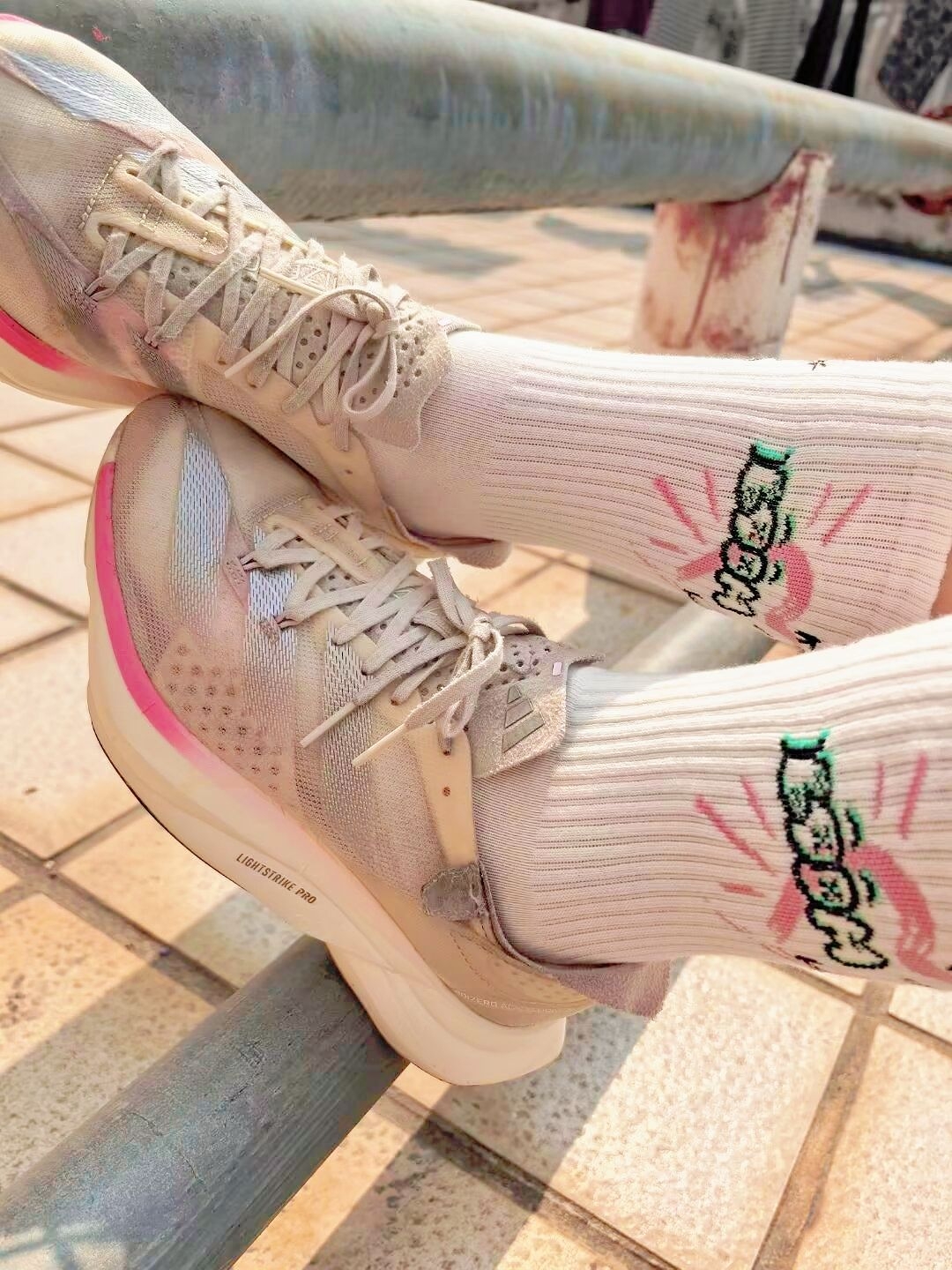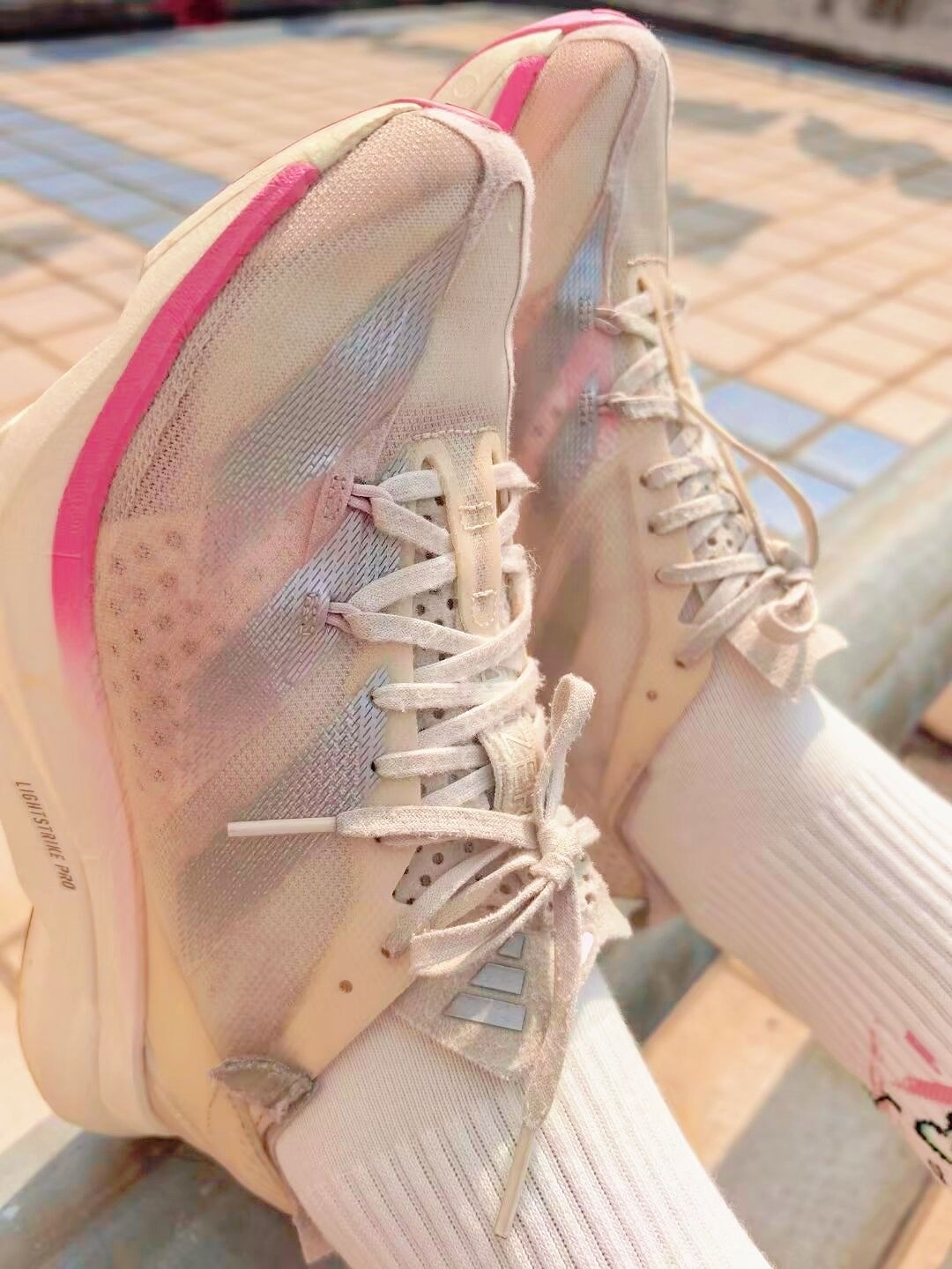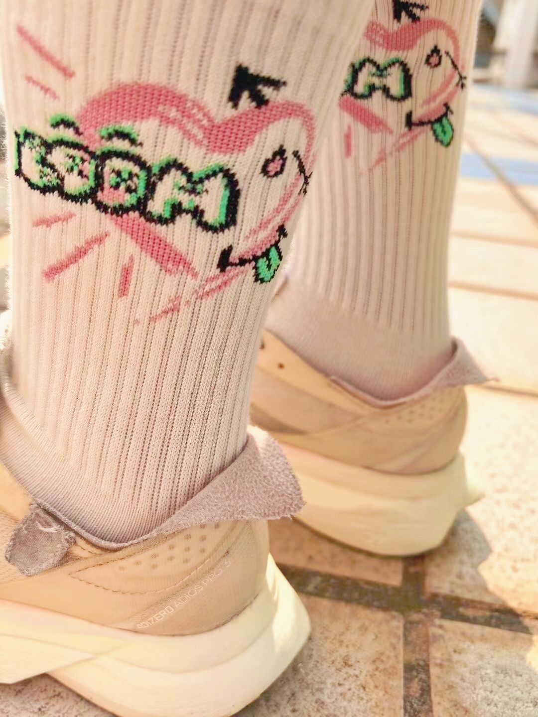 银粉阿迪pro3碳板鞋原来也有温柔的一面,那就是当它搭配粉白爱心袜时,校服的单调感直接被升华了,秒变校园甜心宝贝! 阿迪pro3鞋楦比较宽,脚胖+脚宽的人非常友好,不会挤脚! 派米这款长筒袜,弹力非常好,还很吸汗,爱出汗的人根本不怕臭脚!