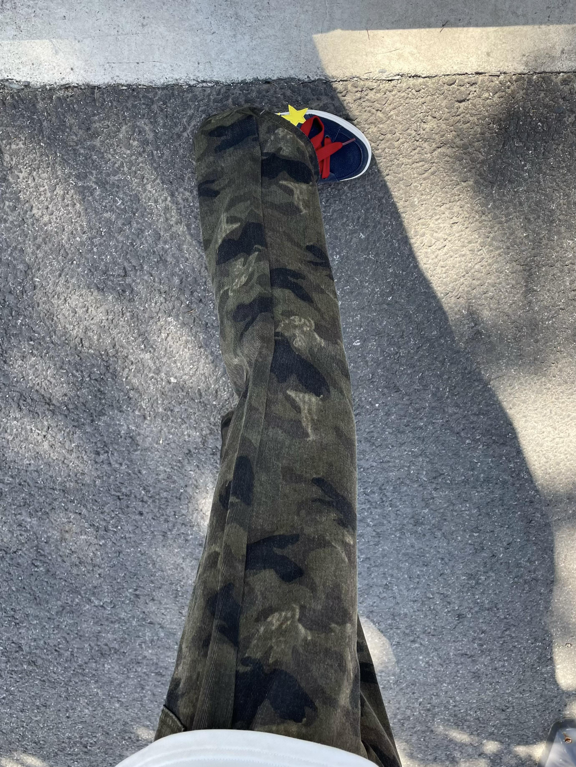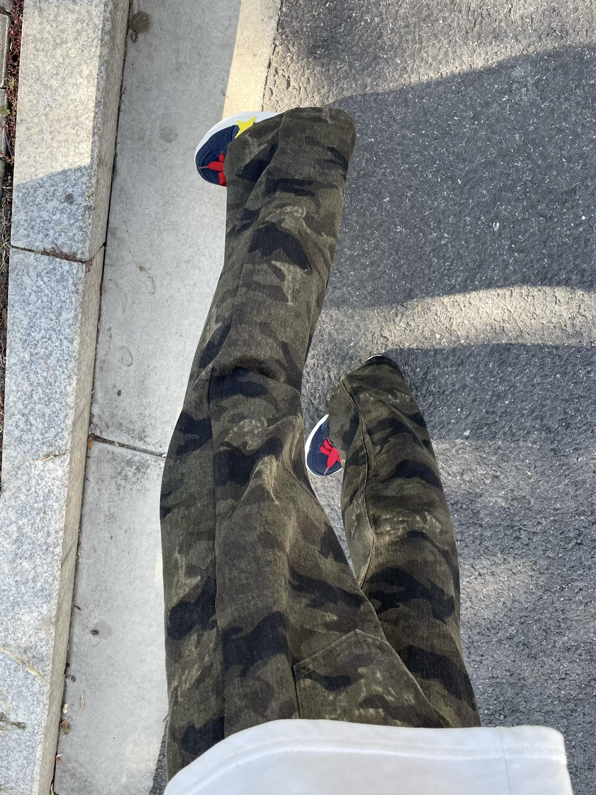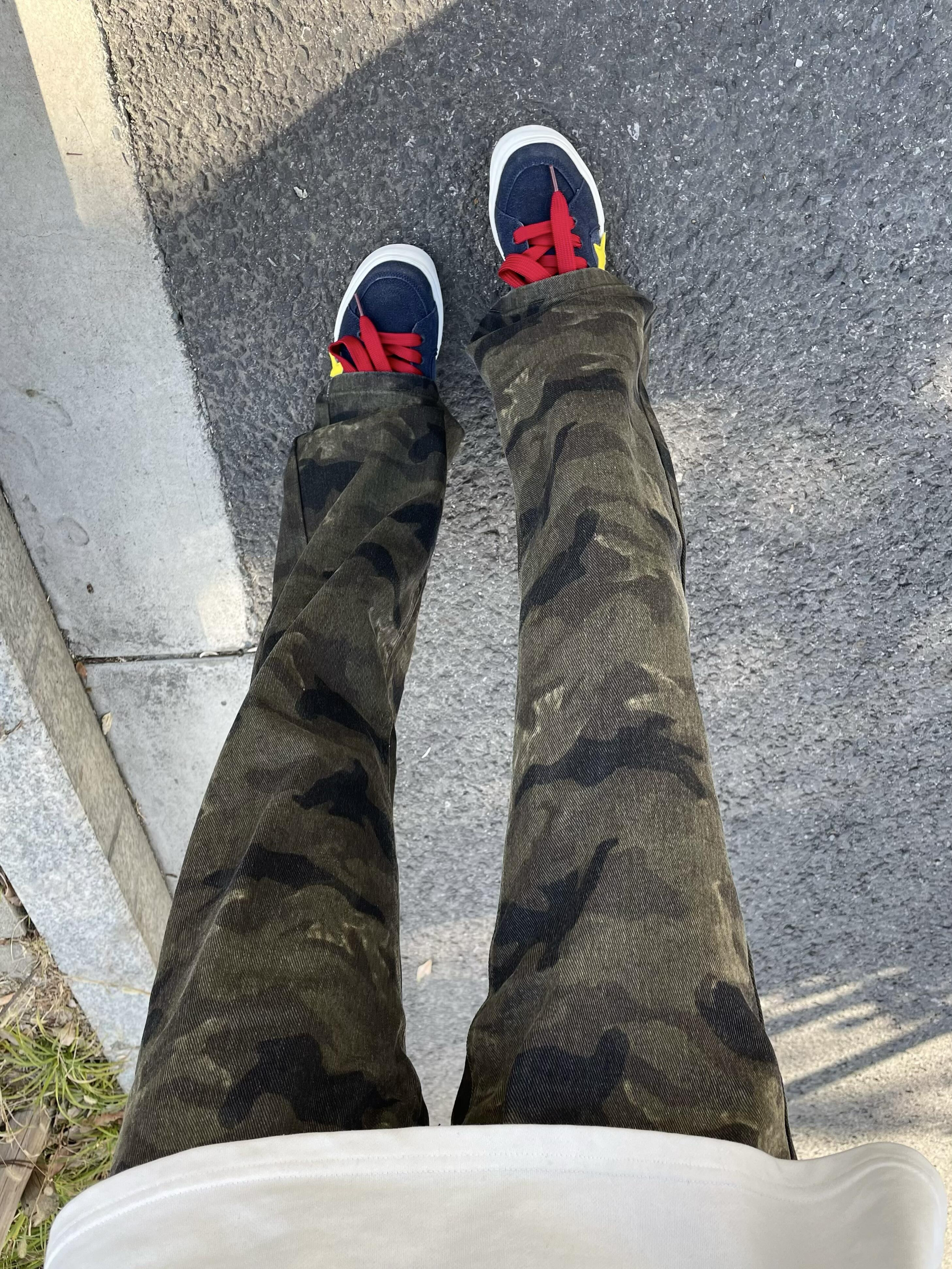 冬天出门穿一条迷彩也太帅啦 版型直筒微喇显瘦又腿长 搭配蓝色板鞋整体利落还很显帅 日常出街随意怎么搭不会出错哒~