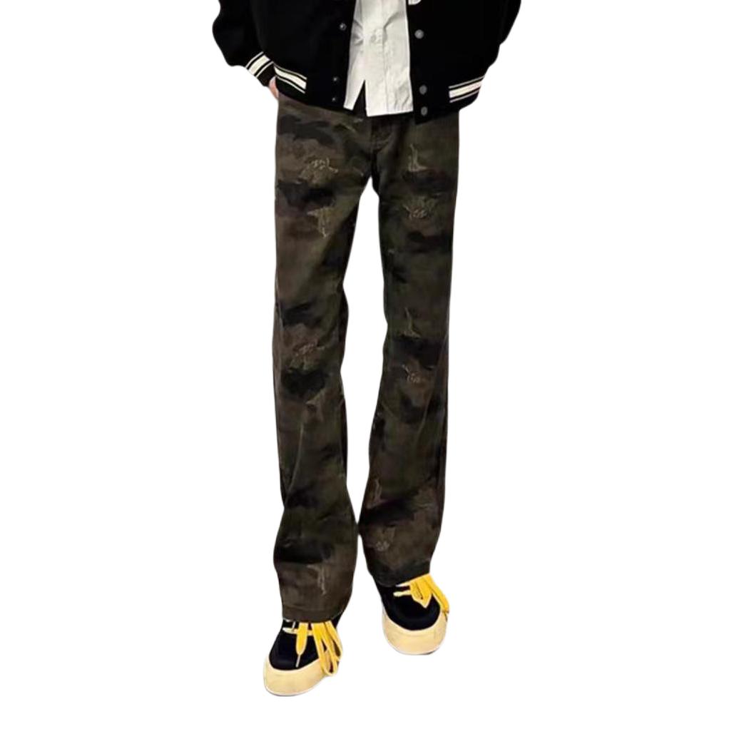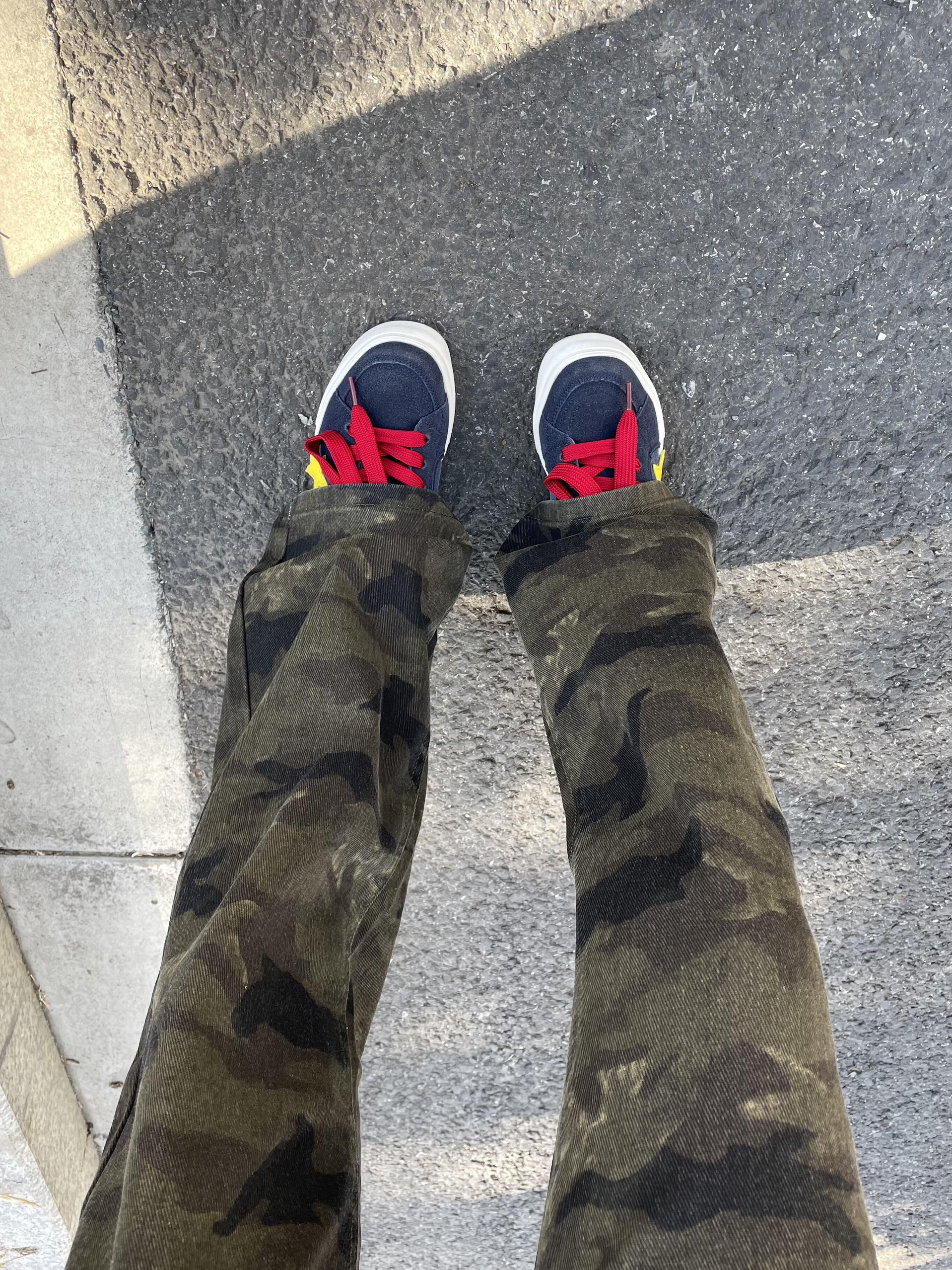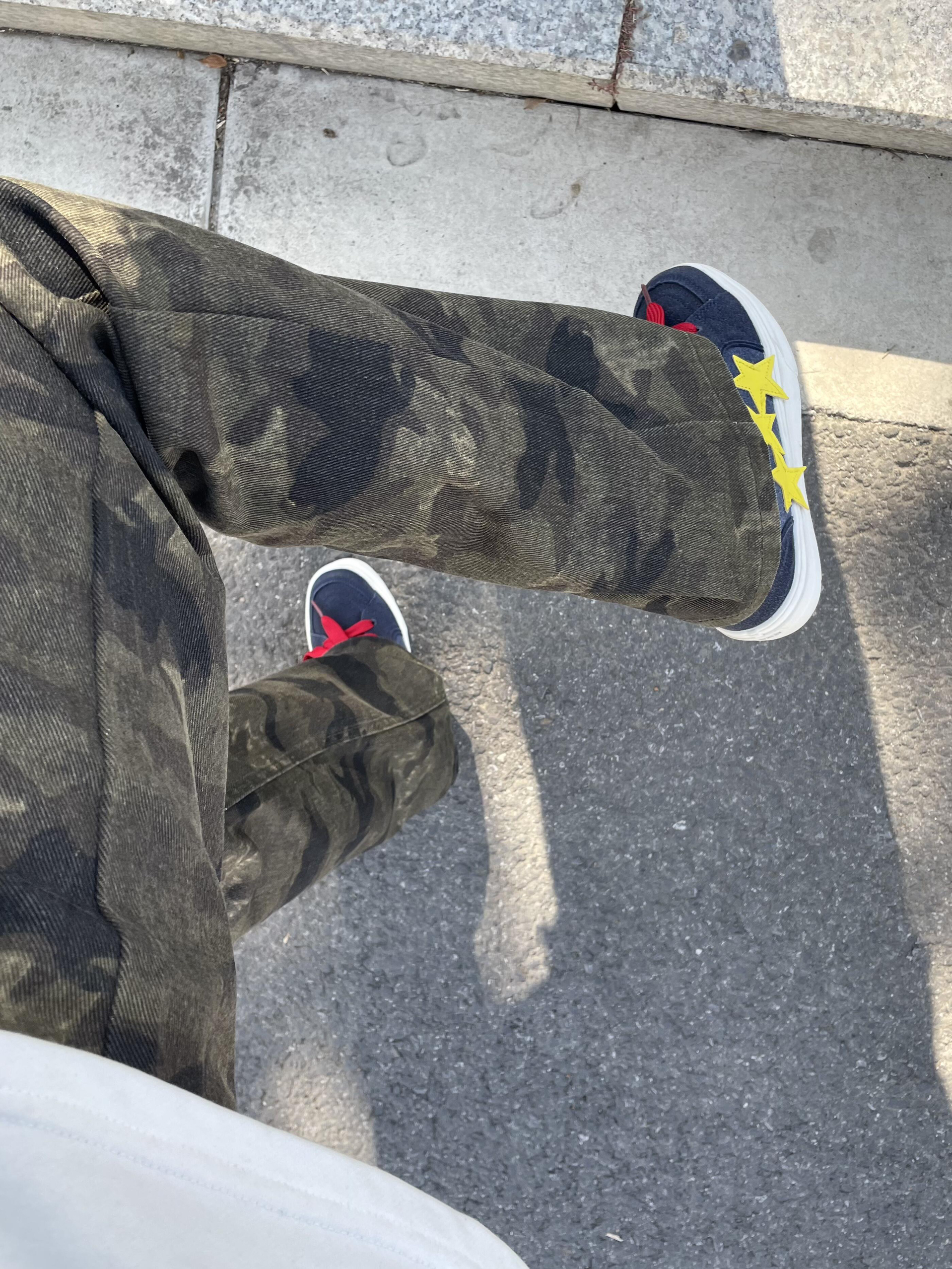 冬天出门穿一条迷彩也太帅啦 版型直筒微喇显瘦又腿长 搭配蓝色板鞋整体利落还很显帅 日常出街随意怎么搭不会出错哒~