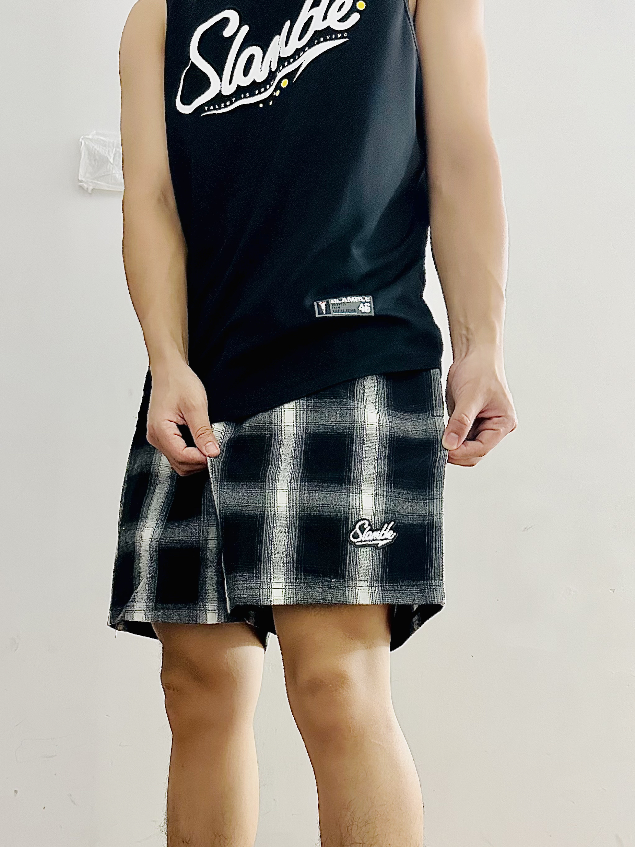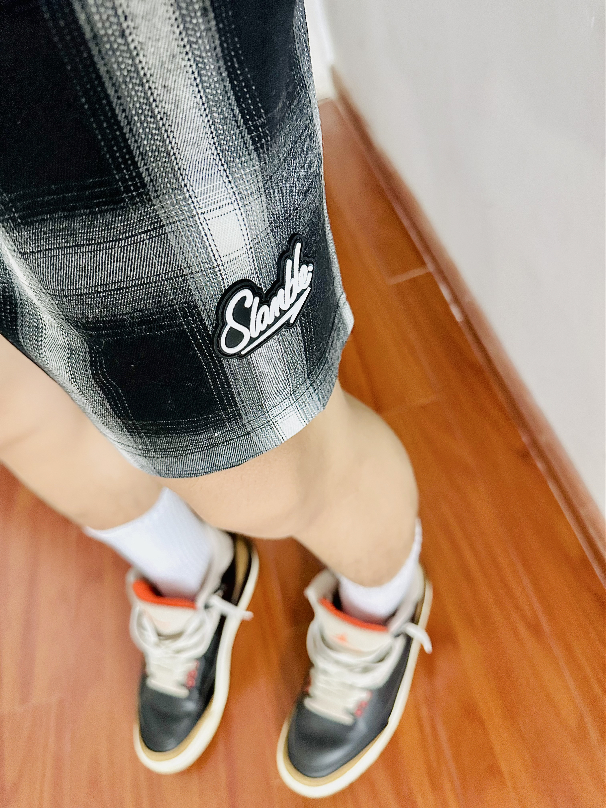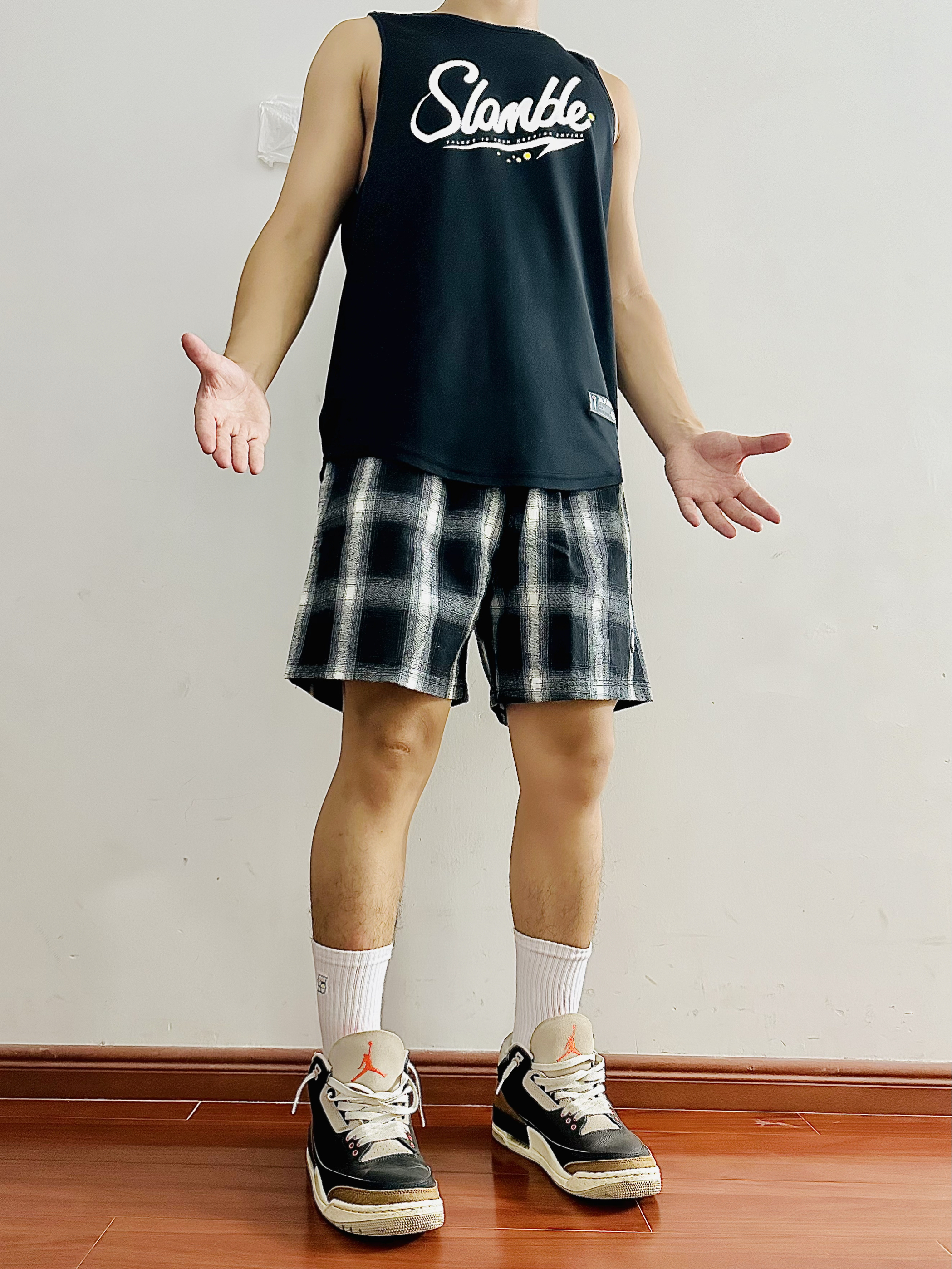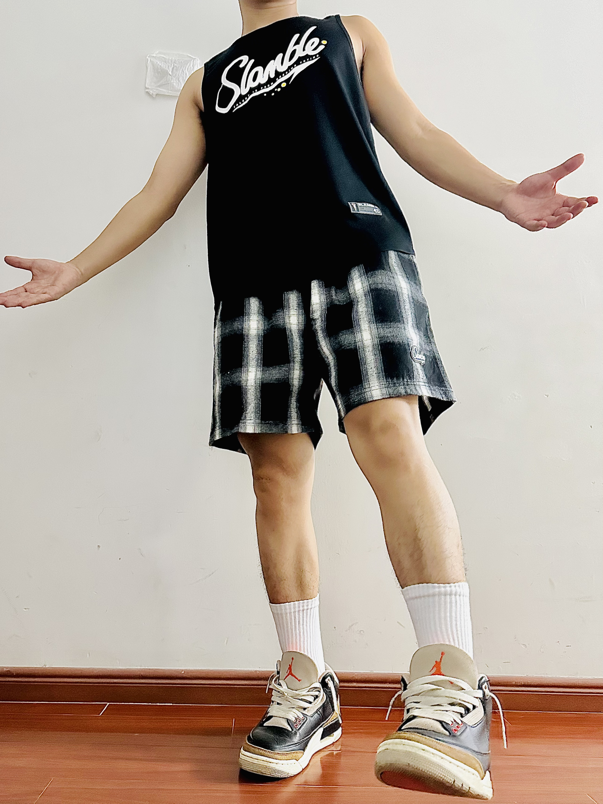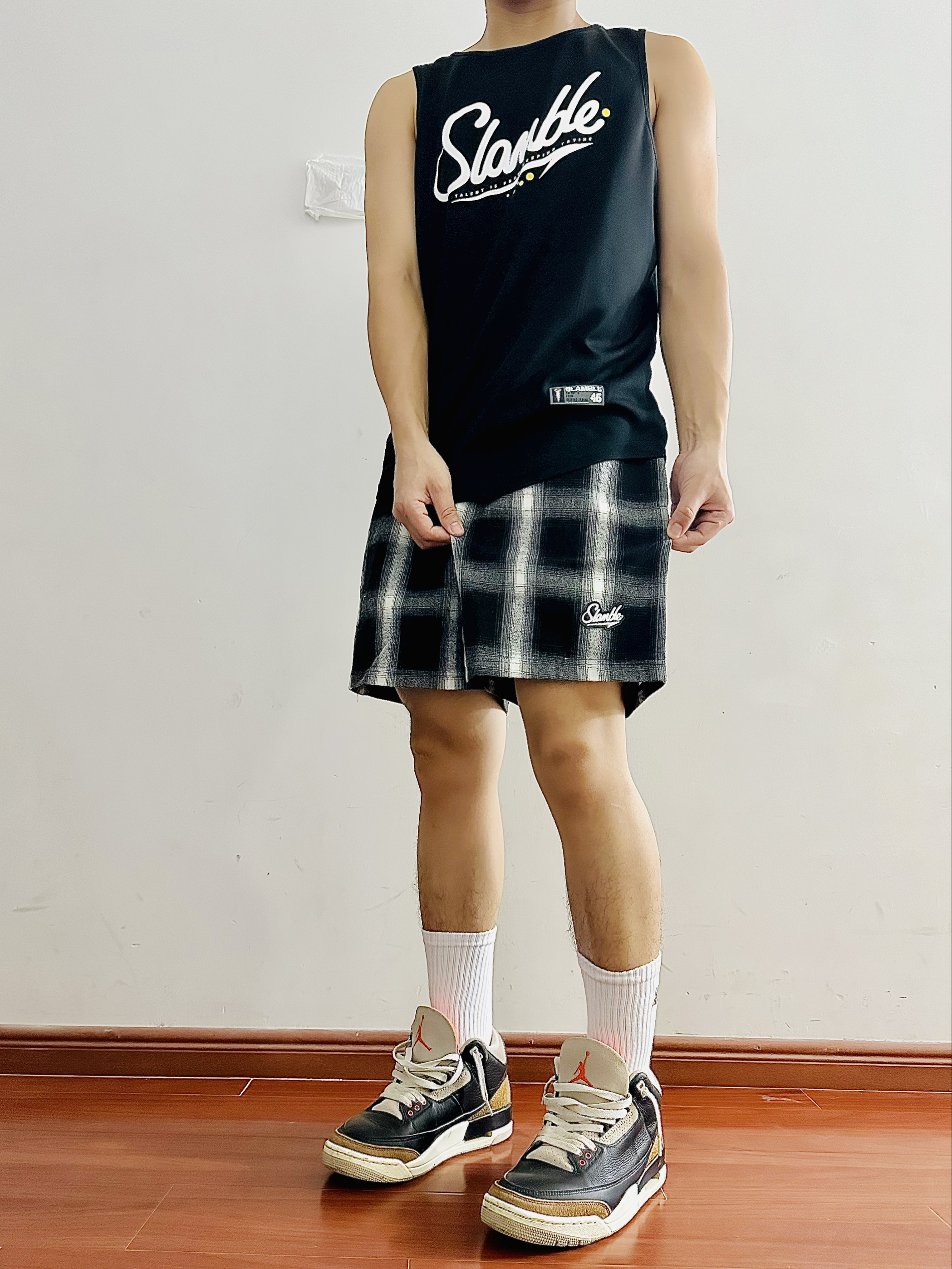 黑色坎肩背心➕黑白格子短裤➕AJ3篮球鞋 🩳: slamble 黑白棋格子短裤 最近入手的这件休闲运动两不误的短裤真不戳😙 硬挺的面料 日常穿着完全不担心皱褶 黑白格子配色 非常百搭 日常穿还是打球穿都很好看 关键现在只要5X的价格 真是我的宝藏穿搭单品💯 尺码推荐:170 65㎏ 选择尺码:M码