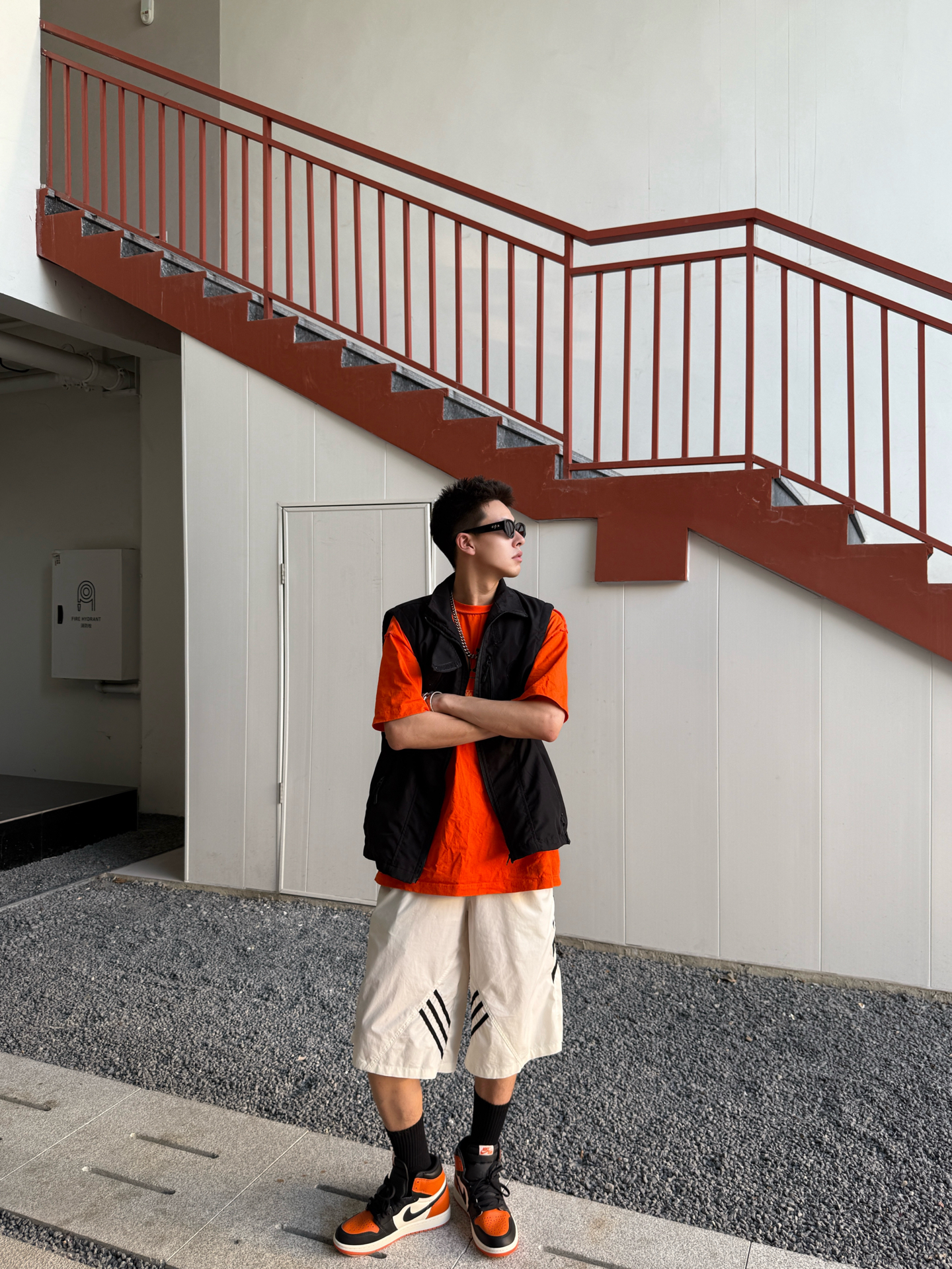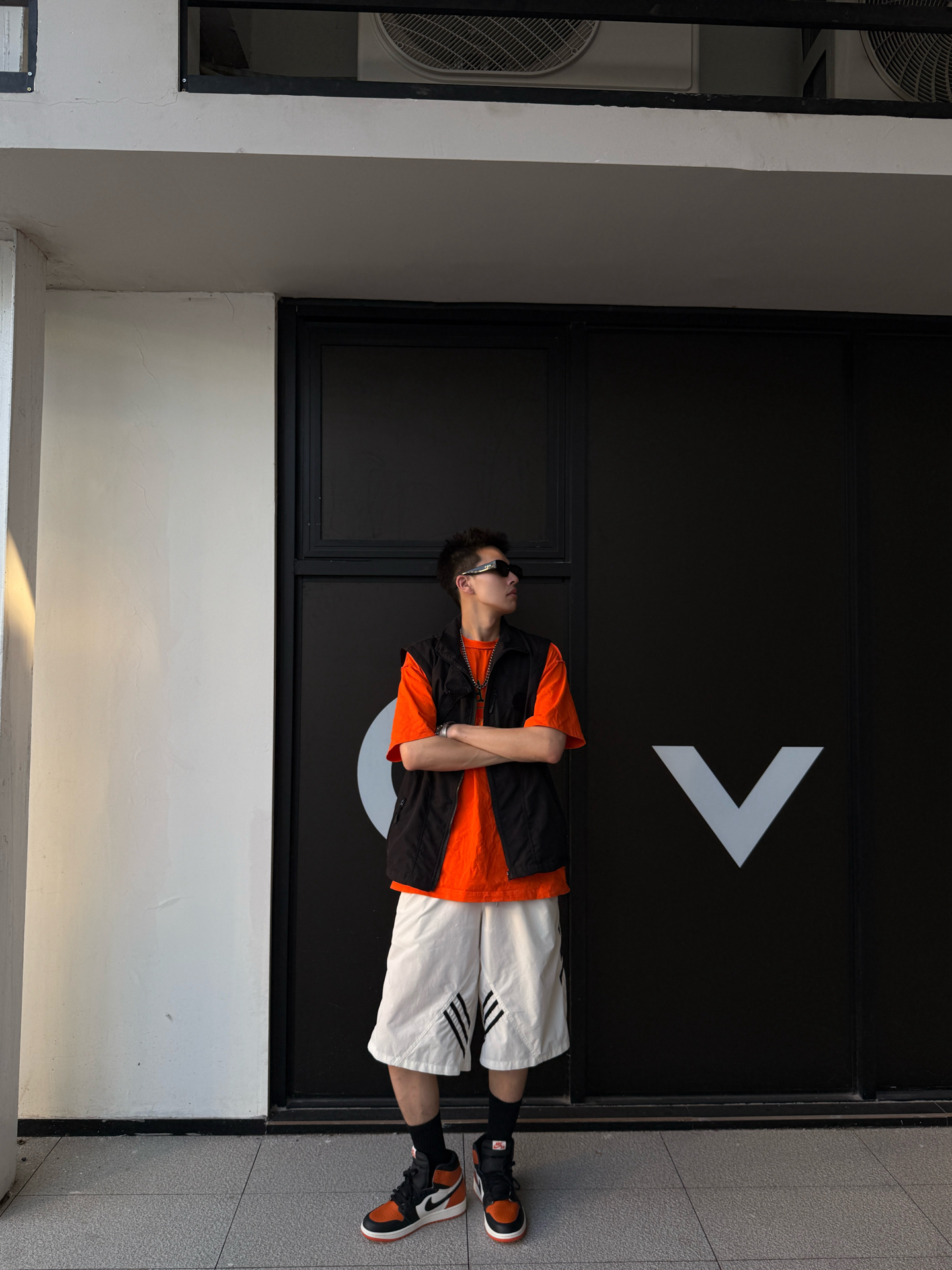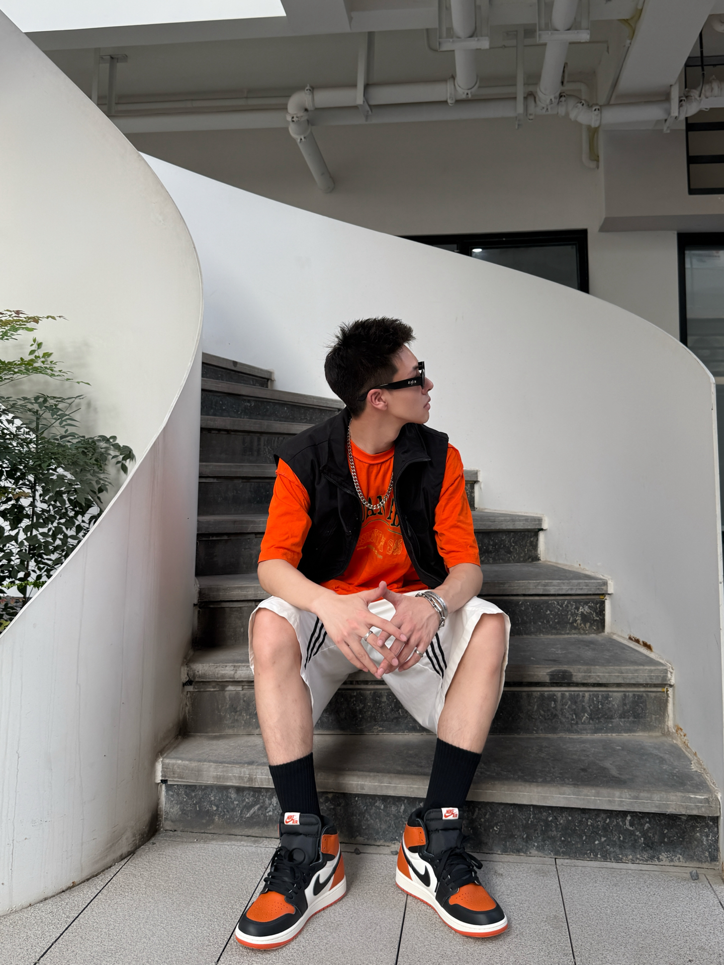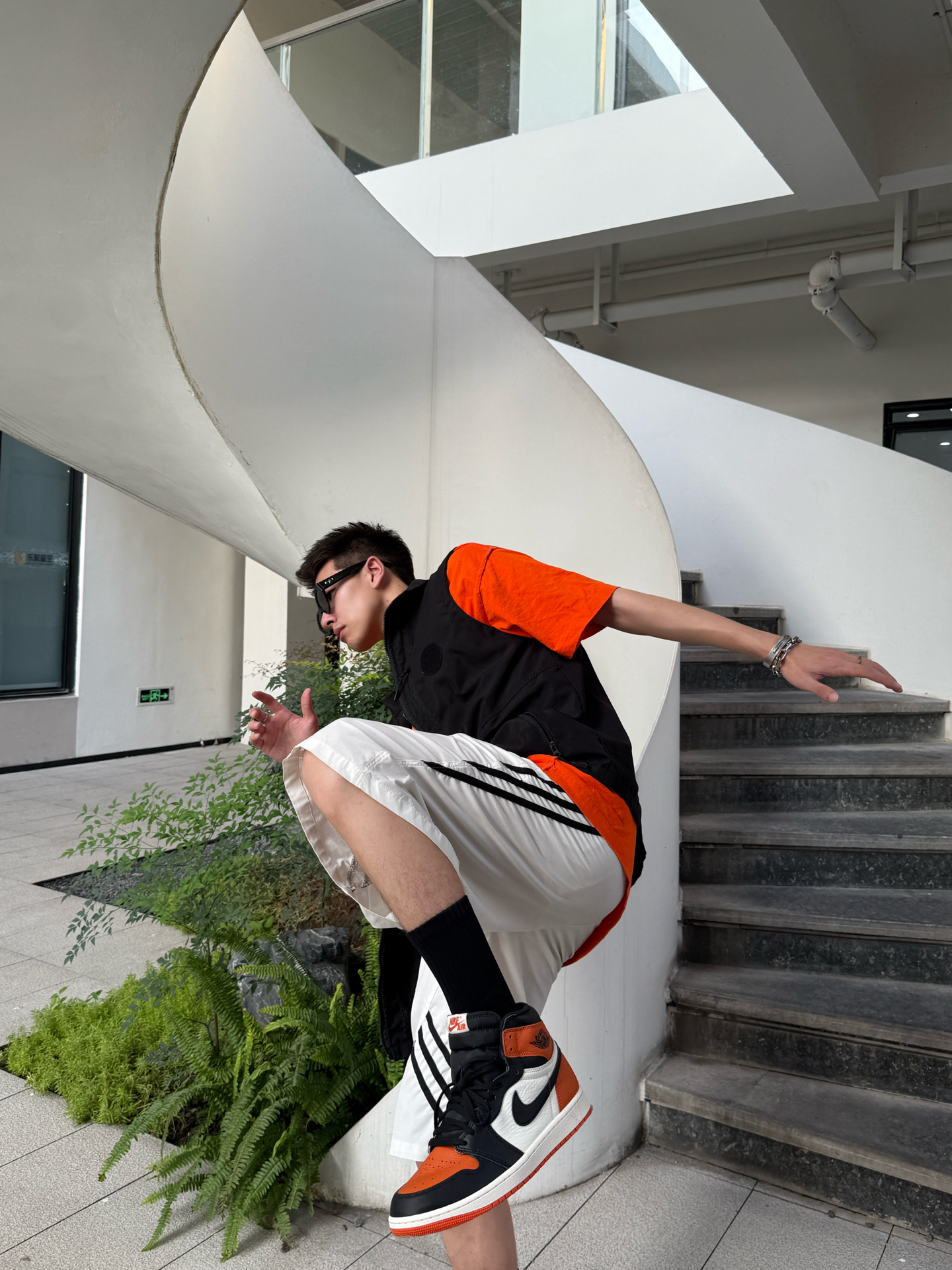 开春想穿得又酷又有记忆点,橙黑撞色是不会出错的选择。 黑机能马甲自带户外滤镜,搭配橙T和白条纹短裤,撞色大胆又吸睛;脚上这双AJ1 High,橙黑配色像把日落的余晖踩在脚下,复古又有辨识度,每一步都像在解构城市的规则。 撞色与复古碰撞,机能与街头混搭,出街不撞款,个性又不刻意。 #潮人的春天来了 #此人鞋商极高 #买双新鞋哄自己上学