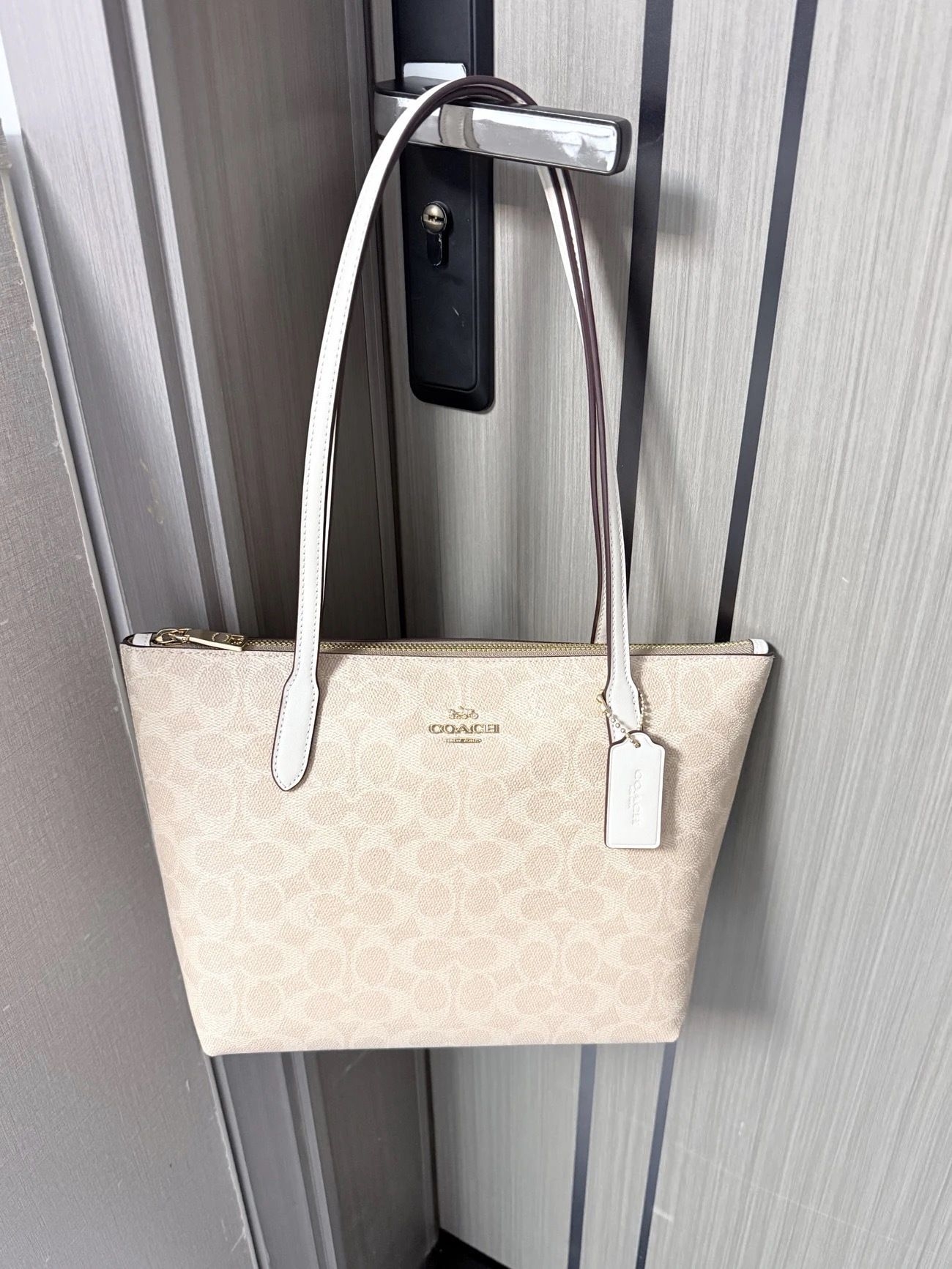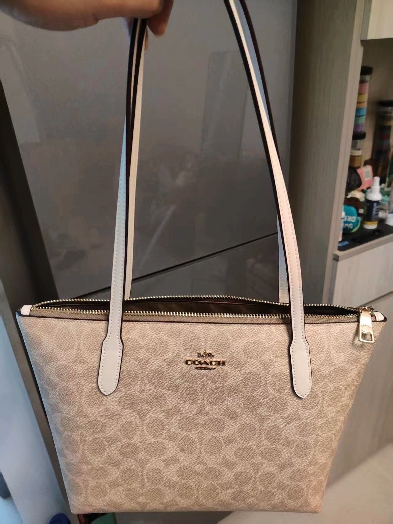 本篇笔记关联了Coach Fiona 24 中号 品牌印花金属Logo帆布拼皮革手提购物袋托特包单肩包 沙黄色拼粉笔白色等商品,为用户提供真实的使用体验和购买参考。