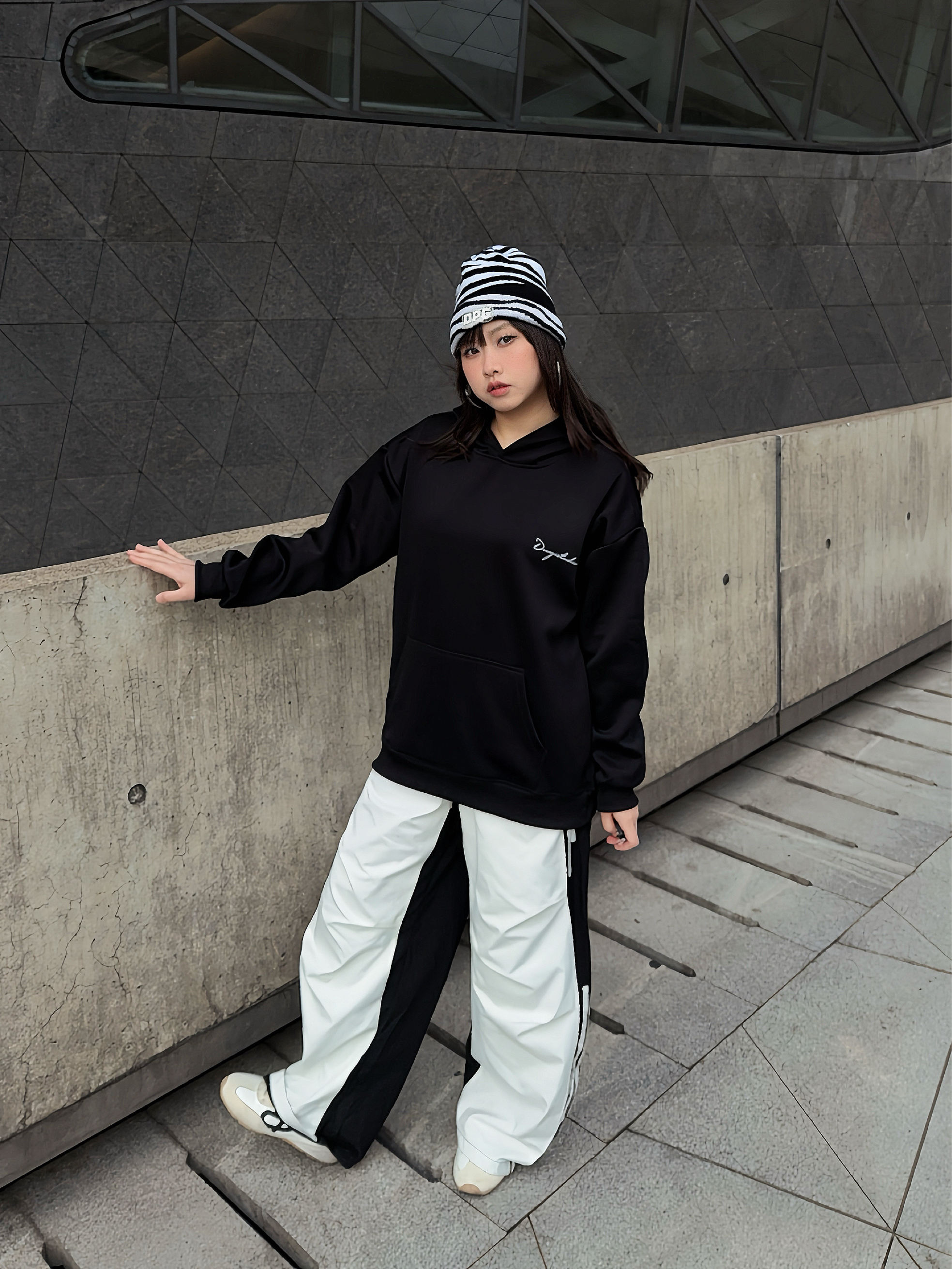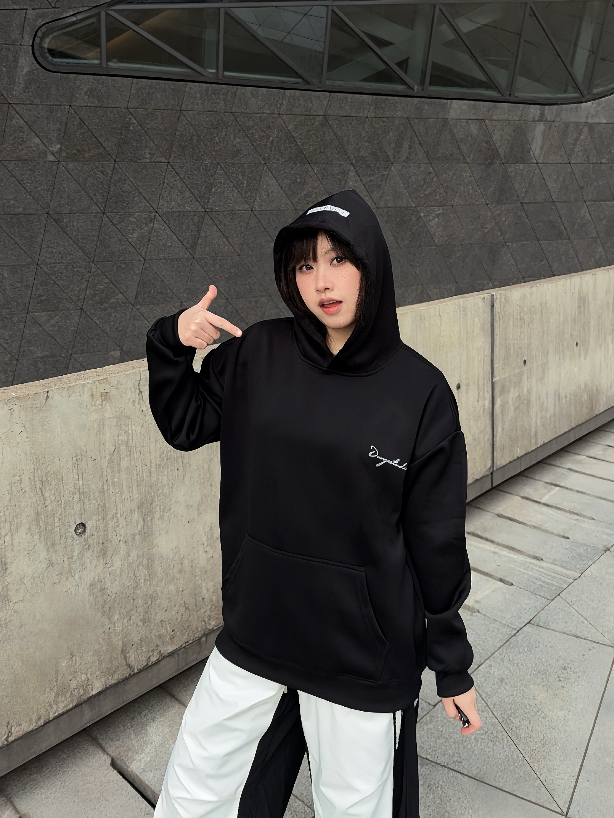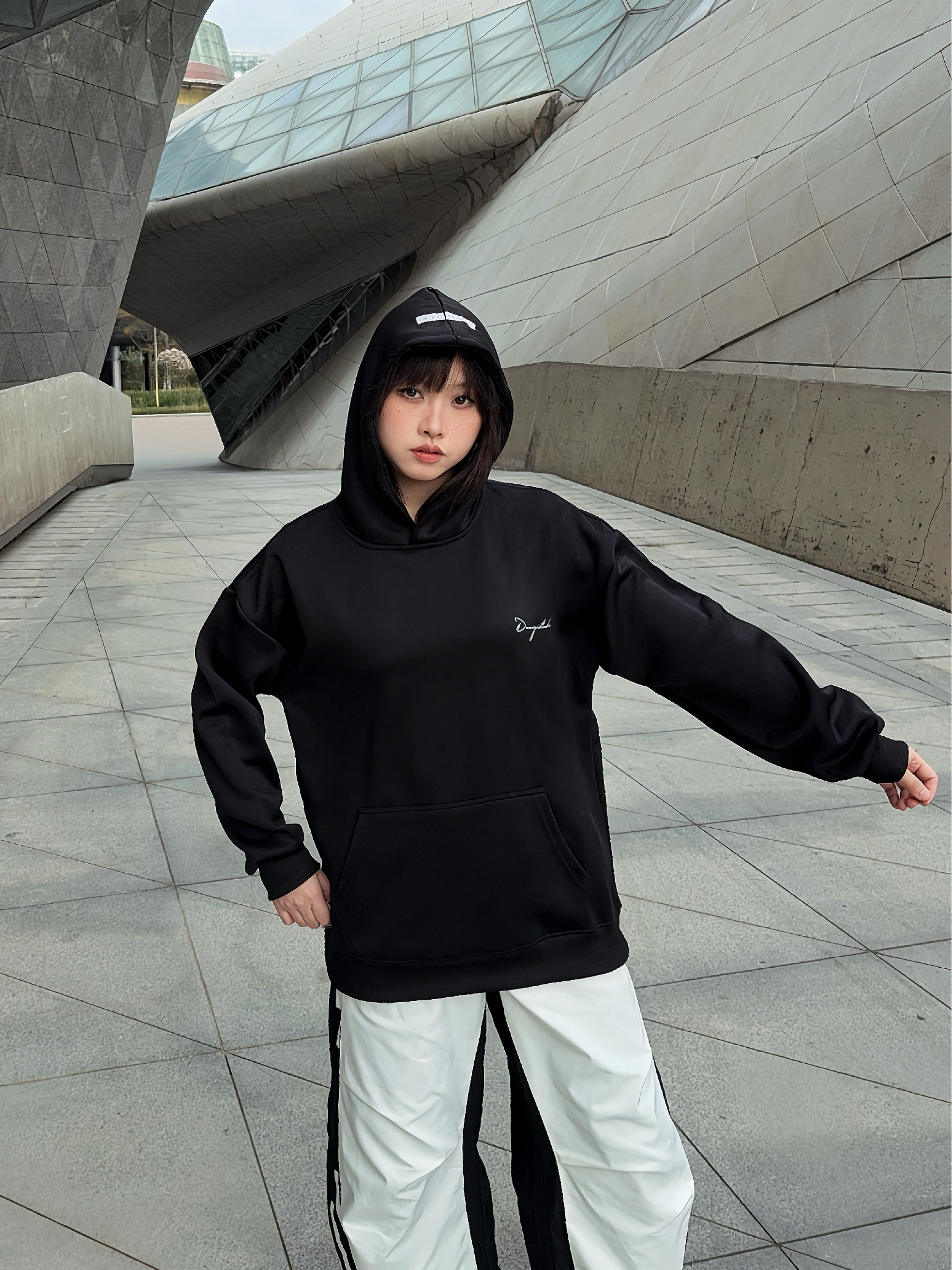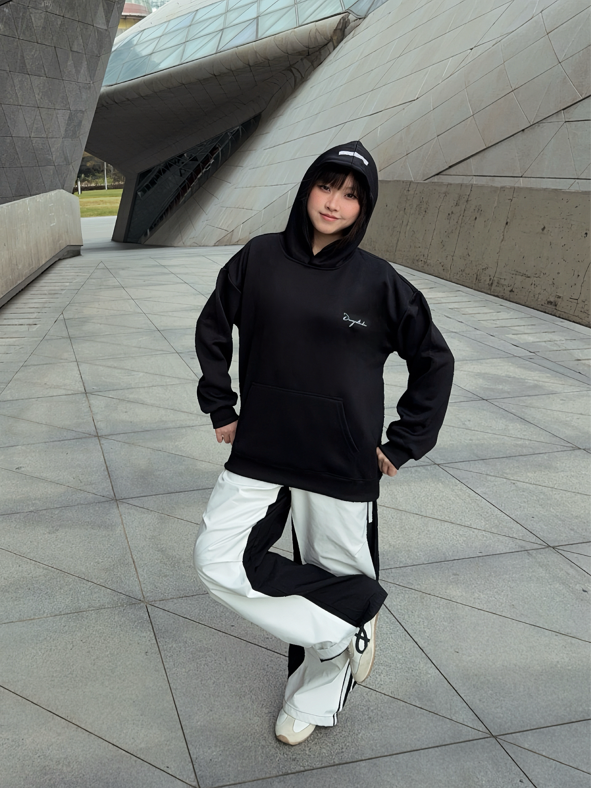 马年户外运动风卫衣穿搭公式 ☑️ Duoyi朵以 美式卫衣搭配拼接工装裤,整个look黑白配色,不挑人穿! 🗝️卫衣的面料很舒服,上身是连帽版型,松弛感满分,前后的字母印花也主打一个设计感,日常搭配起来嘎嘎好看