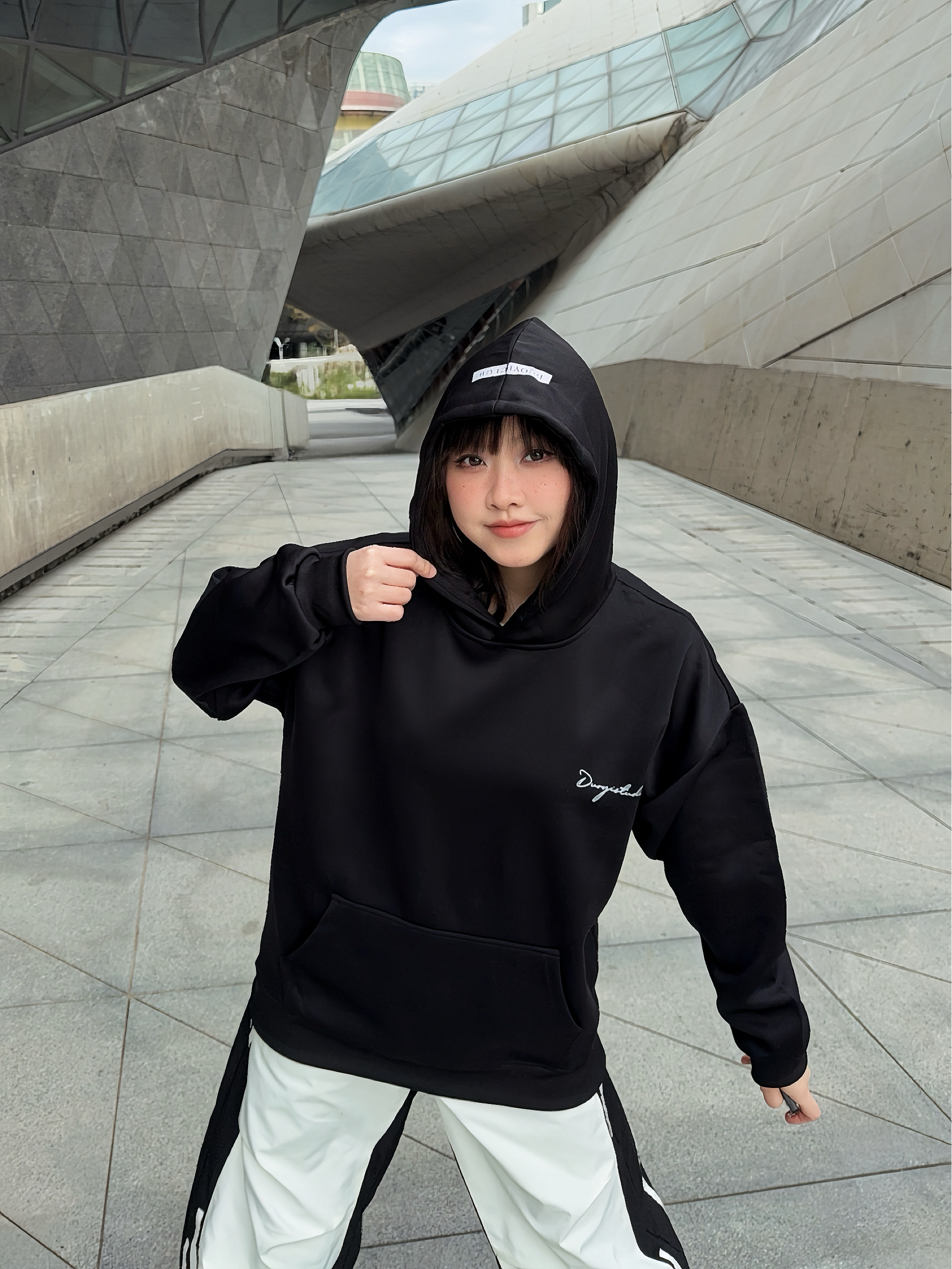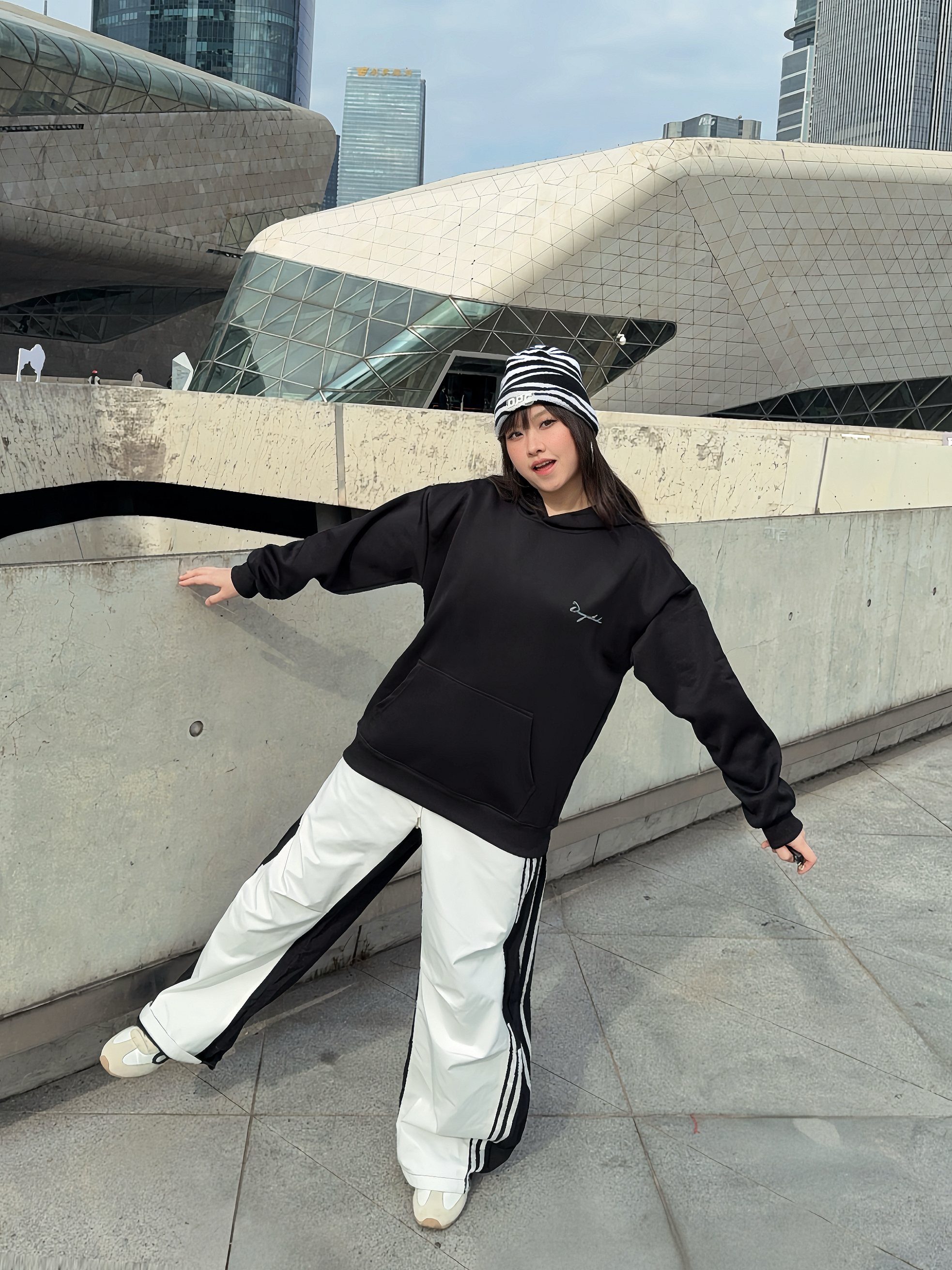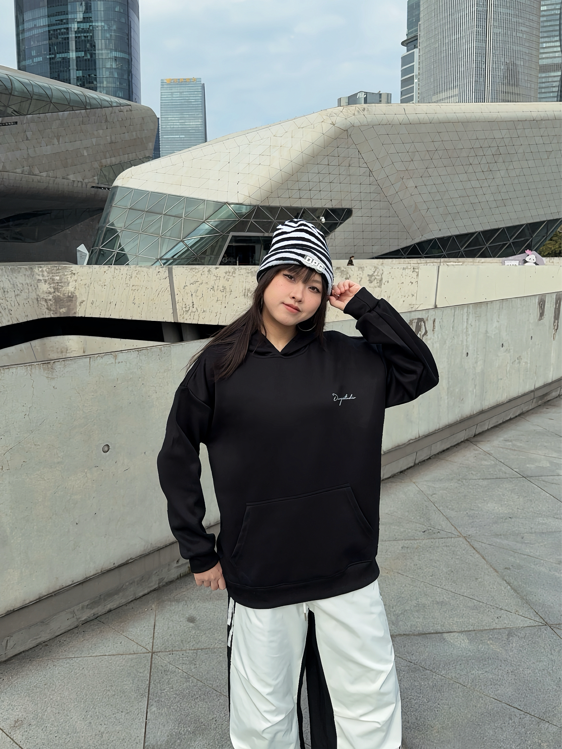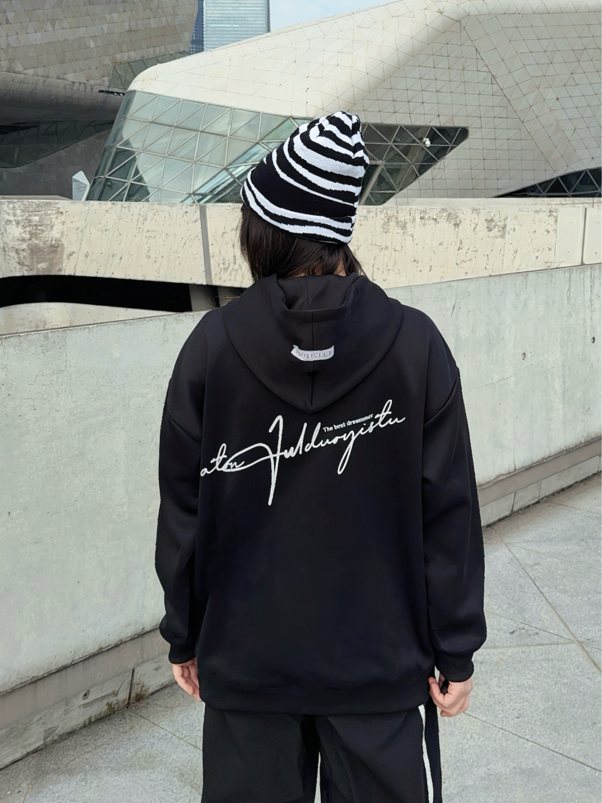 马年户外运动风卫衣穿搭公式 ☑️ Duoyi朵以 美式卫衣搭配拼接工装裤,整个look黑白配色,不挑人穿! 🗝️卫衣的面料很舒服,上身是连帽版型,松弛感满分,前后的字母印花也主打一个设计感,日常搭配起来嘎嘎好看