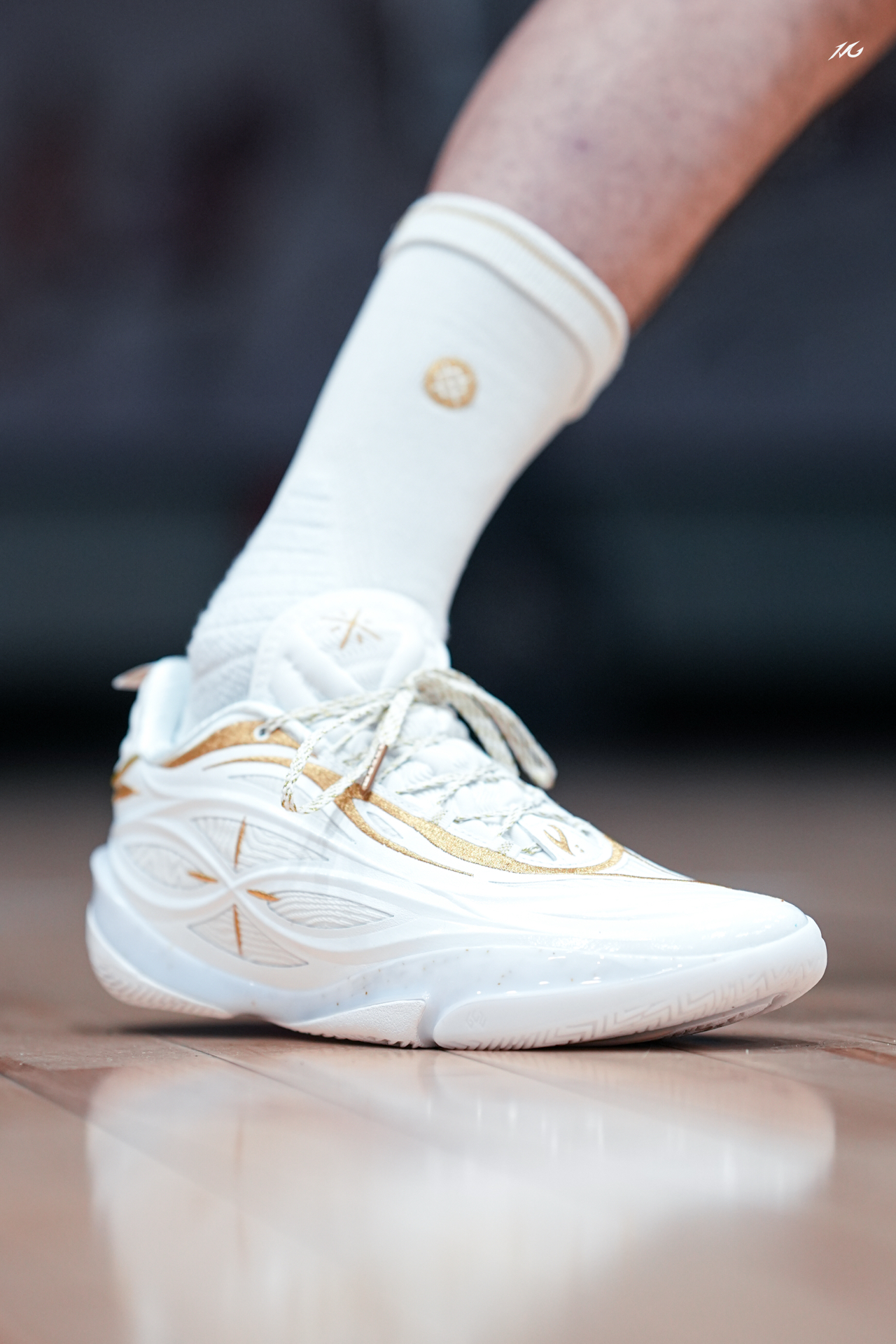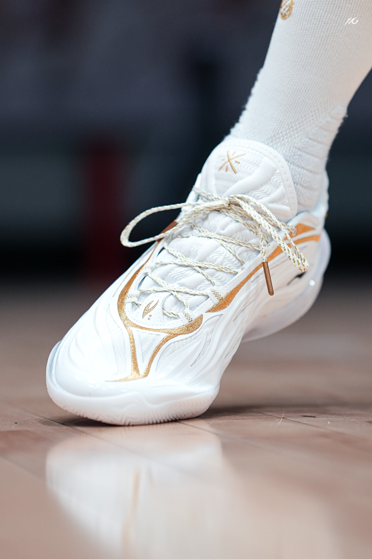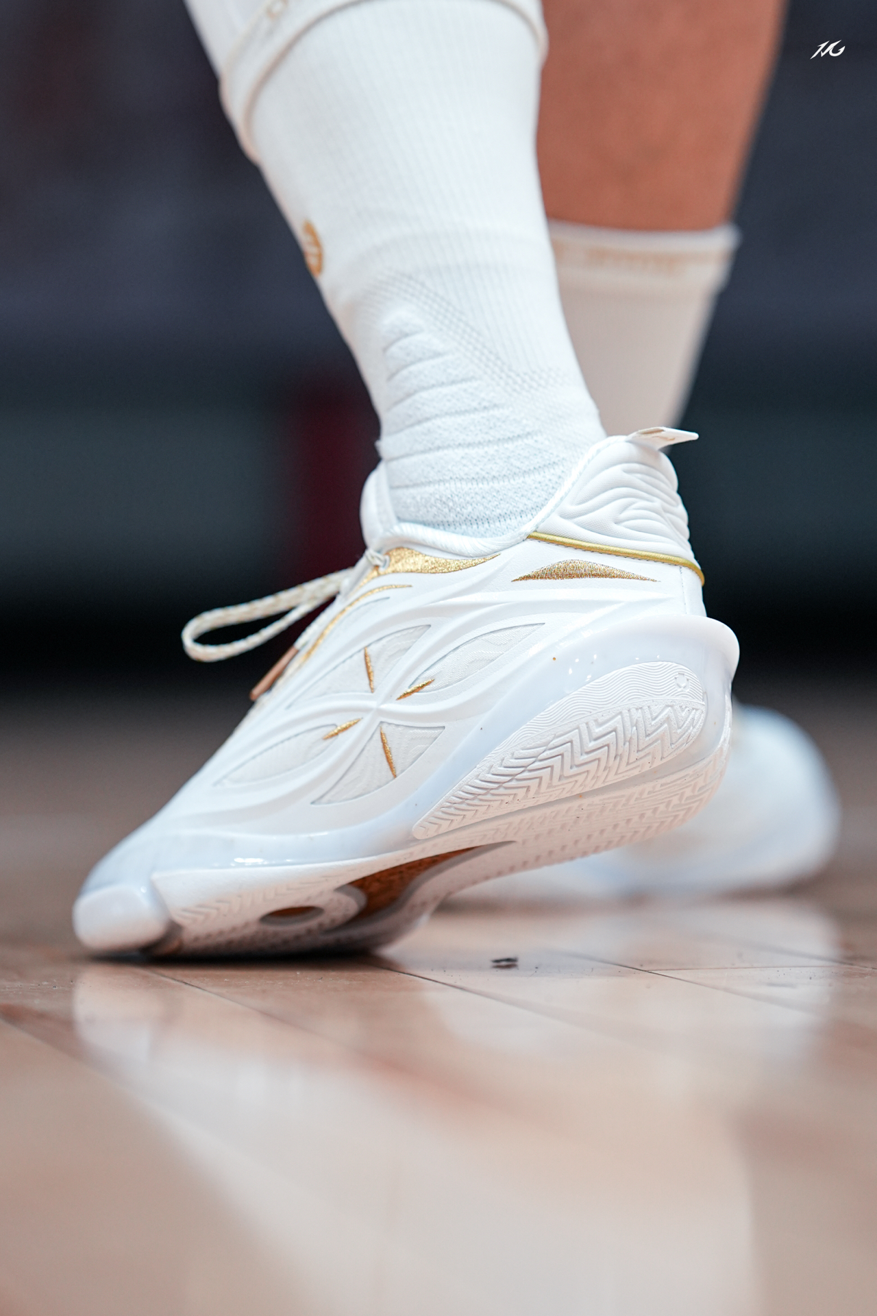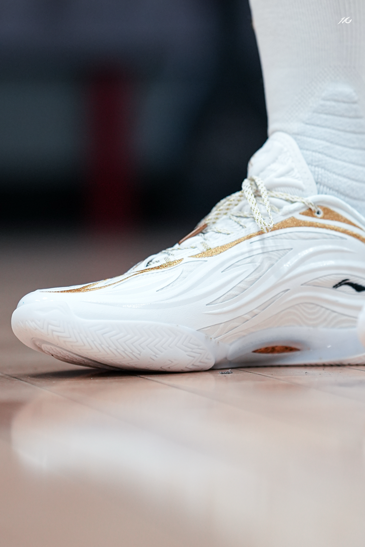 今日上脚这双808 5ULTRAV2的流金配色! 鞋底的金色碳板是非常耀眼的,鞋身也是白色为主金色线条勾勒,这类配色我老觉得荣耀感拉满,多用来做冠军配色哦! 这双鞋我还是体验了不少配色,反正就是说脚感确实软弹的很爽,但也会让大多人觉得过软而拖沓了,此外就是尺码瘦脚一定要选小半码最好! #红包到手球鞋就有 #8085UltraV2白金配色