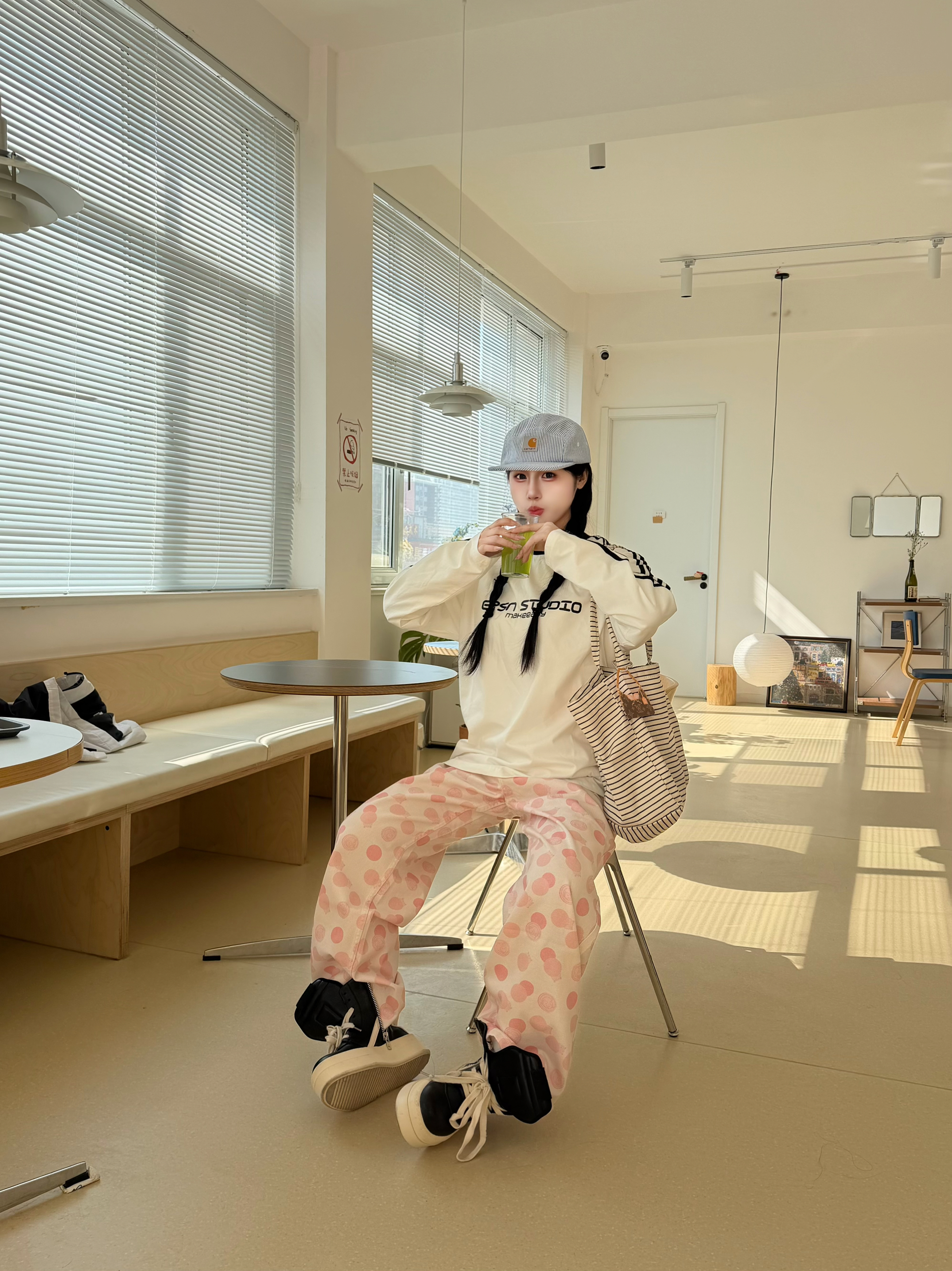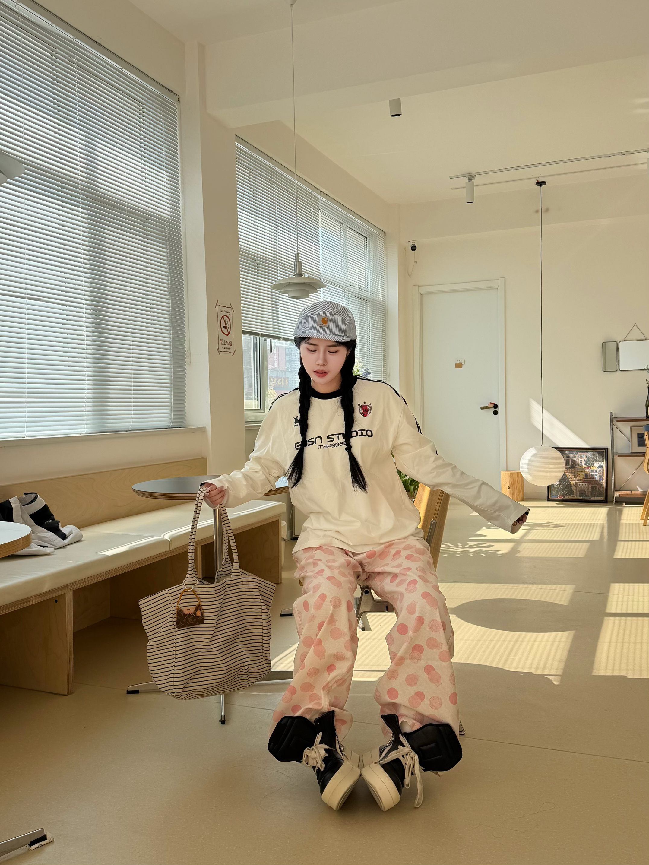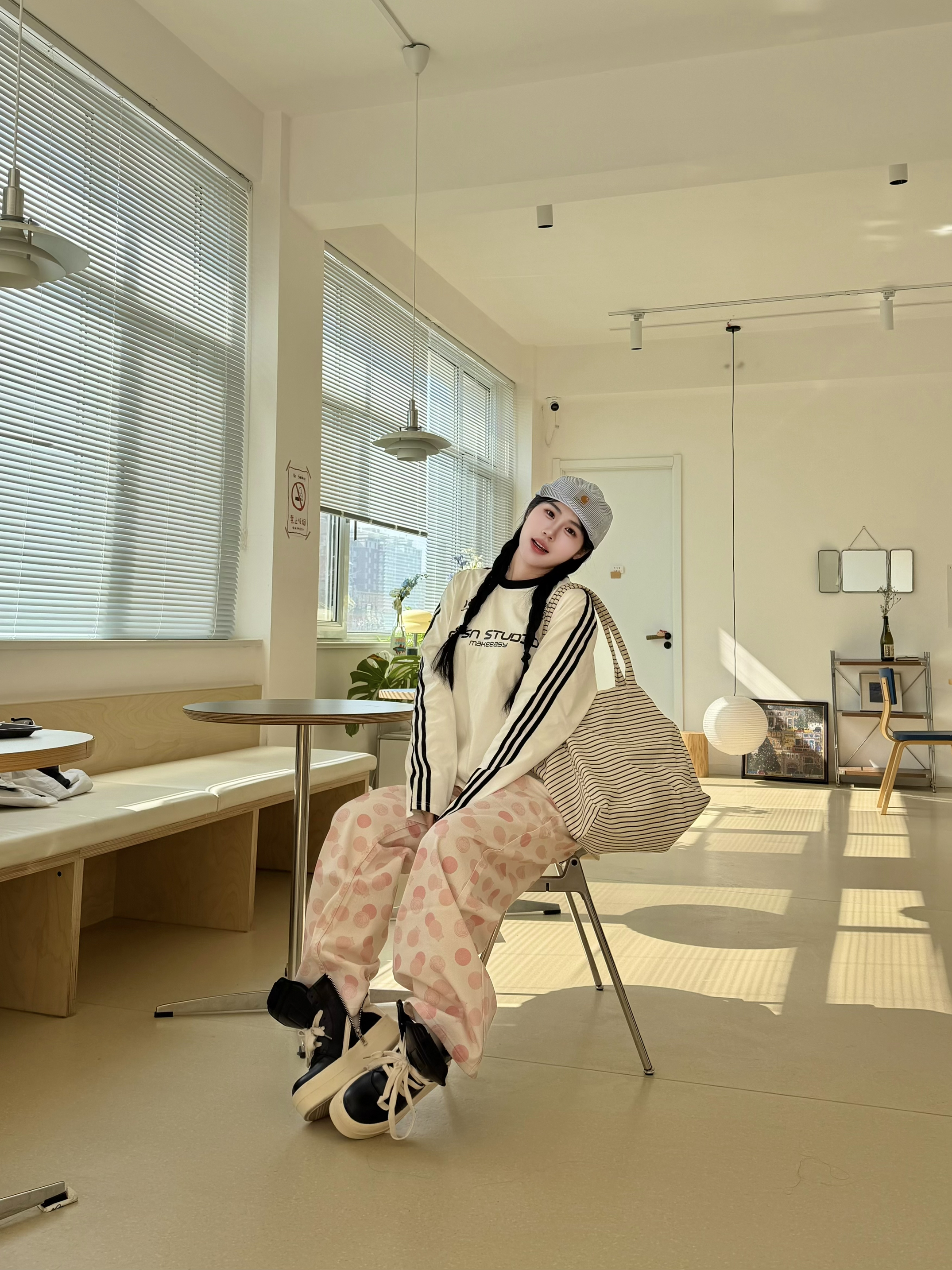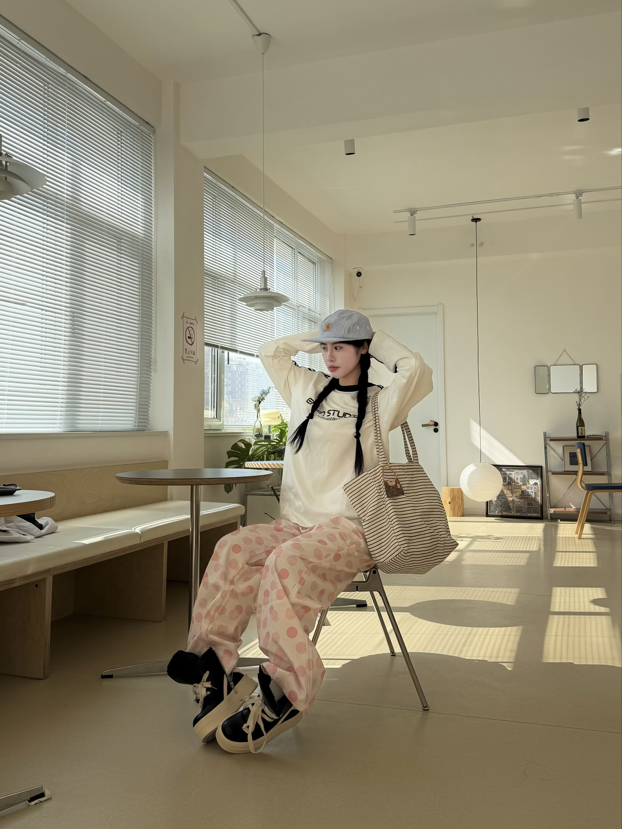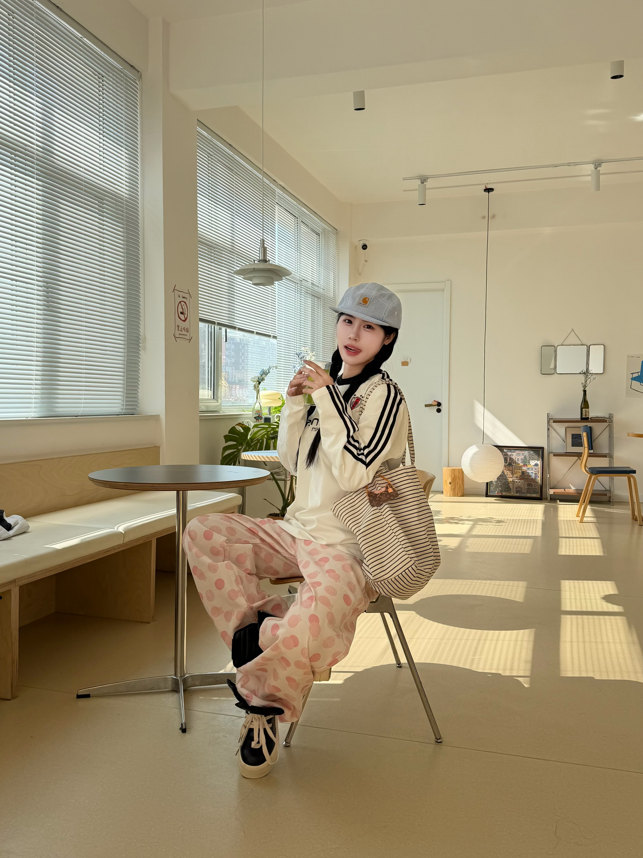 今天分享韩系入春穿搭 👔上衣穿了简约白T 条纹设计高级感满满 👖搭配粉色休闲裤少女感满满 双麻花辫➕棒球帽🧢就很韩 春日氛围感穿搭你学会了吗