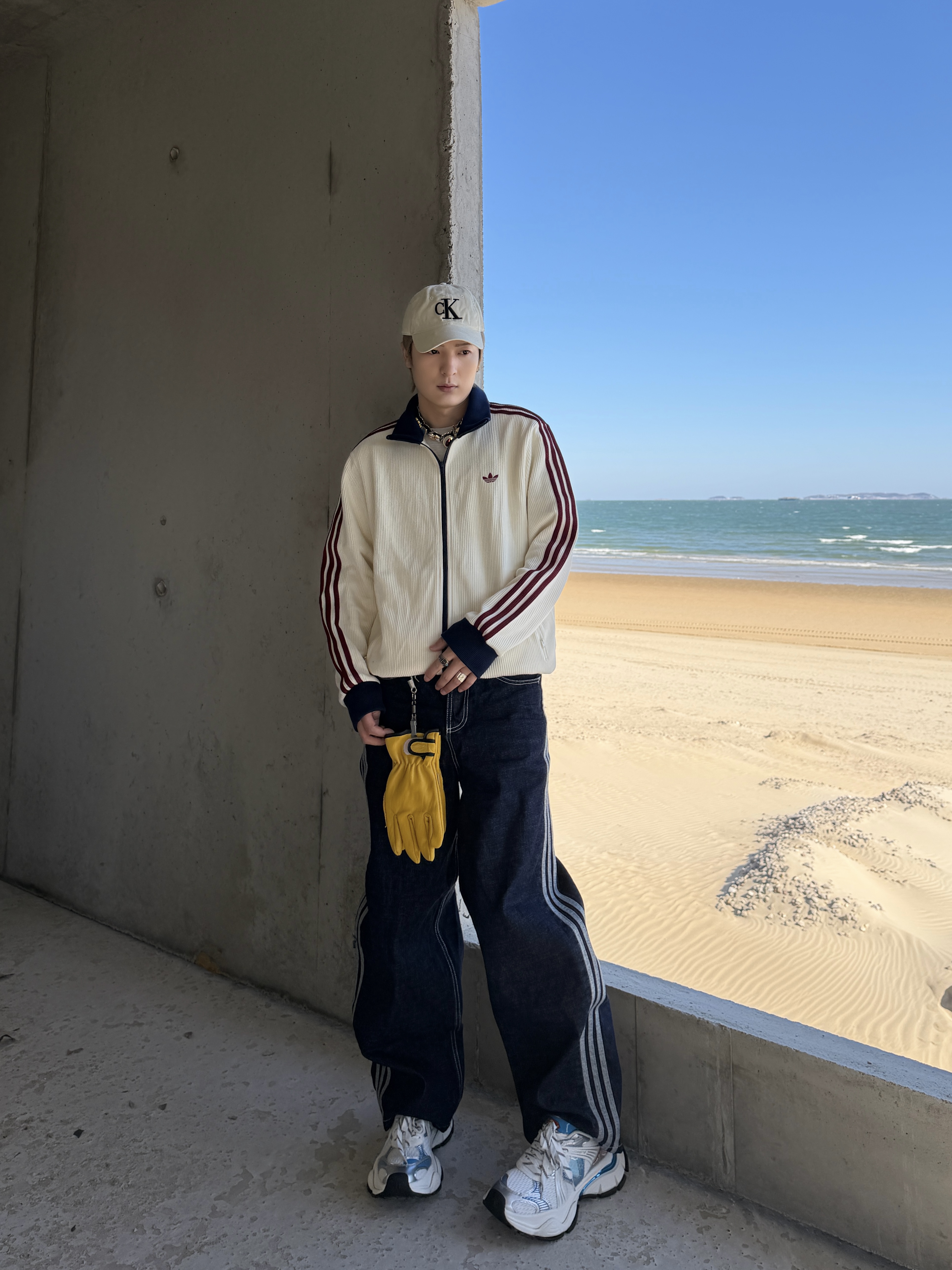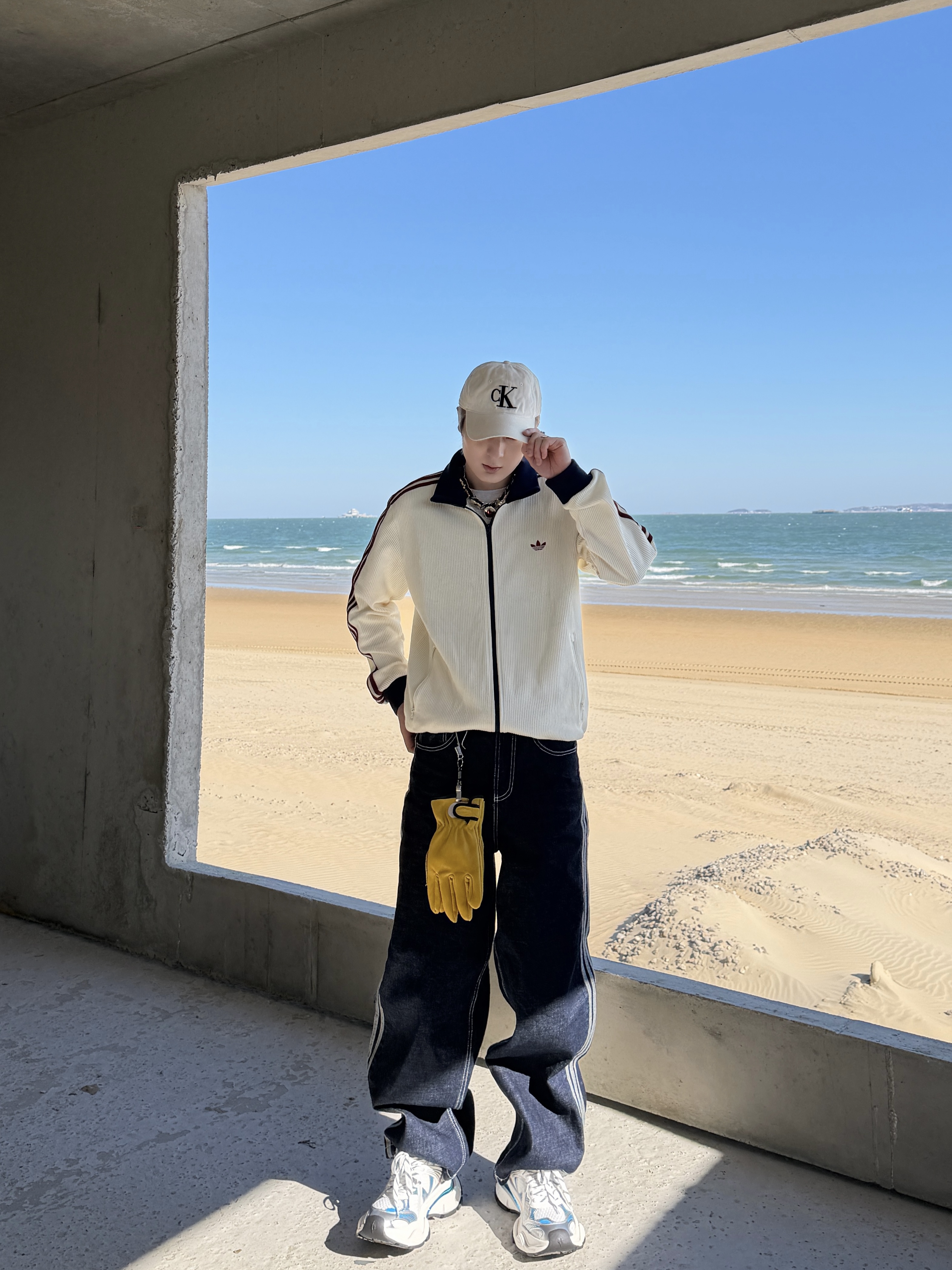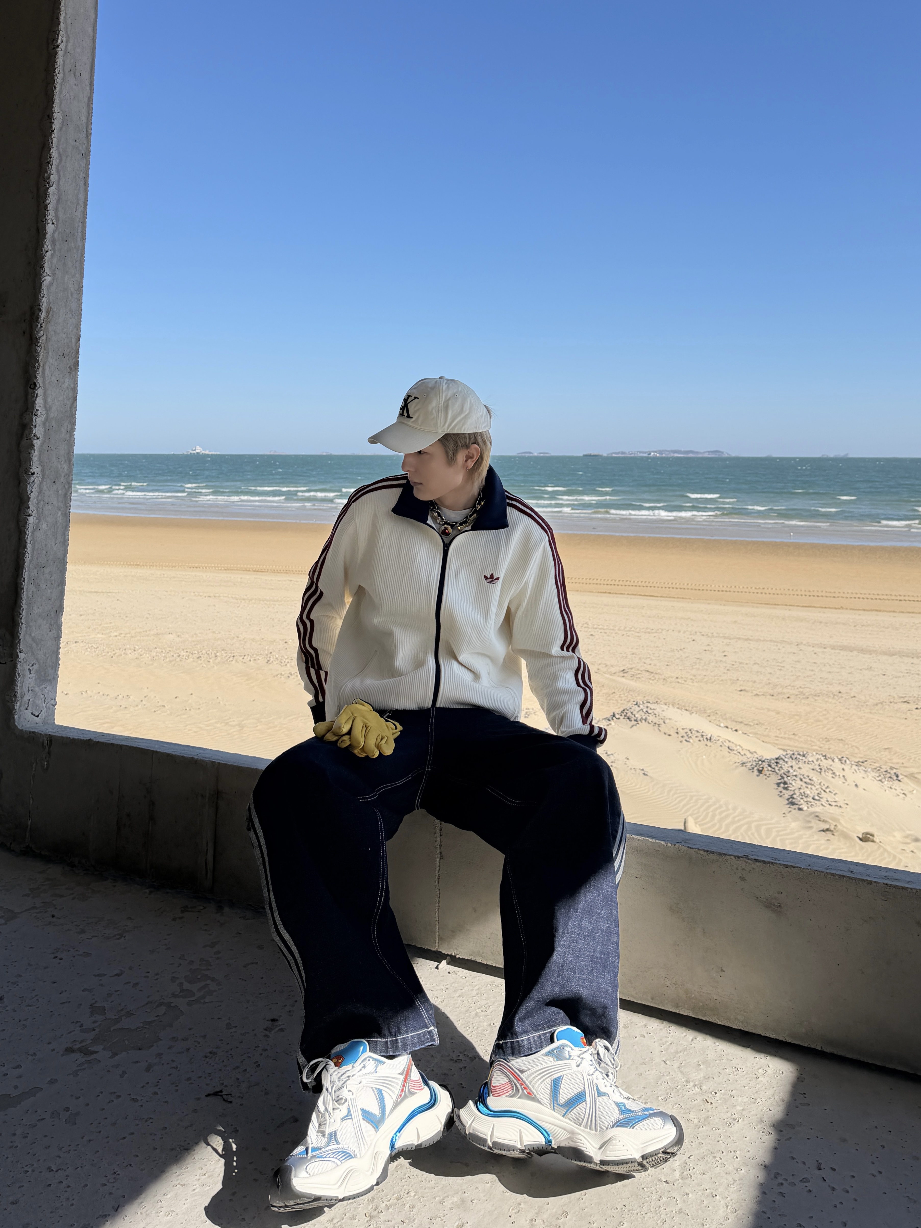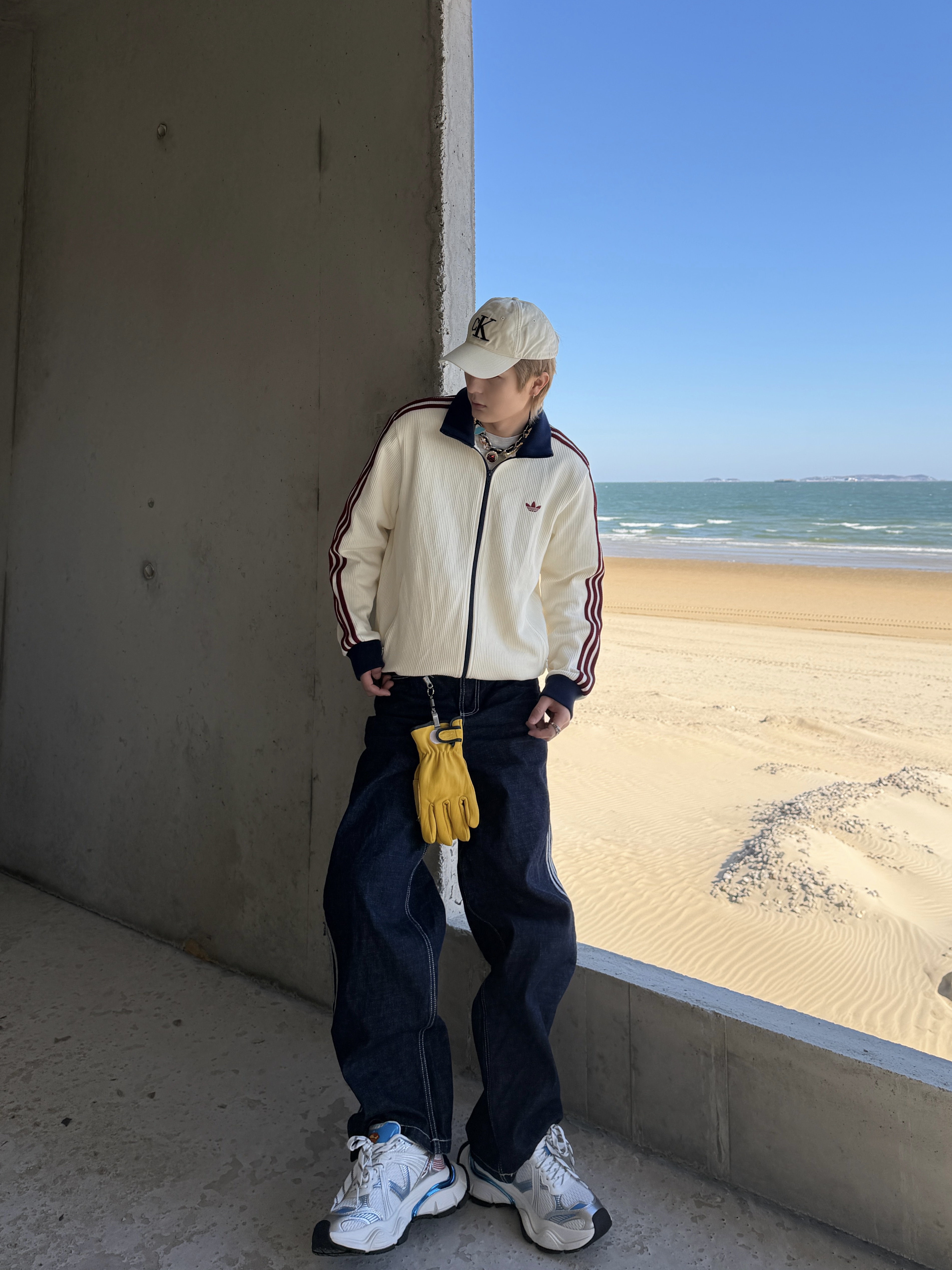 早春去海边我穿华夫格子外套 衣领拼接的色彩搭配显得格外俏皮 下装搭配一条直通原色牛仔可以跟衣领很好的呼应 脚踩 DxVESSEL 超人联名老爹鞋蓝白的碰撞色彩在这海边格外耀眼 厚底宽边的设计走起路来也不崴脚 最后腰间配手套来点缀氛围感十足