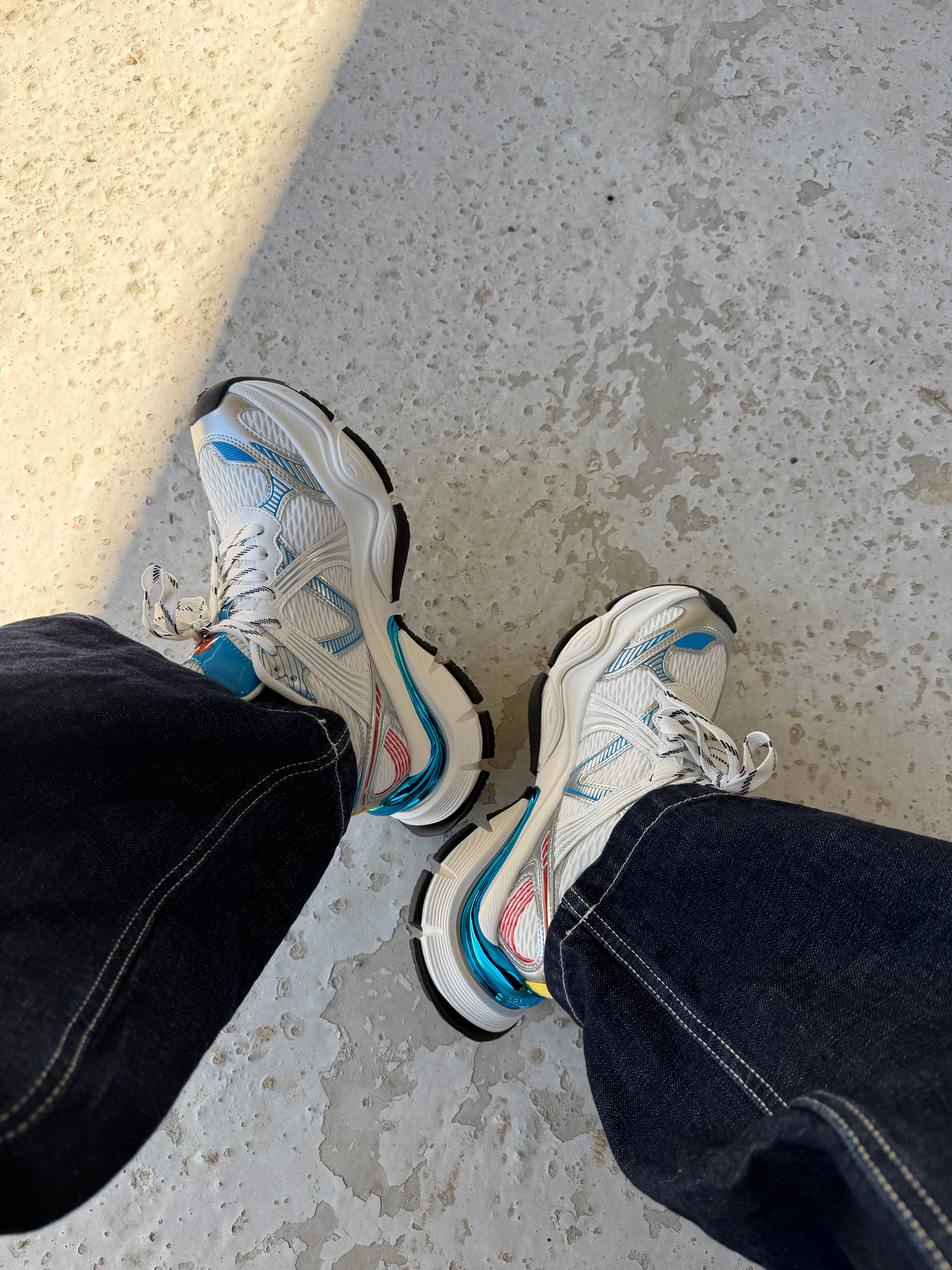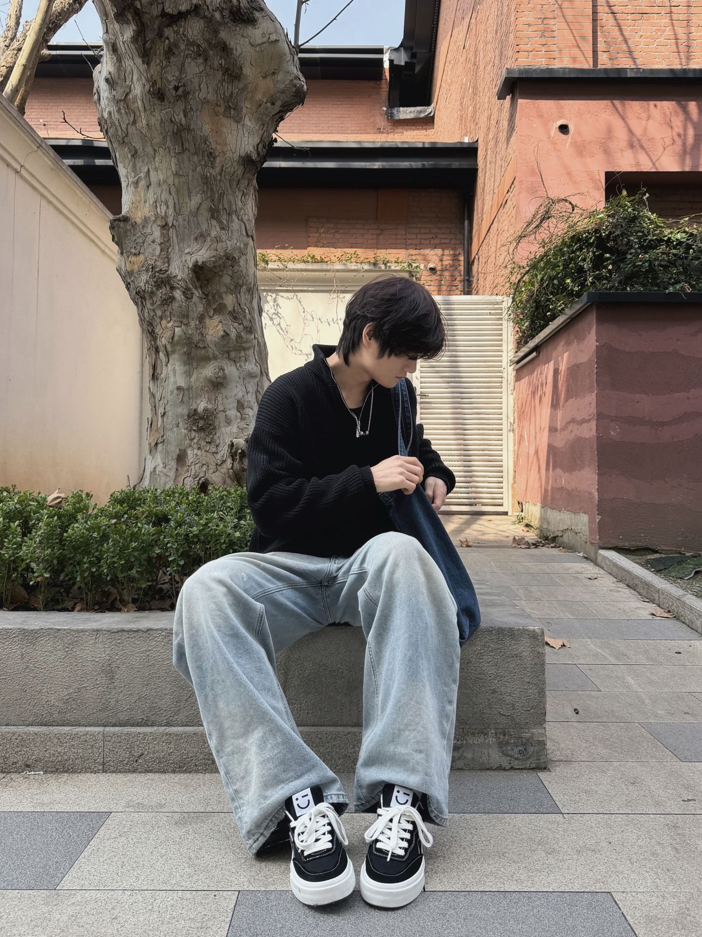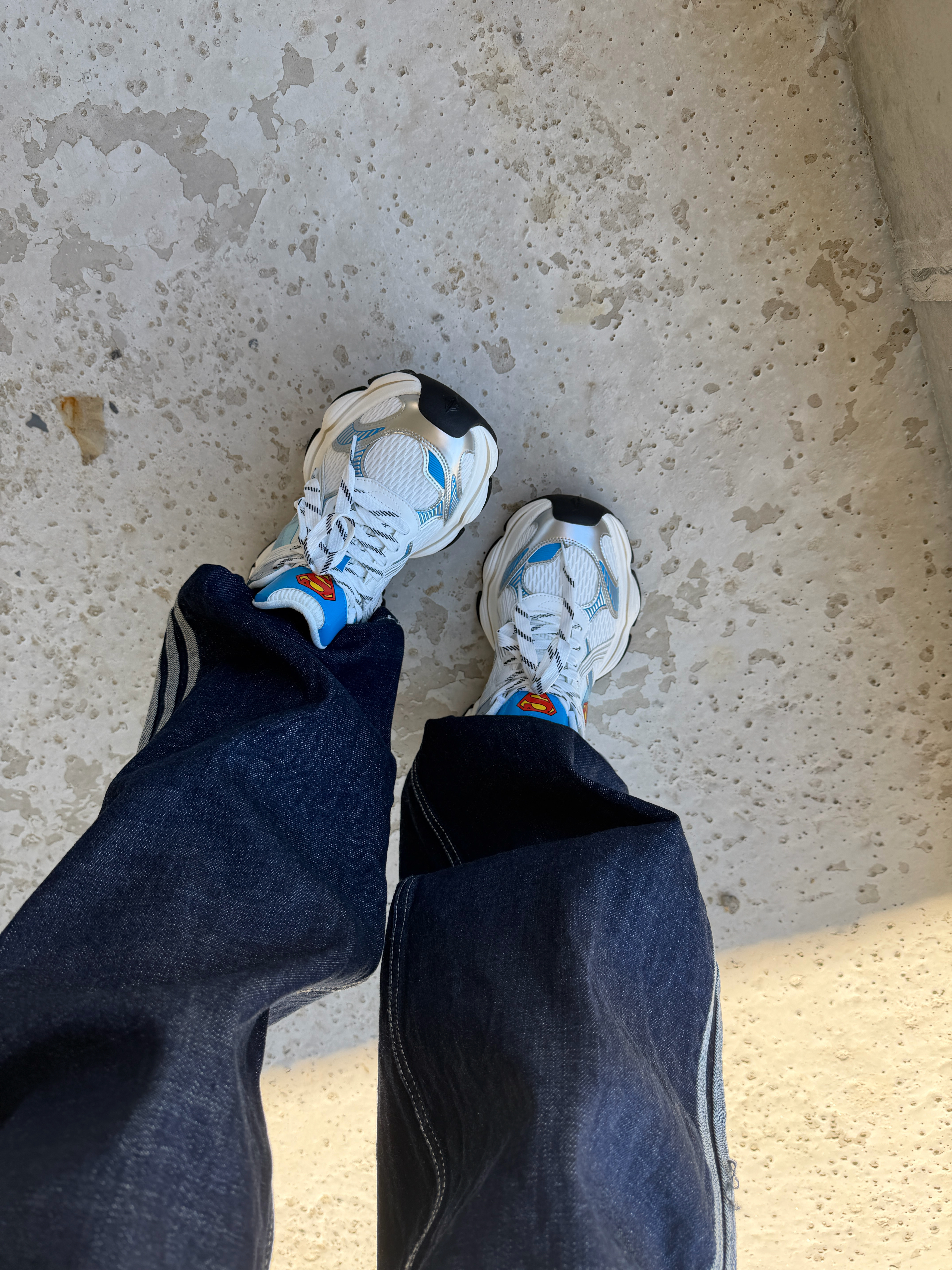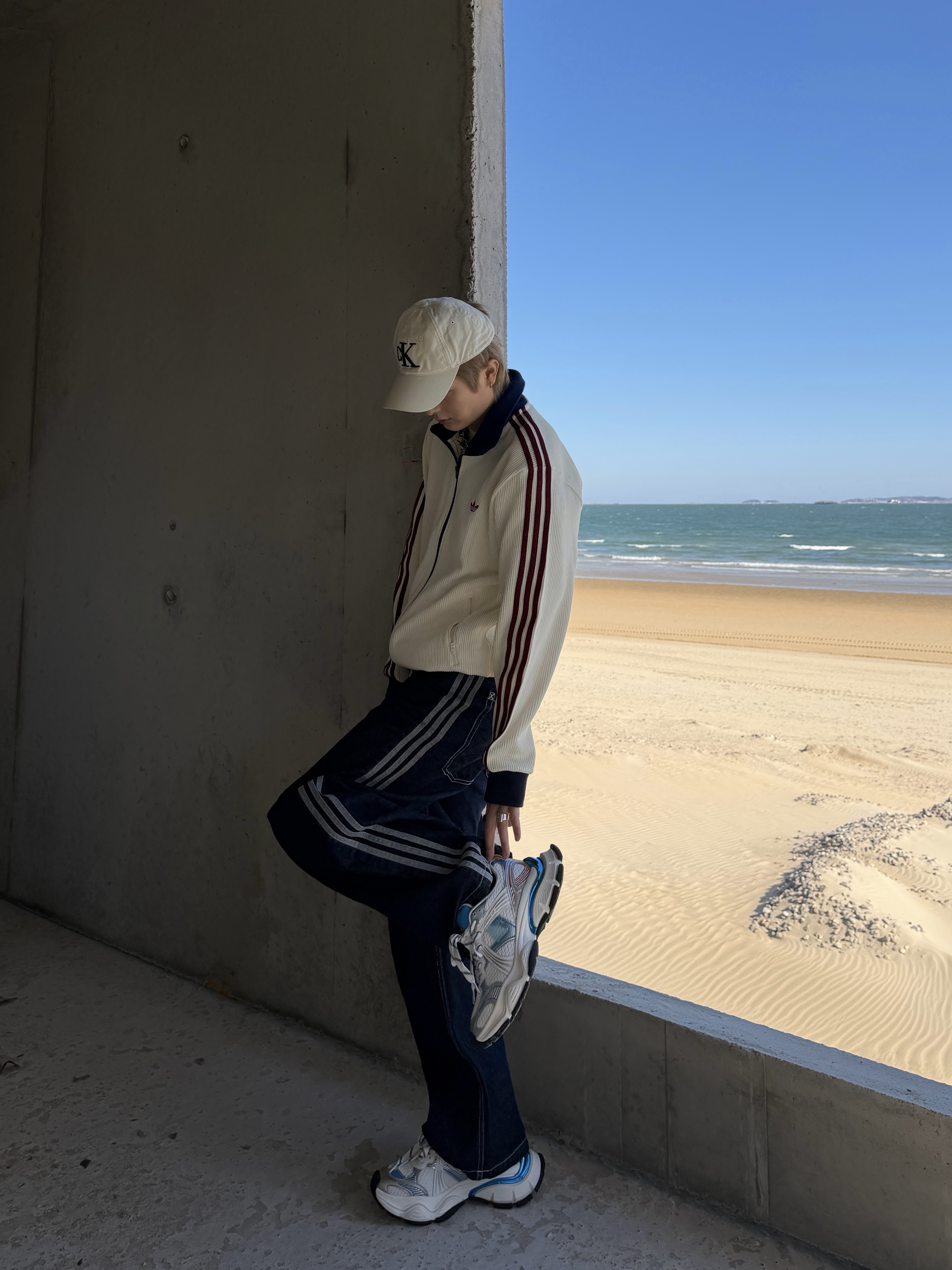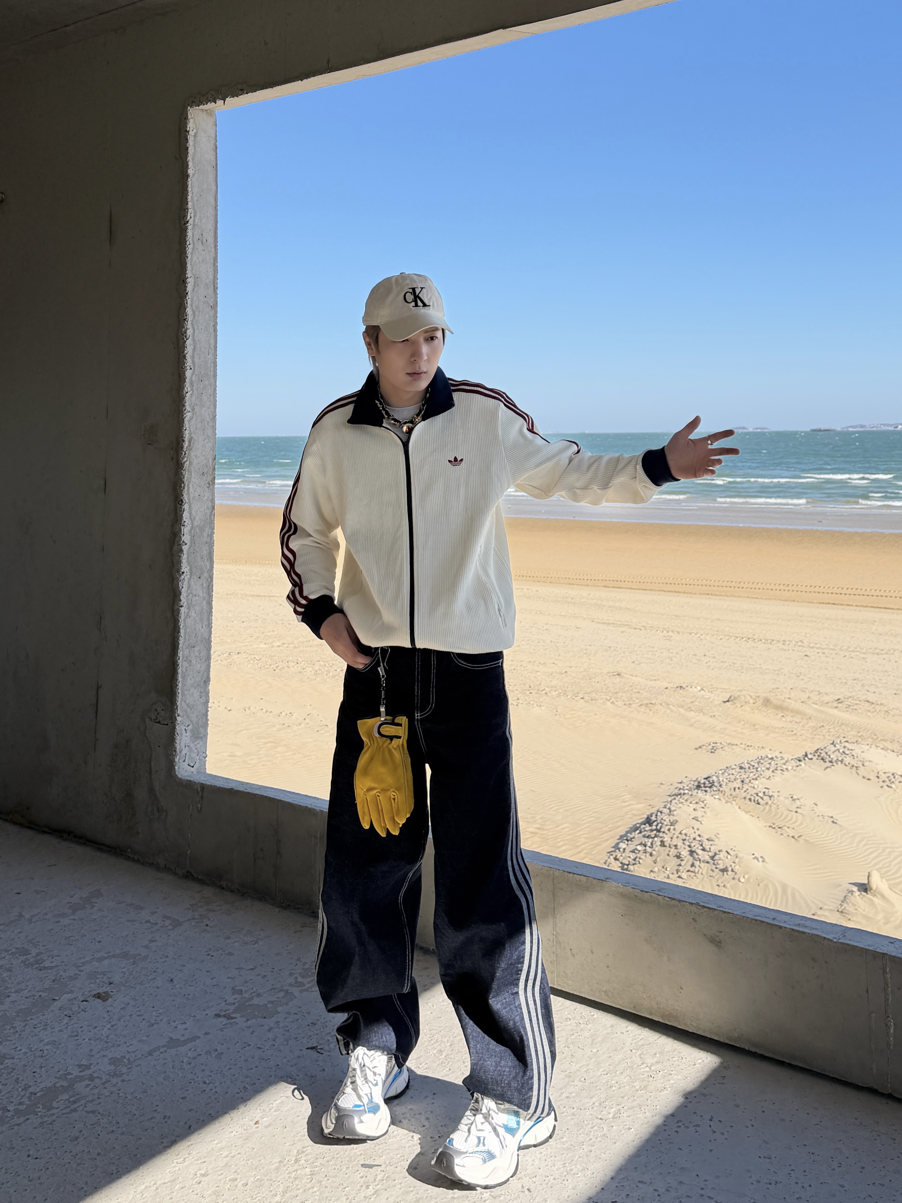 早春去海边我穿华夫格子外套 衣领拼接的色彩搭配显得格外俏皮 下装搭配一条直通原色牛仔可以跟衣领很好的呼应 脚踩 DxVESSEL 超人联名老爹鞋蓝白的碰撞色彩在这海边格外耀眼 厚底宽边的设计走起路来也不崴脚 最后腰间配手套来点缀氛围感十足