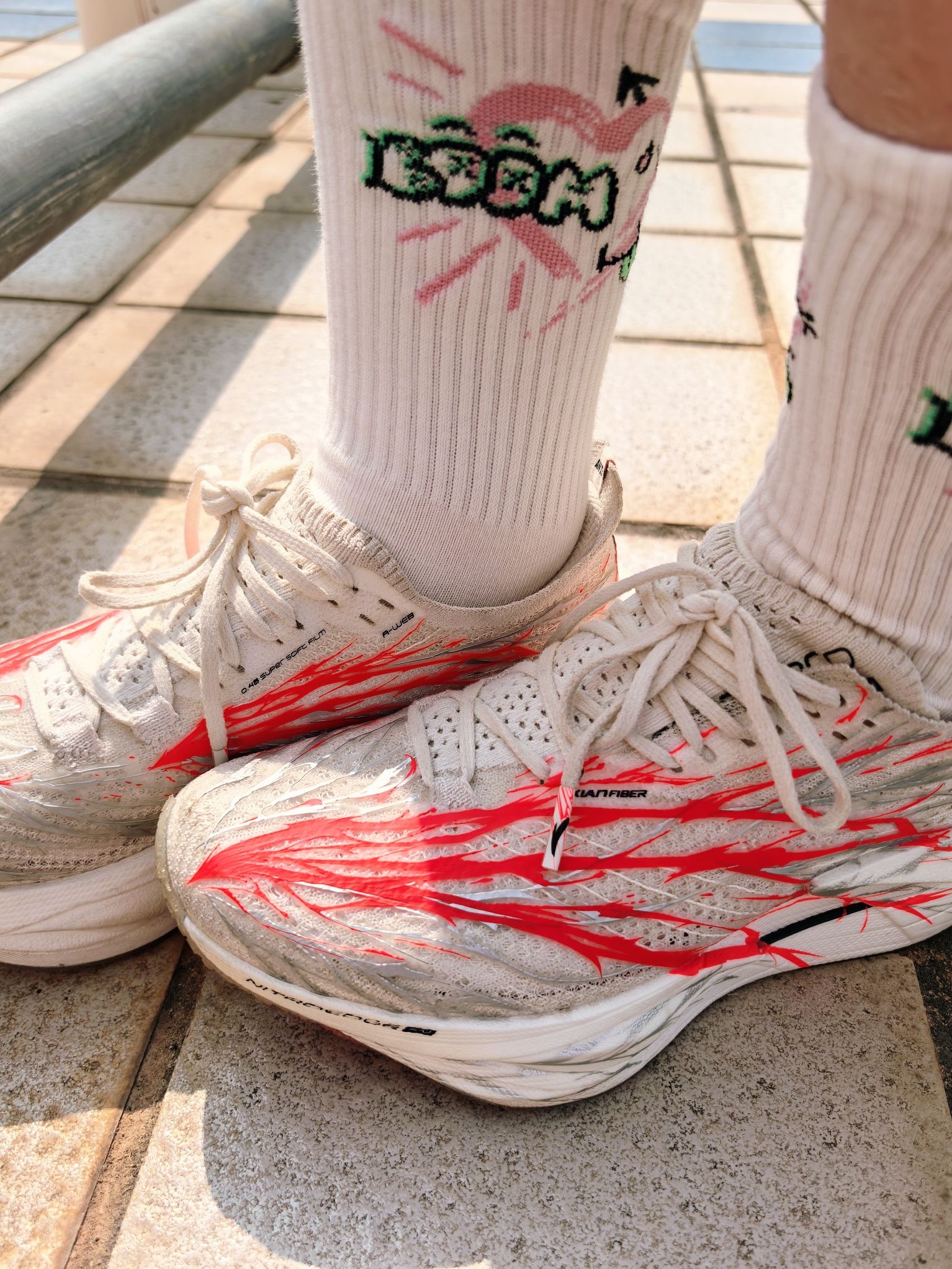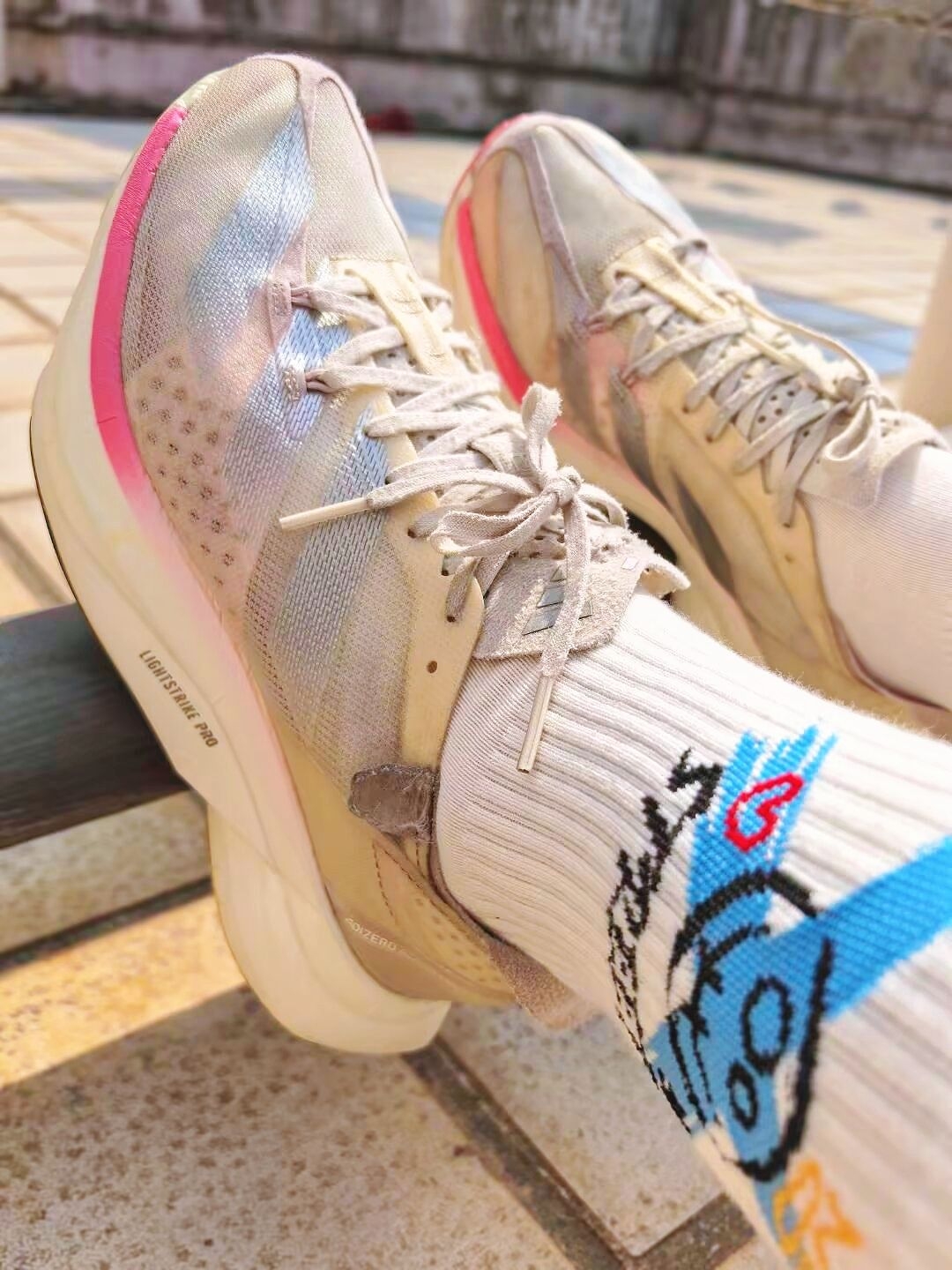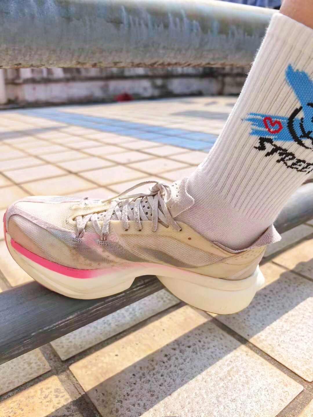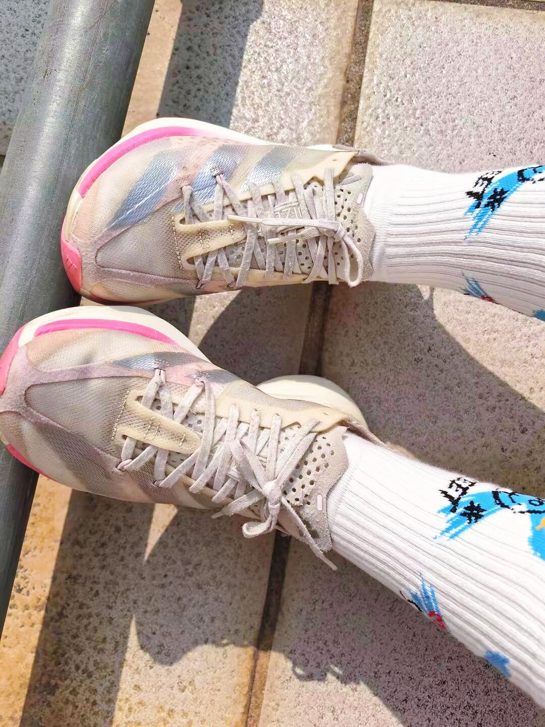同款的校服,不同的穿搭,可以让日常的校园生活变得多姿多彩! 粉色的阿迪本身就打破沉闷的色系,蓝色的涂鸦袜,张扬又有个性! 加厚的中低,助推力真的非常好,日常出街通勤也不会对脚有任何累脚! 袜子的吸汗力真的很强,跑步不会汗脚!