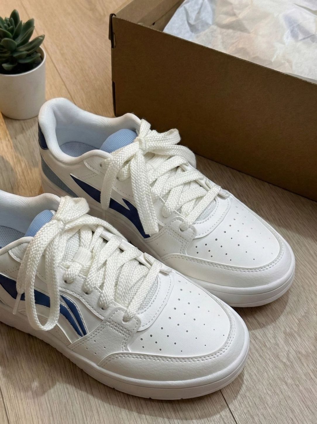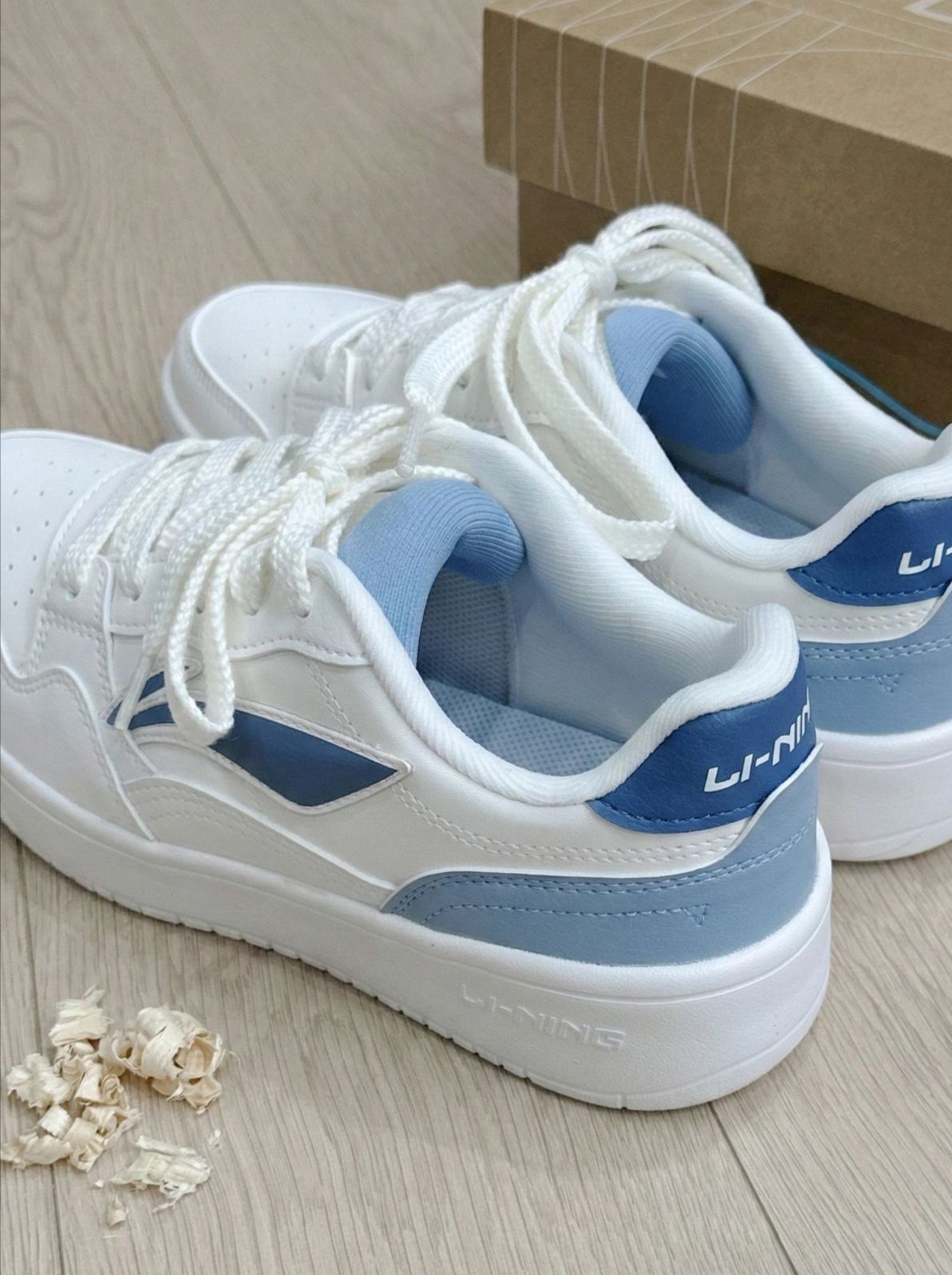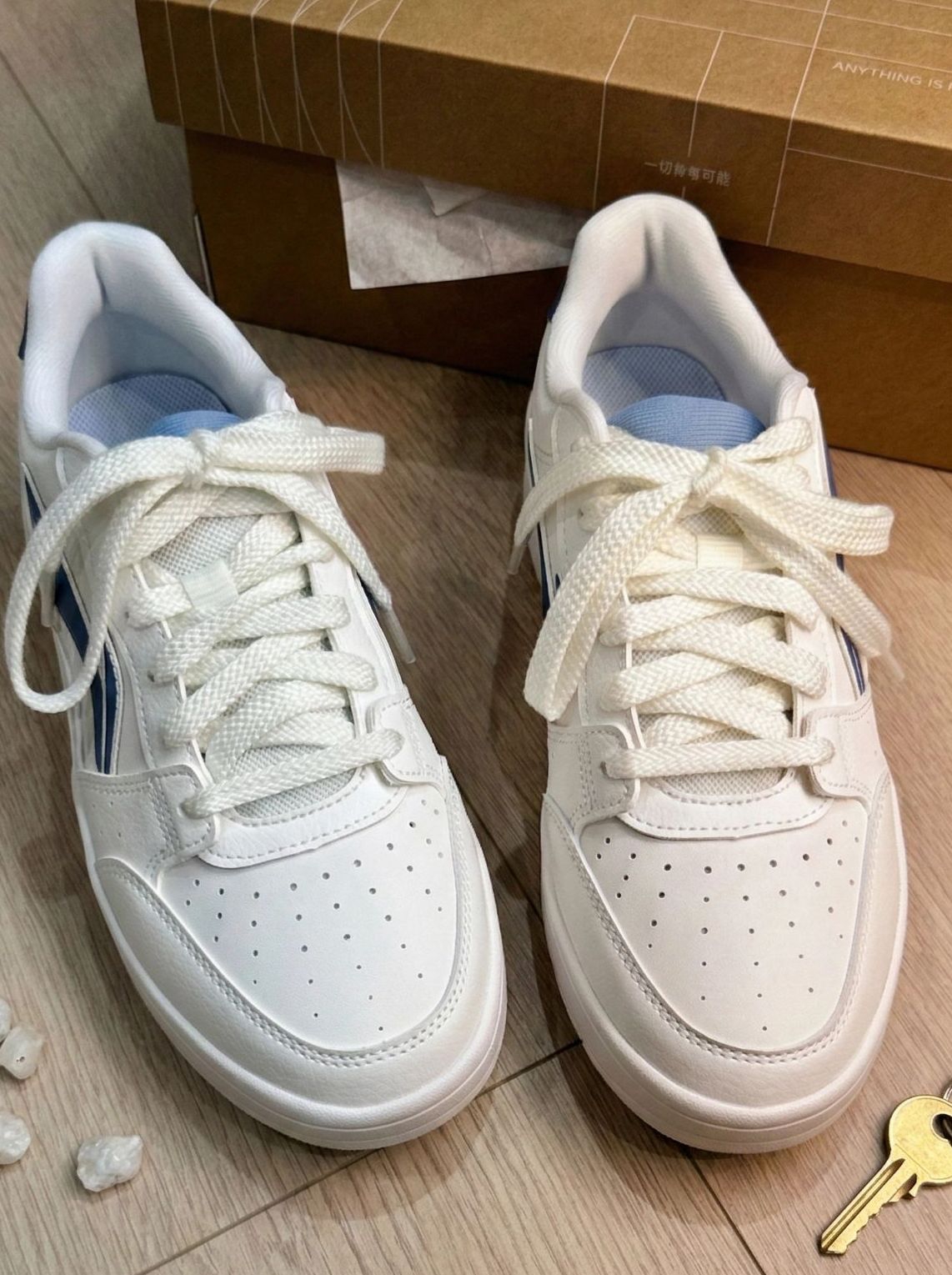 这双李宁板鞋真的太适合春天了!干净的白+渐变蓝配色,像把蓝天白云穿在脚上,温柔又清爽☁️ 鞋身是细腻的皮革材质,摸起来很有质感,透气孔设计夏天穿也不闷脚。厚底版型悄悄显高,搭配牛仔裤、小裙子都很和谐,日常通勤、上学都好穿,是越看越耐看的百搭款~