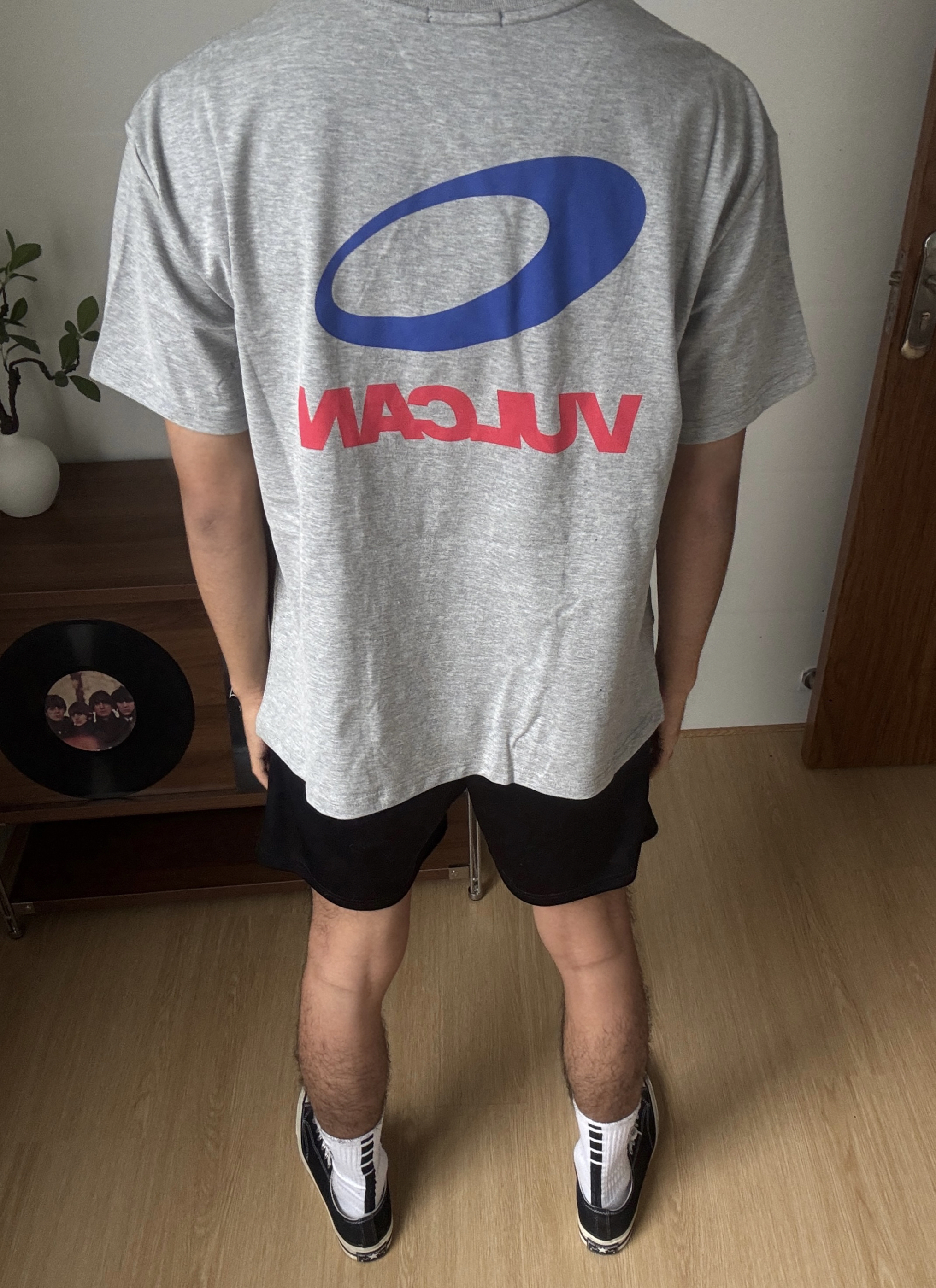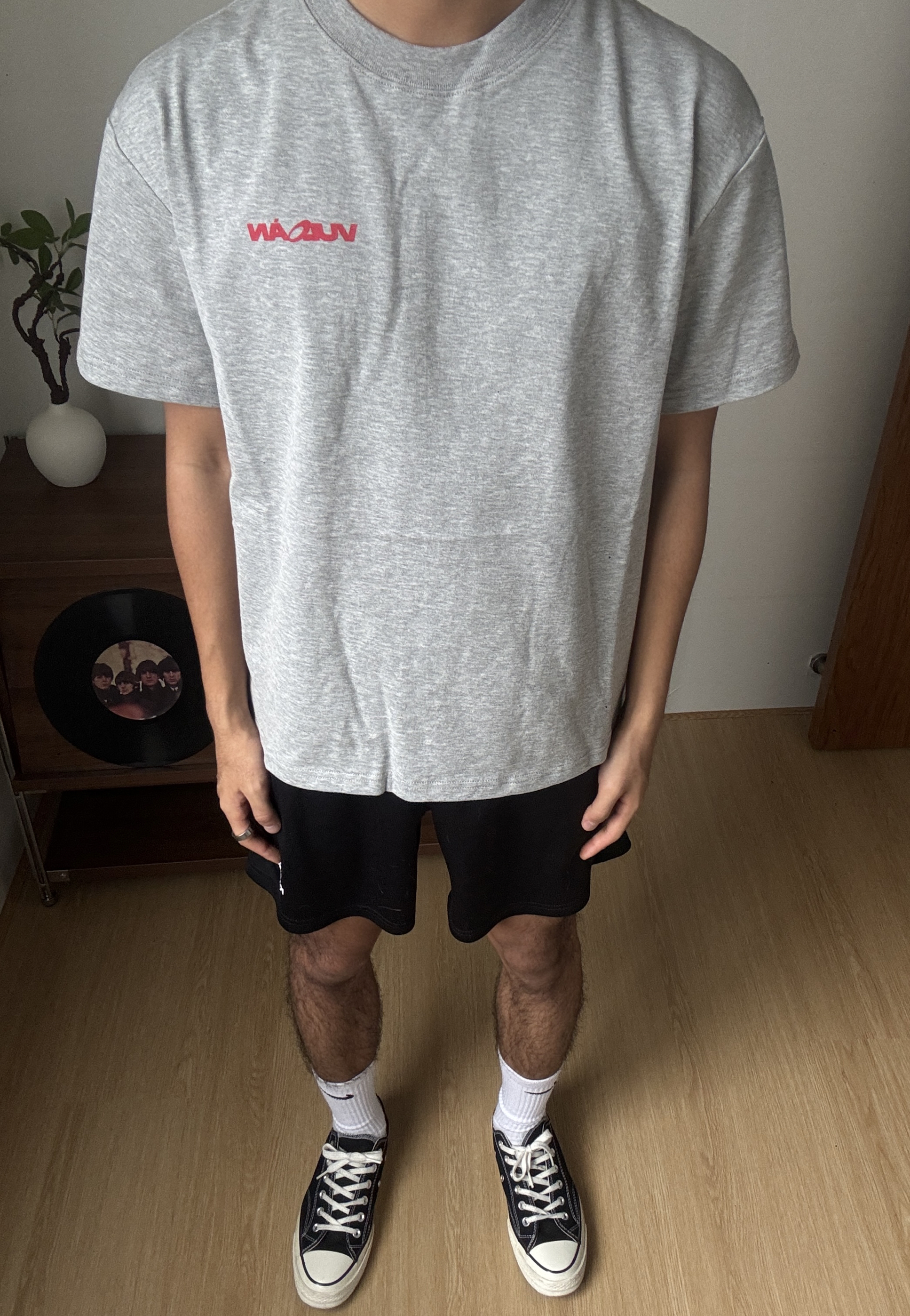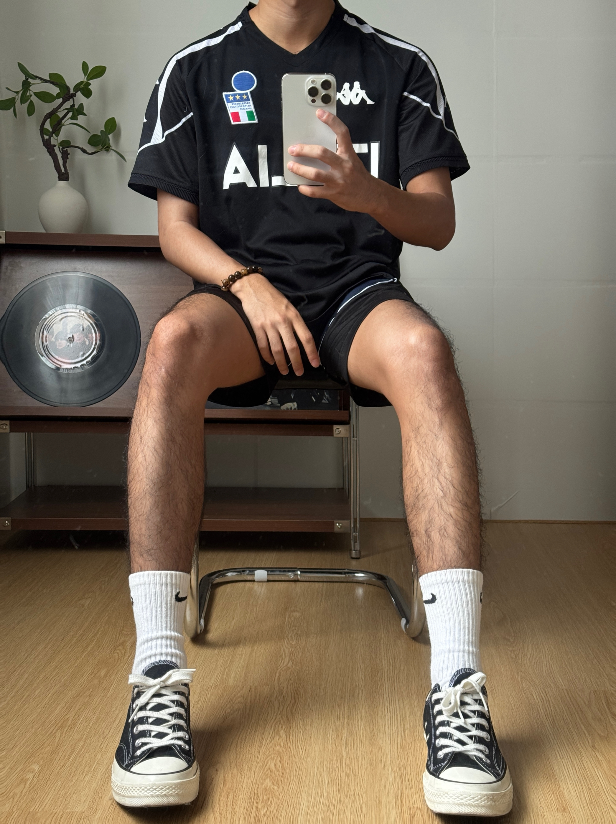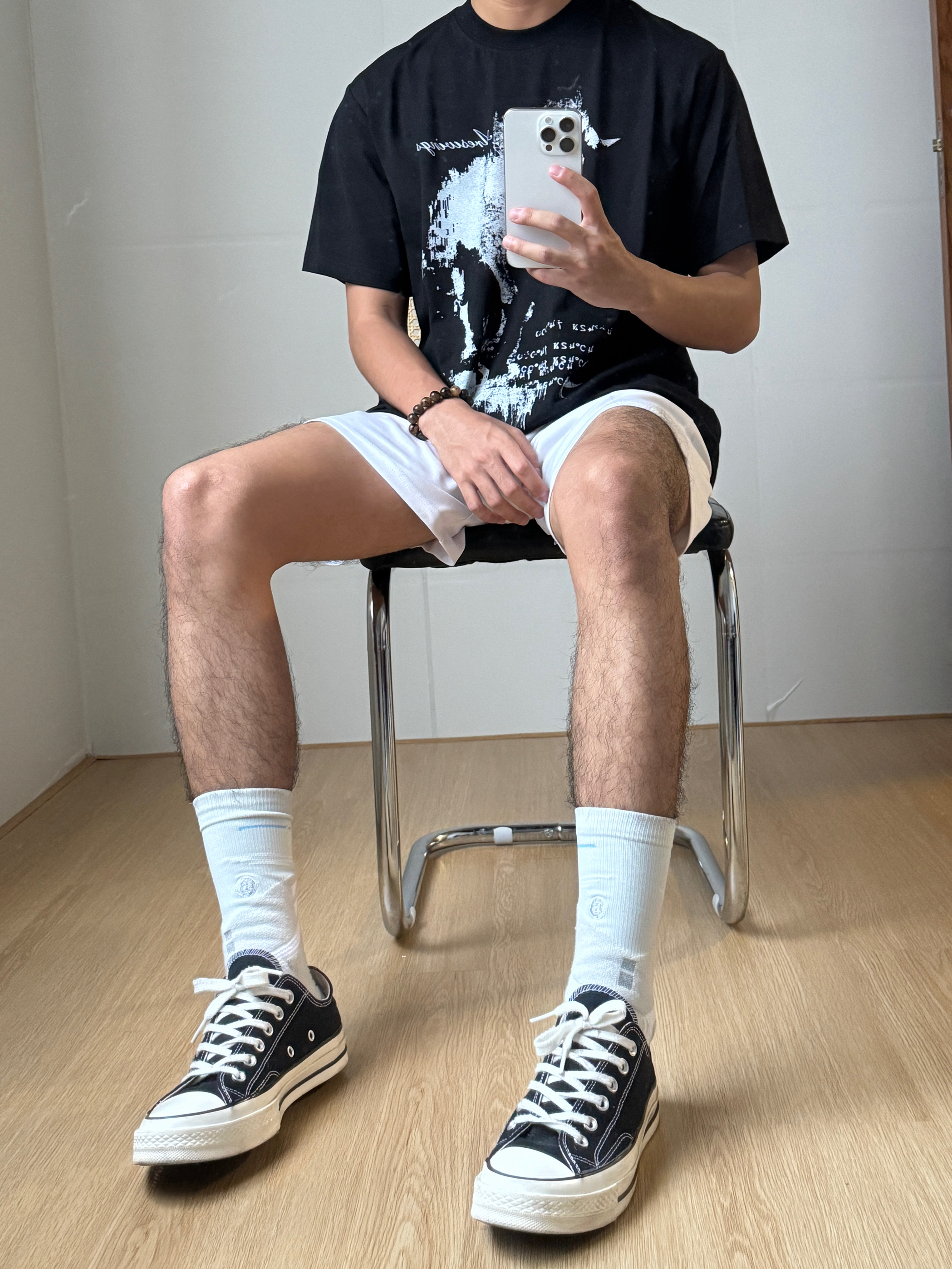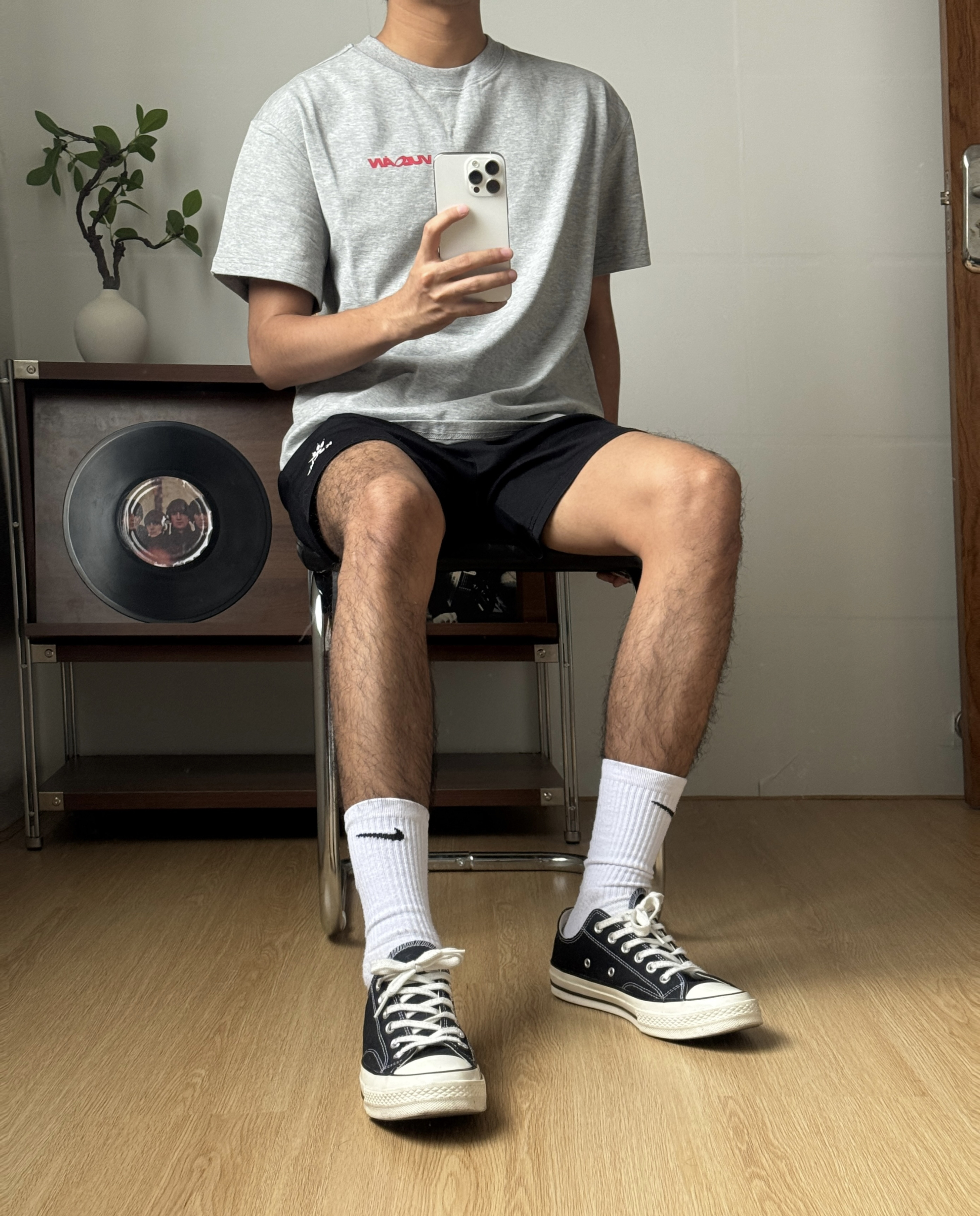 灰T黑短配白袜黑鞋,清爽精神又简单舒服,日常出门就这么穿。