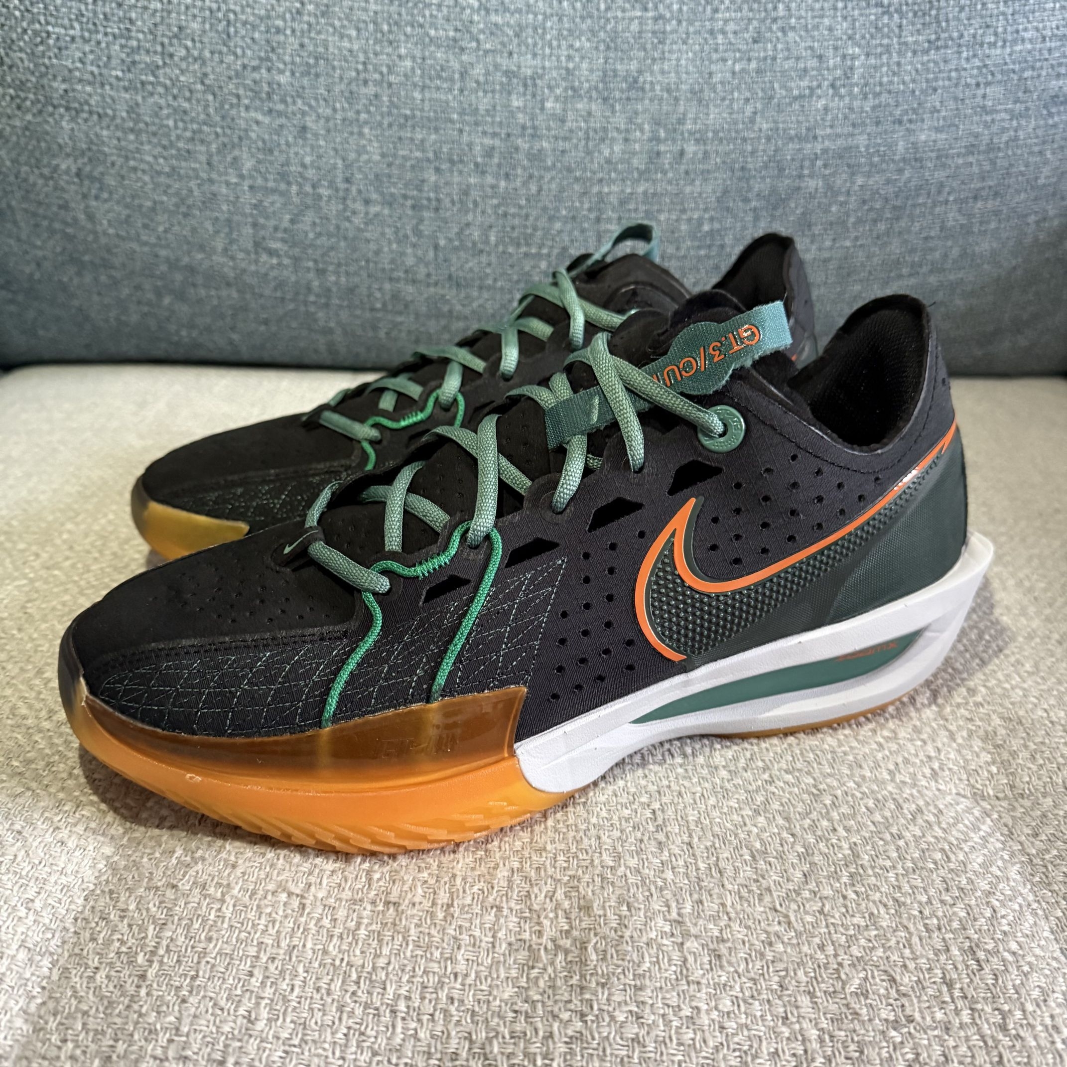 这双Nike GT Cut 3是我最近的主力鞋,黑绿橙撞色看着就挺有劲儿。 鞋身透气孔多,夏天打球脚不闷,缓震和抓地都在线,变向也稳。 平时出街搭运动裤、黑T也不违和,属于那种不用费脑子搭配的鞋。 穿了快俩月,越穿越顺手,你们觉得这配色耐看不?