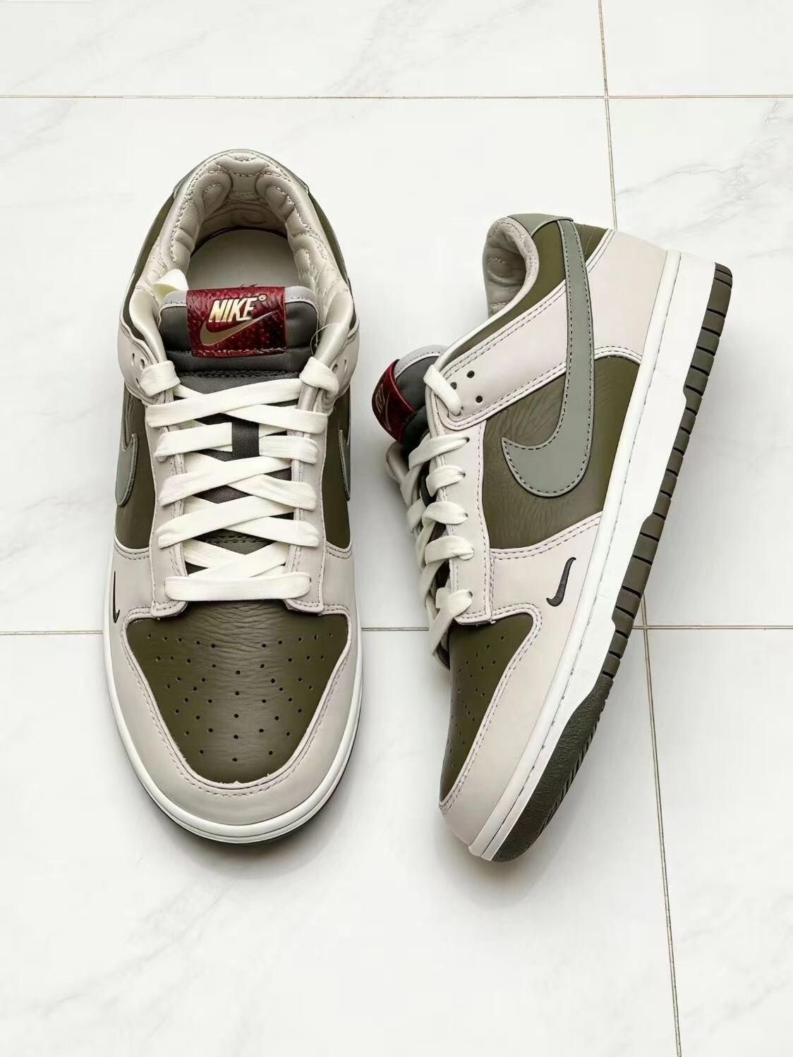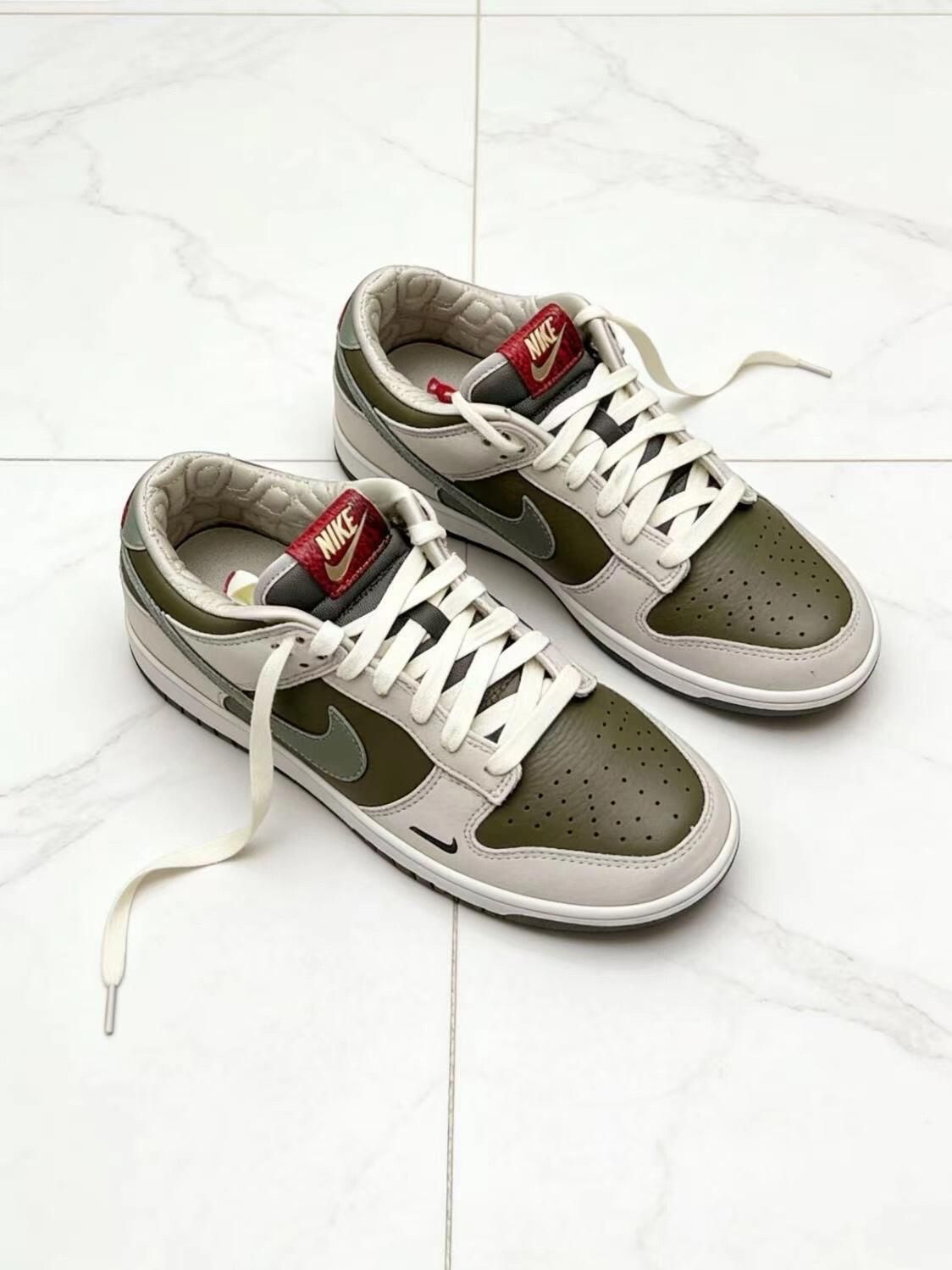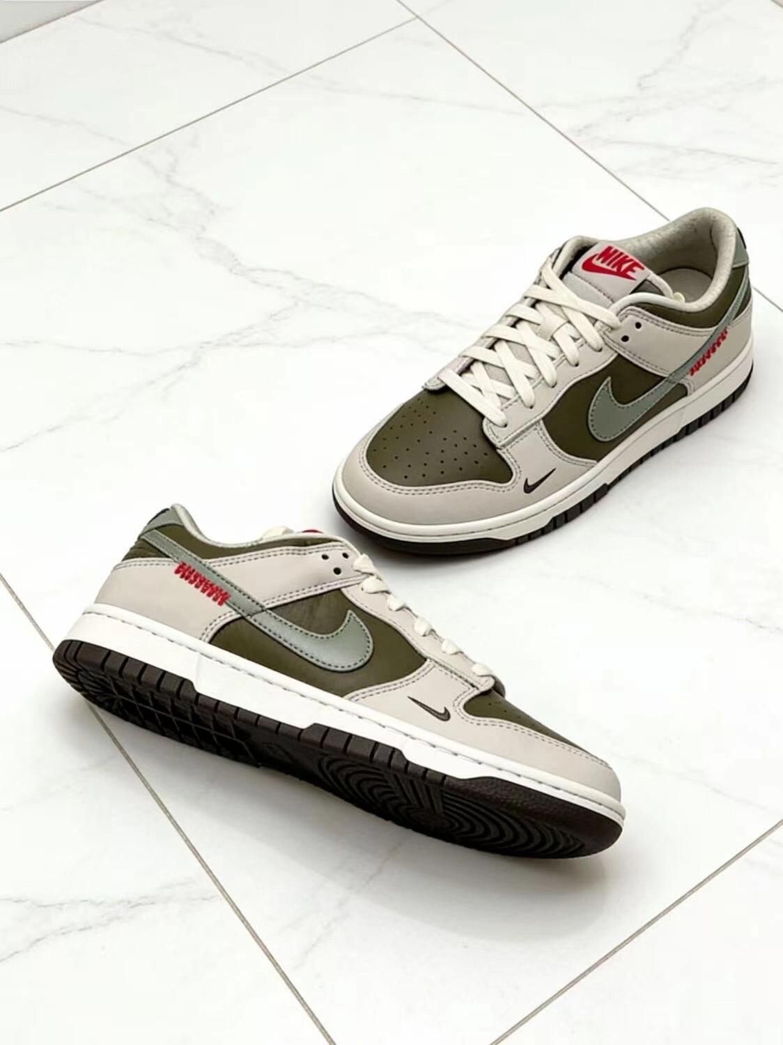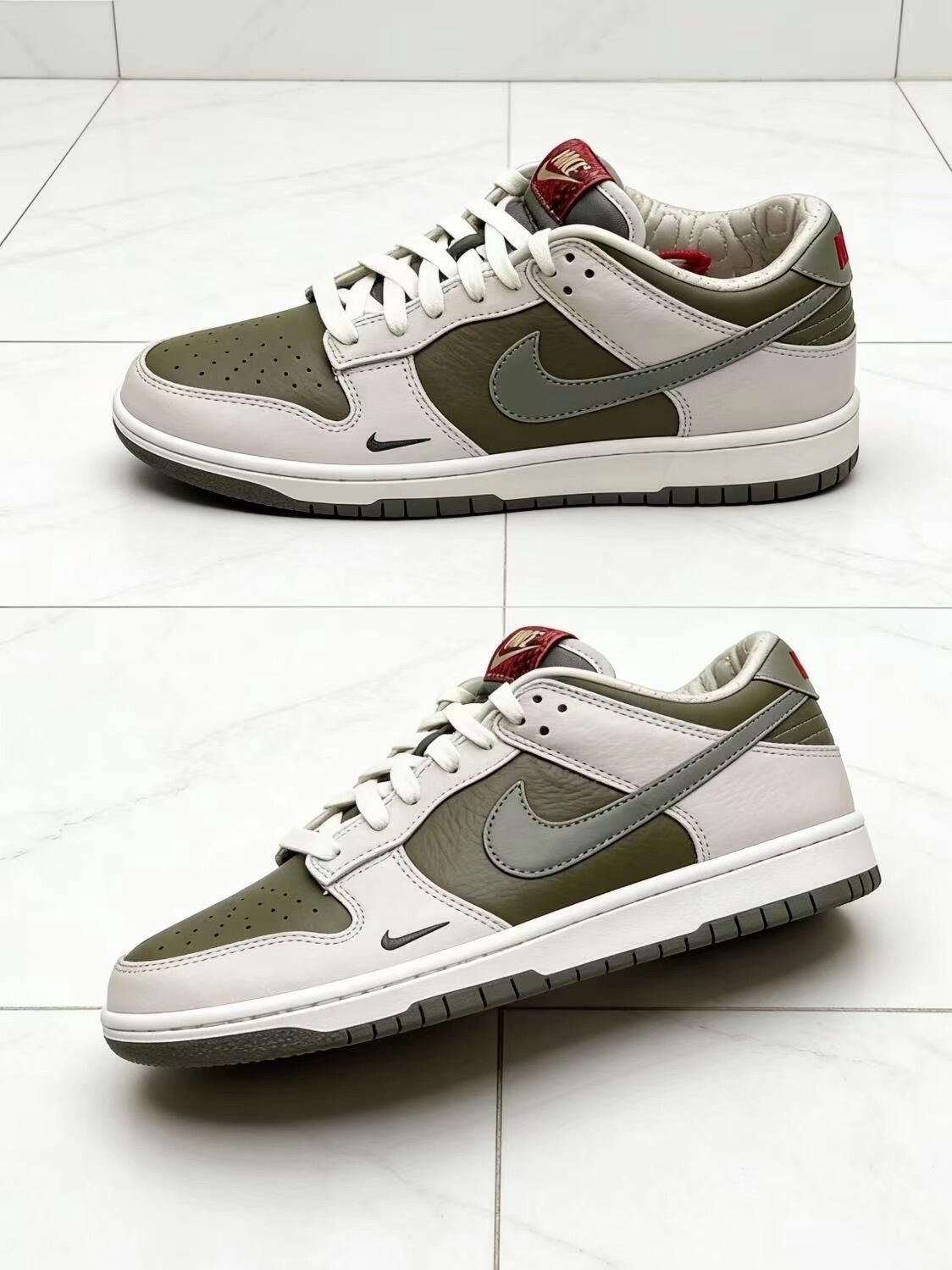 把复古与潮流的碰撞穿在脚上 这双Nike Dunk Low,以米白为基底,卡其与深棕色调交织,经典Swoosh低调却吸睛。鞋身纹理增添复古质感,红色鞋盒与木质桌面相映,彰显潮流底蕴。无论是街头出街还是日常穿搭,都能成为焦点,每一步都踩出独特风格