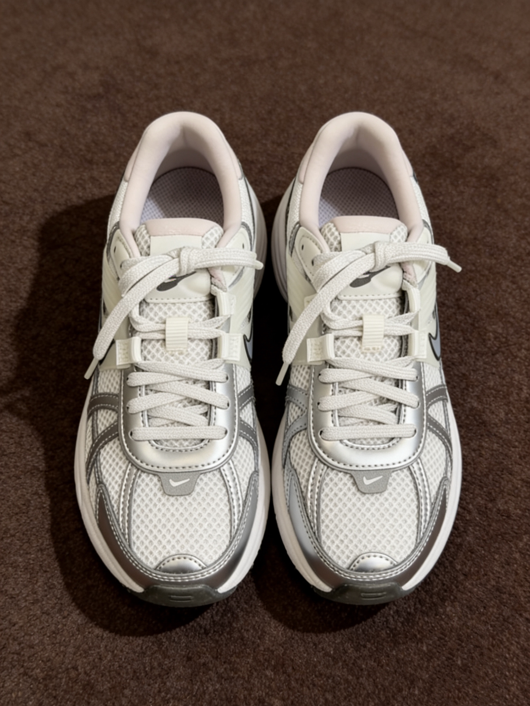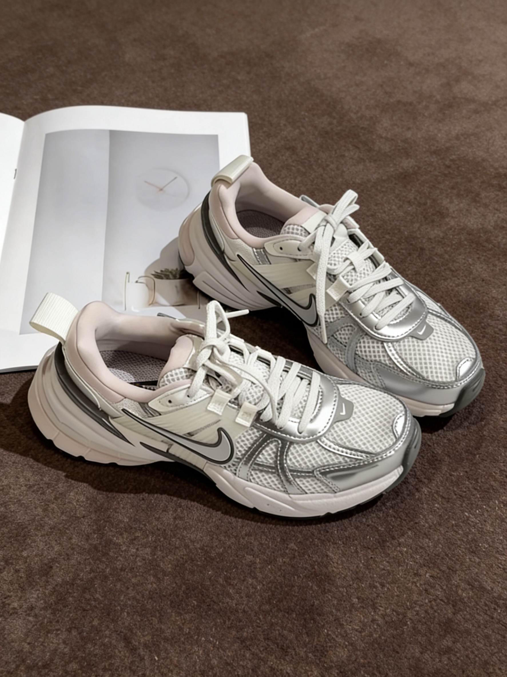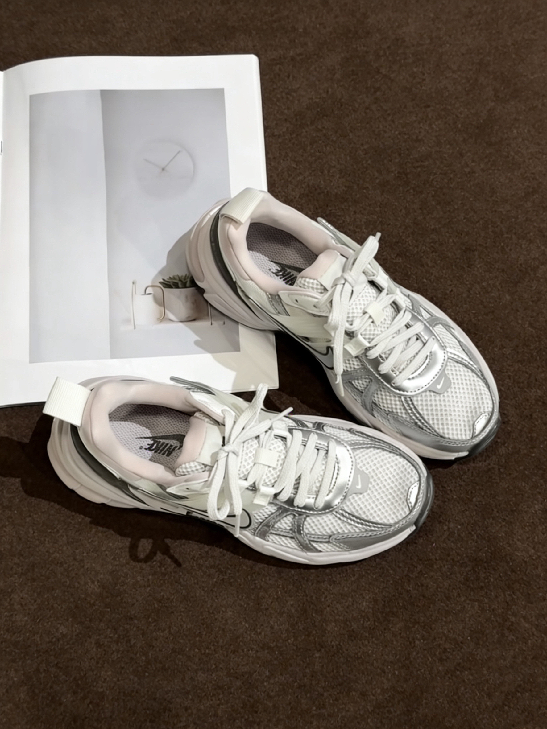 整双鞋完美继承了2000年初经典跑鞋的复古基因,把Vomero系列的人气元素完美焕新融合。鞋面采用透气网布+质感皮革的拼接设计,搭配半透明塑料饰片点缀,线条利落又有丰富的层次感,远看干净耐看,近看细节拉满完全不廉价。做旧氧化的奶白中底自带复古滤镜,完全没有新鞋的刻意感,越穿越有那股松弛的街头味儿,不管是白银经典款还是小众配色,都自带高级感。