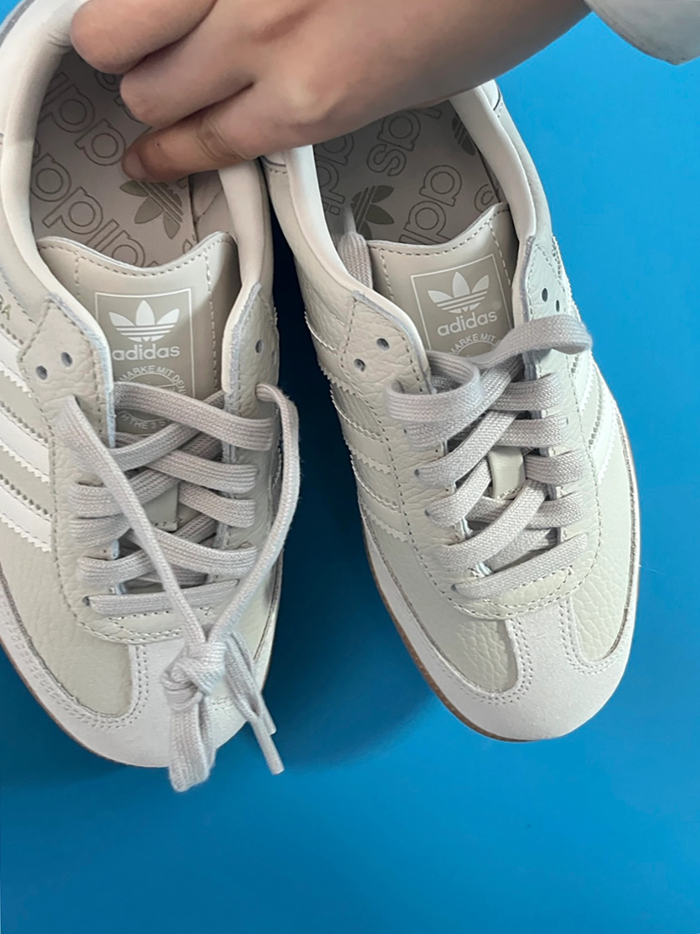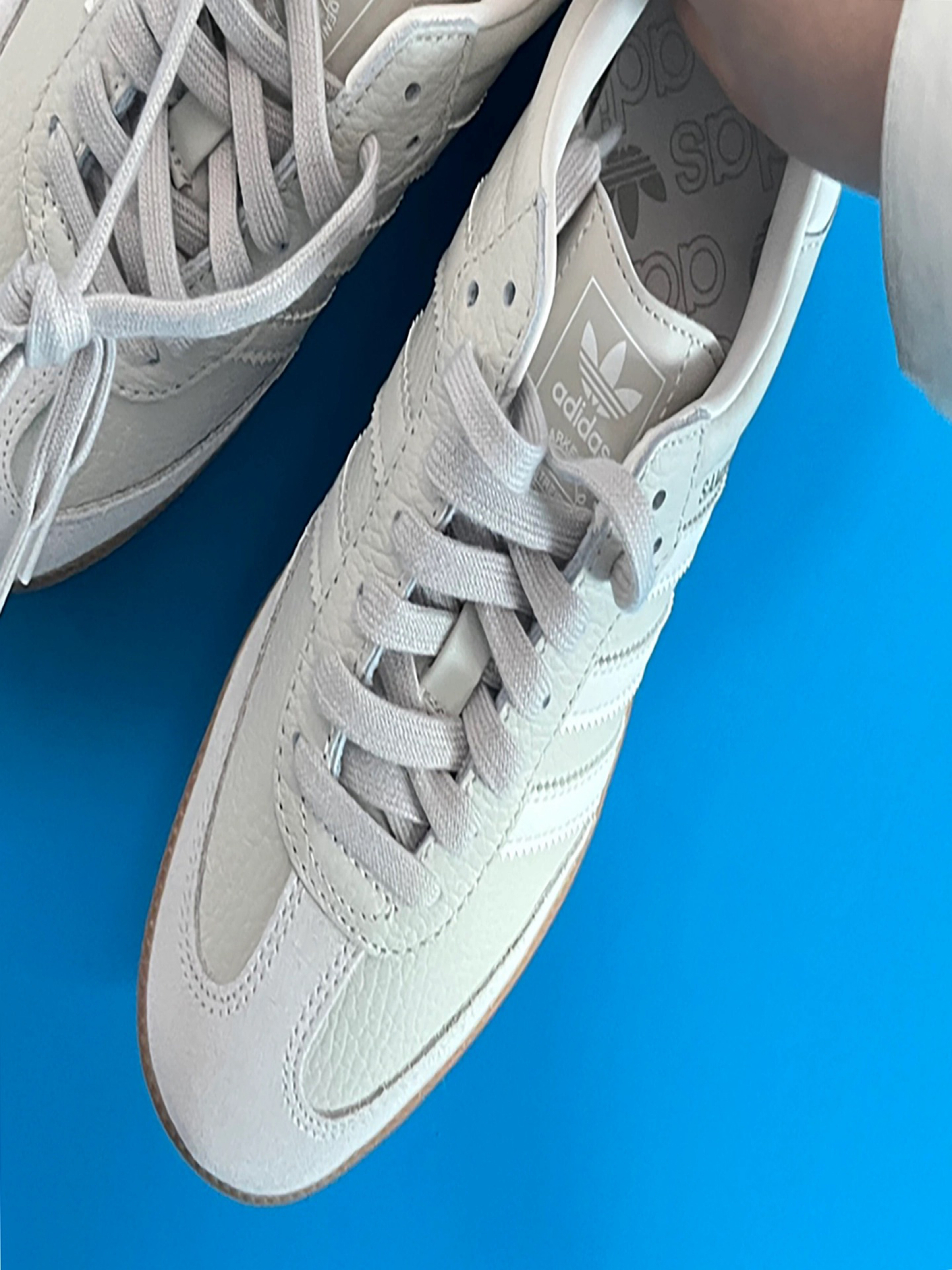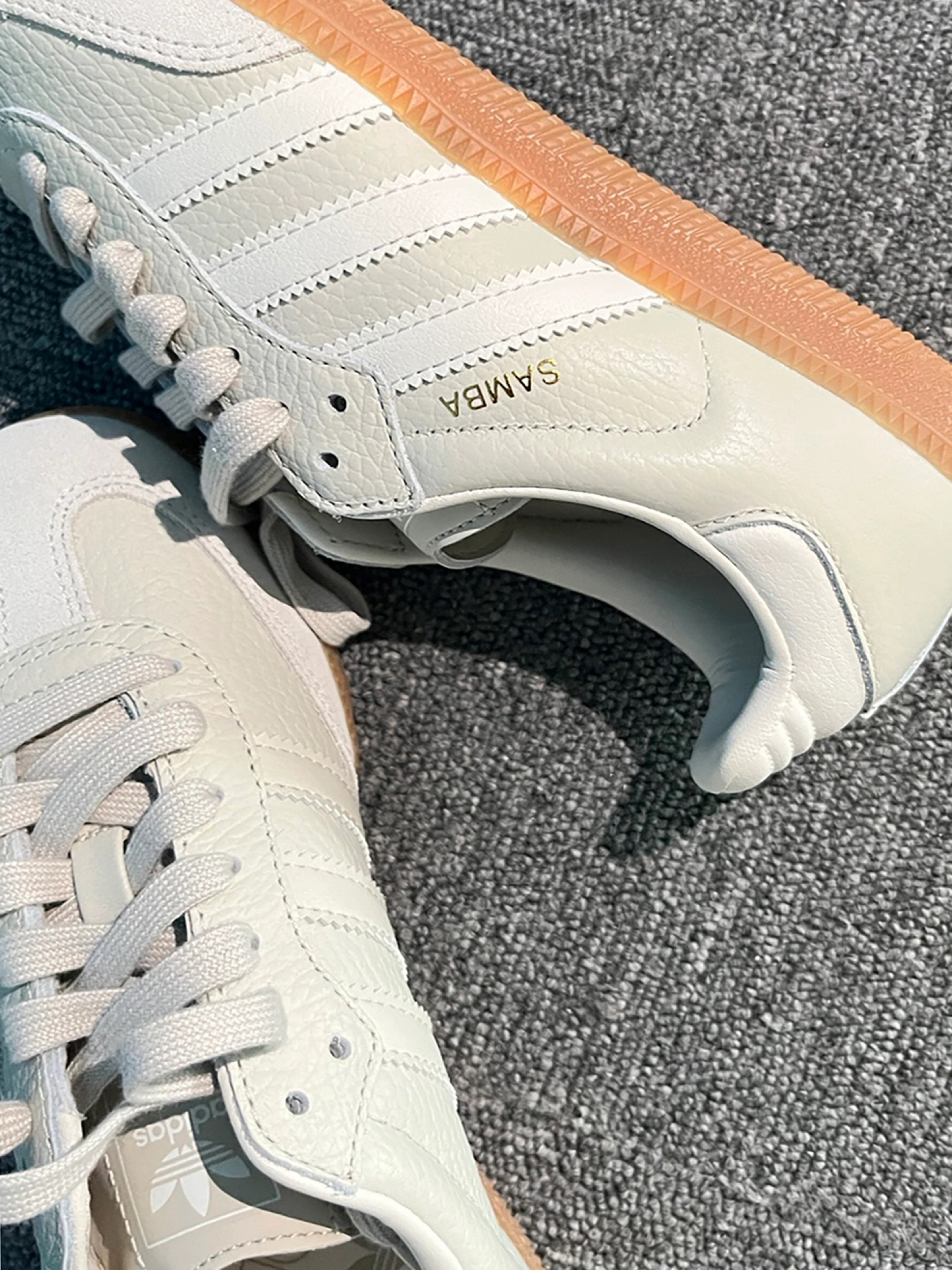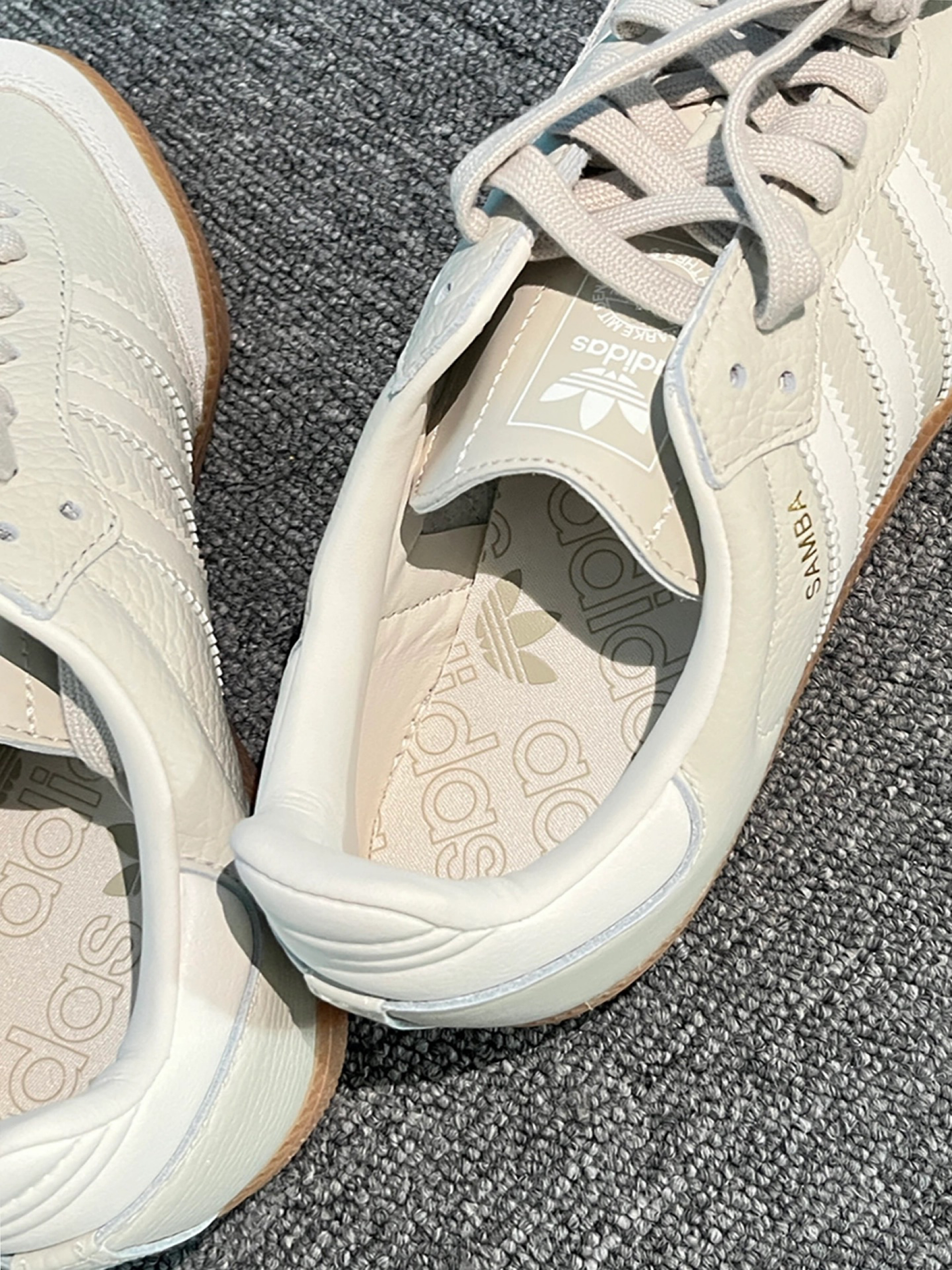 最近入的adidas Samba OG纯白奶油款太戳我啦🤍周末和闺蜜去公园晒太阳☀️穿着它逛了一下午,脚一点都不酸~我搭了浅粉碎花裙+白色短袜,闺蜜说今天这身像带了春日滤镜一样清爽😚 鞋子是皮革鞋面,好打理,锯齿三条纹和T形鞋头很经典,低帮版型显腿细。 提醒下:尺码正常,我37脚穿37刚好,瘦脚宽脚都合适哦✅白色部分脏了用橡皮擦轻轻擦就干净🧼 你们春夏小白鞋都爱搭什么?来评论区聊聊呀