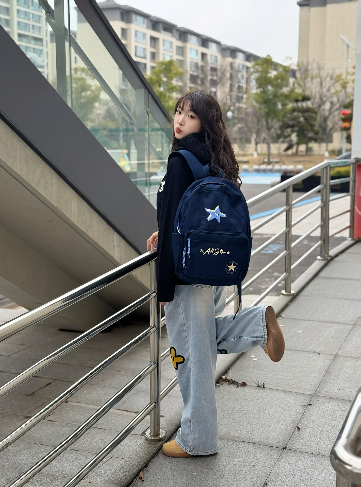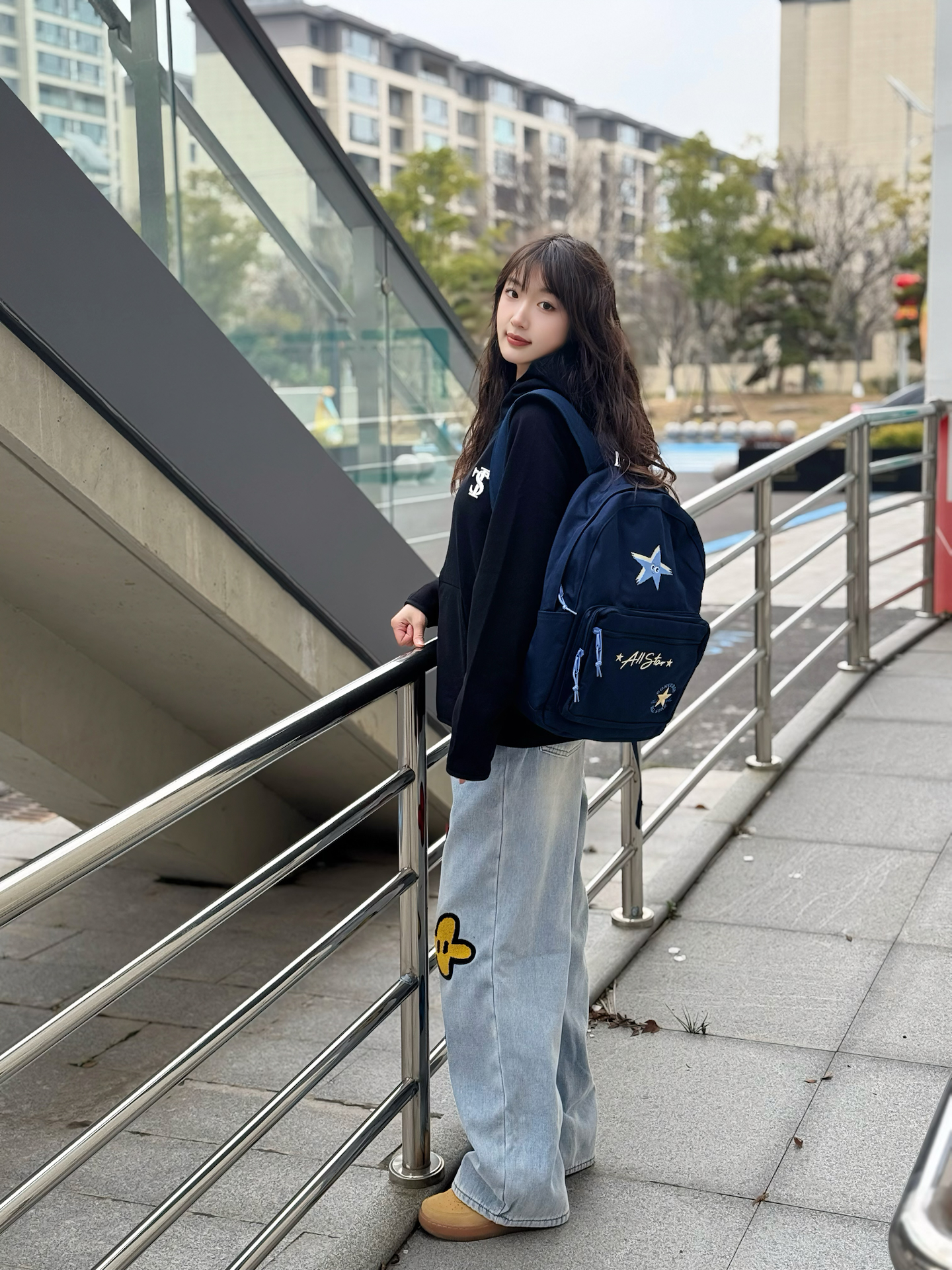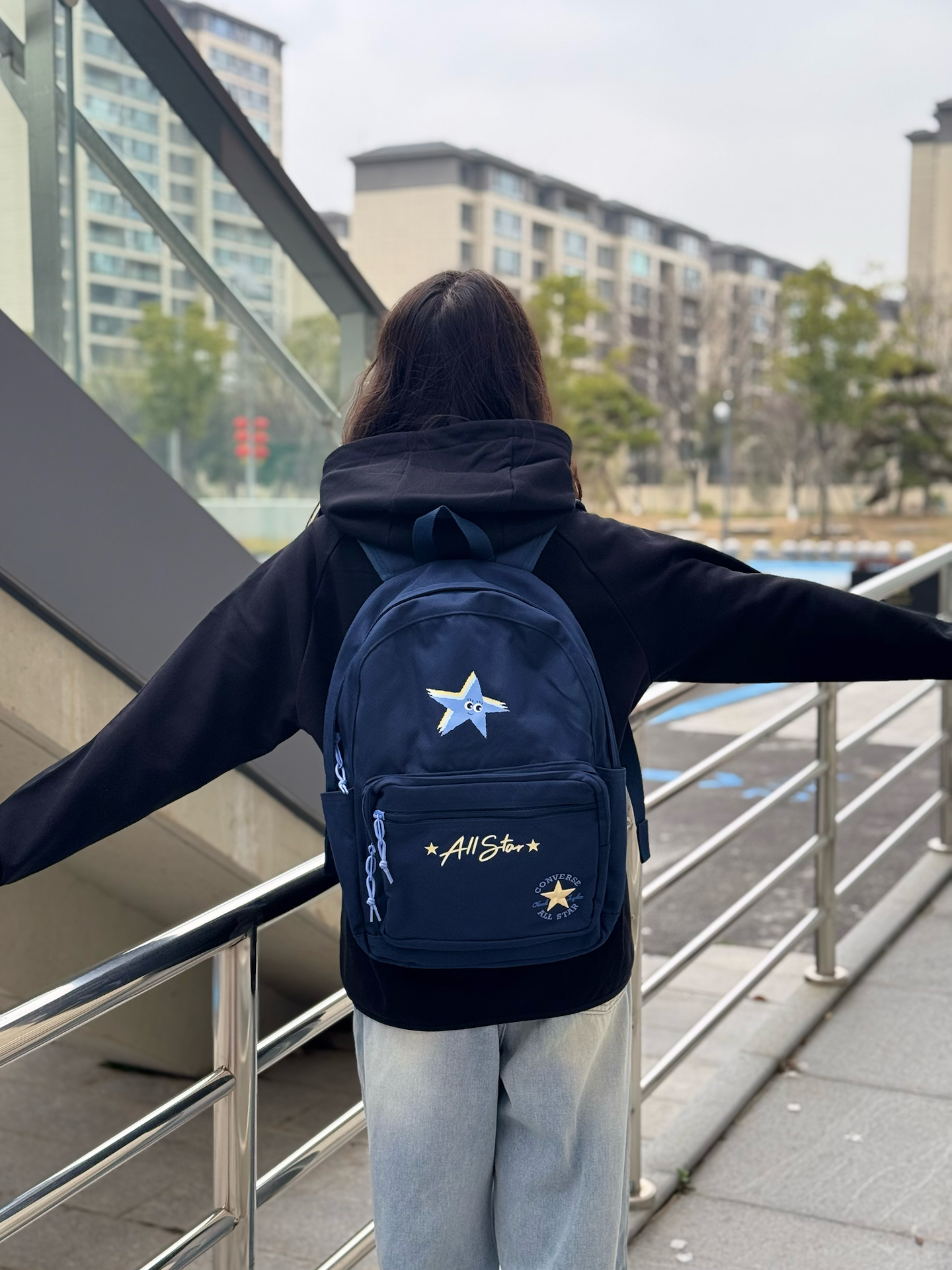 💙藏青蓝像深夜的天空 星星印花在上面 蓝色系的撞色logo🤍是背包藏不住的小调皮 多隔层口袋 可以放下课本、耳机和充电宝💙 男女同款刚刚好一人一个🤍校园里的情侣款 图源网络侵删