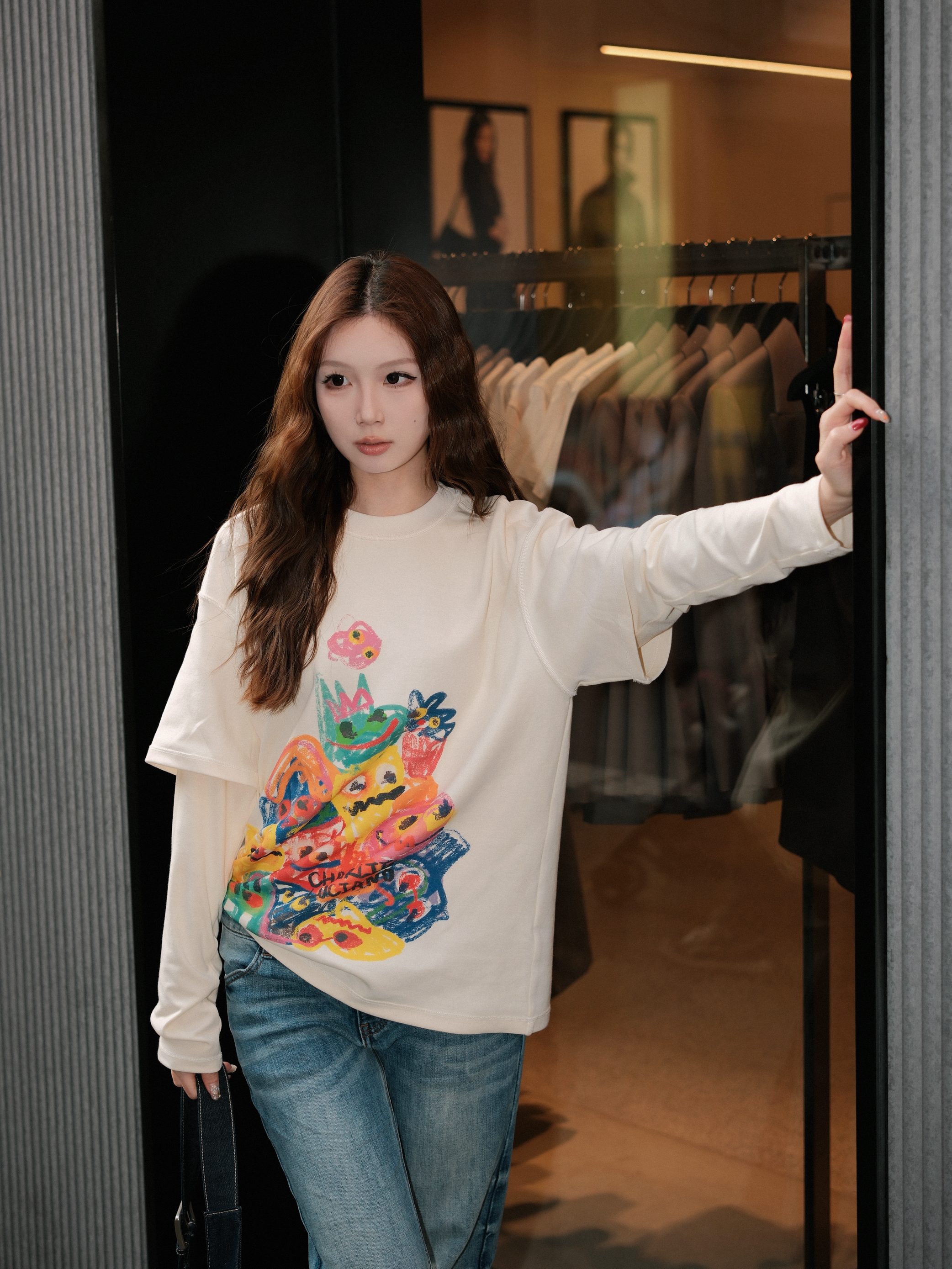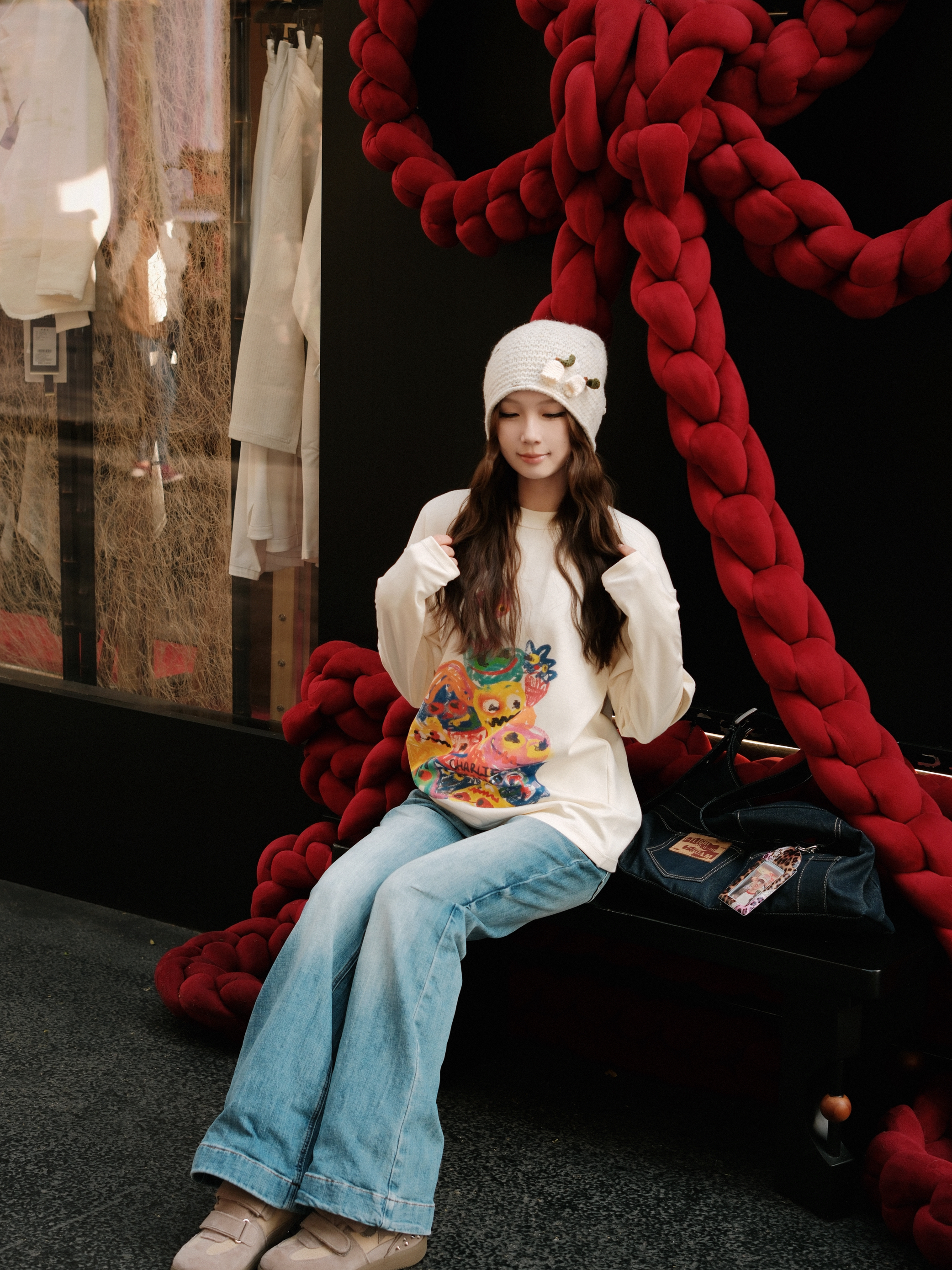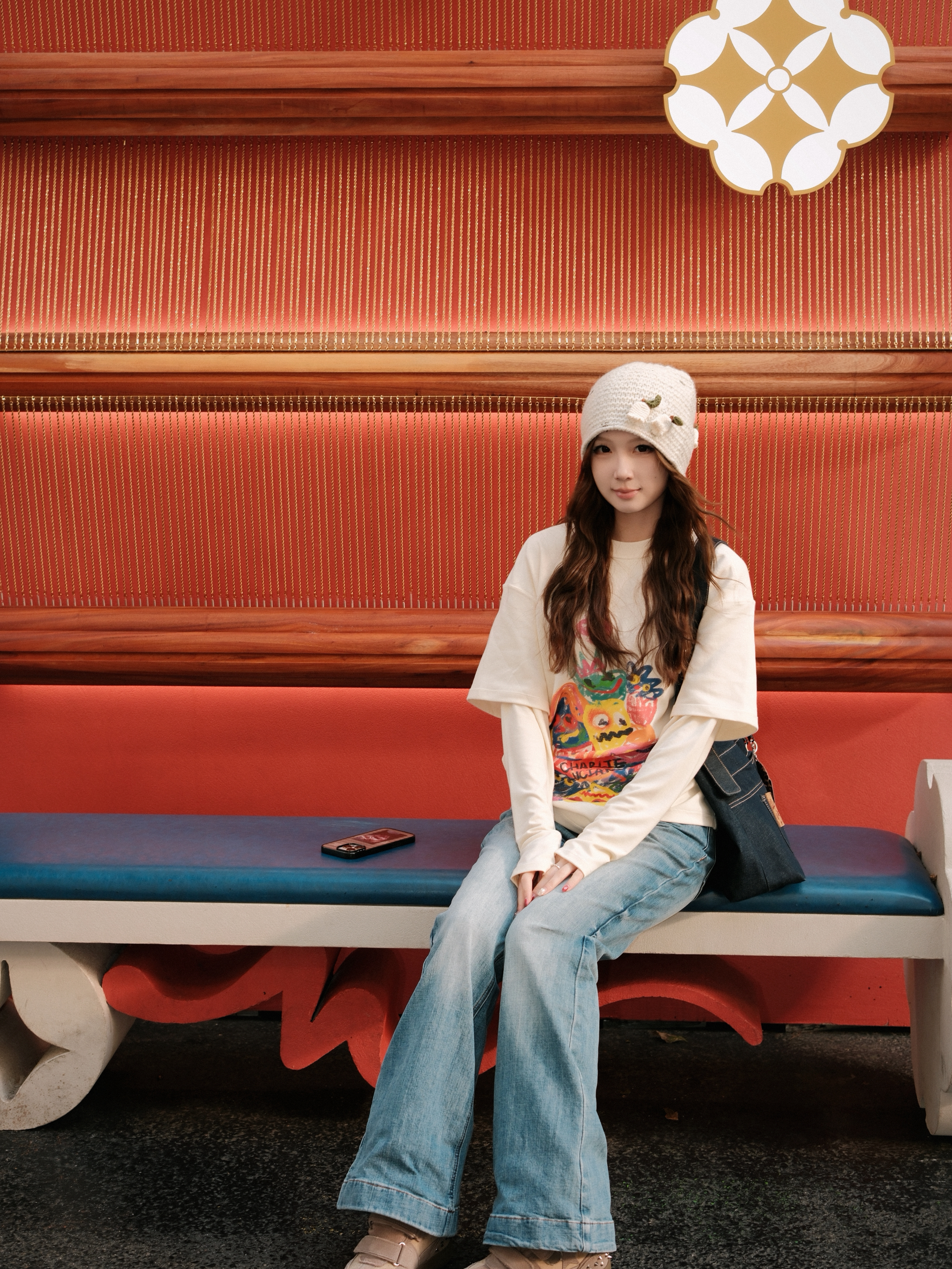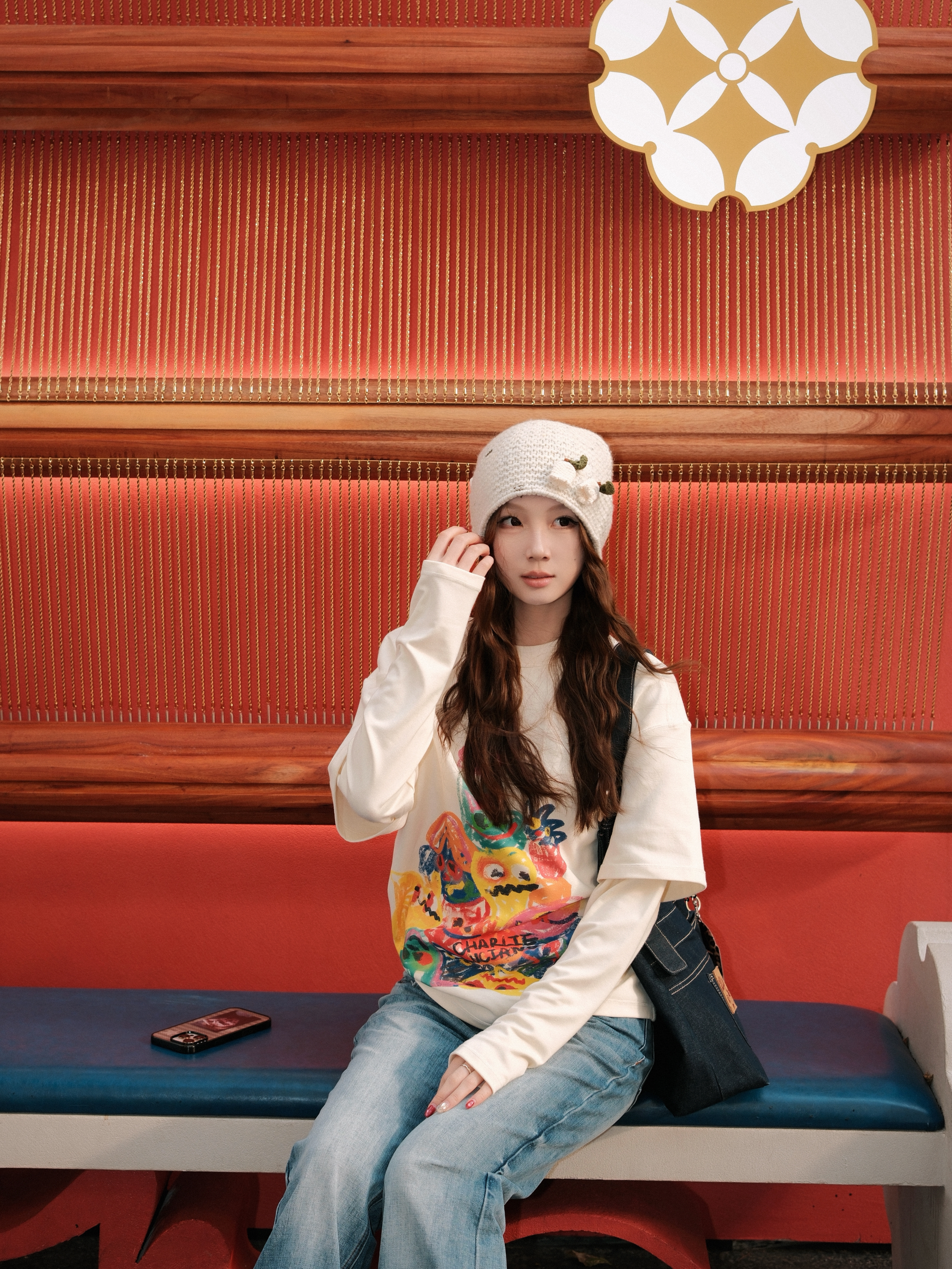 今天的穿搭真的超级适合初春 米白色涂鸦假两件长袖T🎨 假两件设计让层次感直接拉满 童趣涂鸦可可爱爱 走在路上心情都变好💯 搭配水洗牛仔微喇裤 显腿长一绝 微喇裤脚复古又随性 走路带风🚶♀️ 想要精致的穿搭配饰也很重要 米白色针织帽上的两朵铃兰花🔔 风吹过轻轻摇晃 少女感直接溢出 再背上同色系的牛仔包 和裤子呼应得刚刚好💫 站在街边随手抓拍了几张 初春的阳光洒在身上好温柔🌤️ 这一身不管是逛街还是...
